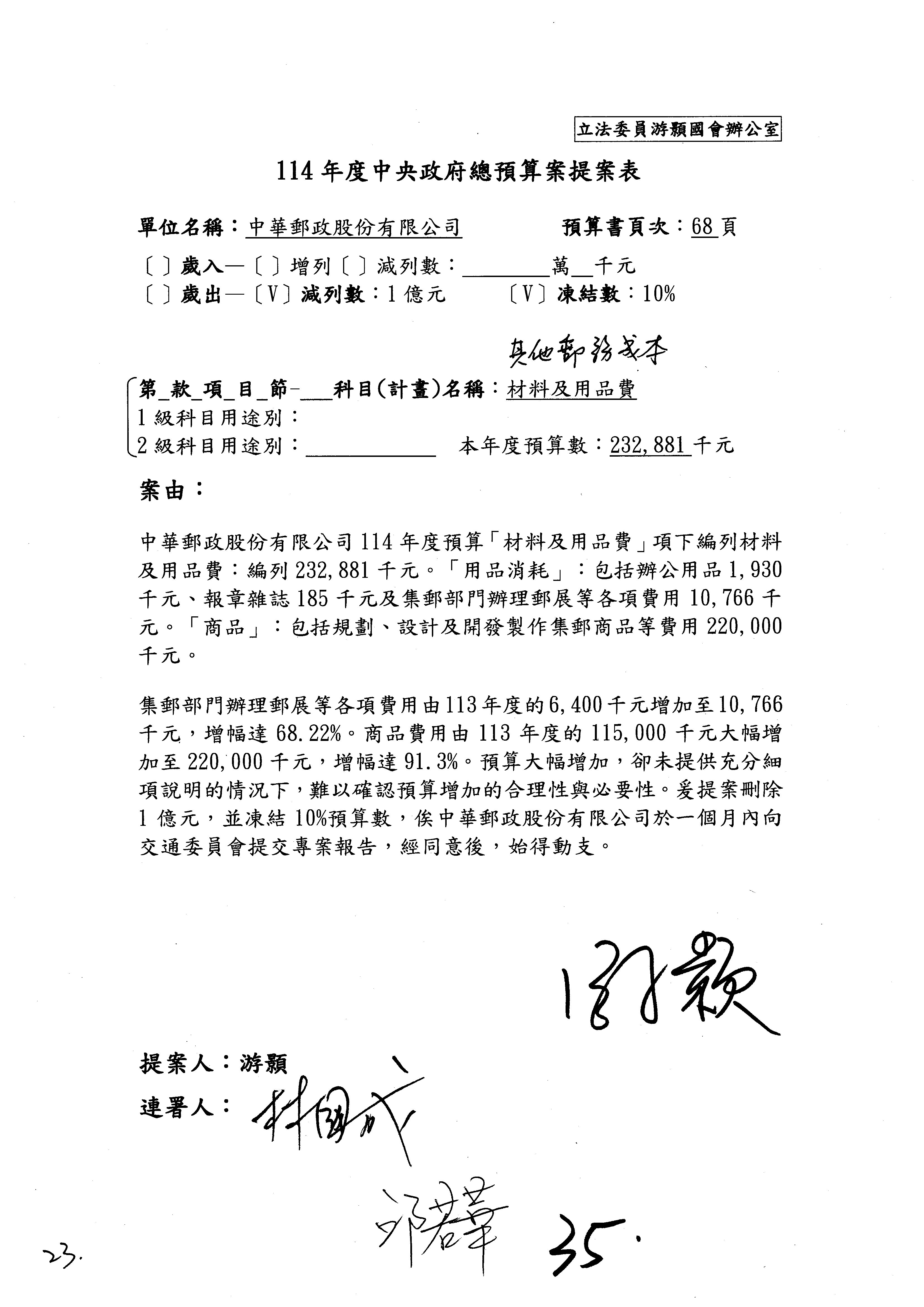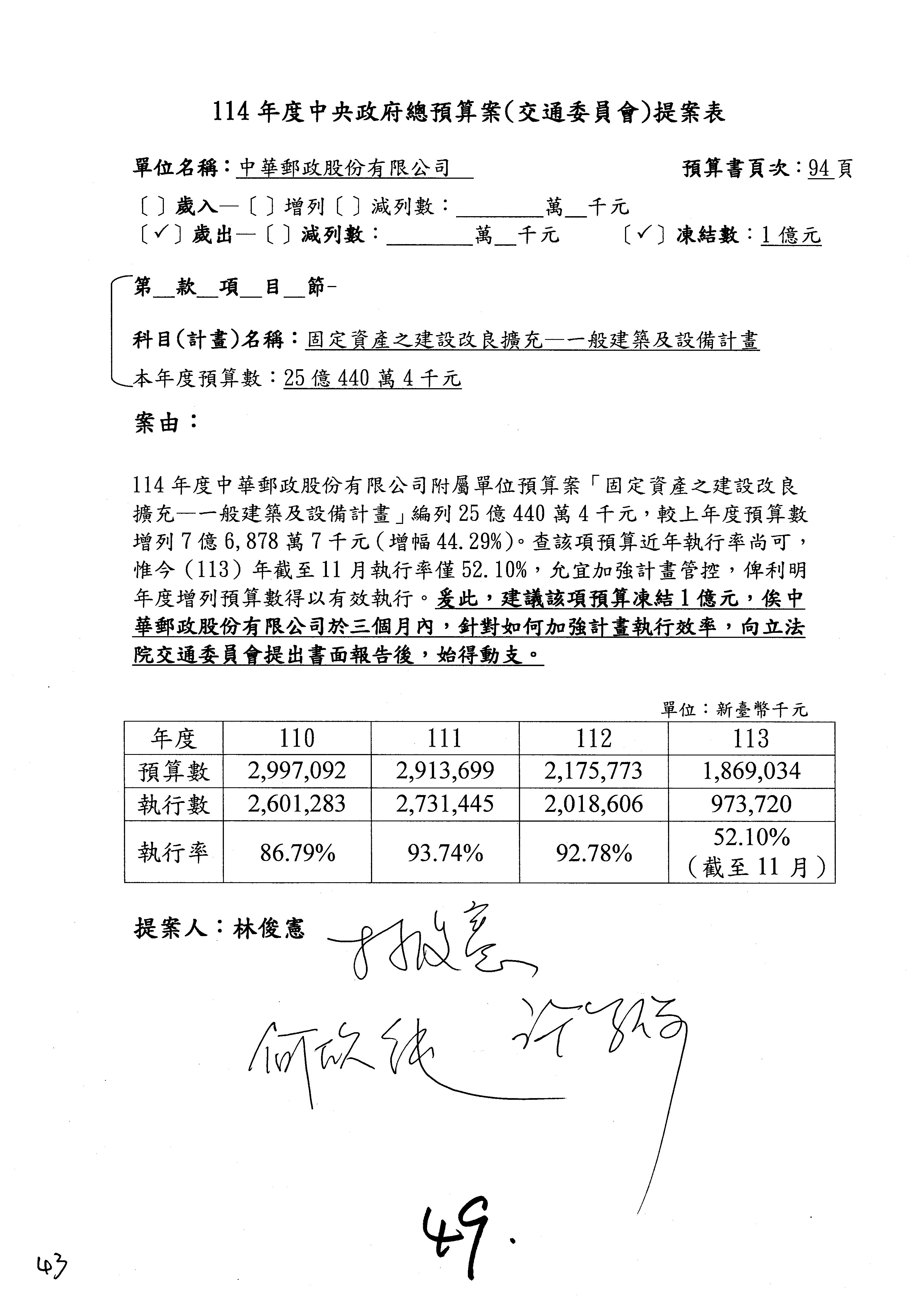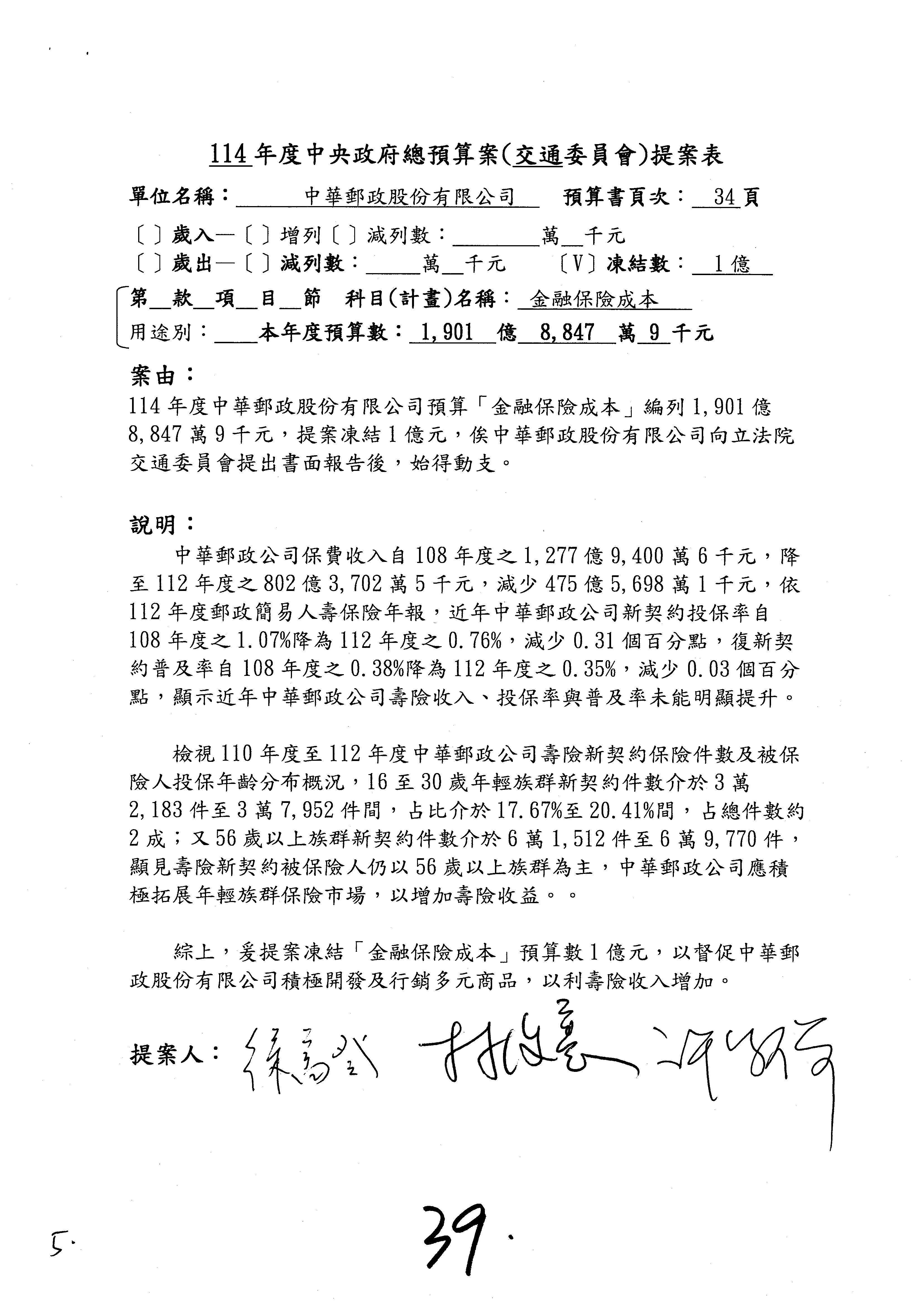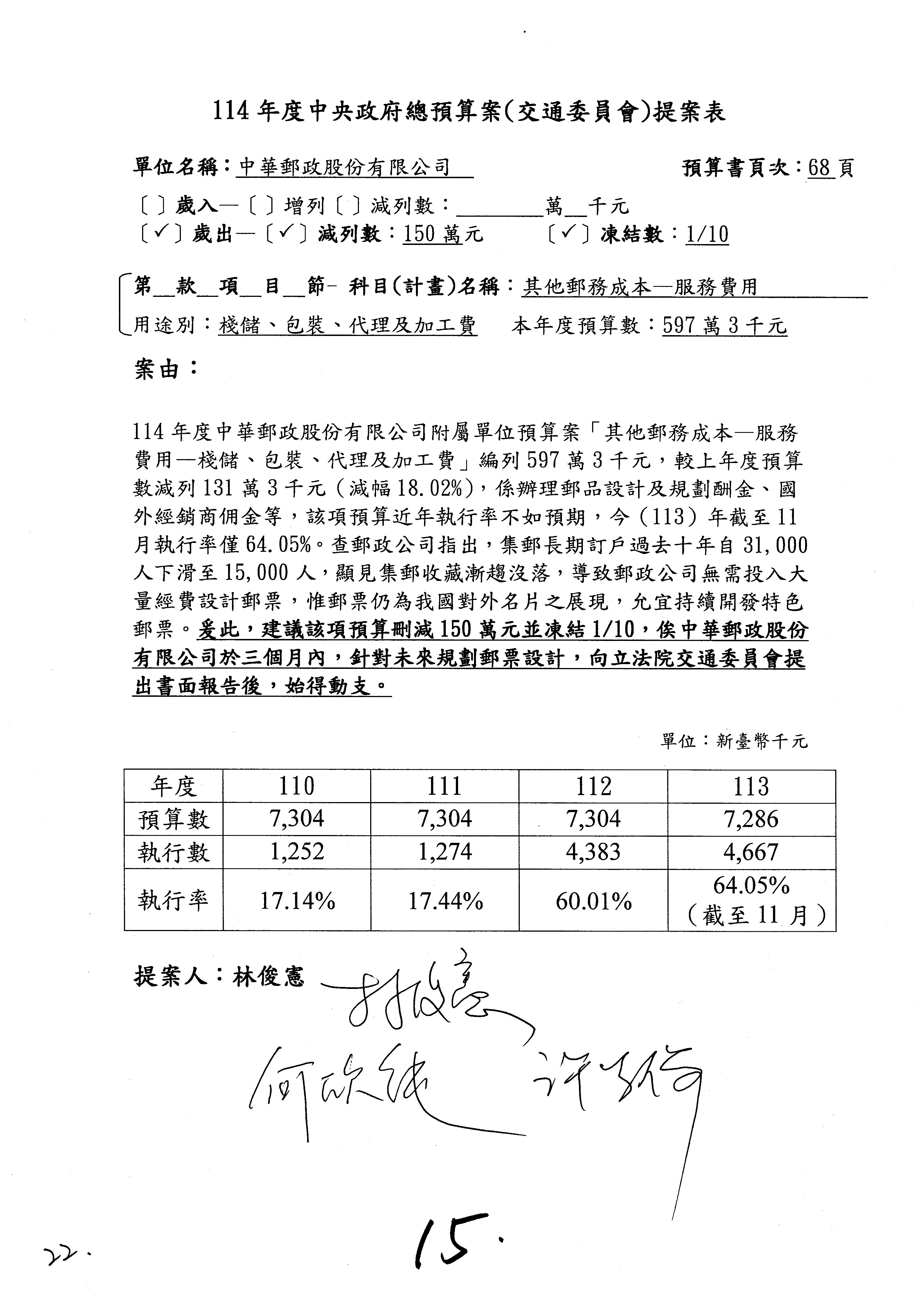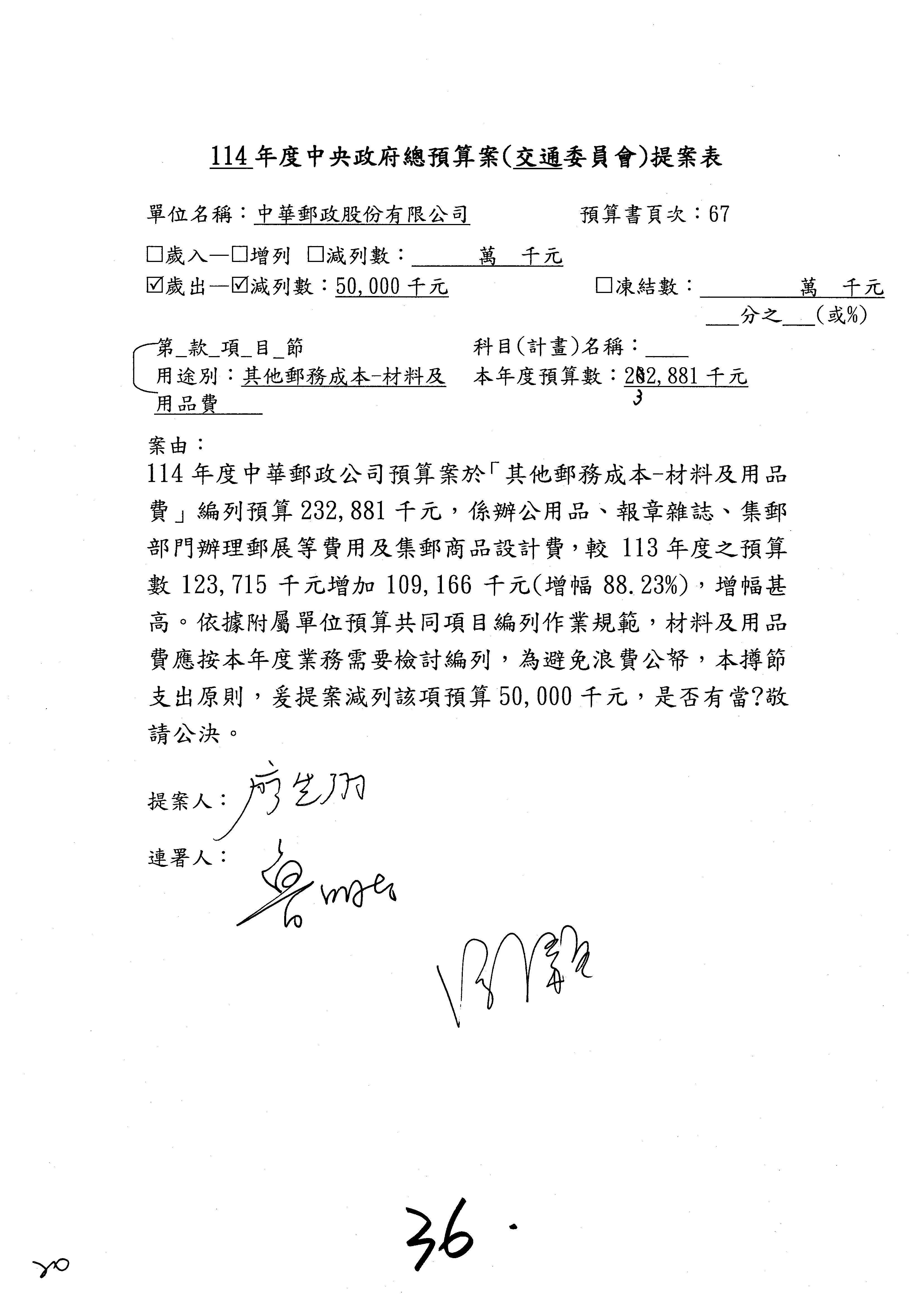 主席:好的。現在處理第16案到第48案的部分,當然,各位委員提出的相關議題,你們需要提出書面報告。業務費用四十四億五百三十六萬餘元,這個部分綜合所有委員的提案,金額從幾百萬元到兩億元不等,我們折衷一下啦!刪減5,000萬元,凍結10%,提供書面報告始得動支。各位有沒有其他意見?沒意見吧?