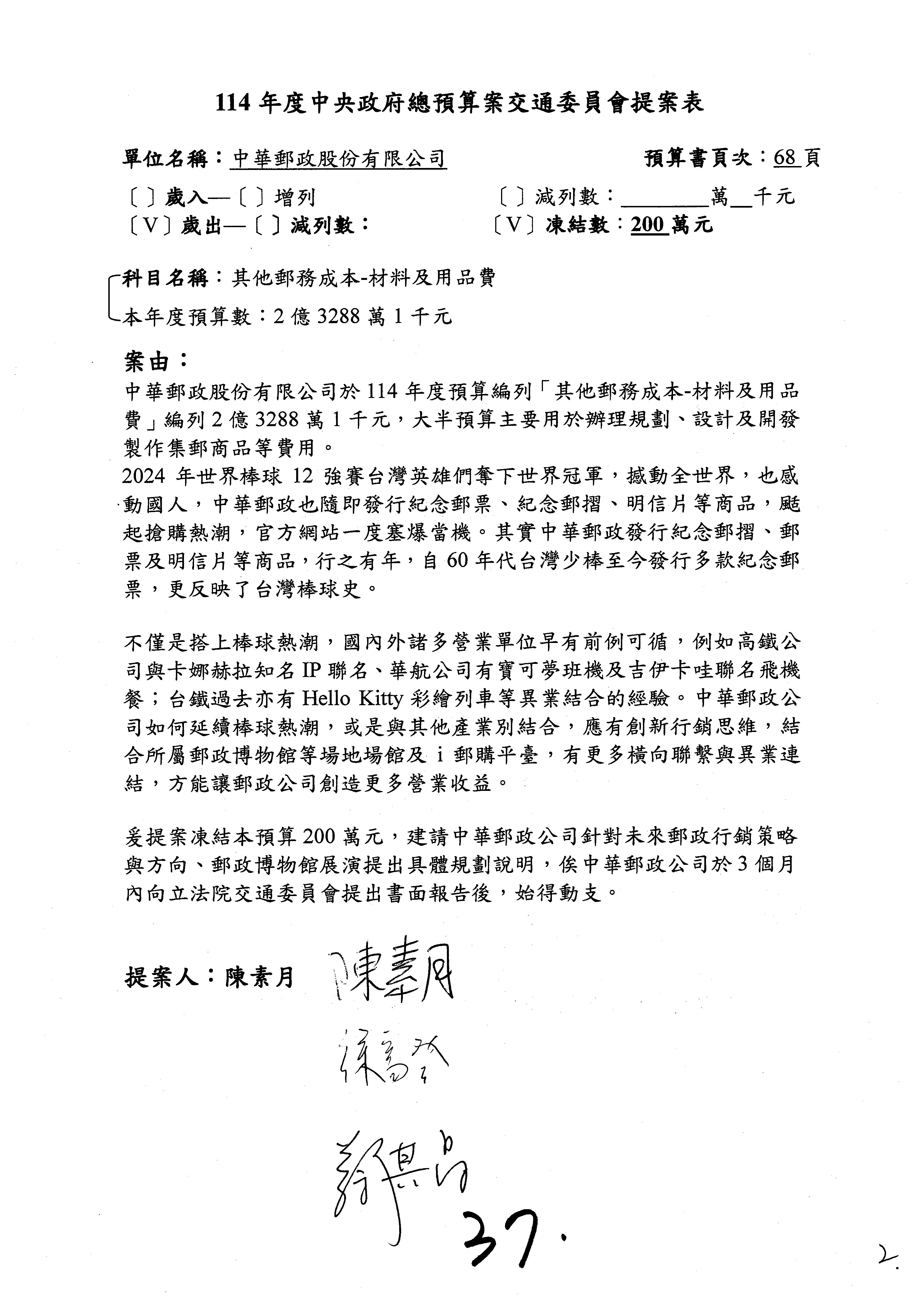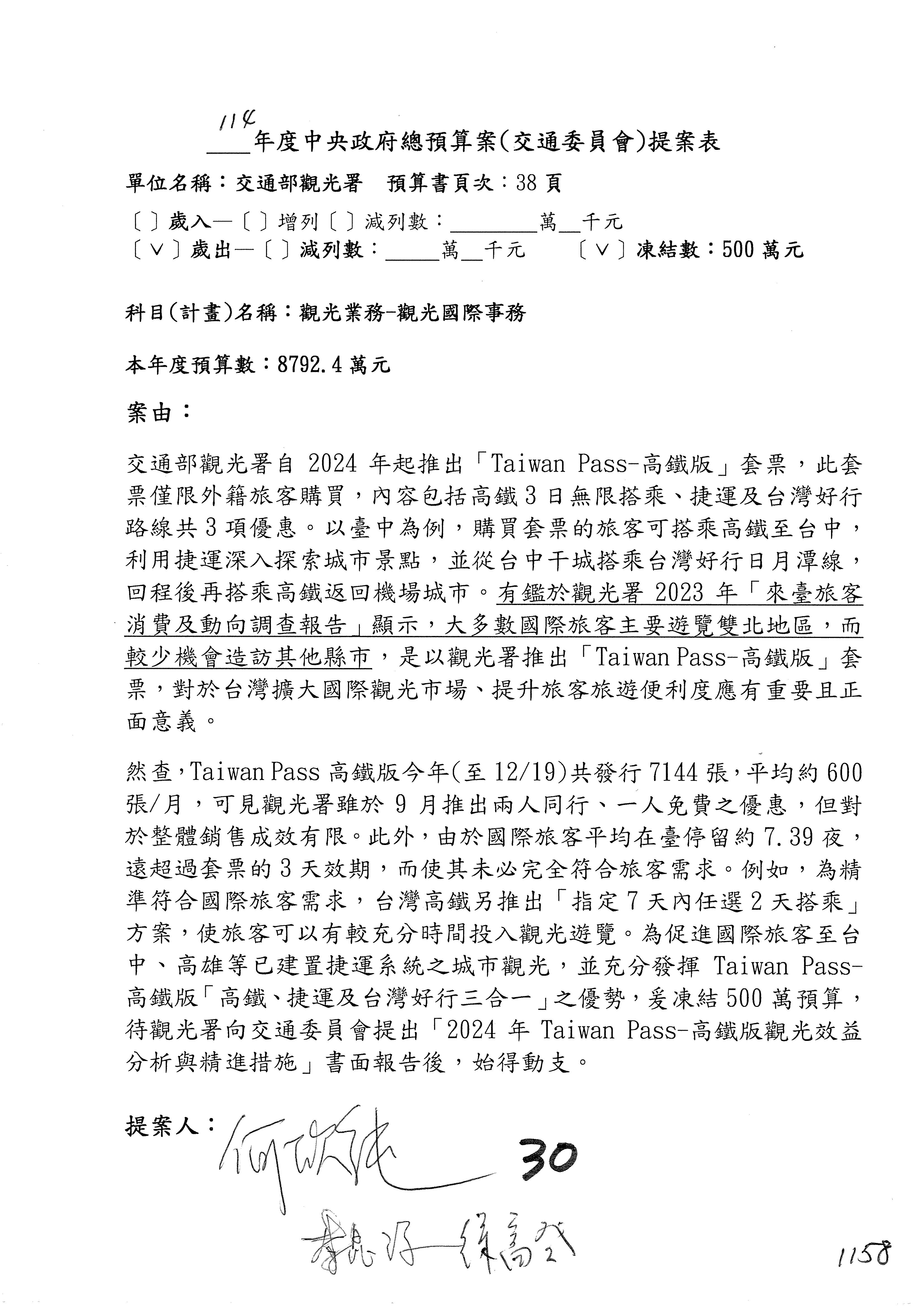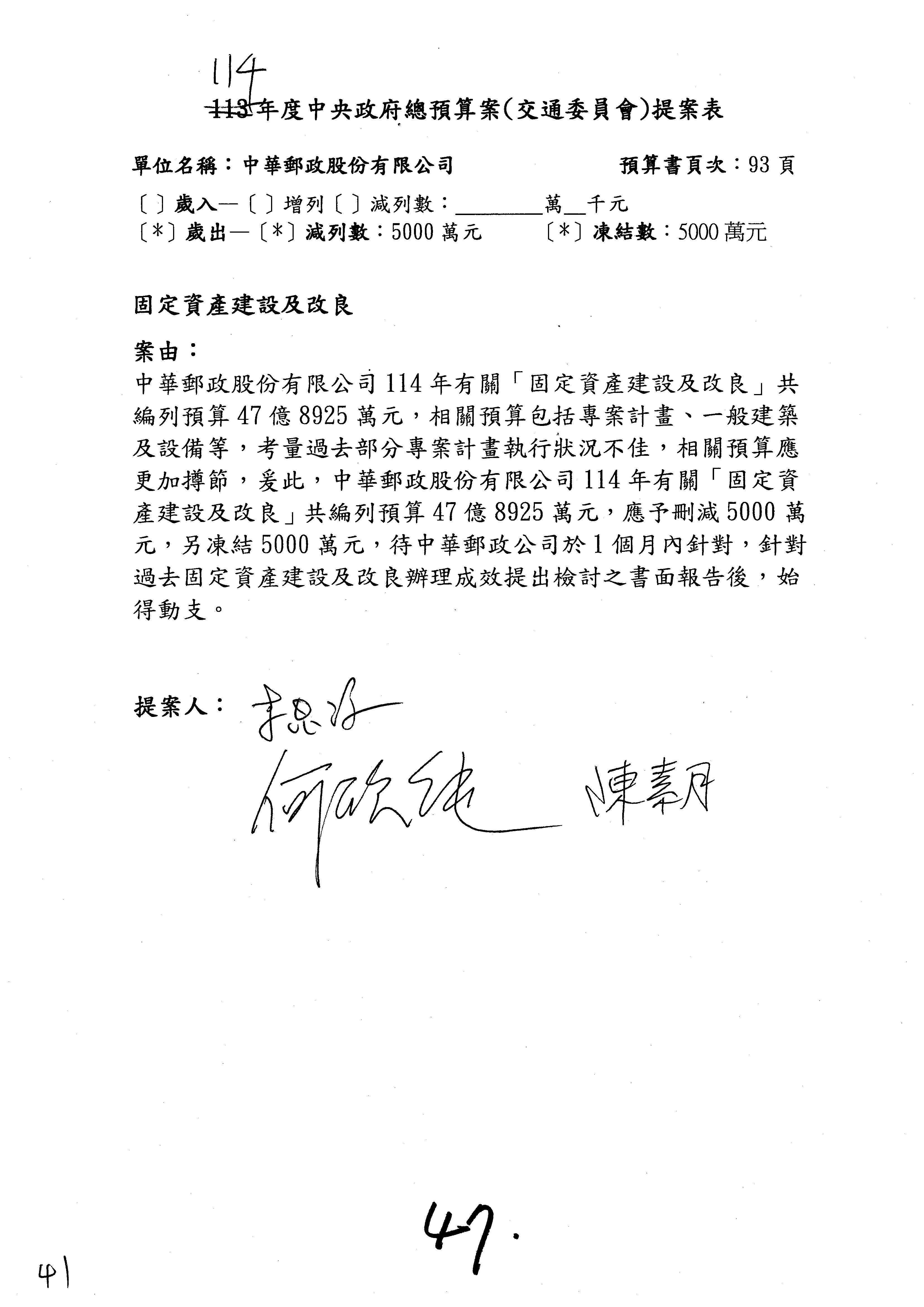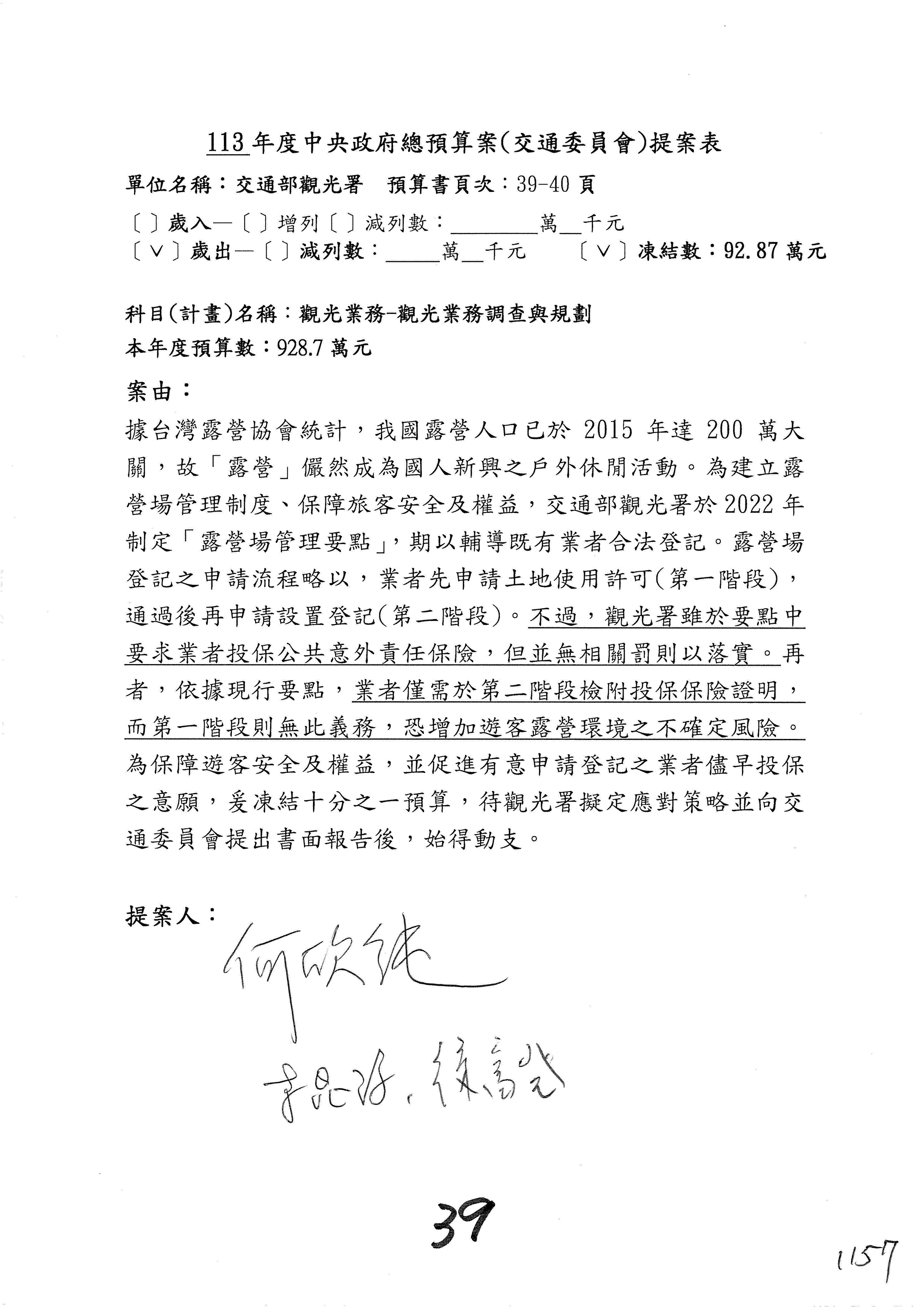 主席:凍結5%,提書面報告始得動支。