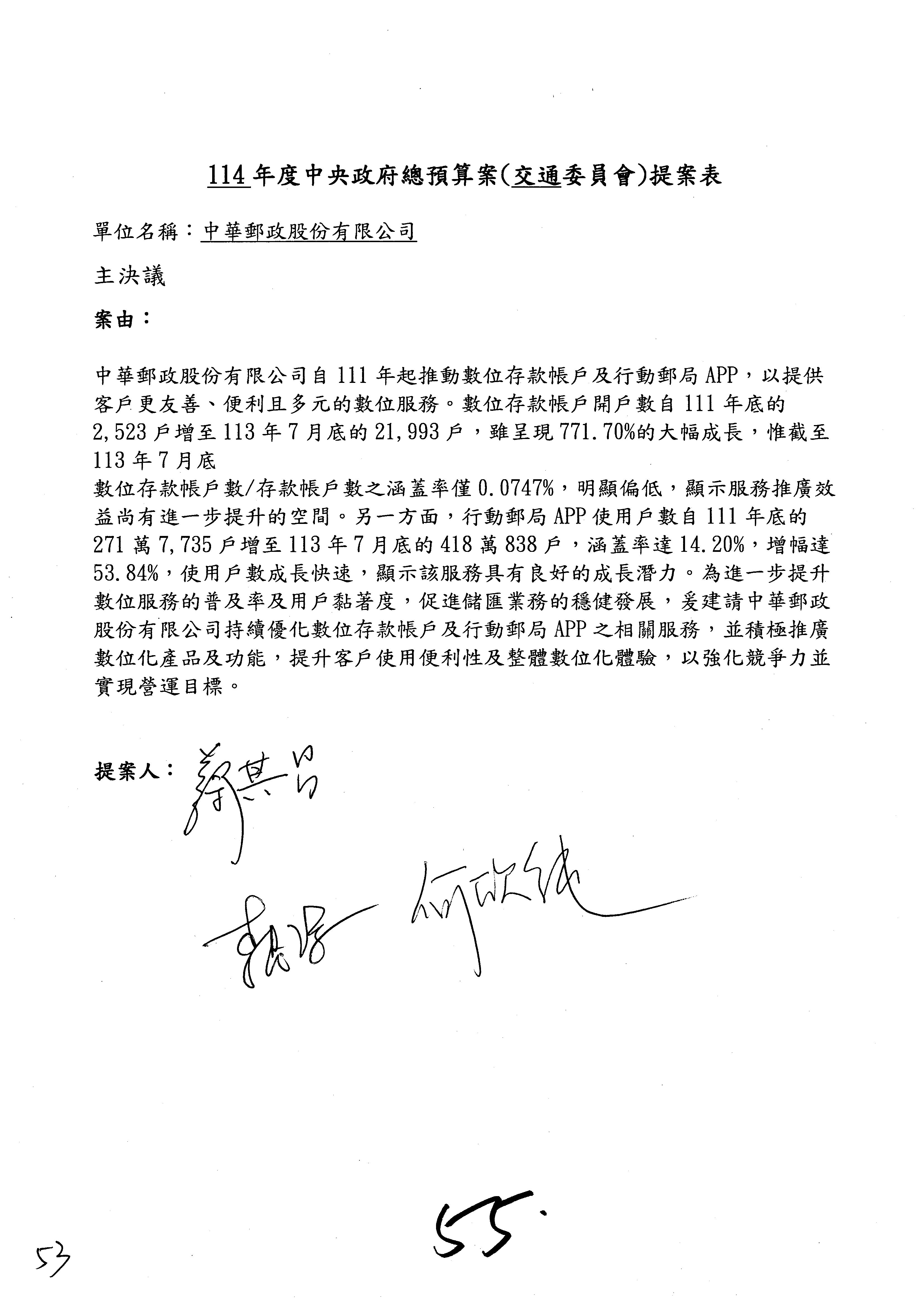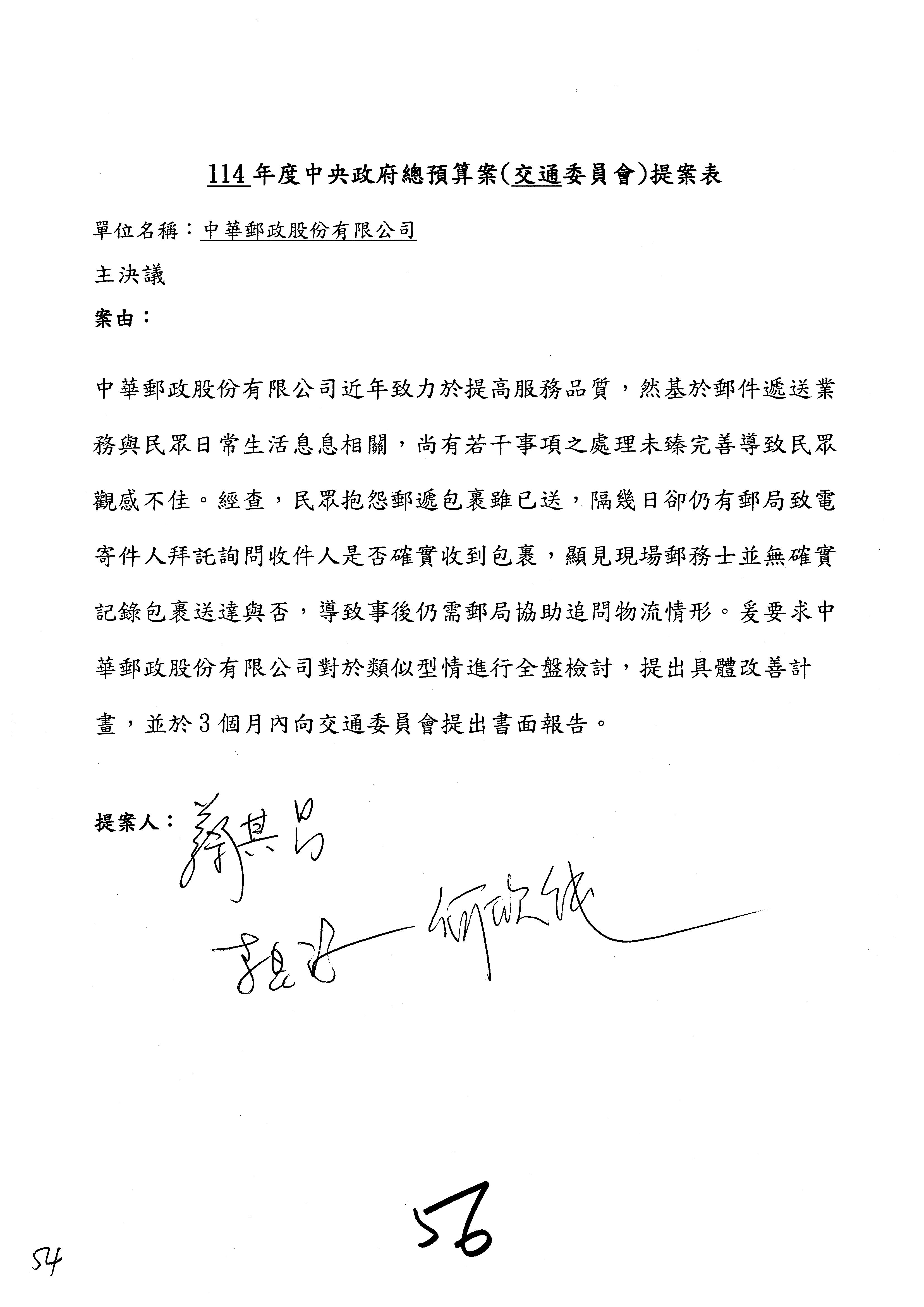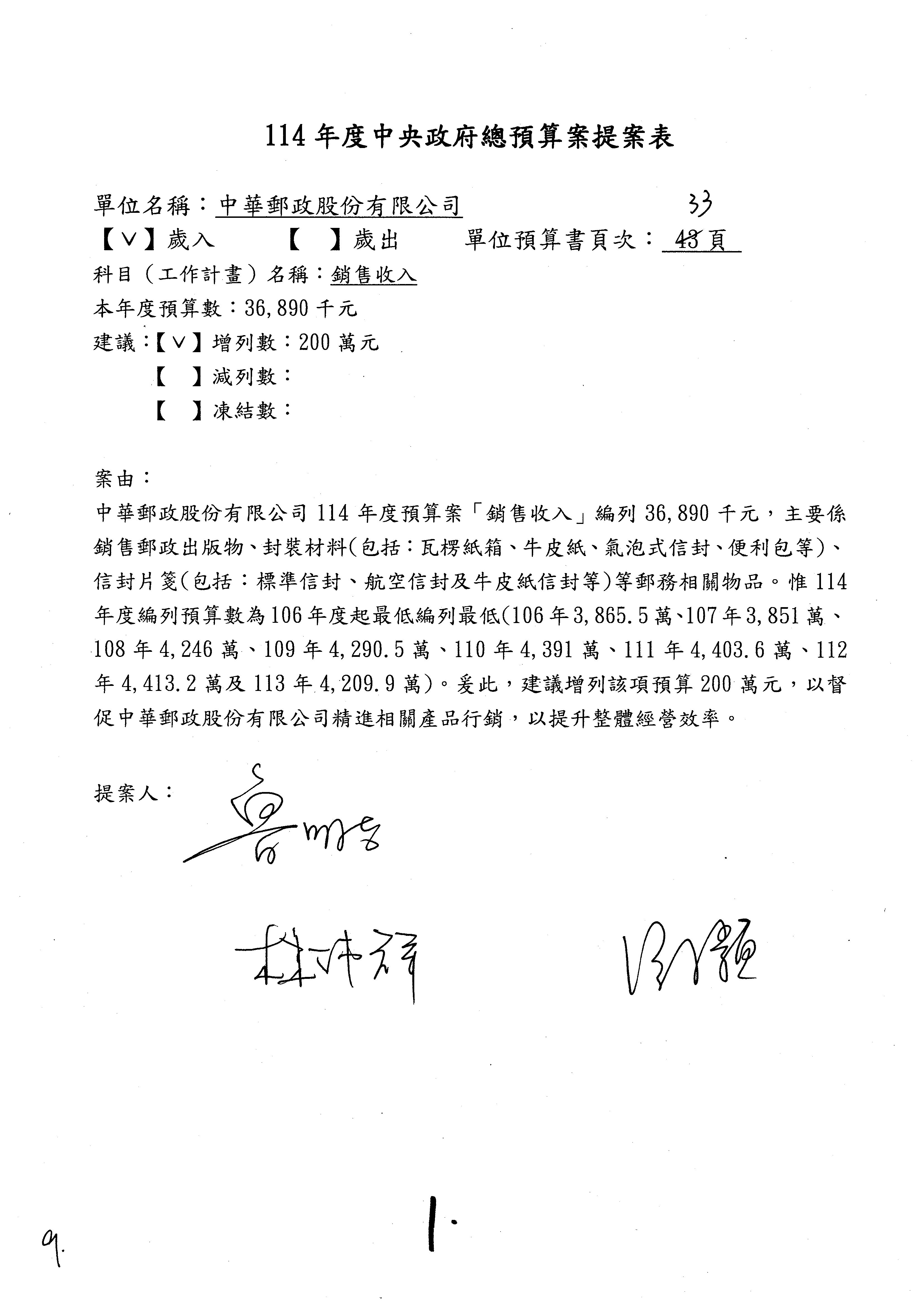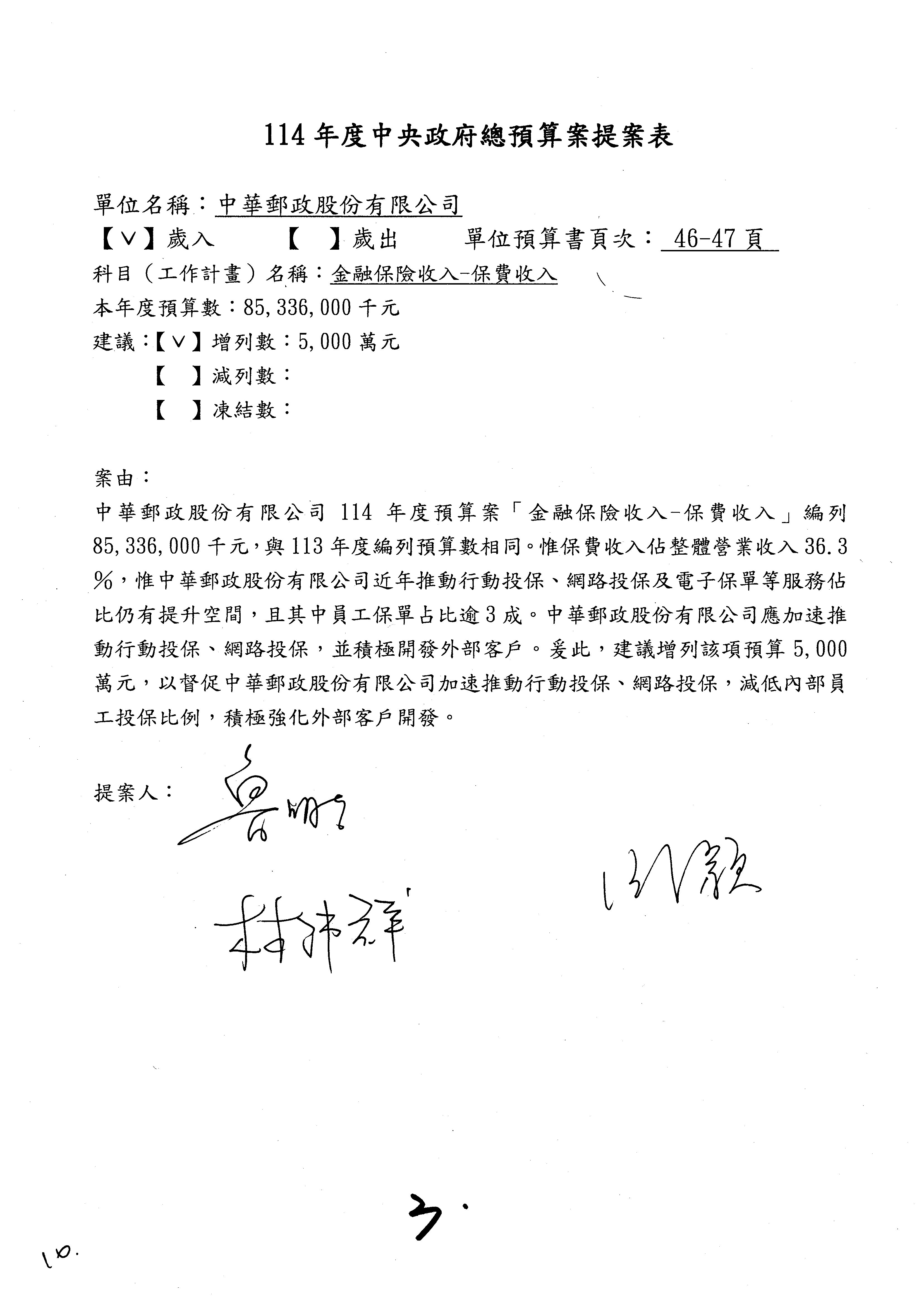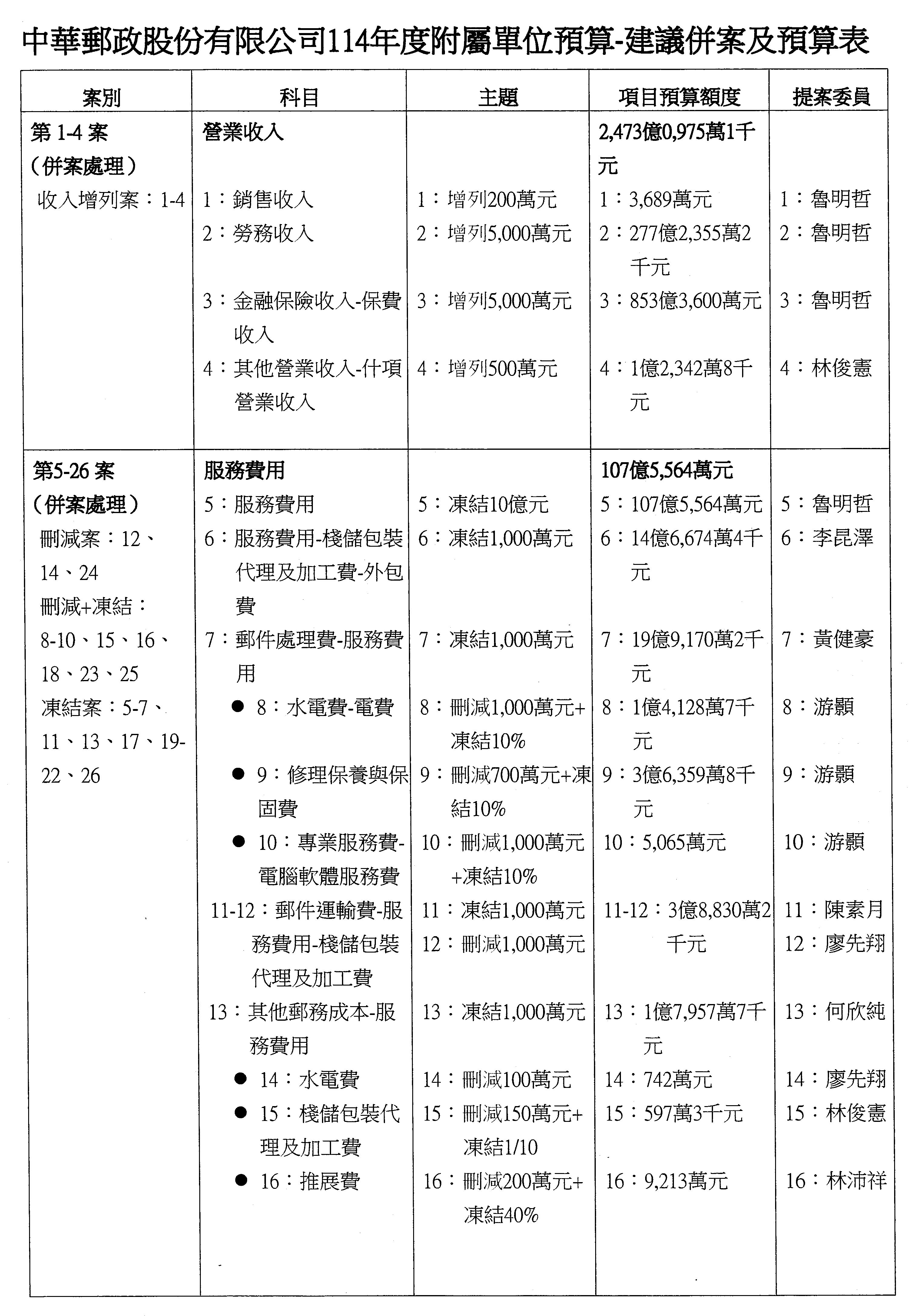 二、繼續審查114年度中央政府總預算案附屬單位預算營業部分關於交通部主管中華郵政股份有限公司營業預算。