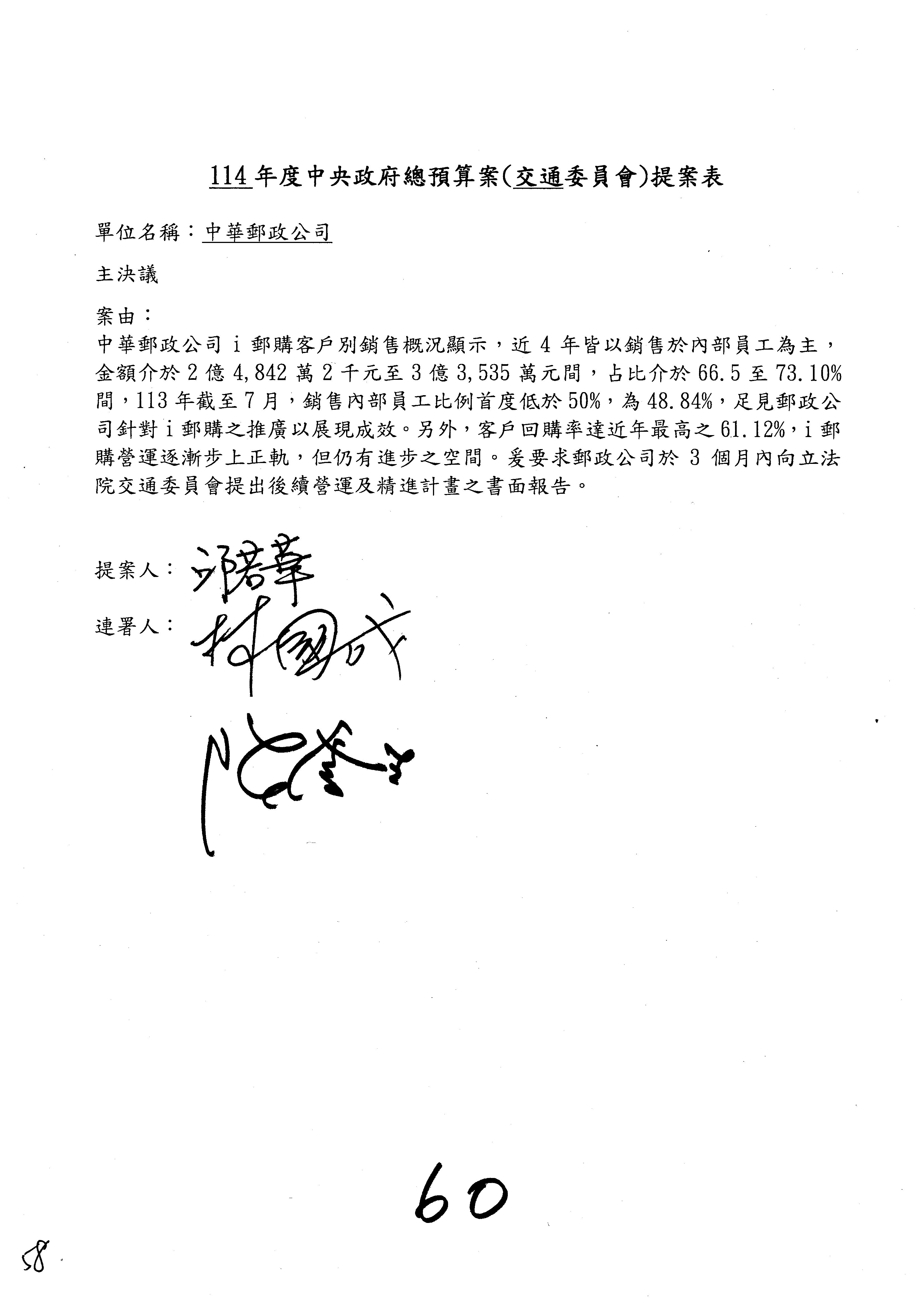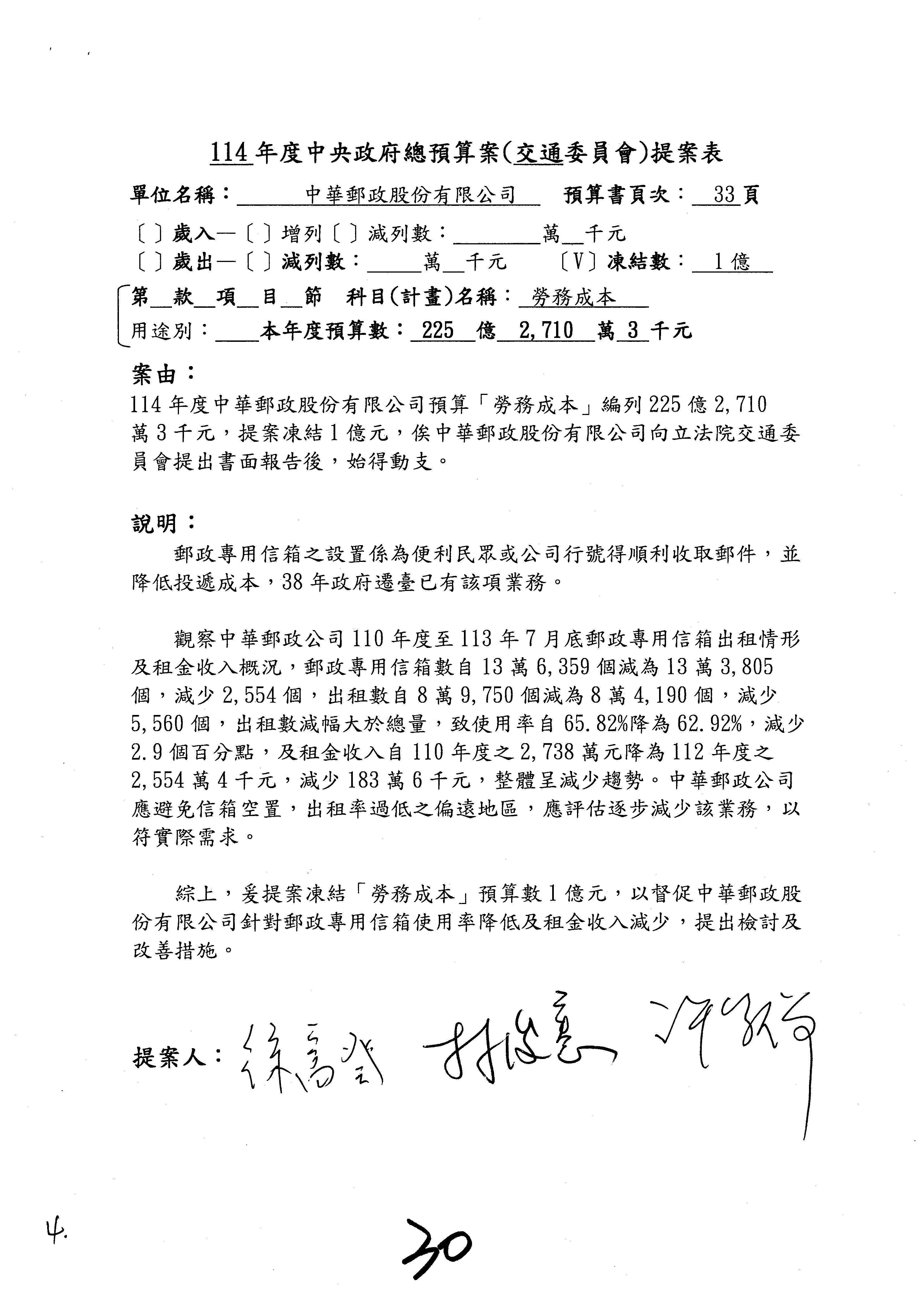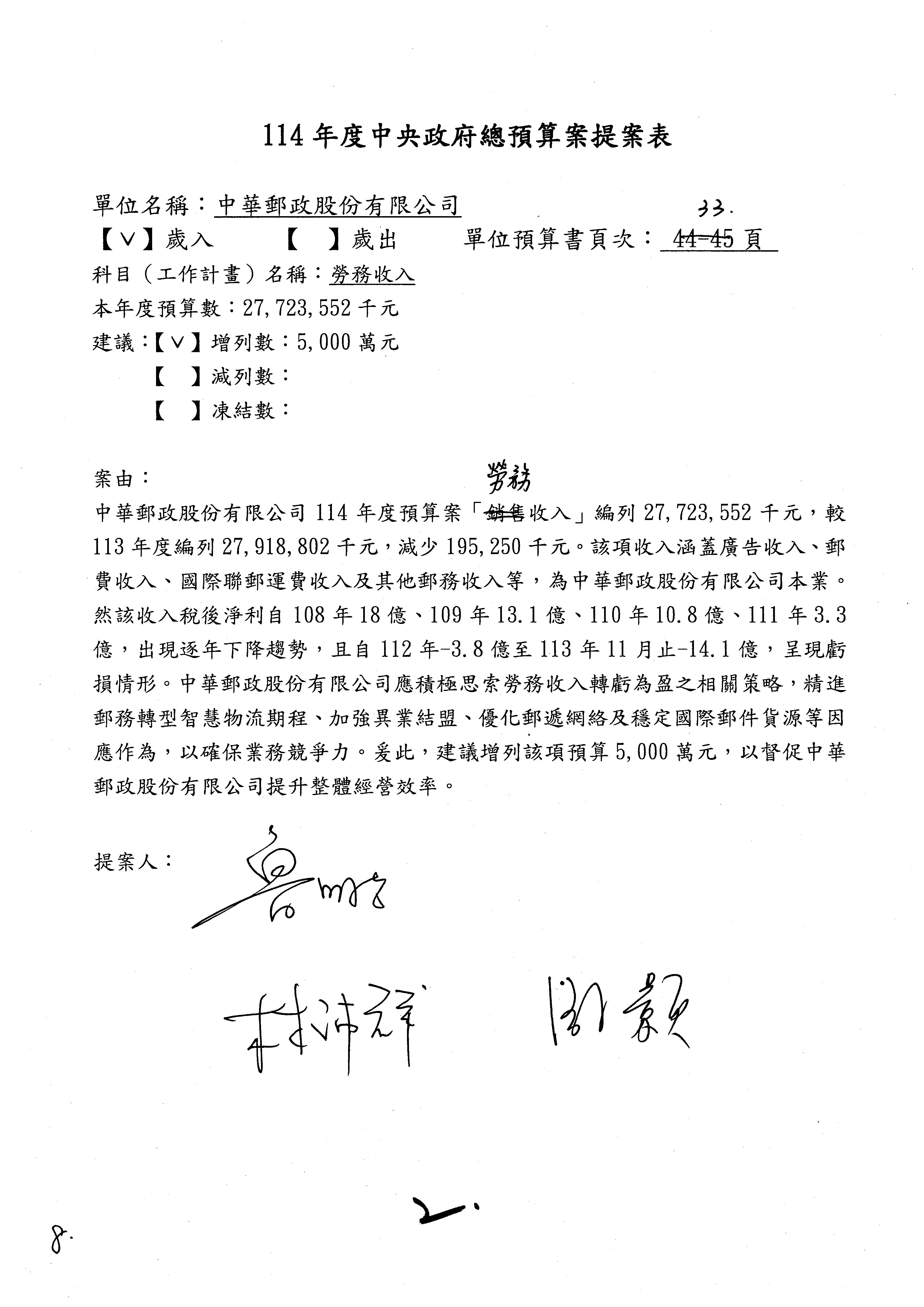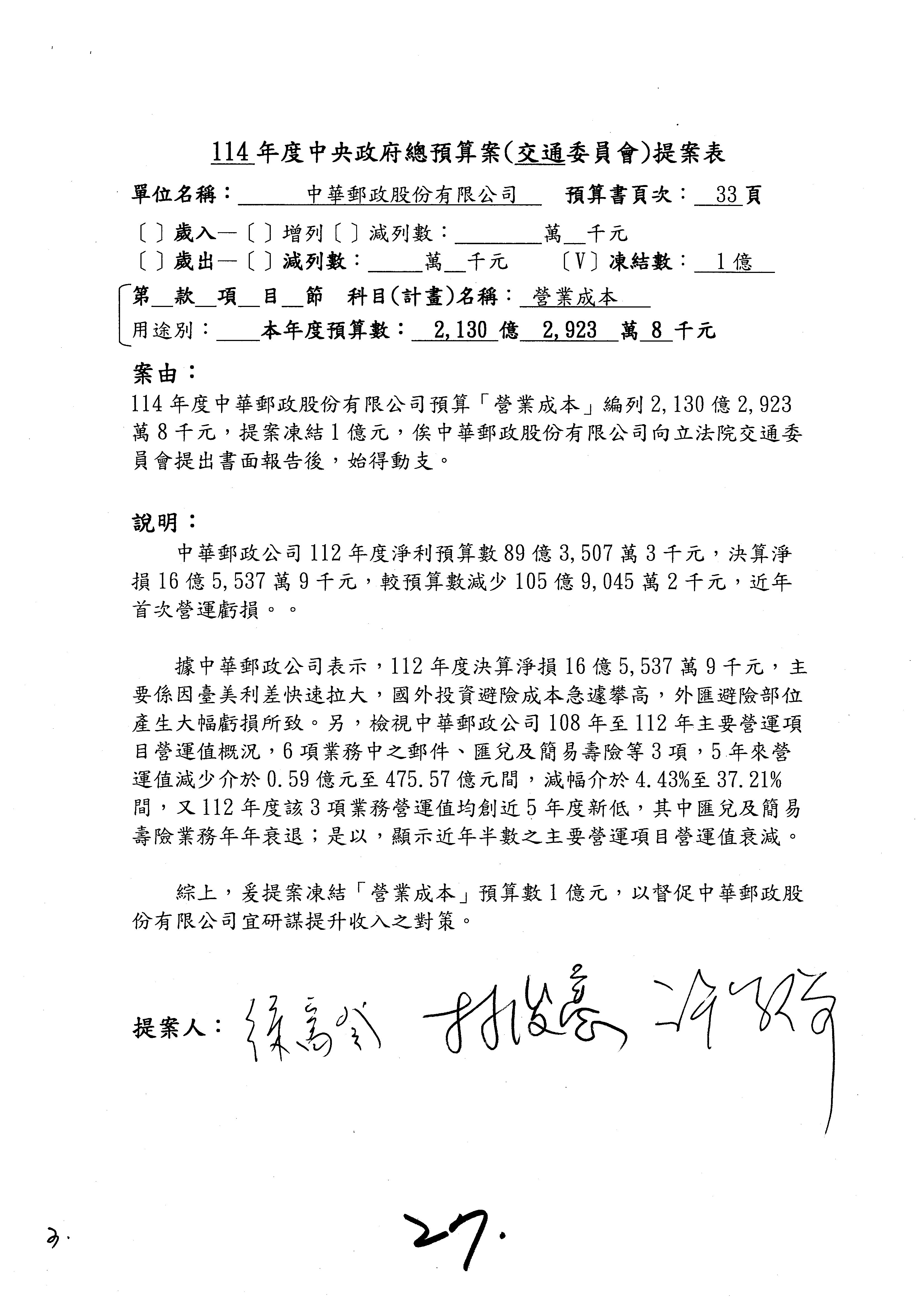 二、繼續審查114年度中央政府總預算案附屬單位預算營業部分關於交通部主管中華郵政股份有限公司營業預算。