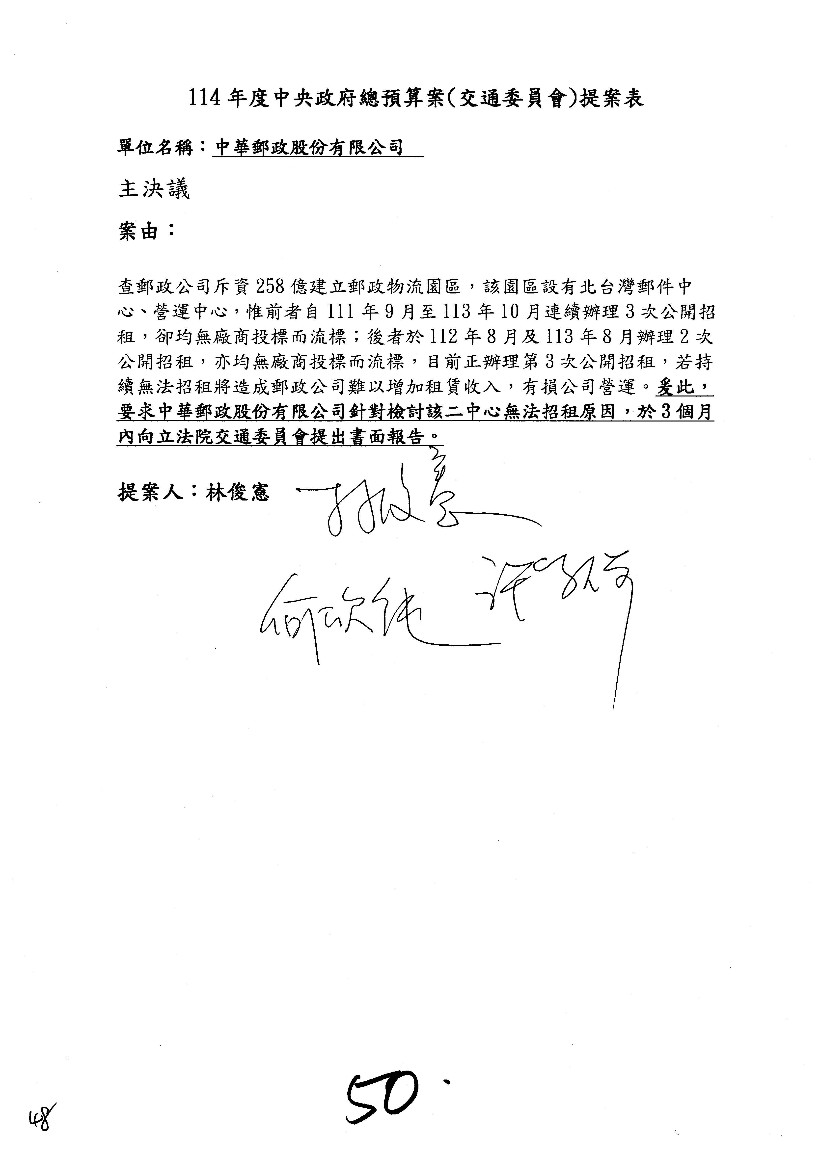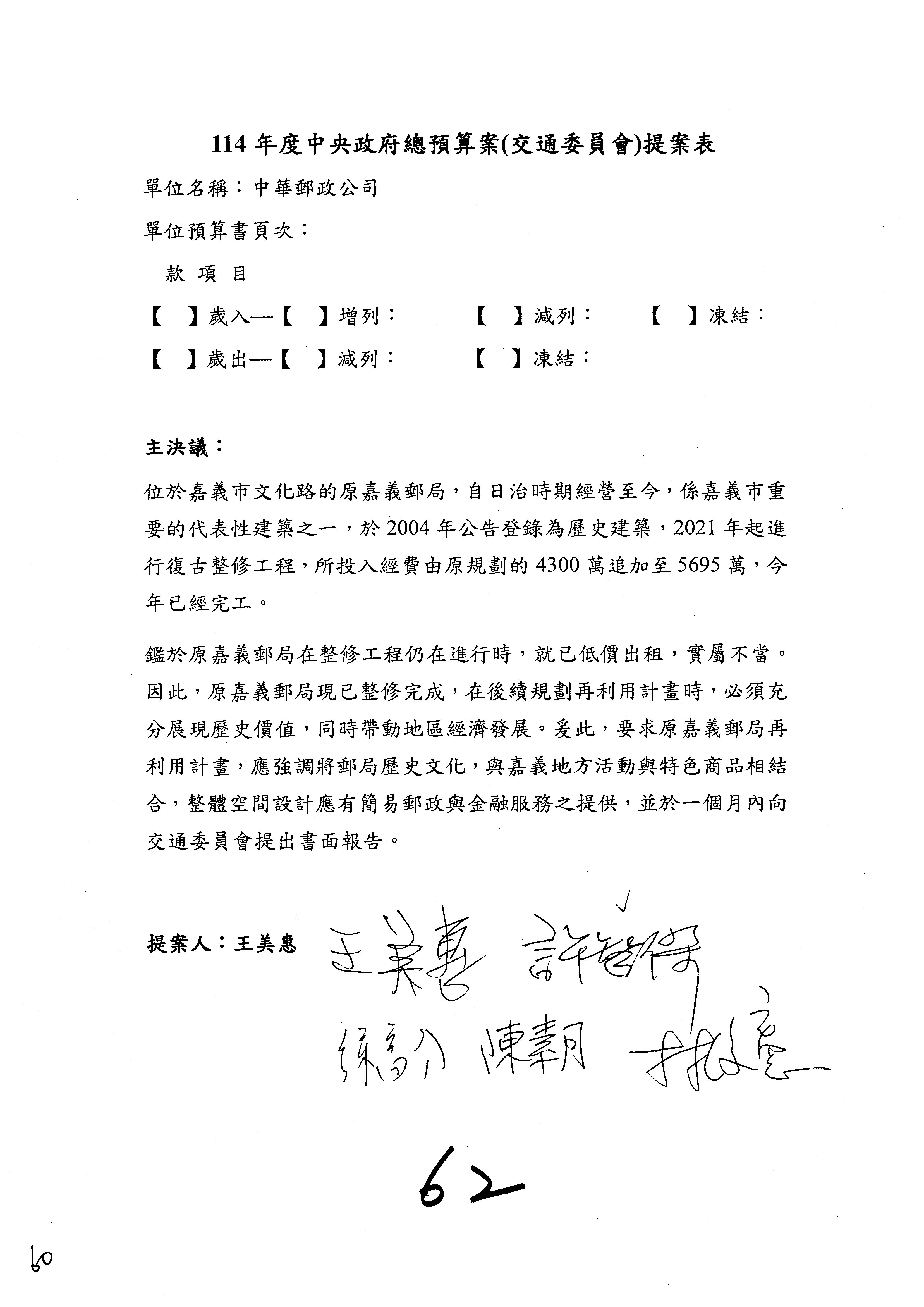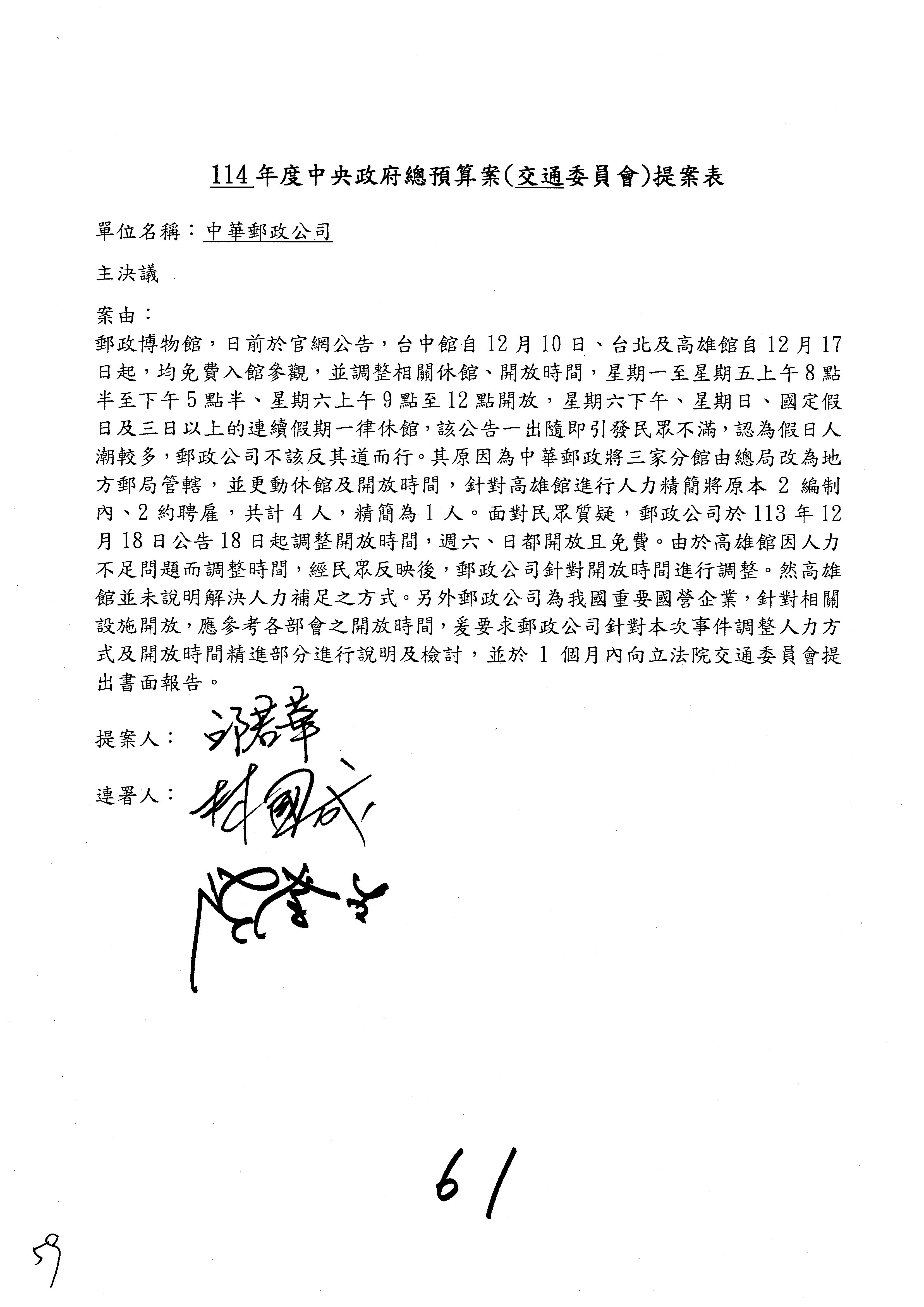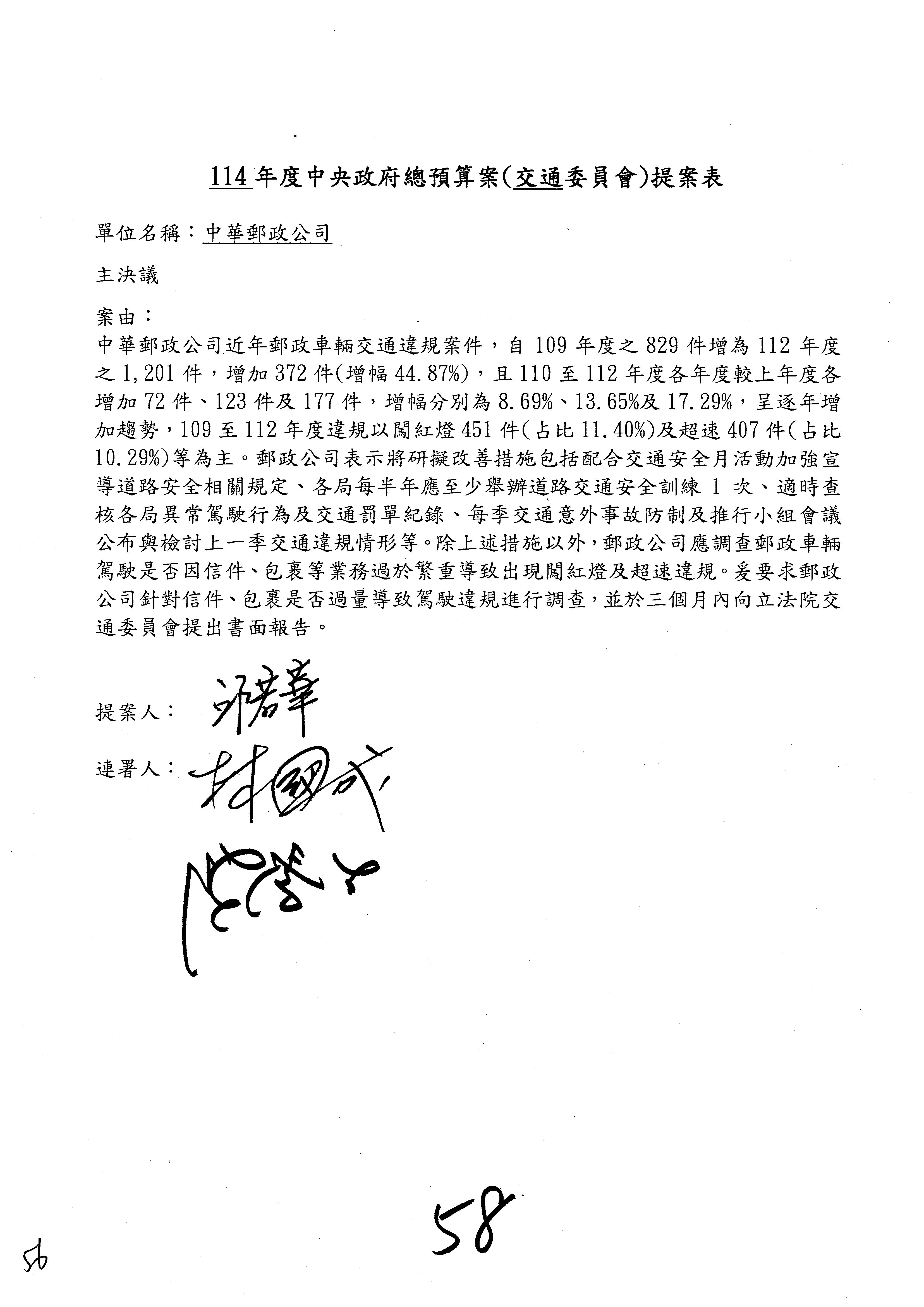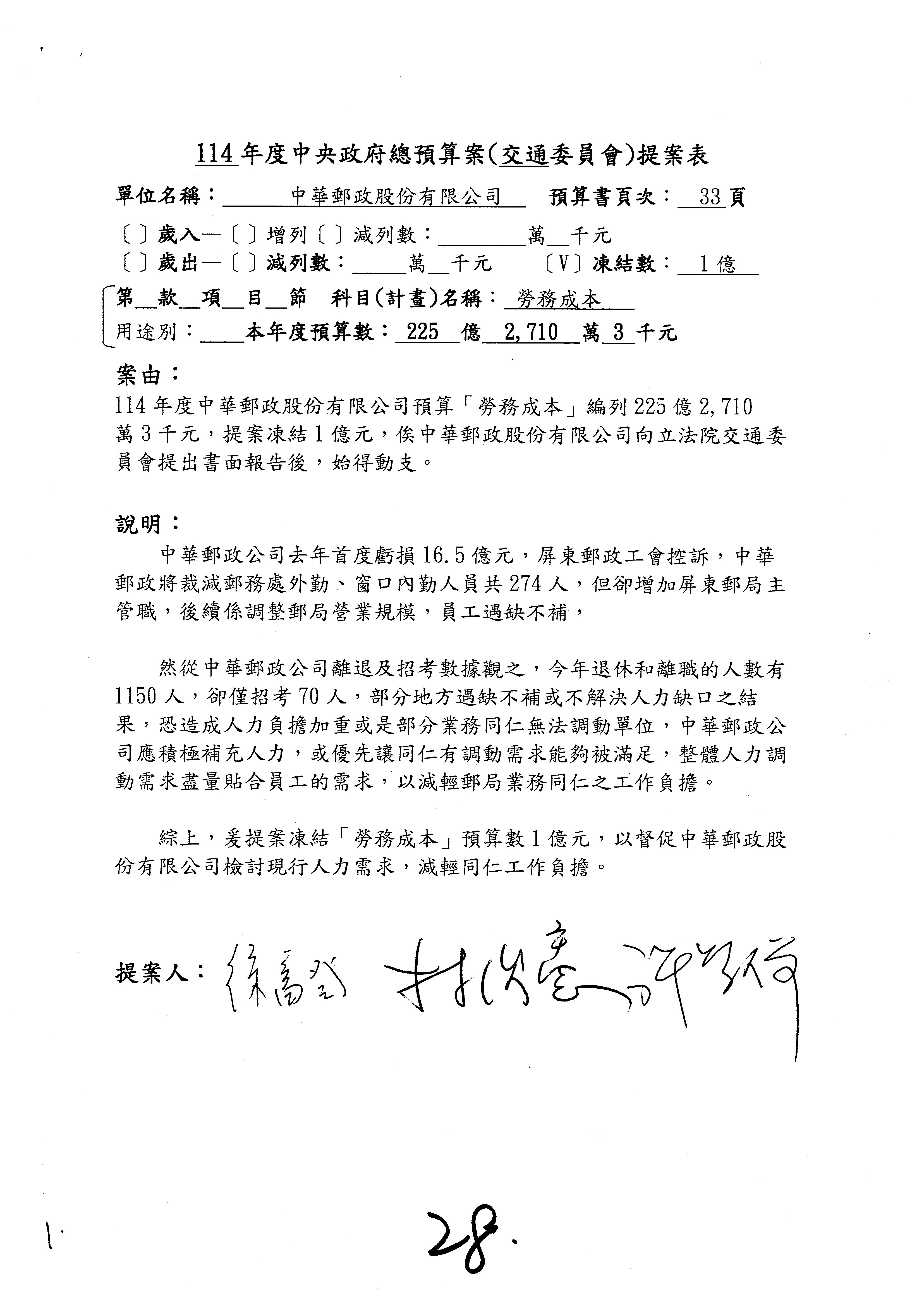 二、繼續審查114年度中央政府總預算案附屬單位預算營業部分關於交通部主管中華郵政股份有限公司營業預算。