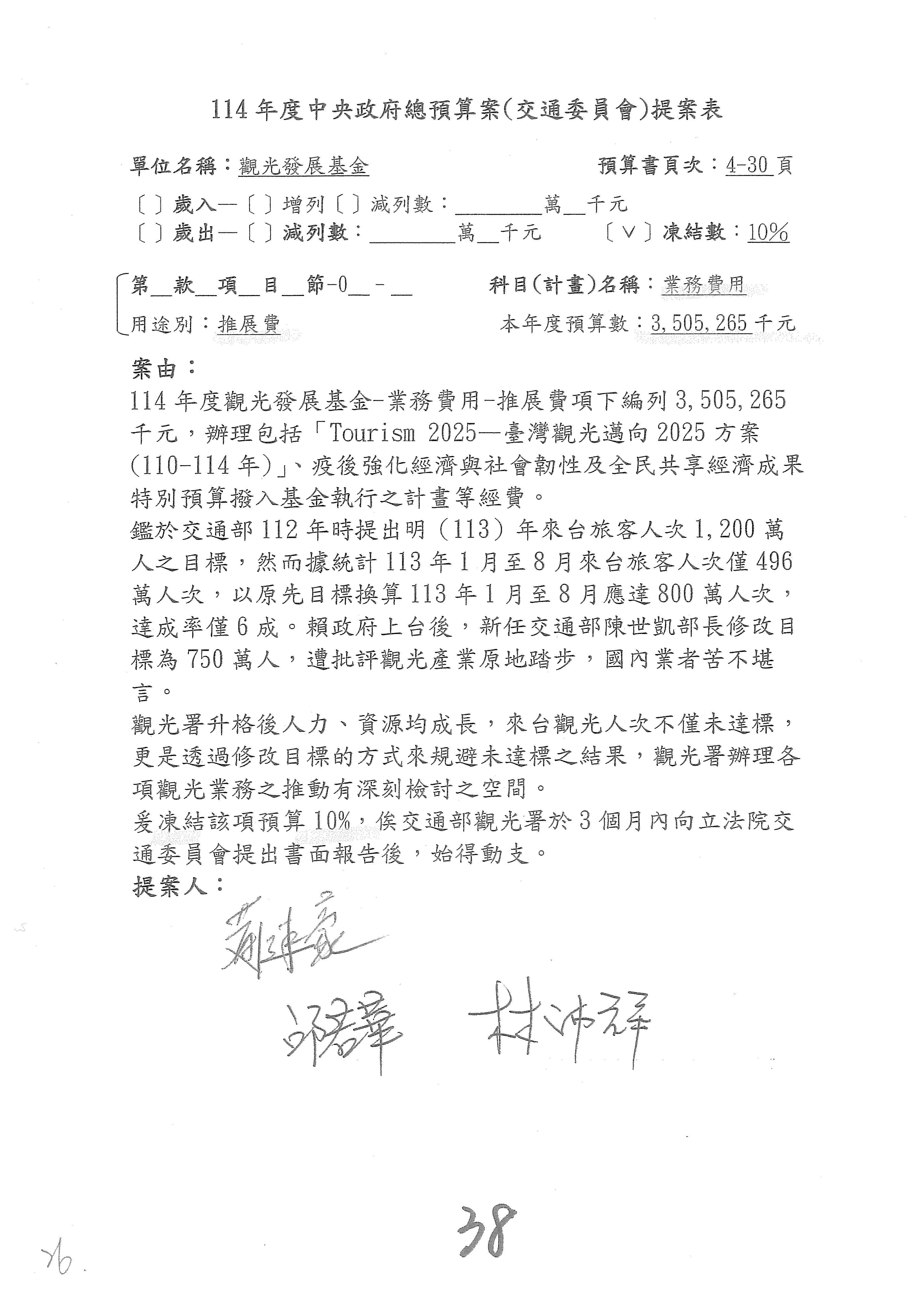 黃委員健豪:謝謝召委。本席是提第38案,和之前的觀光署本部預算類似,也是一樣的事情,就是你們要促進來臺旅客人次,不管是在本署的預算裡面,還是在這個基金裡面。本席只是提凍結,並沒有刪預算,但是本席想要知道,本來是預計1,200萬人,結果現在下修,所以本席想問一下,2025年開始了,如果這些錢給你們運用,你們的目標數是多少?這樣我們才有辦法審今年的預算。