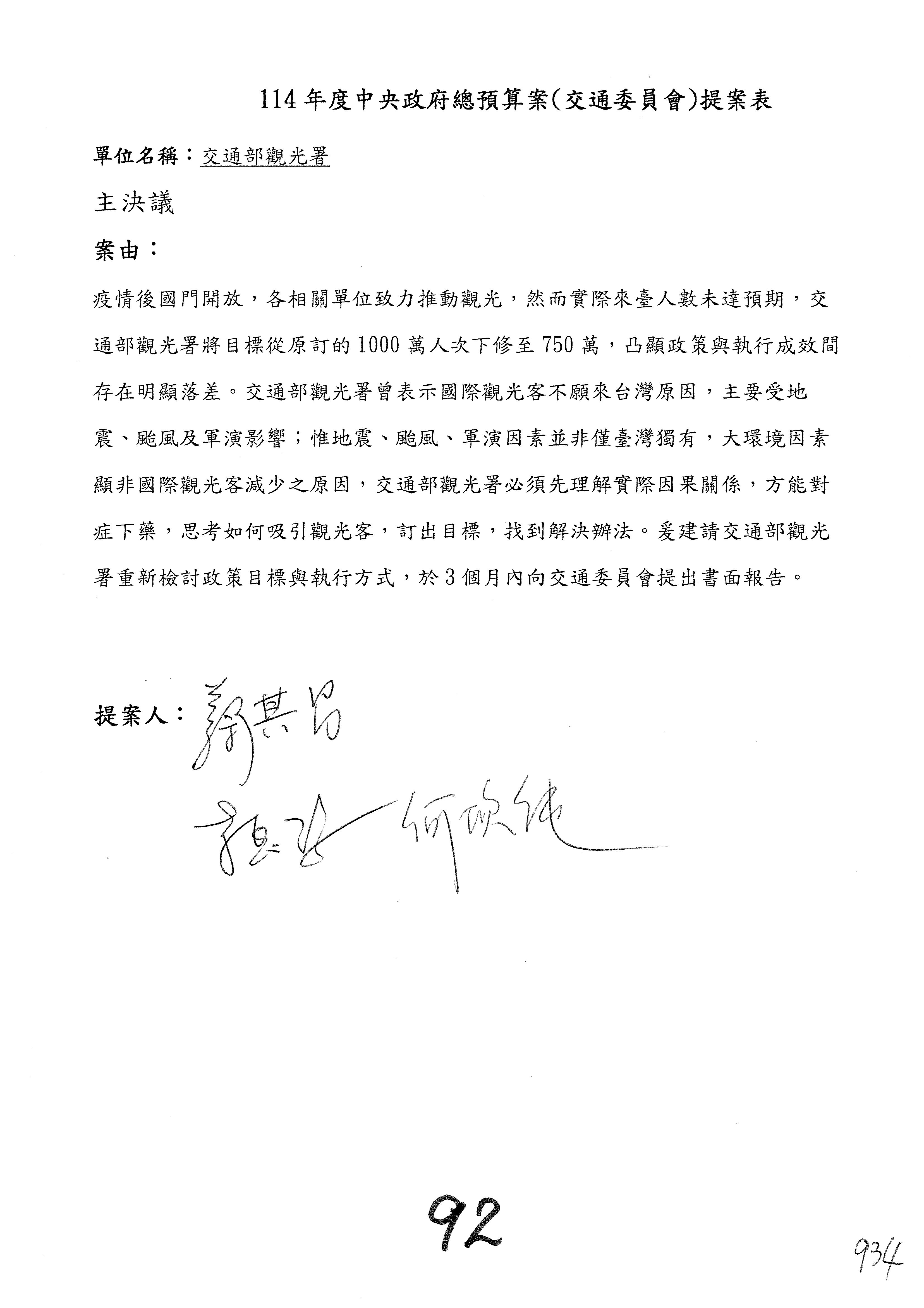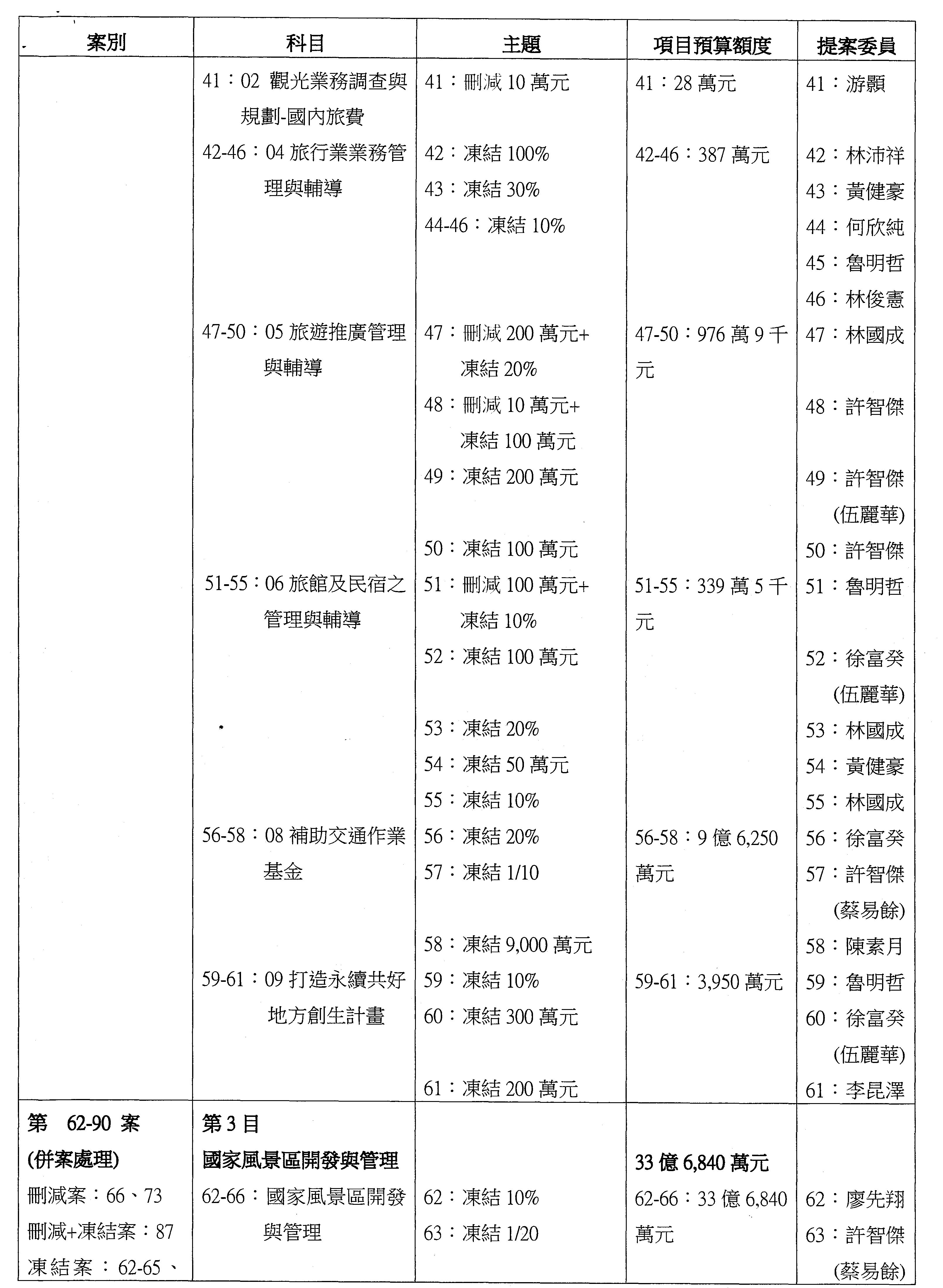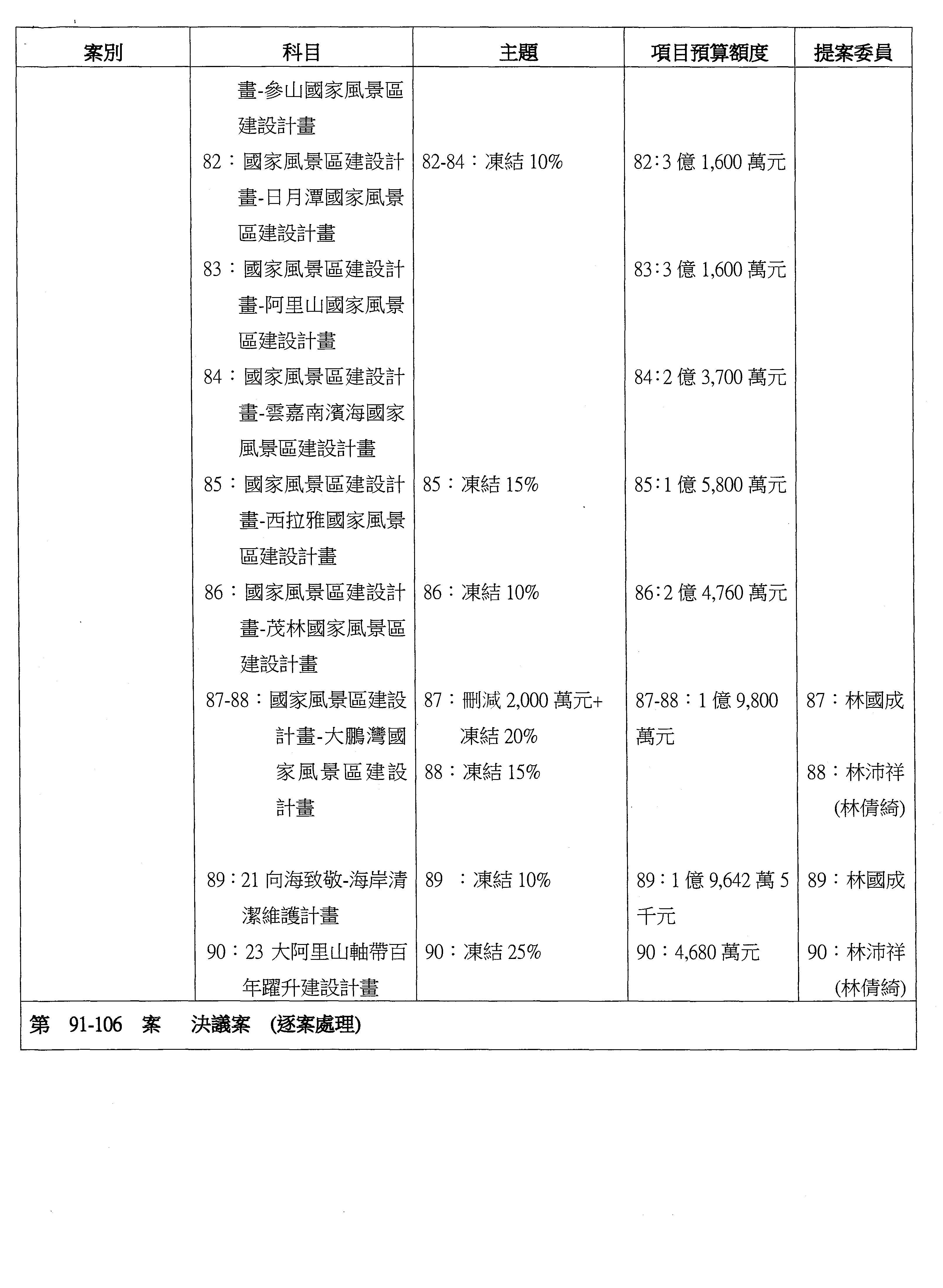如果沒有問題,接下來處理主決議案,第91案到第106案,請各位委員翻開第91案。第91案。觀光署。