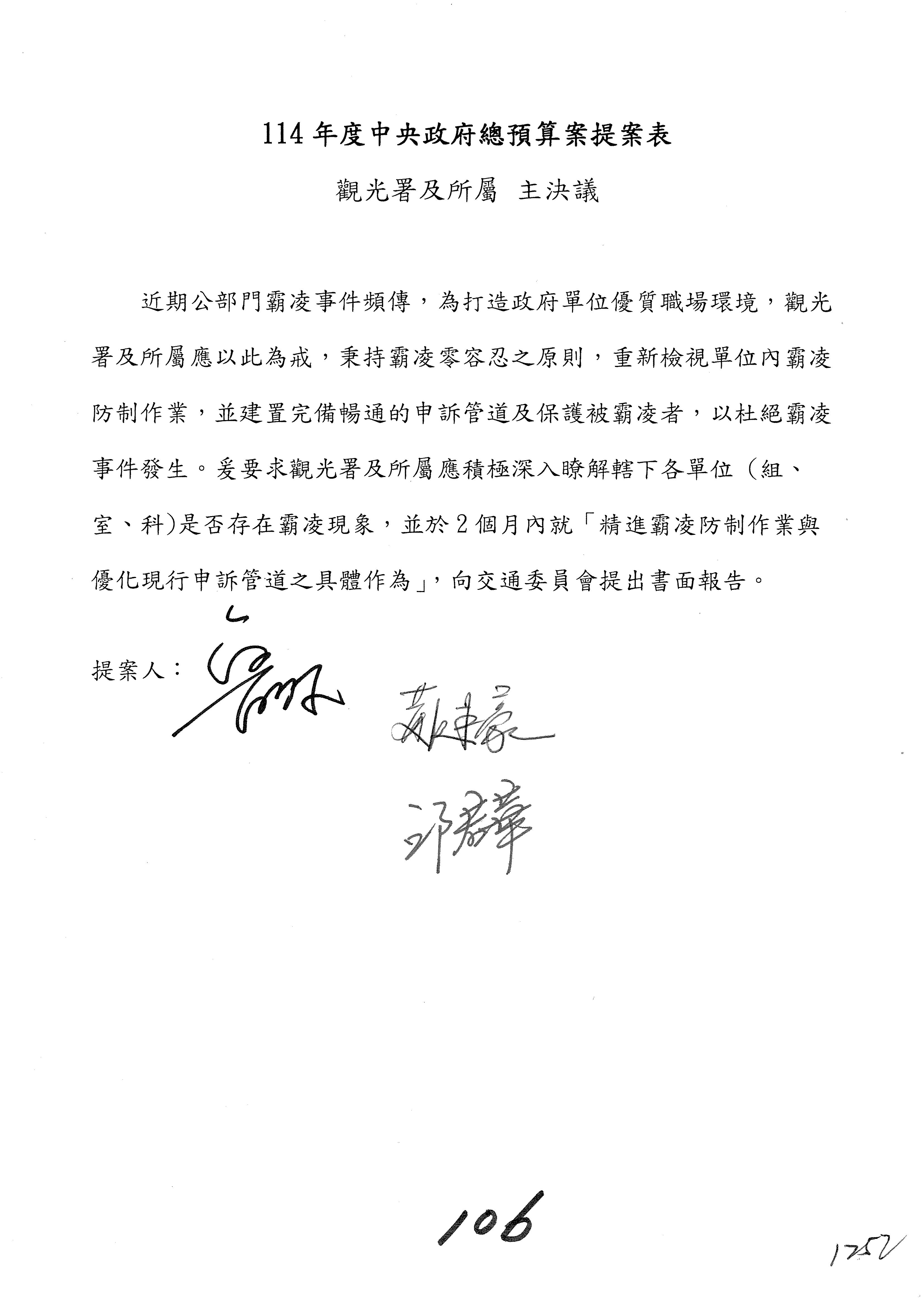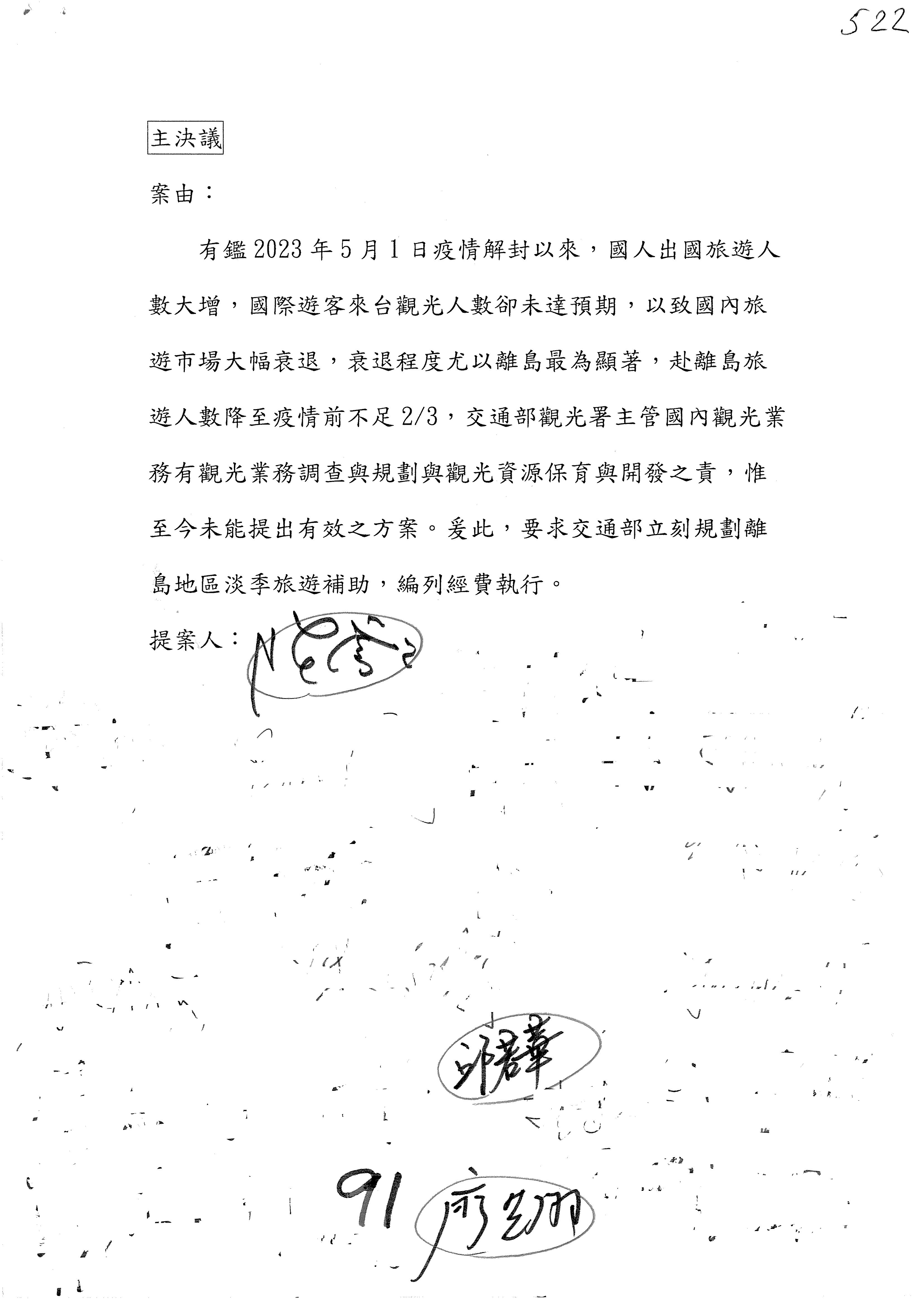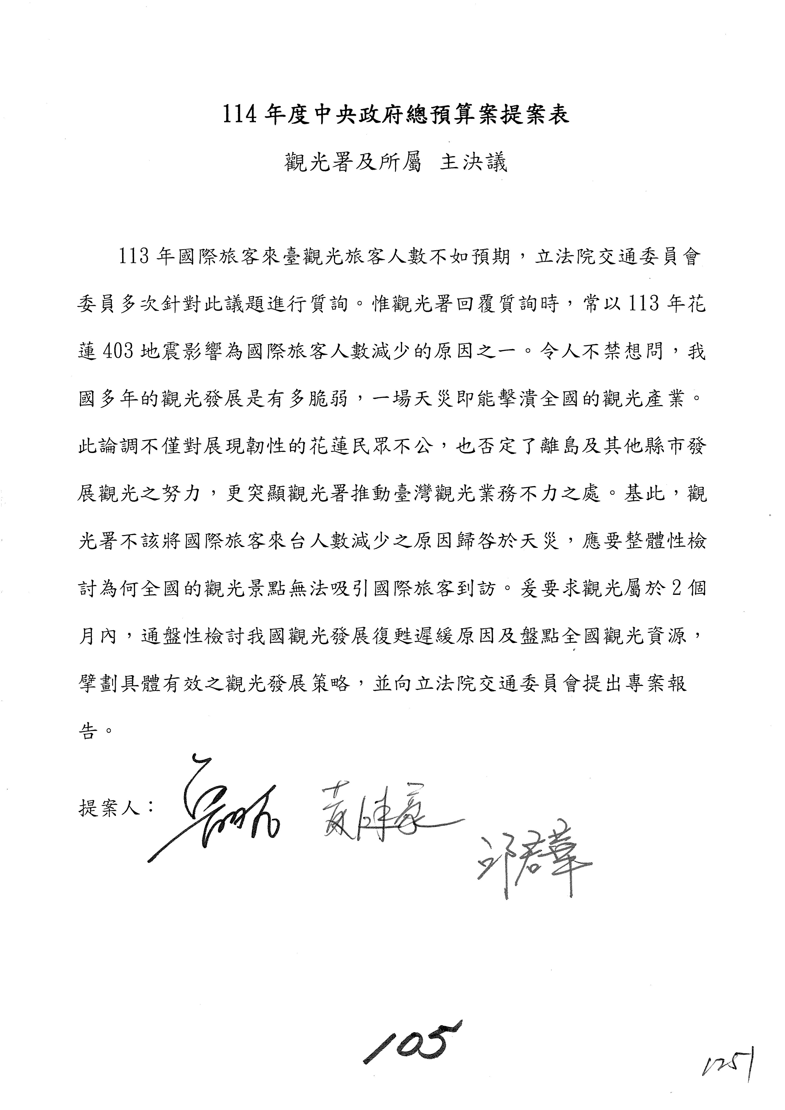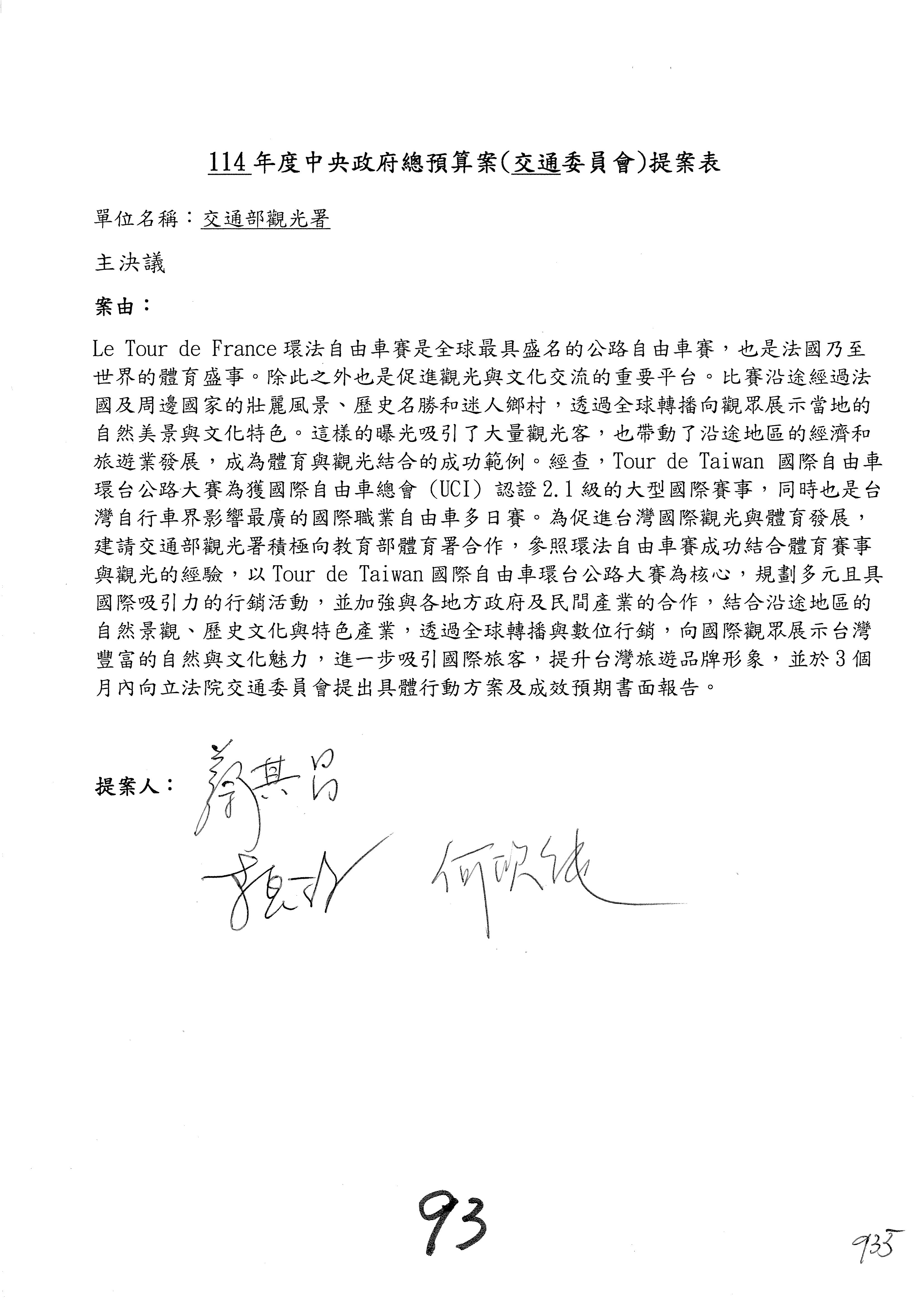 如果沒有問題,接下來處理主決議案,第91案到第106案,請各位委員翻開第91案。第91案。觀光署。