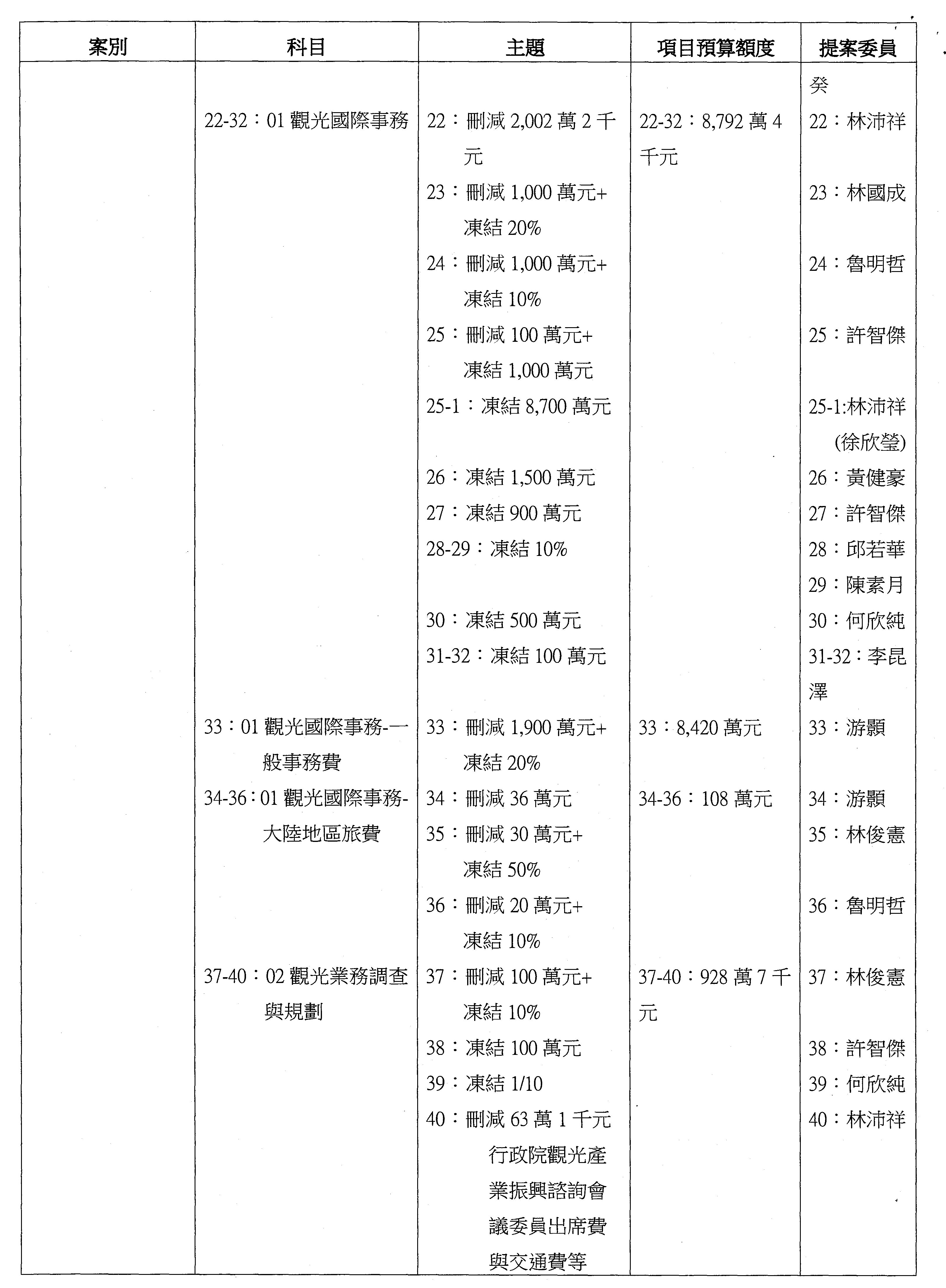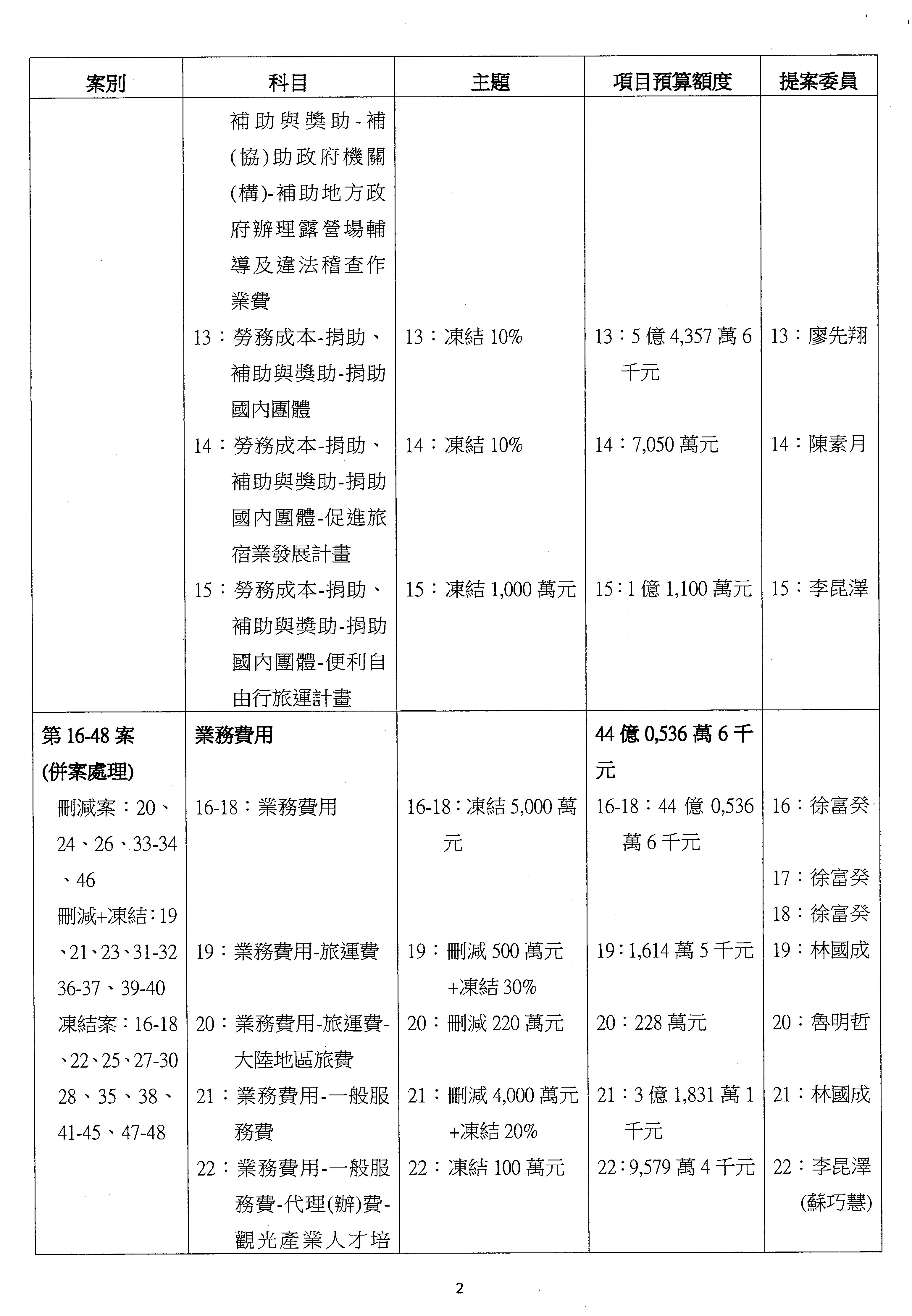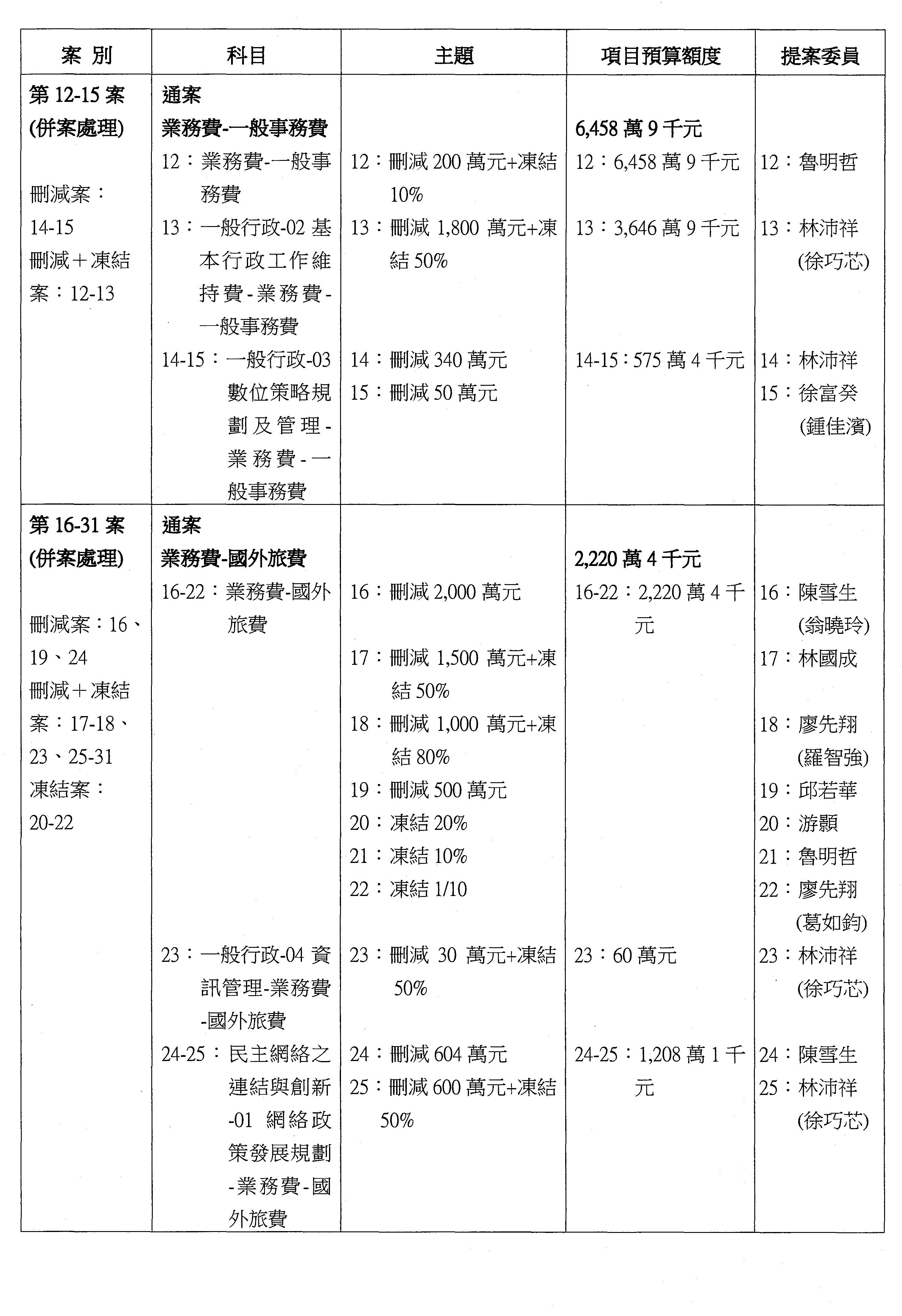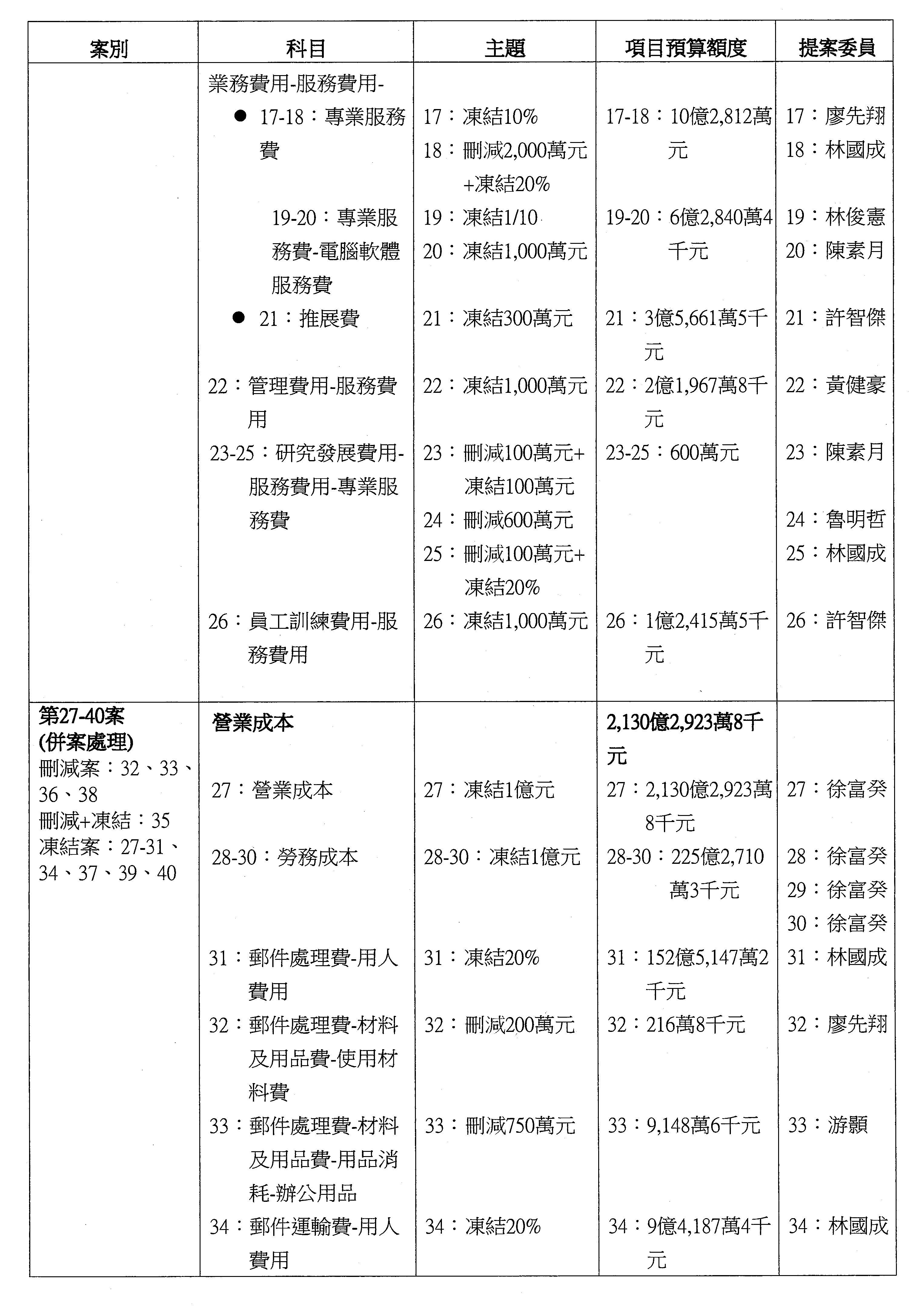 主席:本席再宣告一下,針對第16案到第48案「業務費用」,處理方式如下,刪減2,000萬元,凍結10%,科目自行調整,提供書面報告始得動支。好,沒問題的話,我們繼續處理。這個階段改主決議的有兩案,第17案和第22案改為主決議。