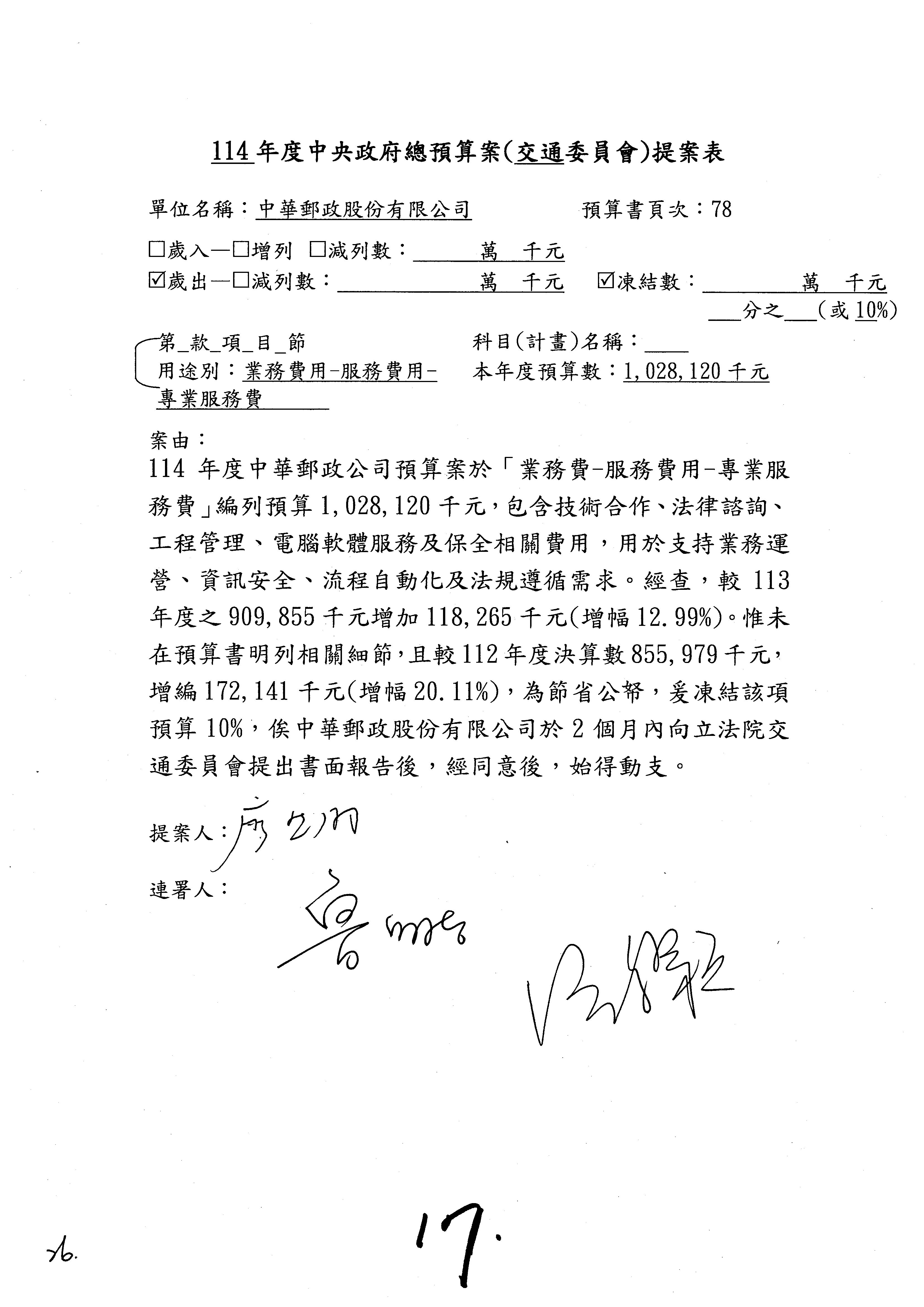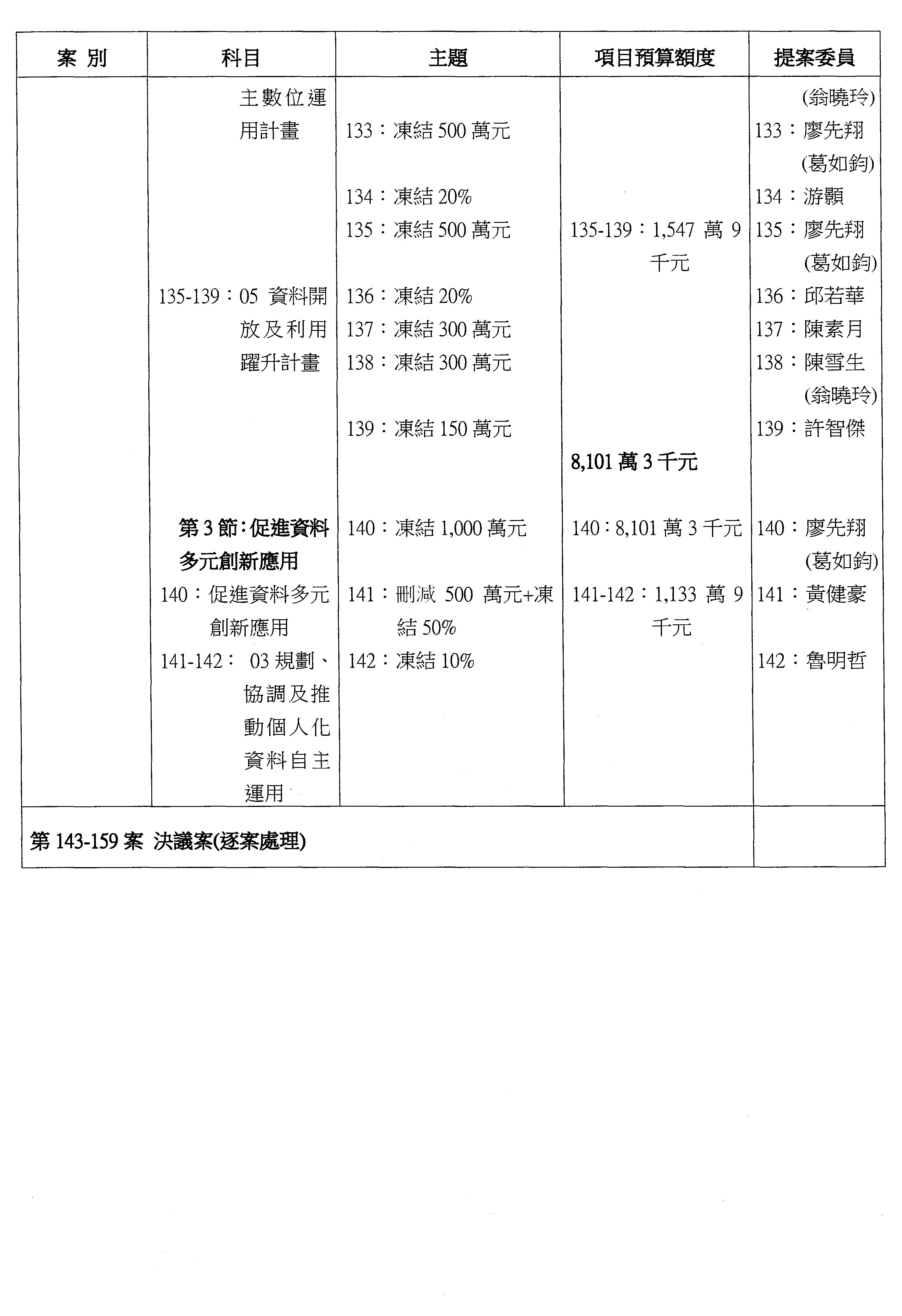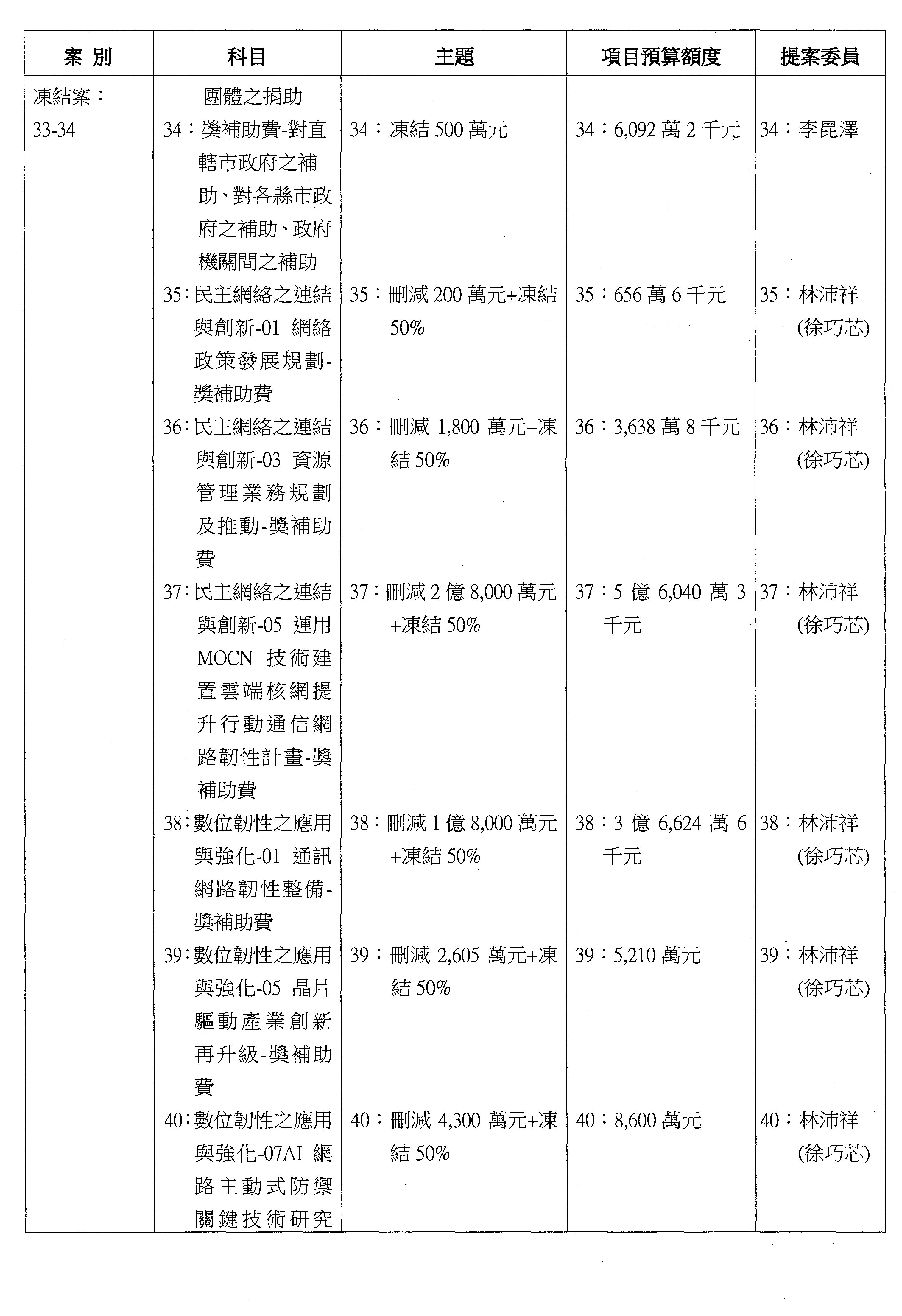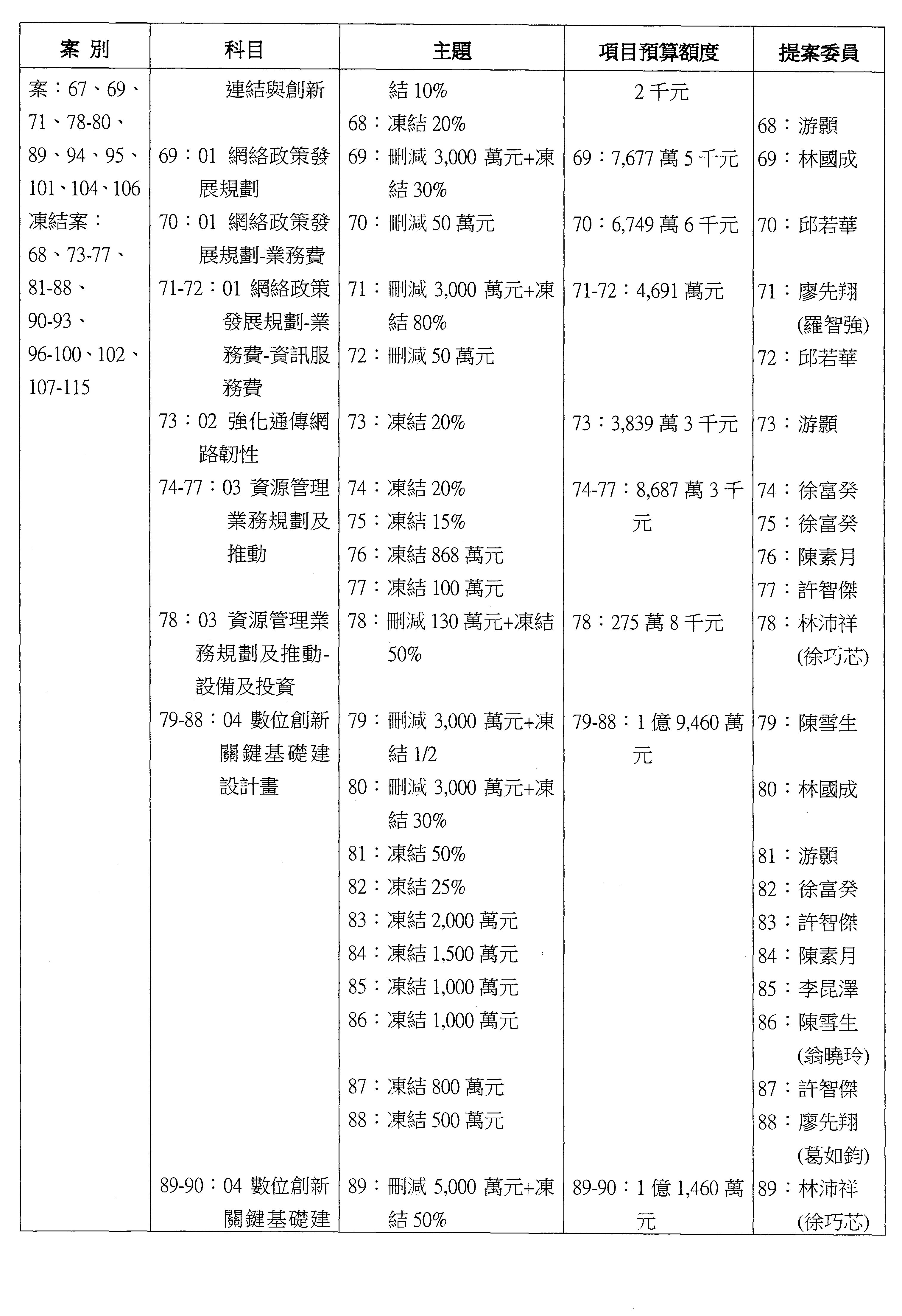主席:本席再宣告一下,針對第16案到第48案「業務費用」,處理方式如下,刪減2,000萬元,凍結10%,科目自行調整,提供書面報告始得動支。好,沒問題的話,我們繼續處理。這個階段改主決議的有兩案,第17案和第22案改為主決議。