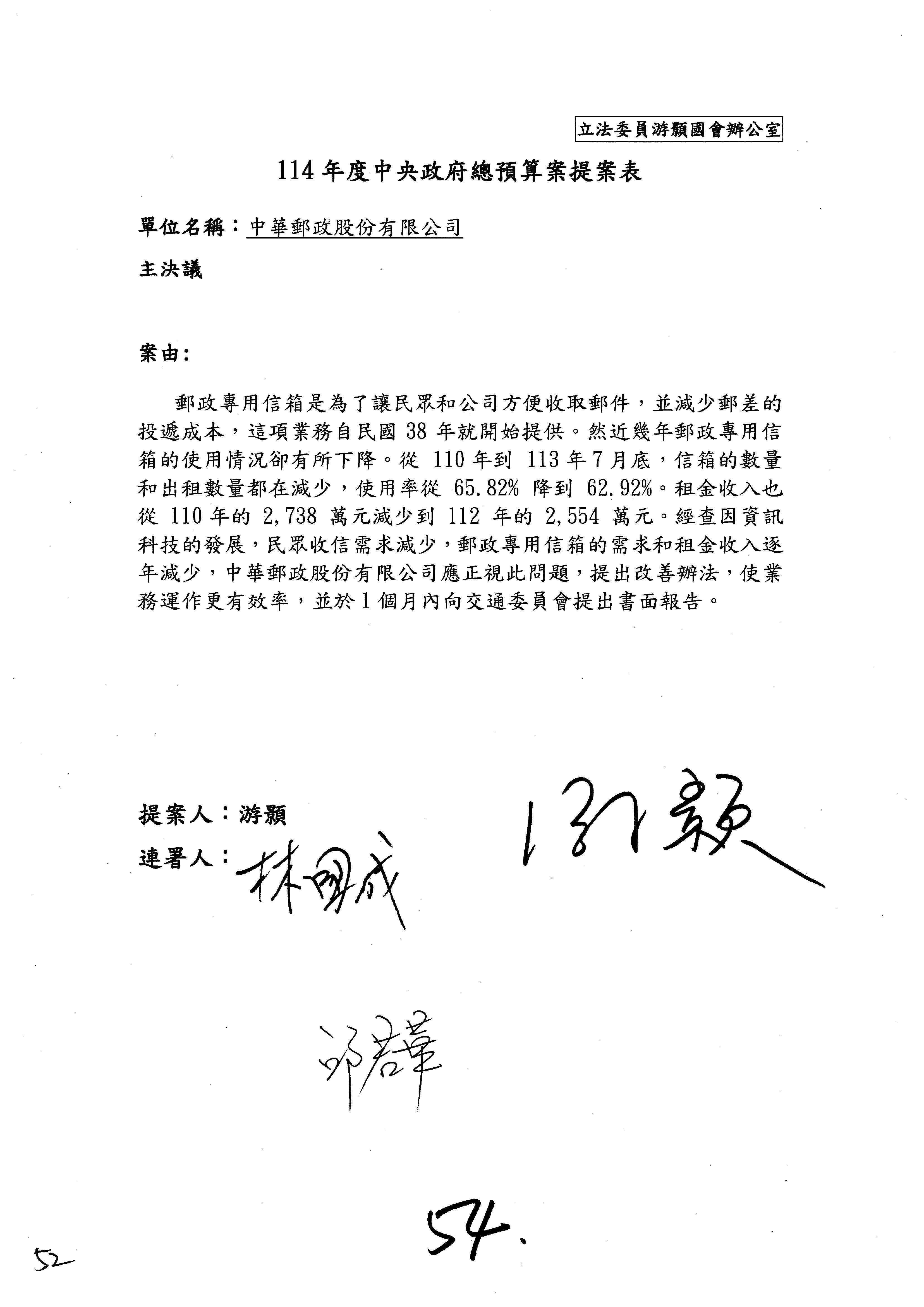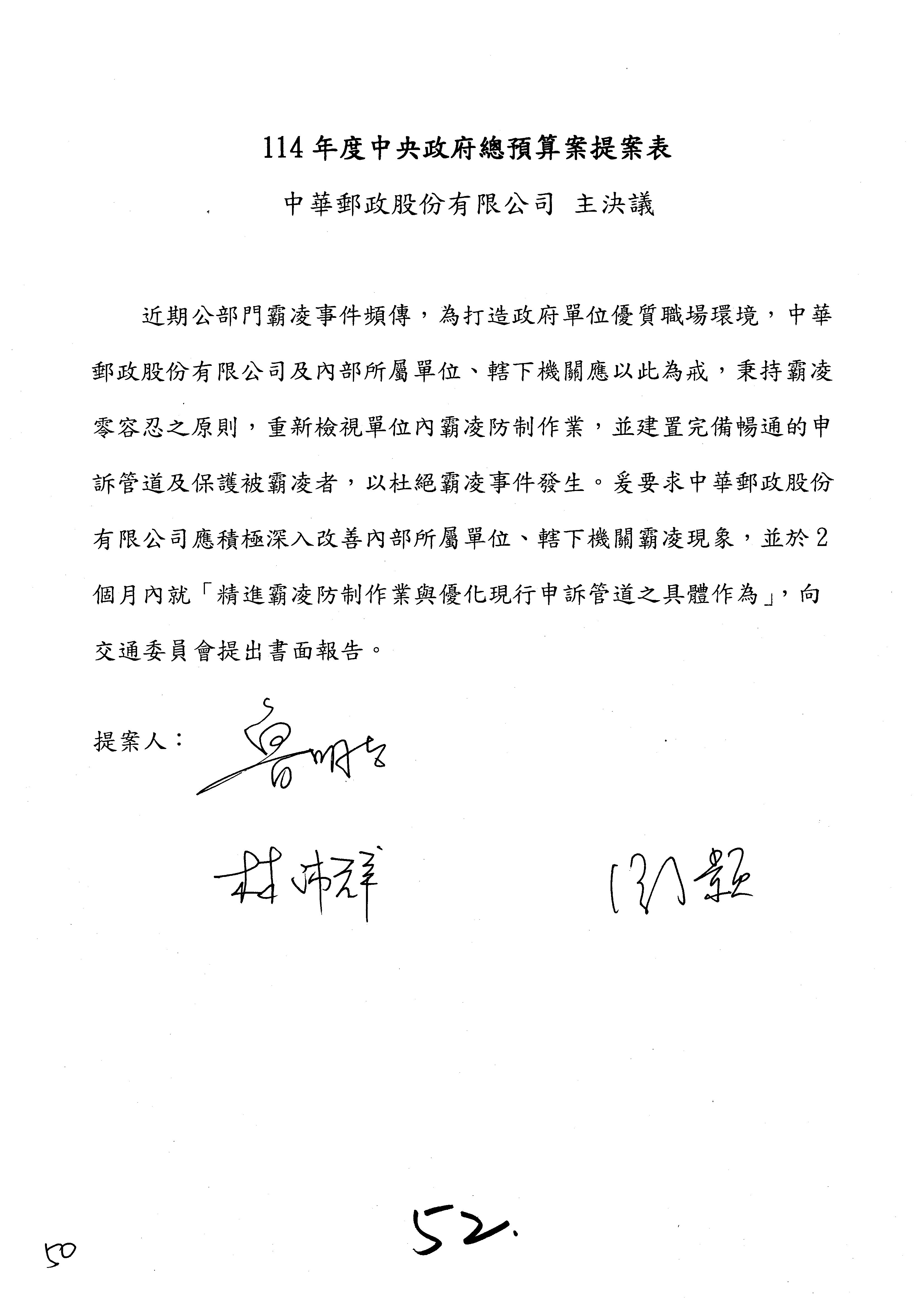 主席:就是「專案」改「書面」,是不是?加兩個字。好。第52案。