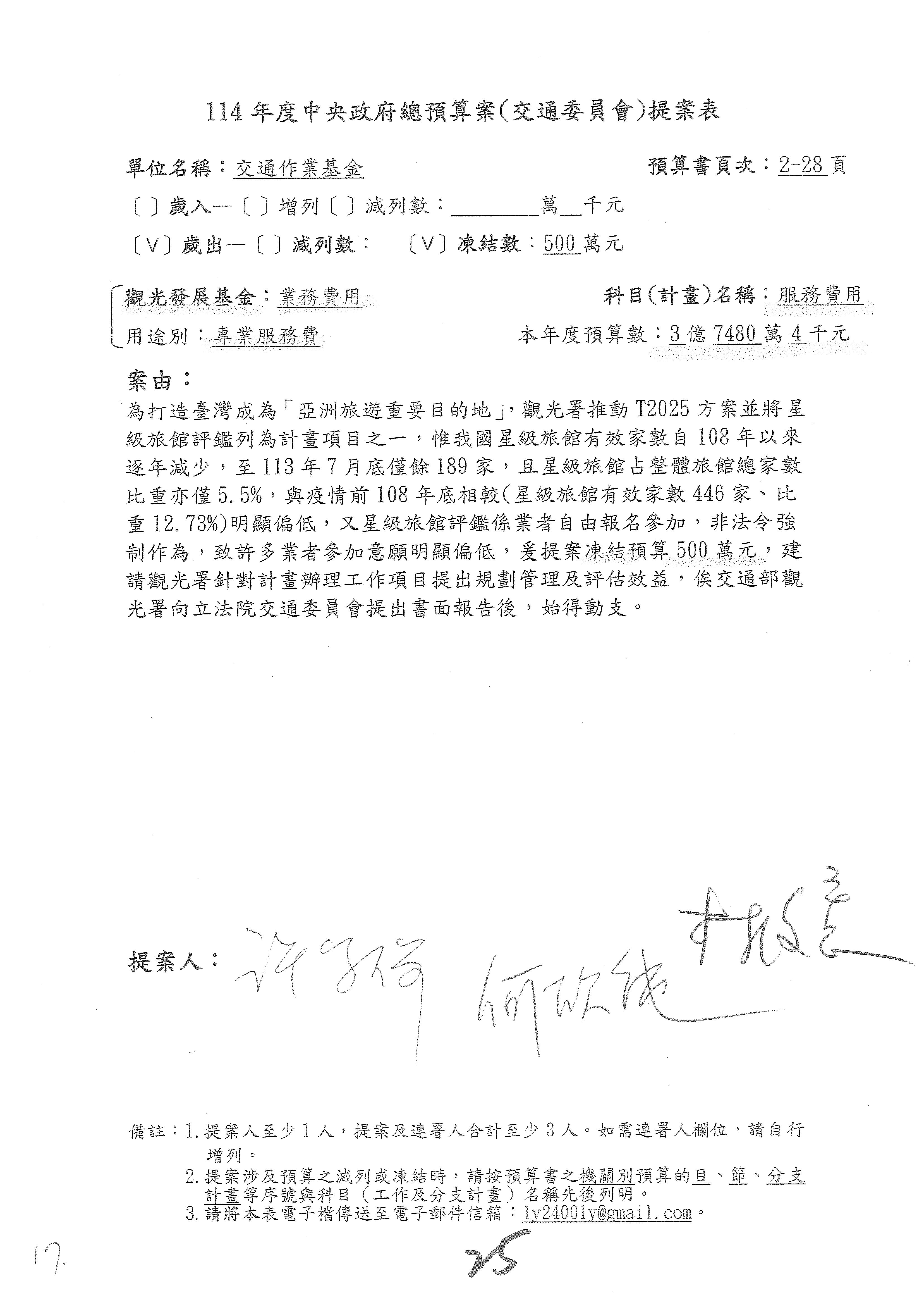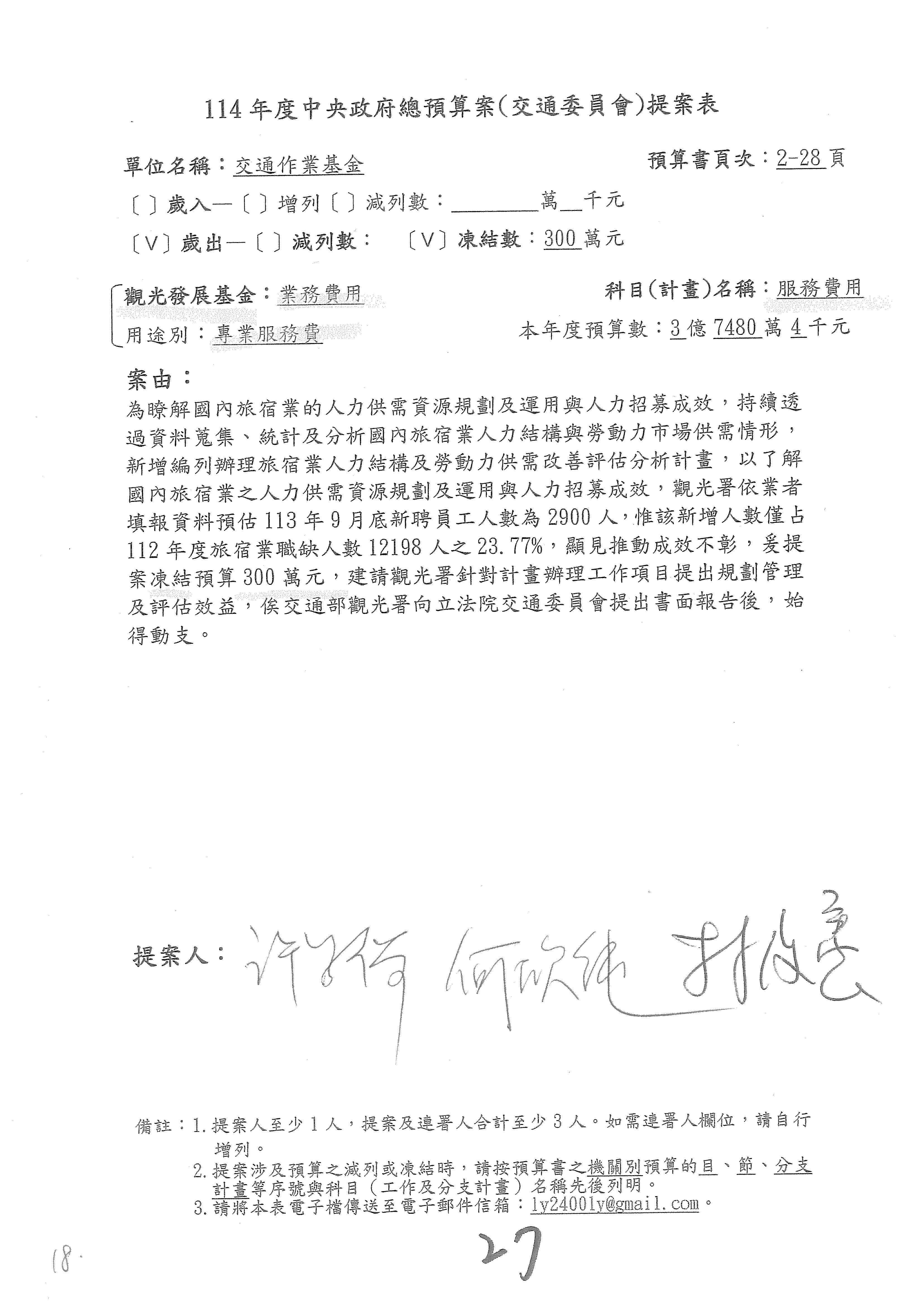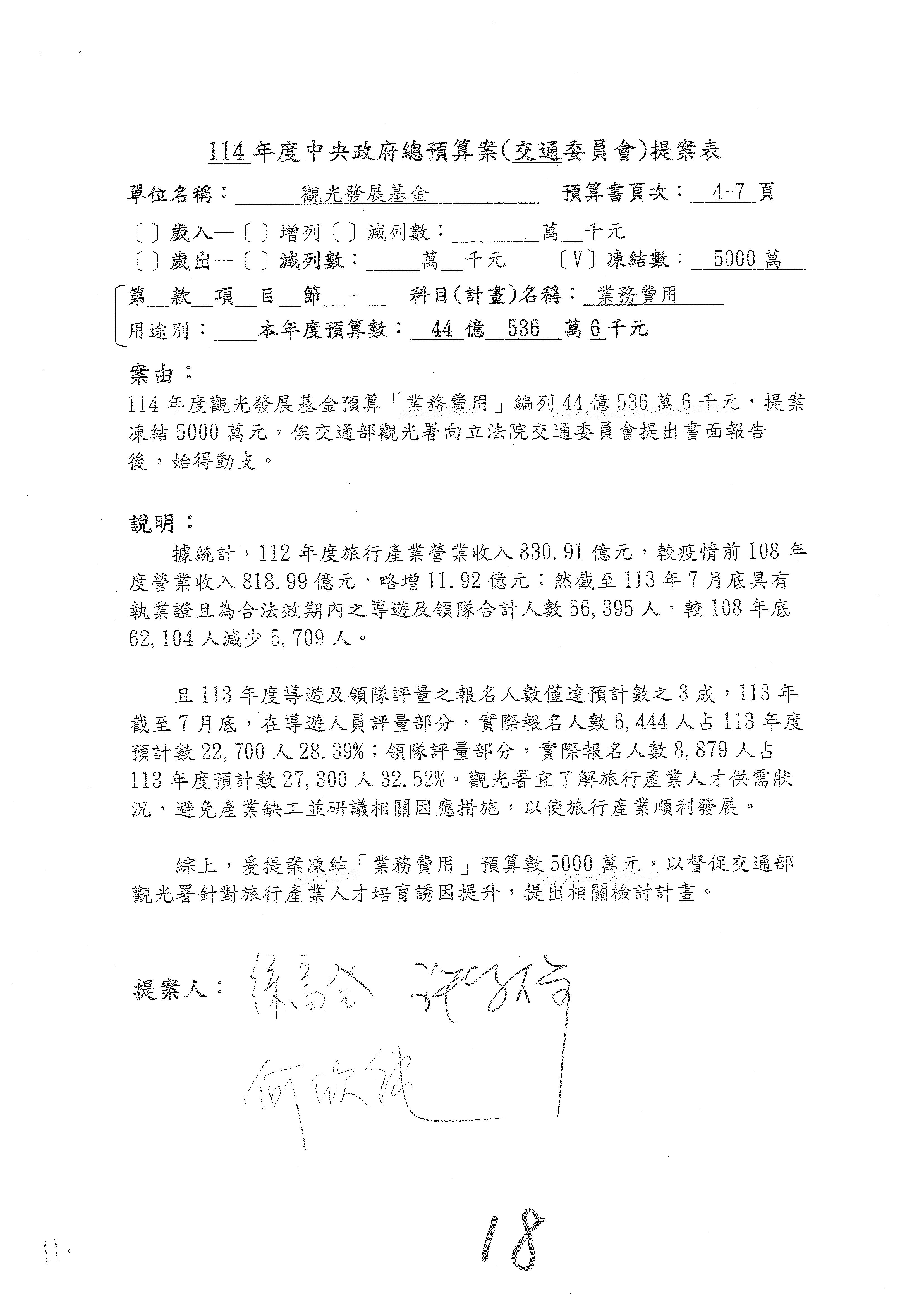 徐委員富癸:謝謝主席。本席是提第16案到第18案,第16案星級旅館部分,請觀光署再研議辦理。第17案改主決議。第18案的部分,國內執業的導遊和領隊人數有下降的趨勢,我們也擔心後續旅遊產業人才的供需狀況,避免產業缺工的情形,所以經過溝通,提案凍結業務費用1,000萬元,請觀光署針對旅行產業人才培育誘因提升的部分提出相關書面報告始得動支,謝謝。