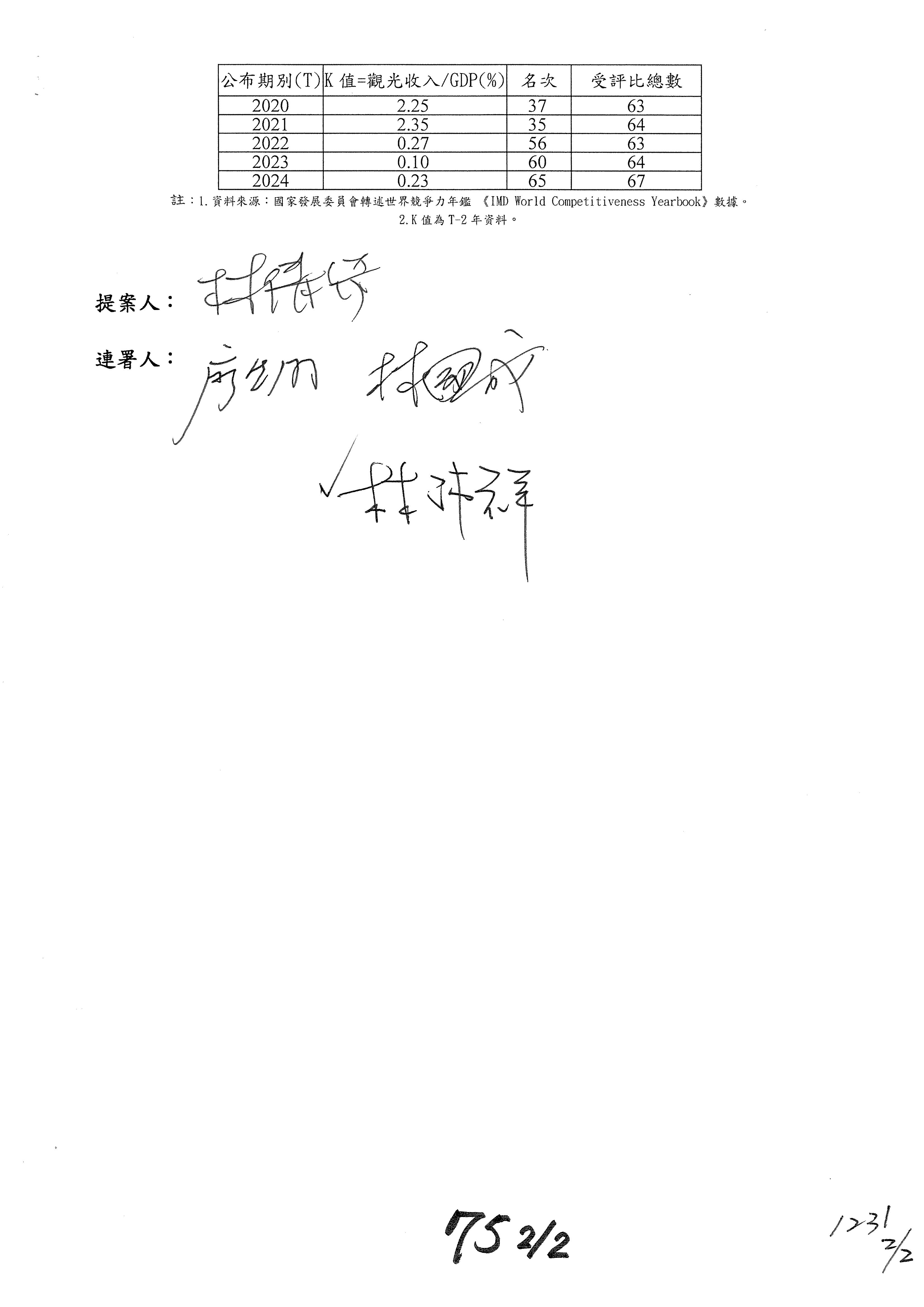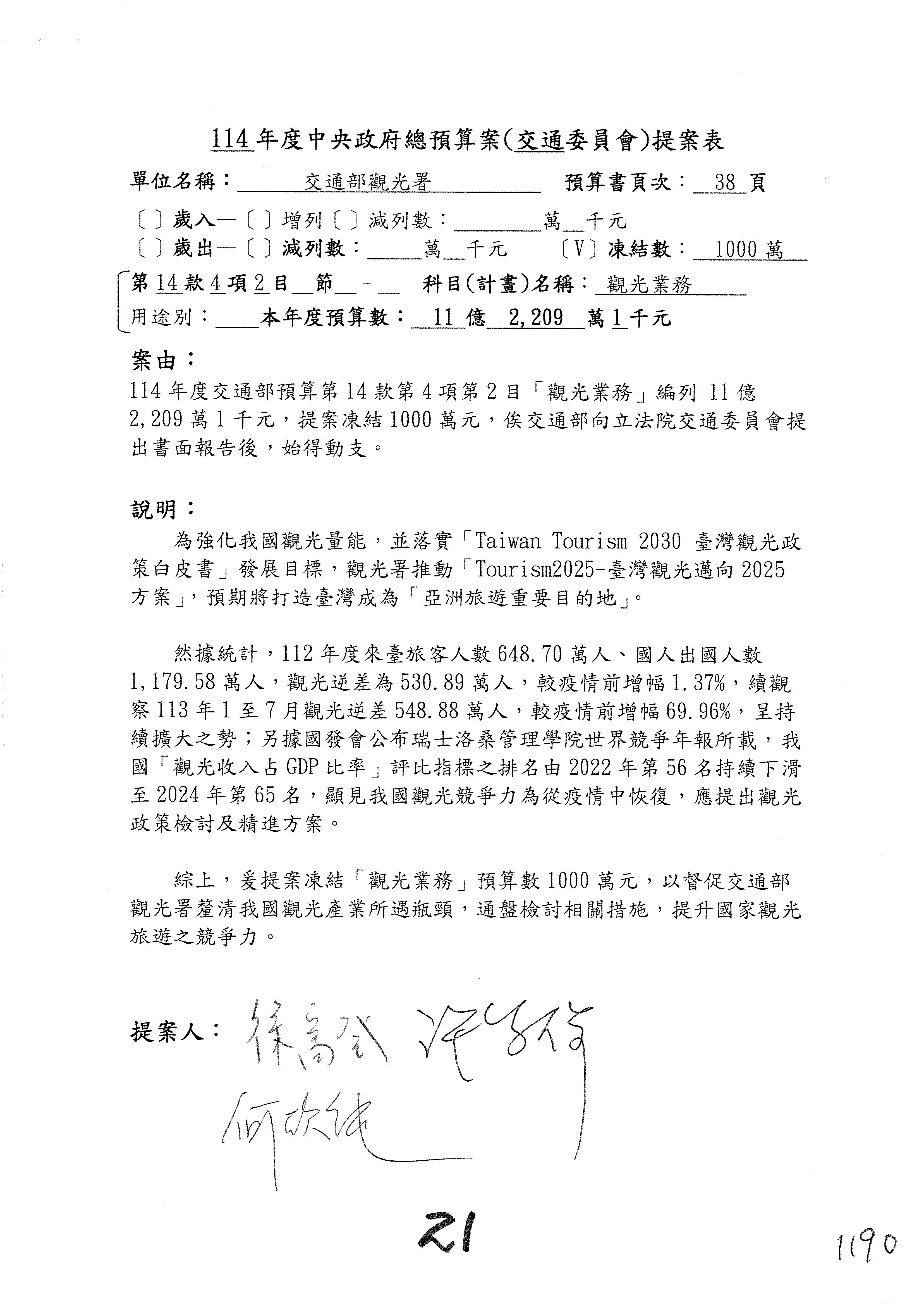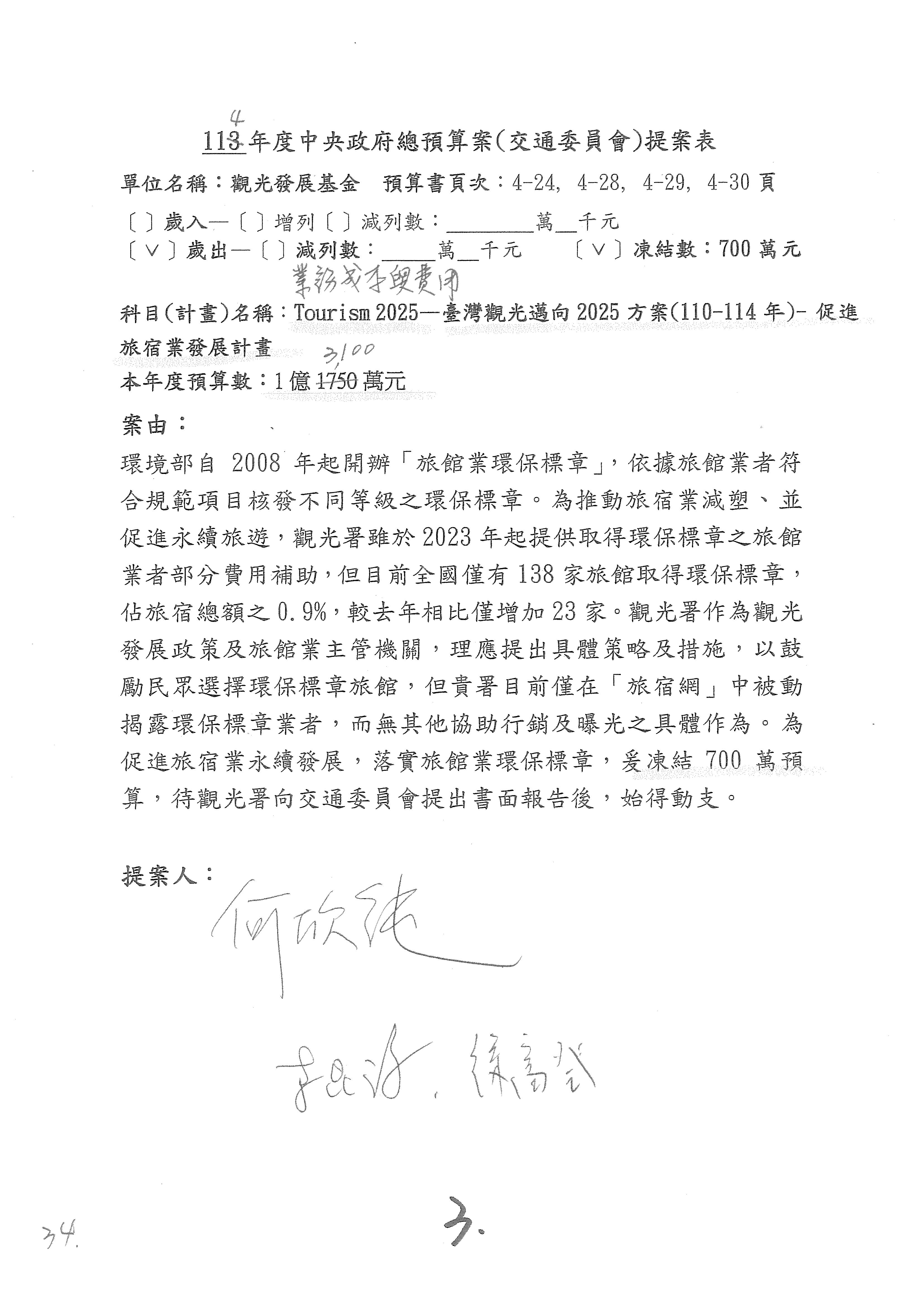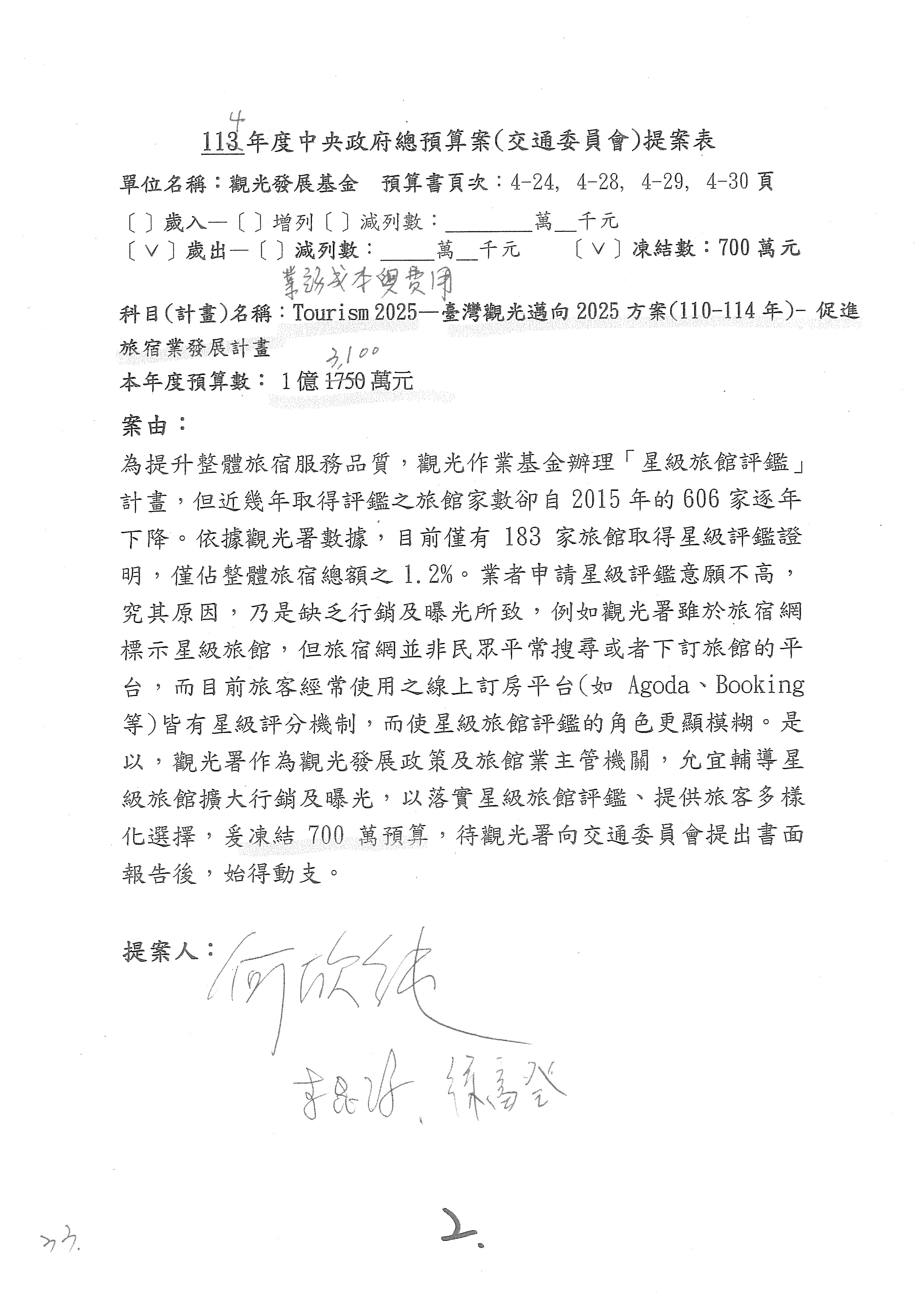 徐委員富癸:謝謝主席。本席是提第16案到第18案,第16案星級旅館部分,請觀光署再研議辦理。第17案改主決議。第18案的部分,國內執業的導遊和領隊人數有下降的趨勢,我們也擔心後續旅遊產業人才的供需狀況,避免產業缺工的情形,所以經過溝通,提案凍結業務費用1,000萬元,請觀光署針對旅行產業人才培育誘因提升的部分提出相關書面報告始得動支,謝謝。