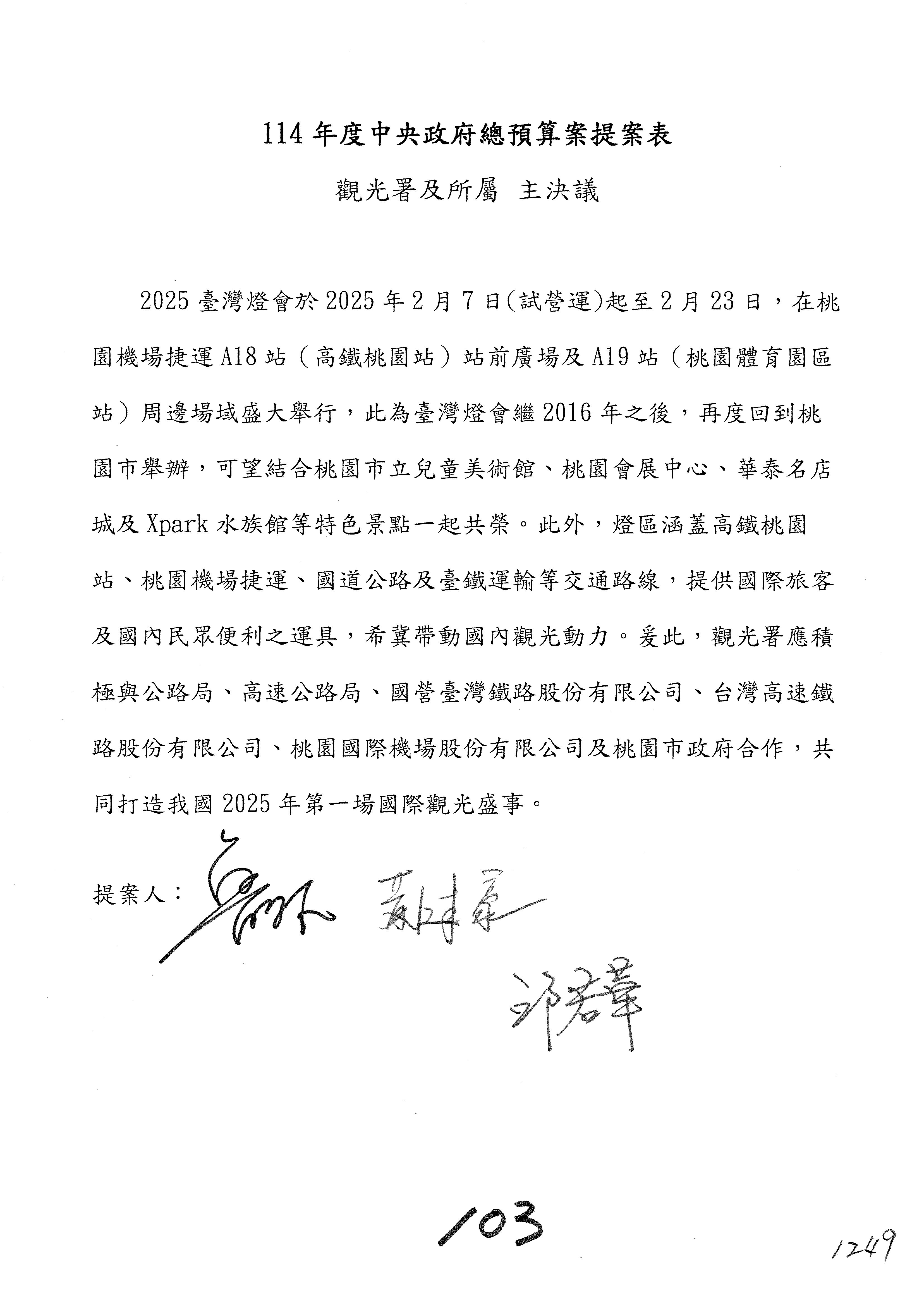 三、繼續審查114年度中央政府總預算案關於交通部觀光署及所屬單位預算。