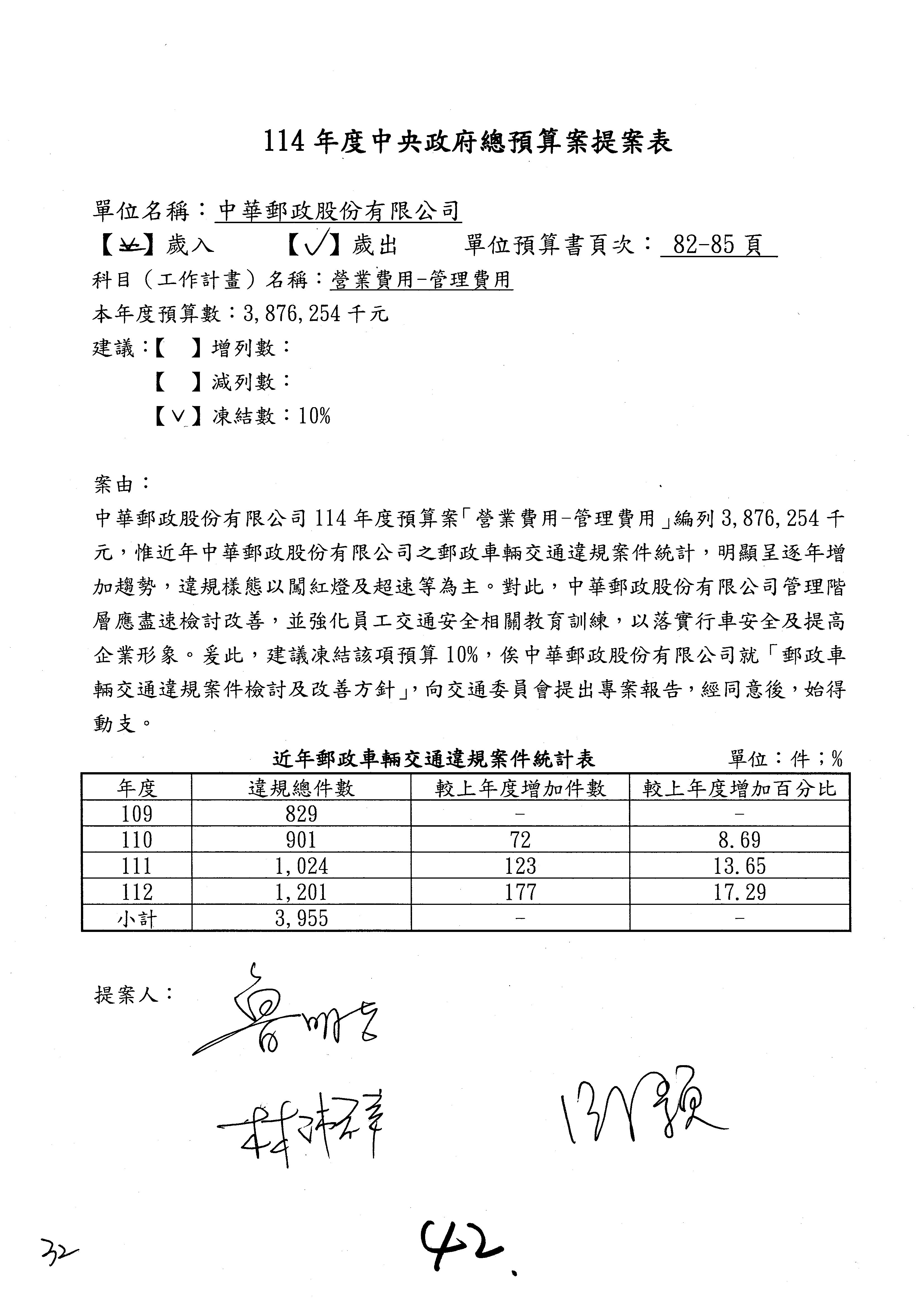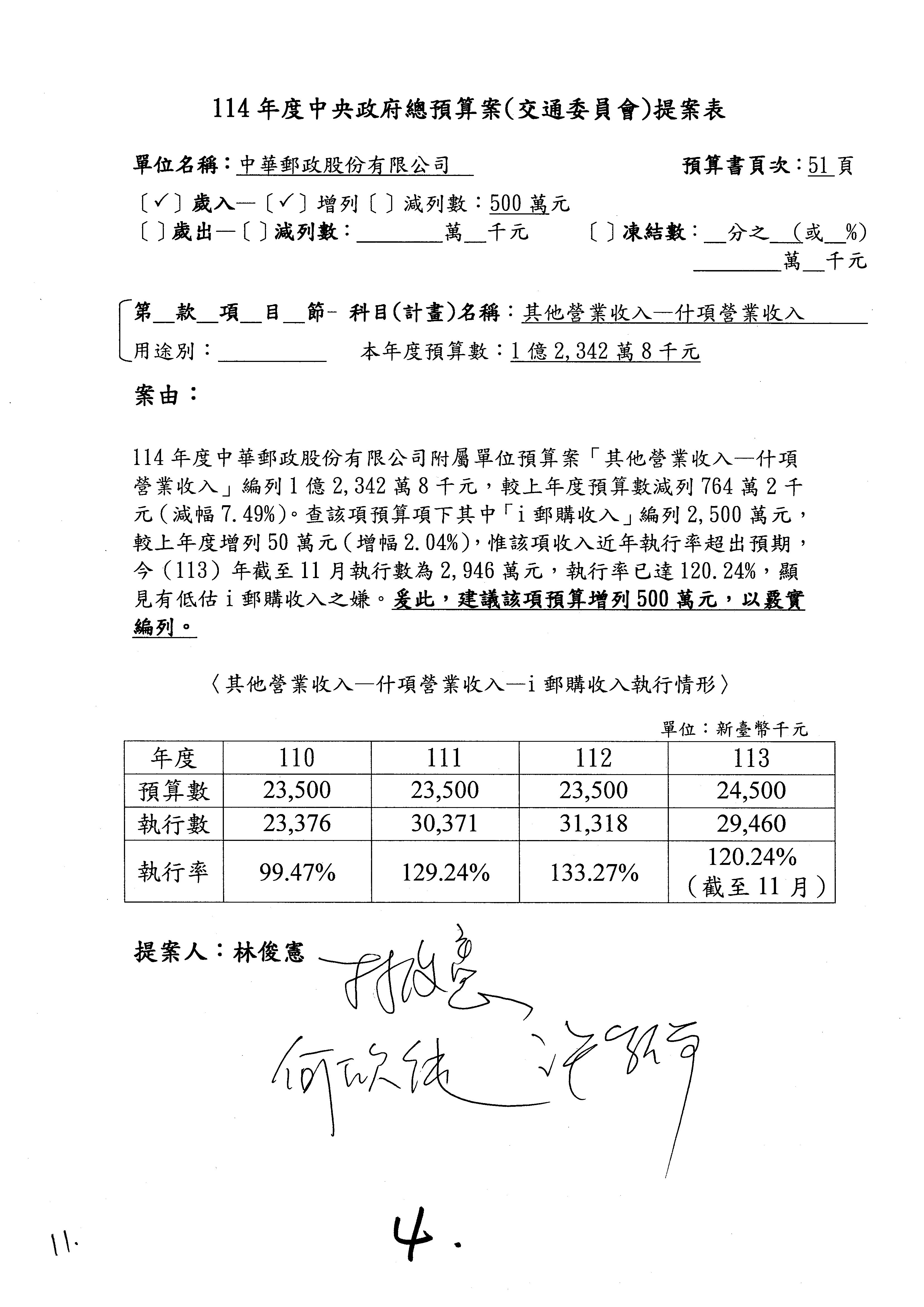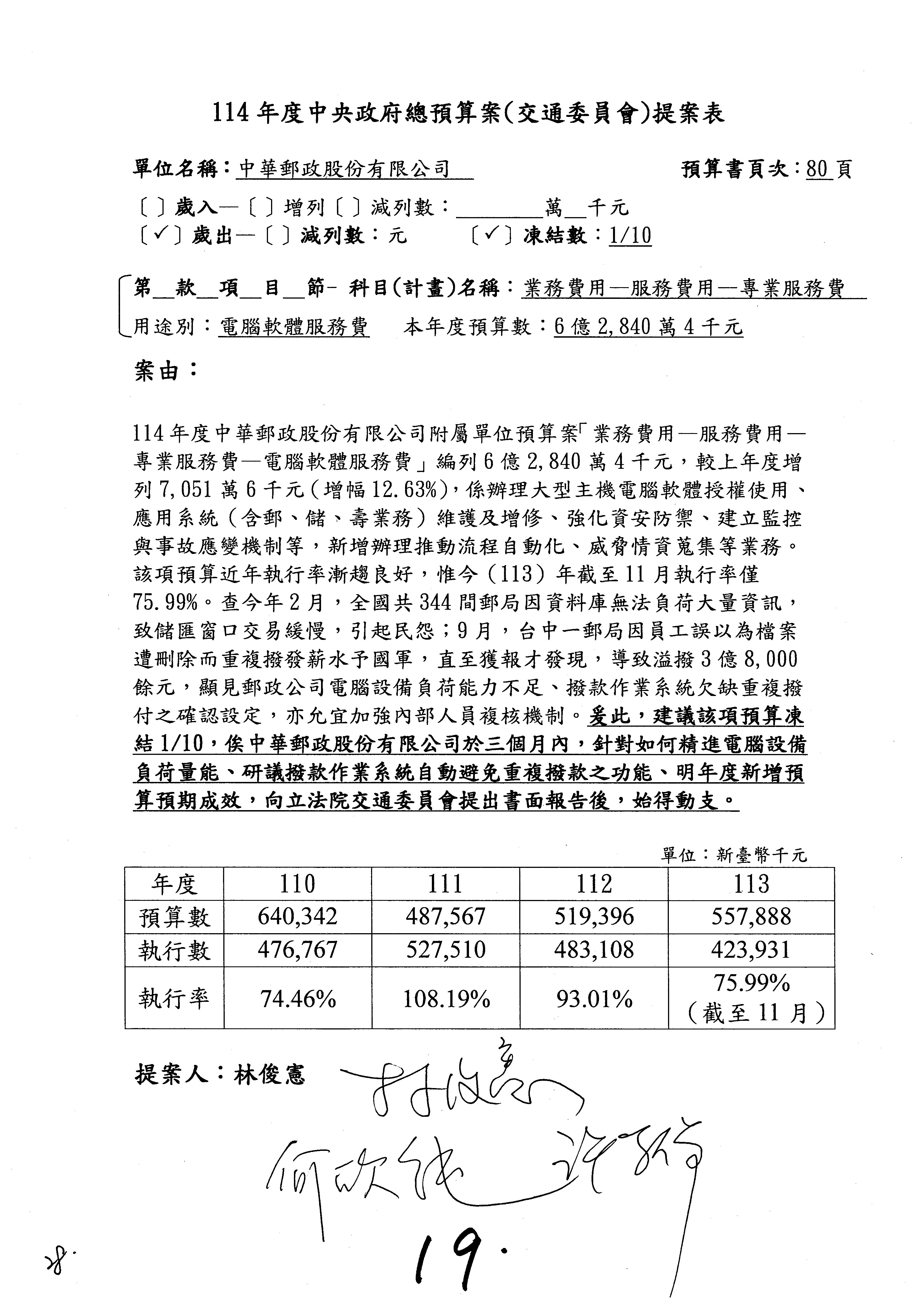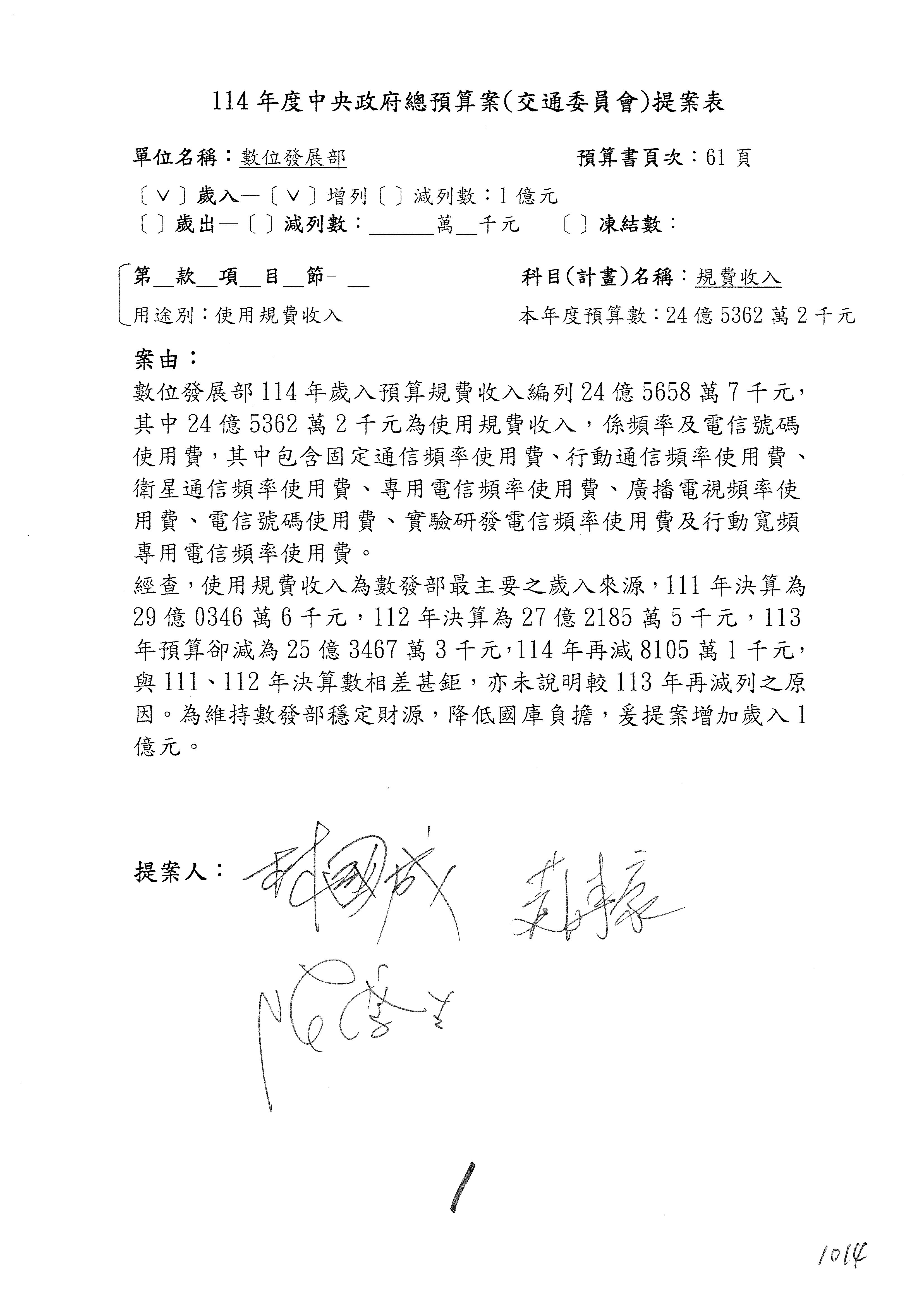 我們審查第1案,歲入「使用規費收入」項下的頻率及電信號碼使用費,提案委員為林國成委員。