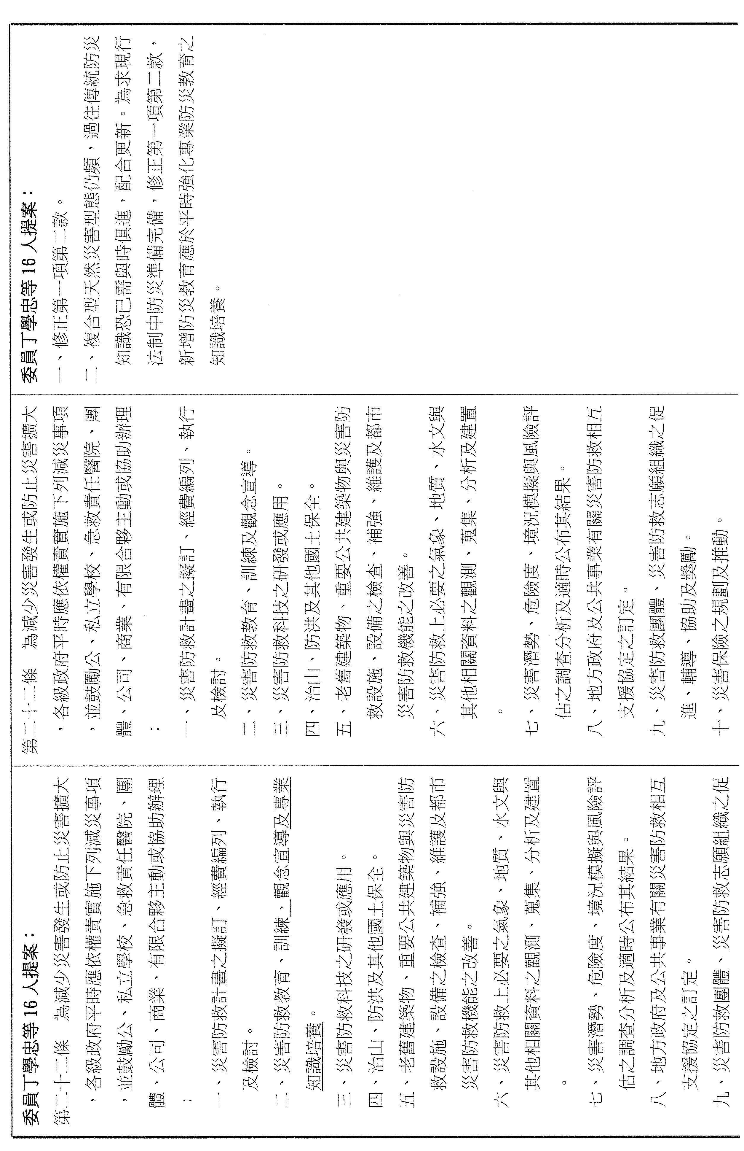 四、審查委員丁學忠等16人擬具「災害防救法第二十二條條文修正草案」案。