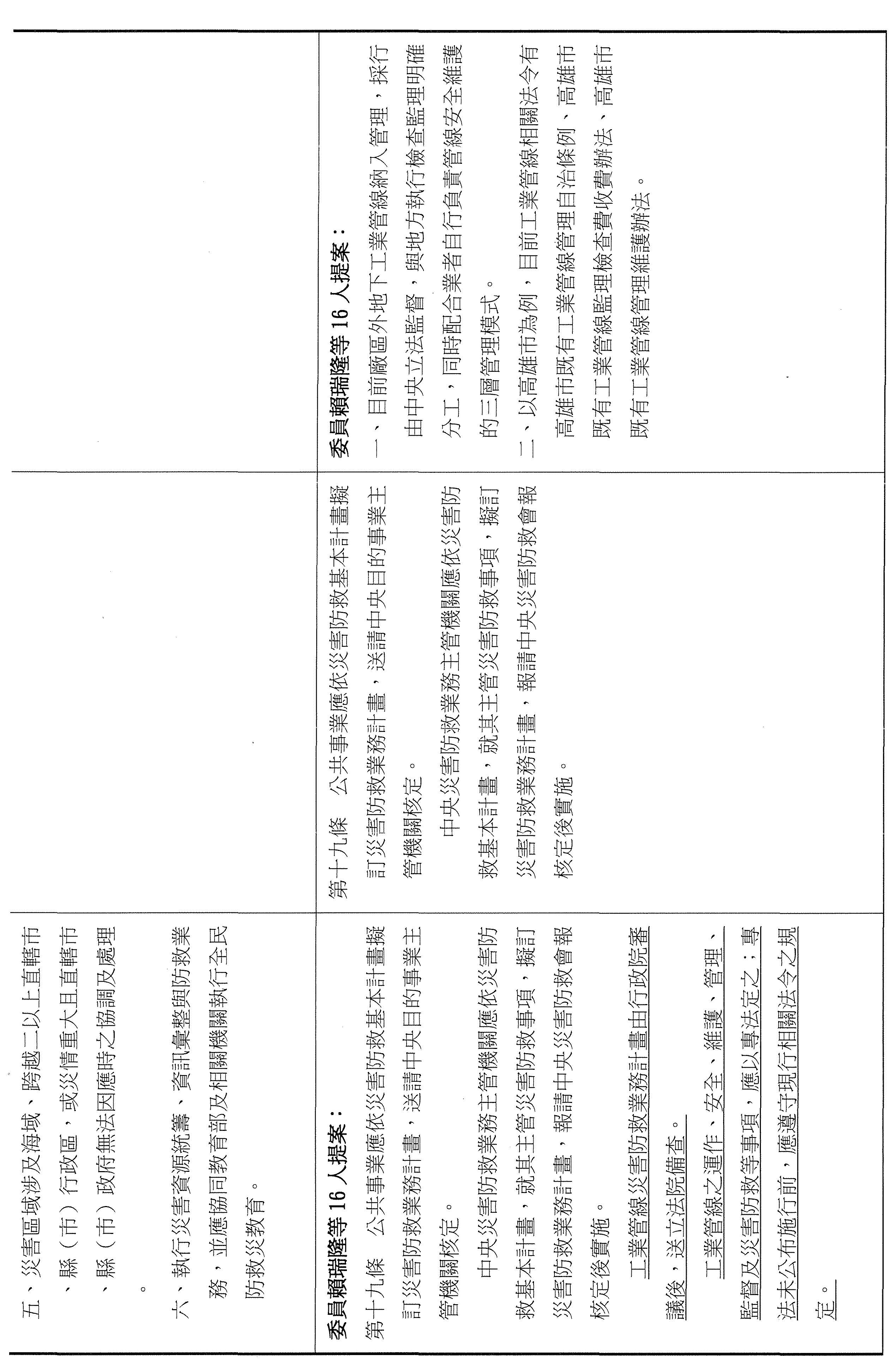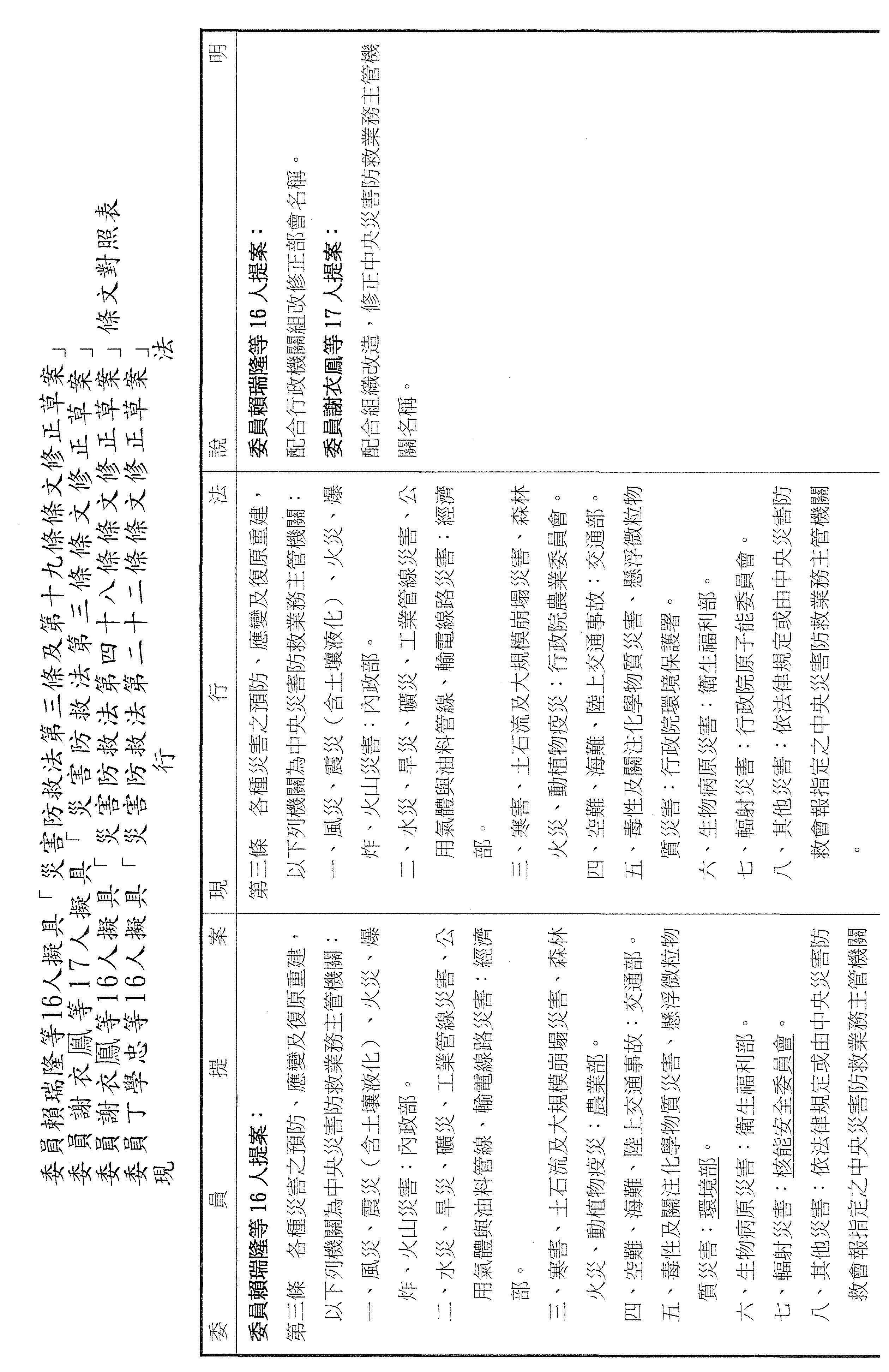 一、審查委員賴瑞隆等16人擬具「災害防救法第三條及第十九條條文修正草案」案。