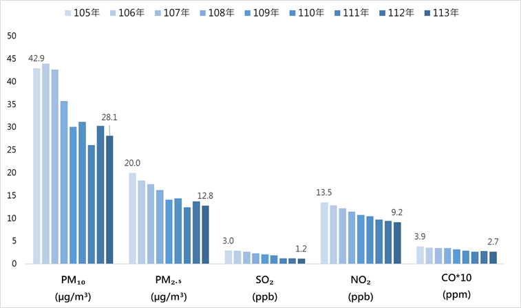 圖一、近年我國各項空氣污染物年平均濃度改善趨勢