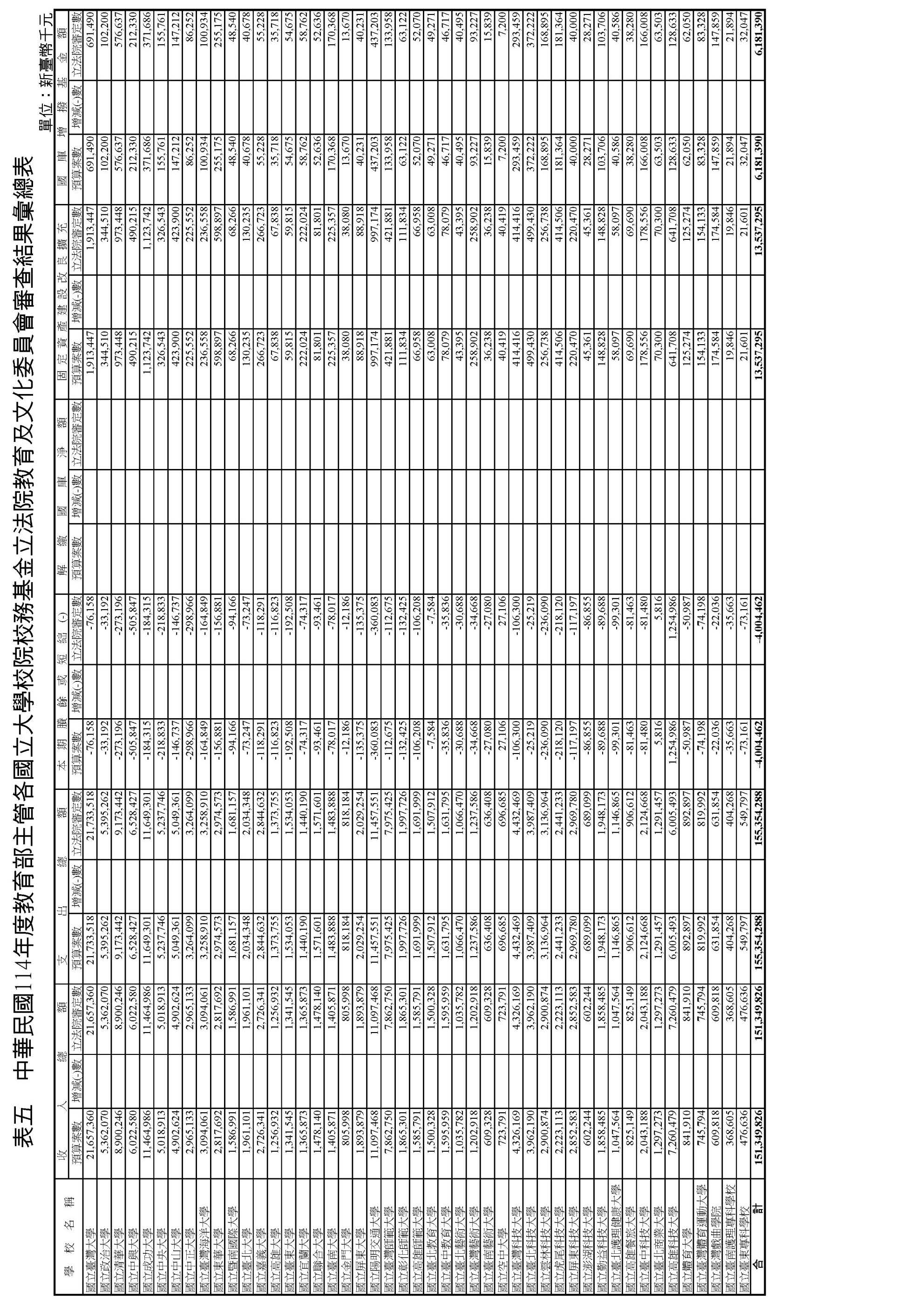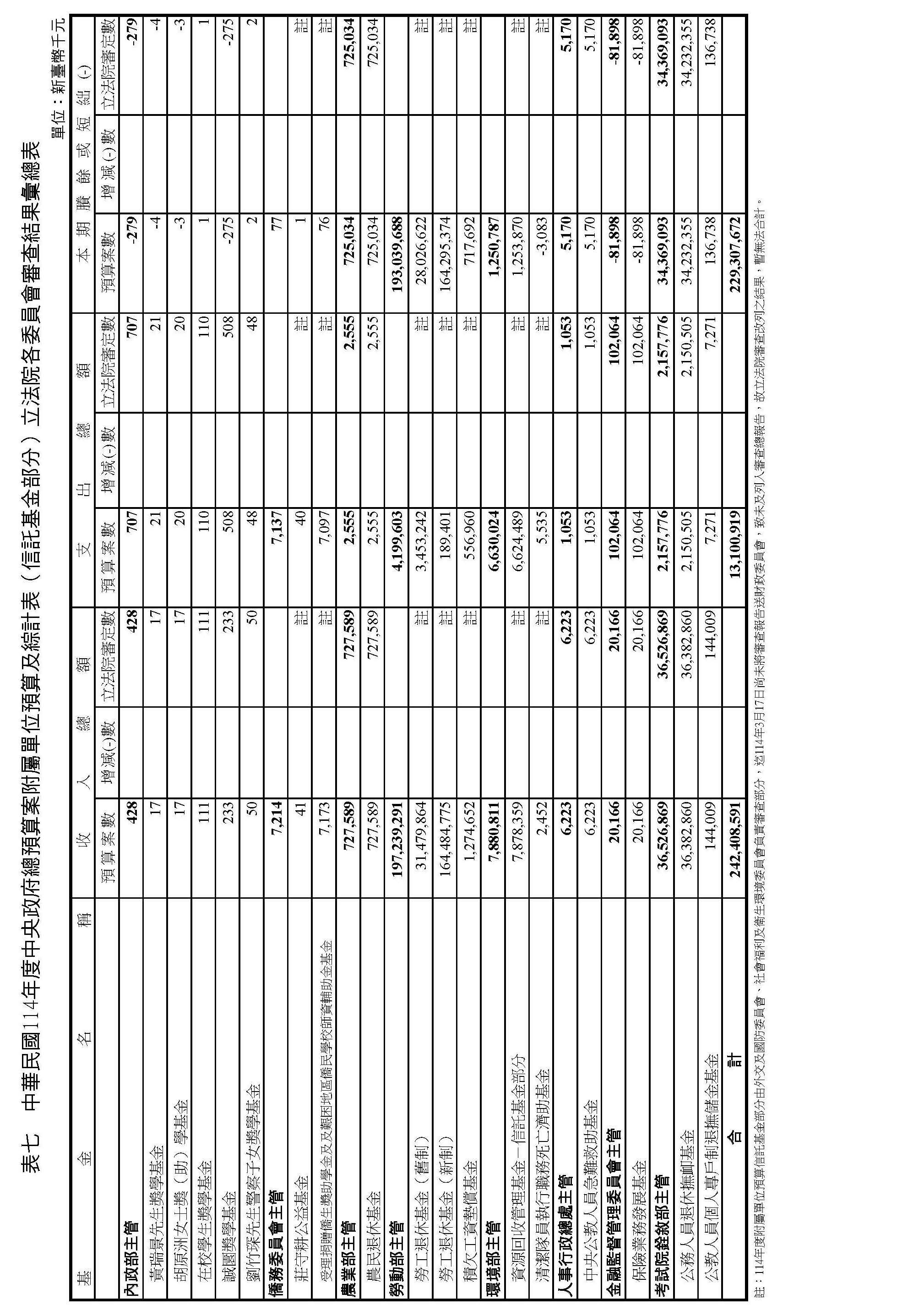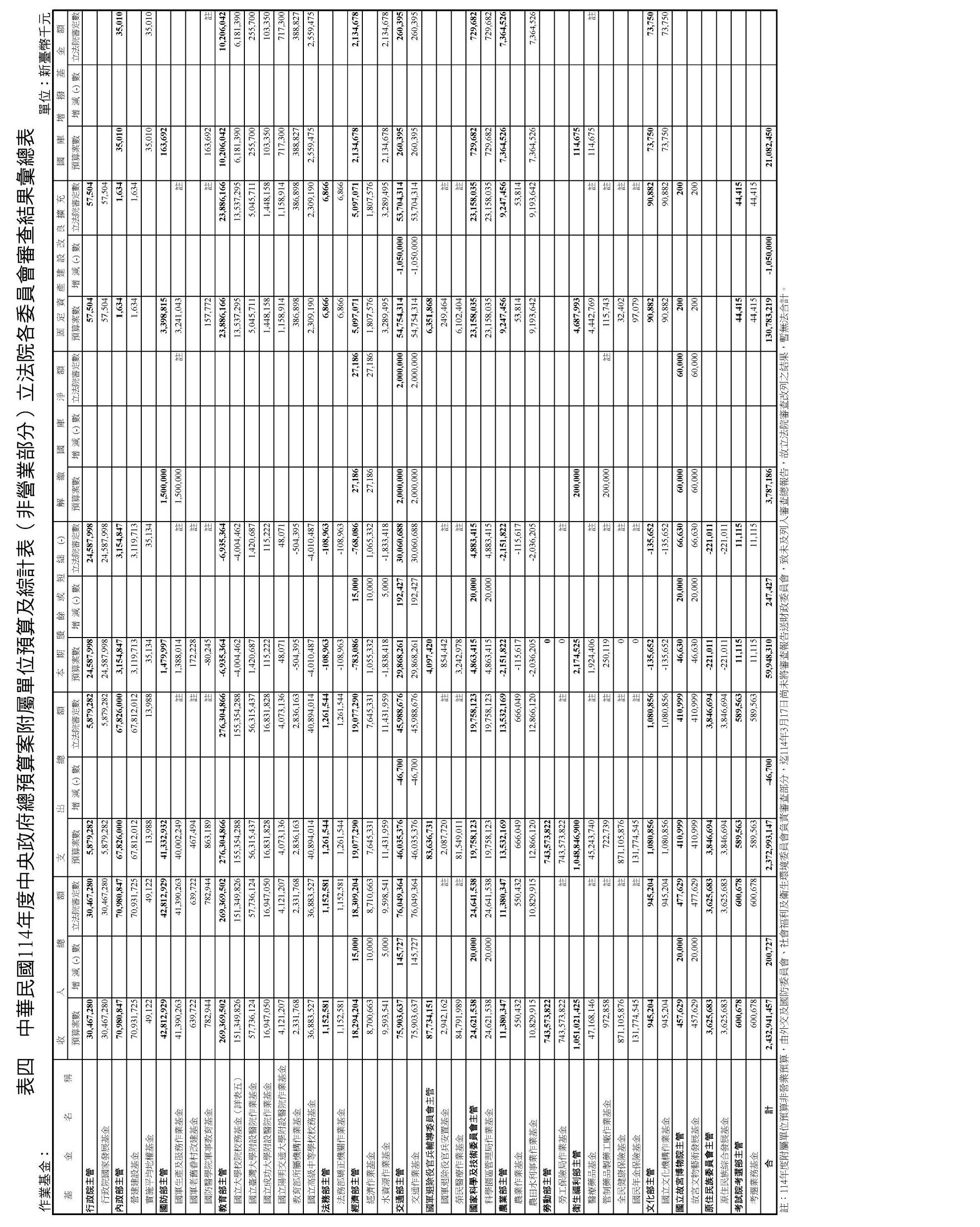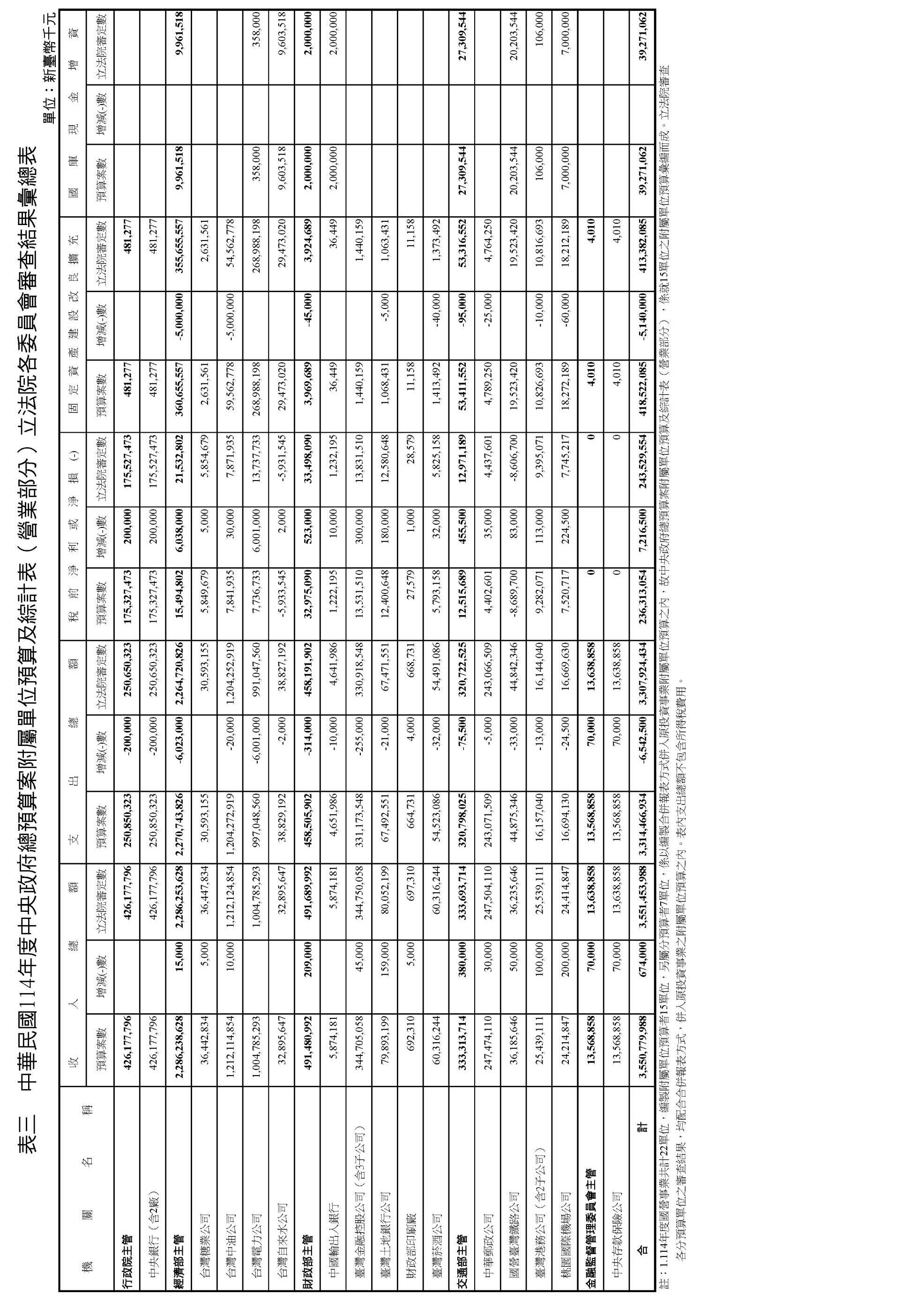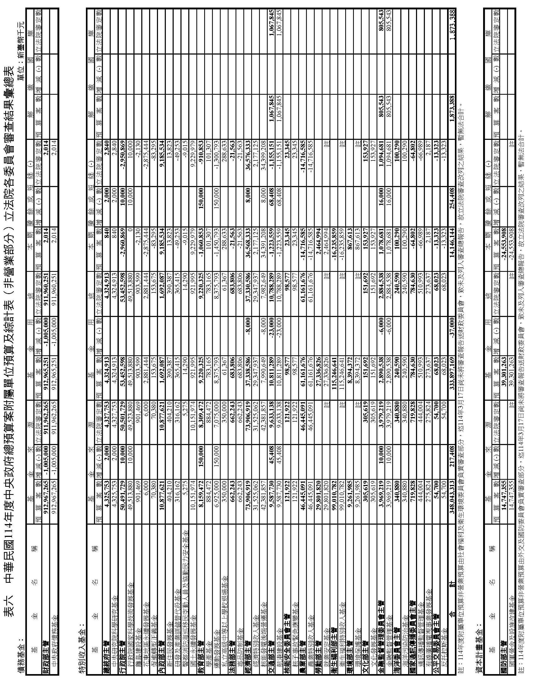 表一 中華民國114年度中央政府總預算案(含附屬單位預算及綜計表—營業及非營業部分)審查分配表