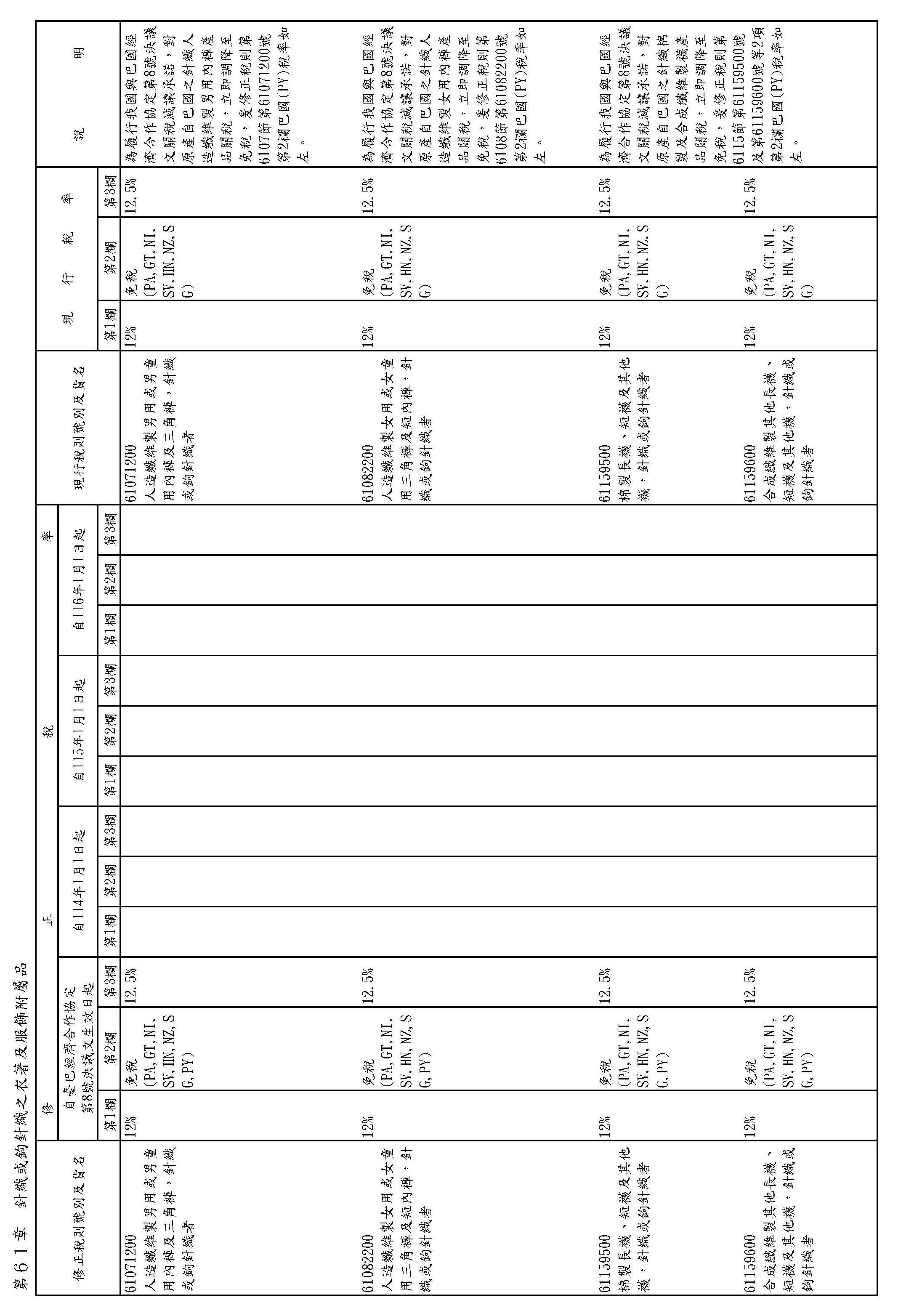 修正 第61071200號、第61082200號、第61159500號及第61159600號等4項之第2欄稅率,修正巴拉圭(PY)適用之稅率。