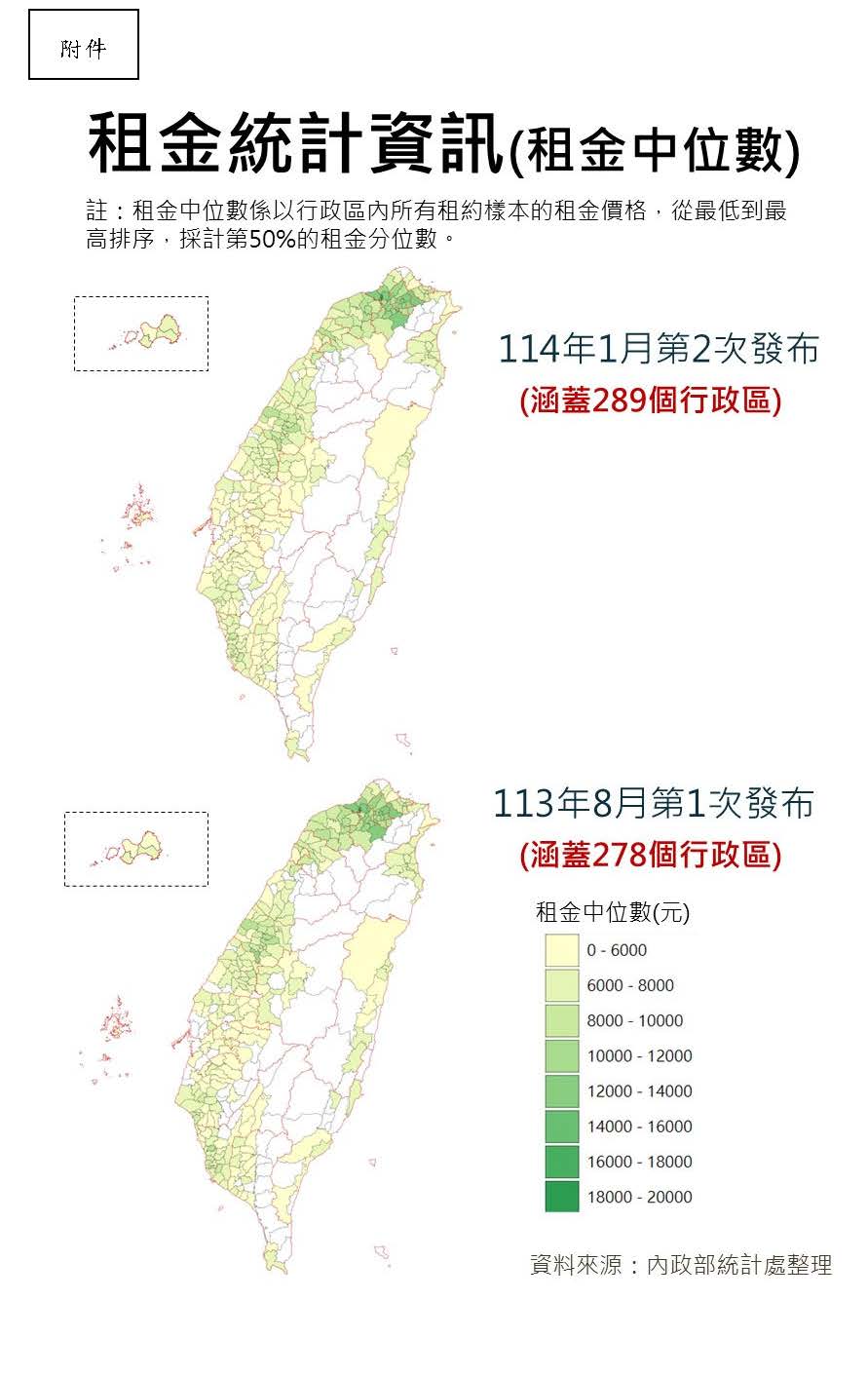 為讓民眾更易瞭解租屋市場合理租金價格,本部在去識別化、個資保護、租金透明原則下,透過租金補貼有效租約資料統計分析,已於113年8月及今(114)年1月陸續先後公布2次全國各行政區實際租金統計資料。