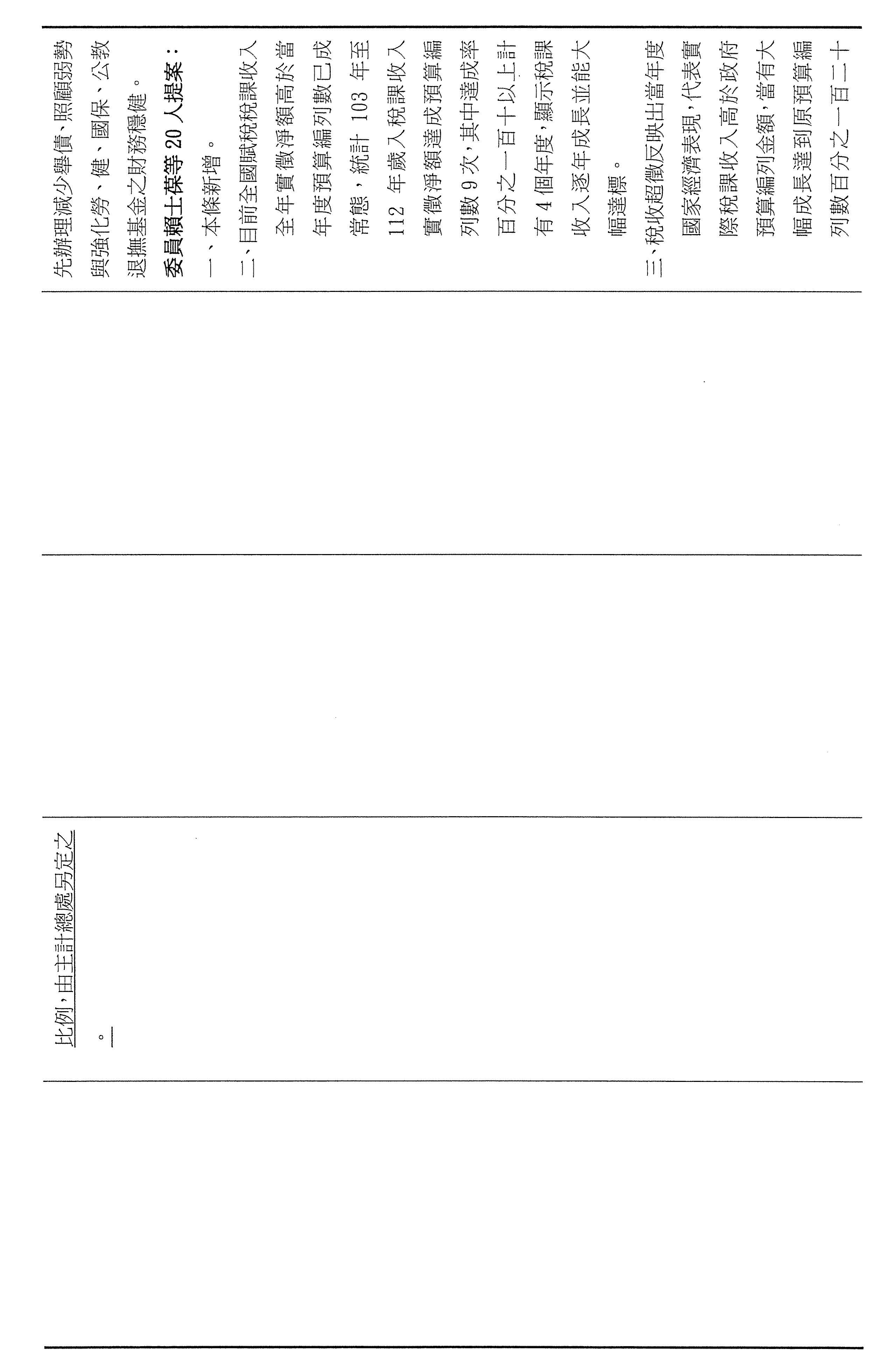 最後我講一句話,各位要離開可以離開,如果沒有到達120%就沒有這個問題,沒有超徵3,000億也沒有這個問題!所以各位這個題目很「軟」,沒有硬性,硬是在特別條例,不在這裡,沒有超過20%,沒有超過3,000億,這個就不算數了。