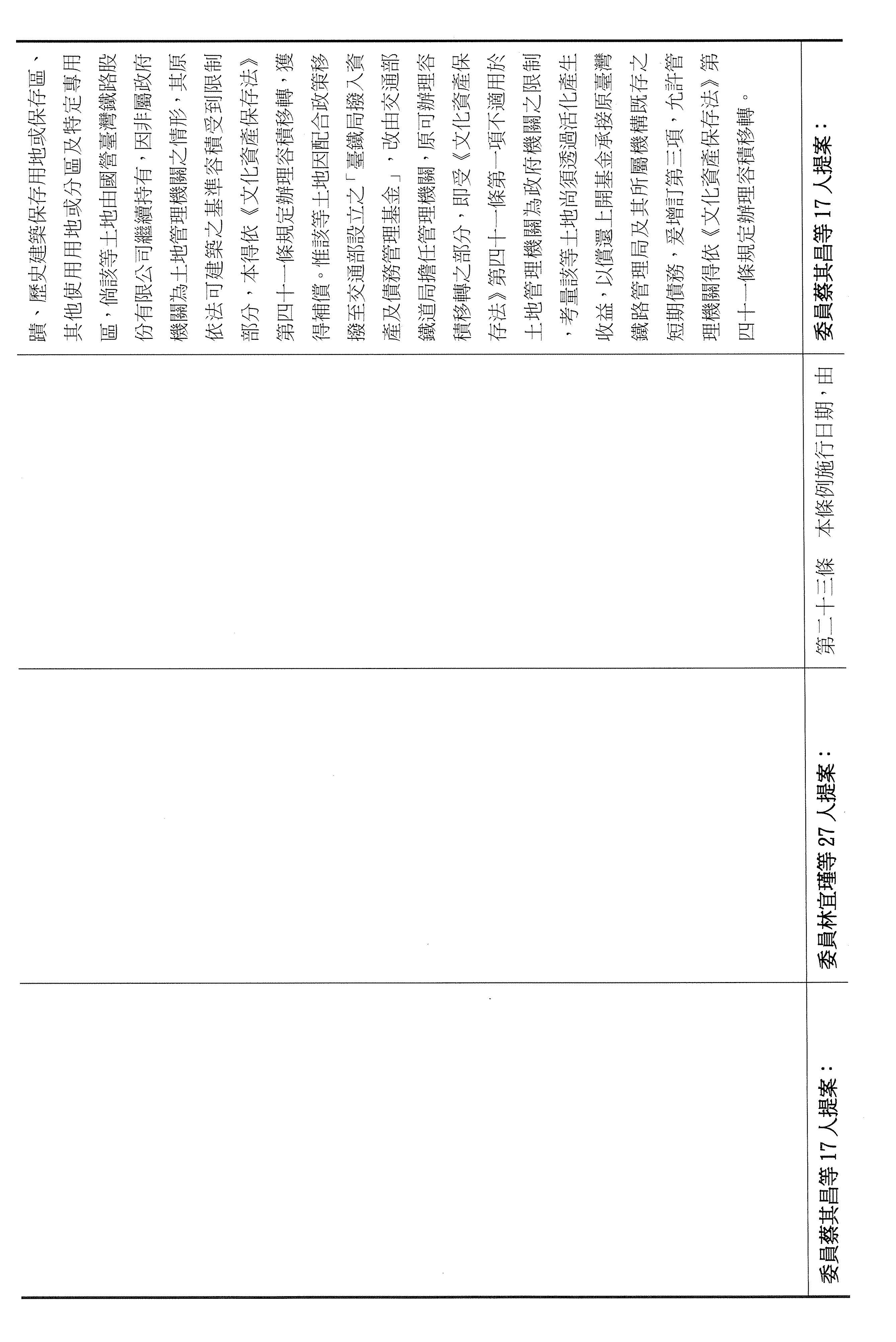 李委員昆澤:謝謝召委。今天討論的是臺鐵公司條例第十條還有第二十三條,我看各版本的重點其實都差不多,主要還是在明定臺鐵債務基金的資產開發、處分,不受國產法第二十八條的限制;另外就是資產中有關古蹟、歷史建築等,得依文資法第四十一條辦理容積轉移等等。那這個部分據我所了解,這些資產如果留在臺鐵公司,其實原本就是不受國產法第二十八條限制,也適用文資法第四十一條,現在是因為這些資產要轉到臺鐵的債務基金而受到限制,所以才有相關的提案,這個部分要請交通部來說明,如果是比照原本資產在臺鐵公司的狀況,我是認為沒有太大的爭議,只是把它轉到臺鐵的債務基金,但是涉及國家資產,還有文資法,交通部應該有責任,必須要明確的說明,以上。