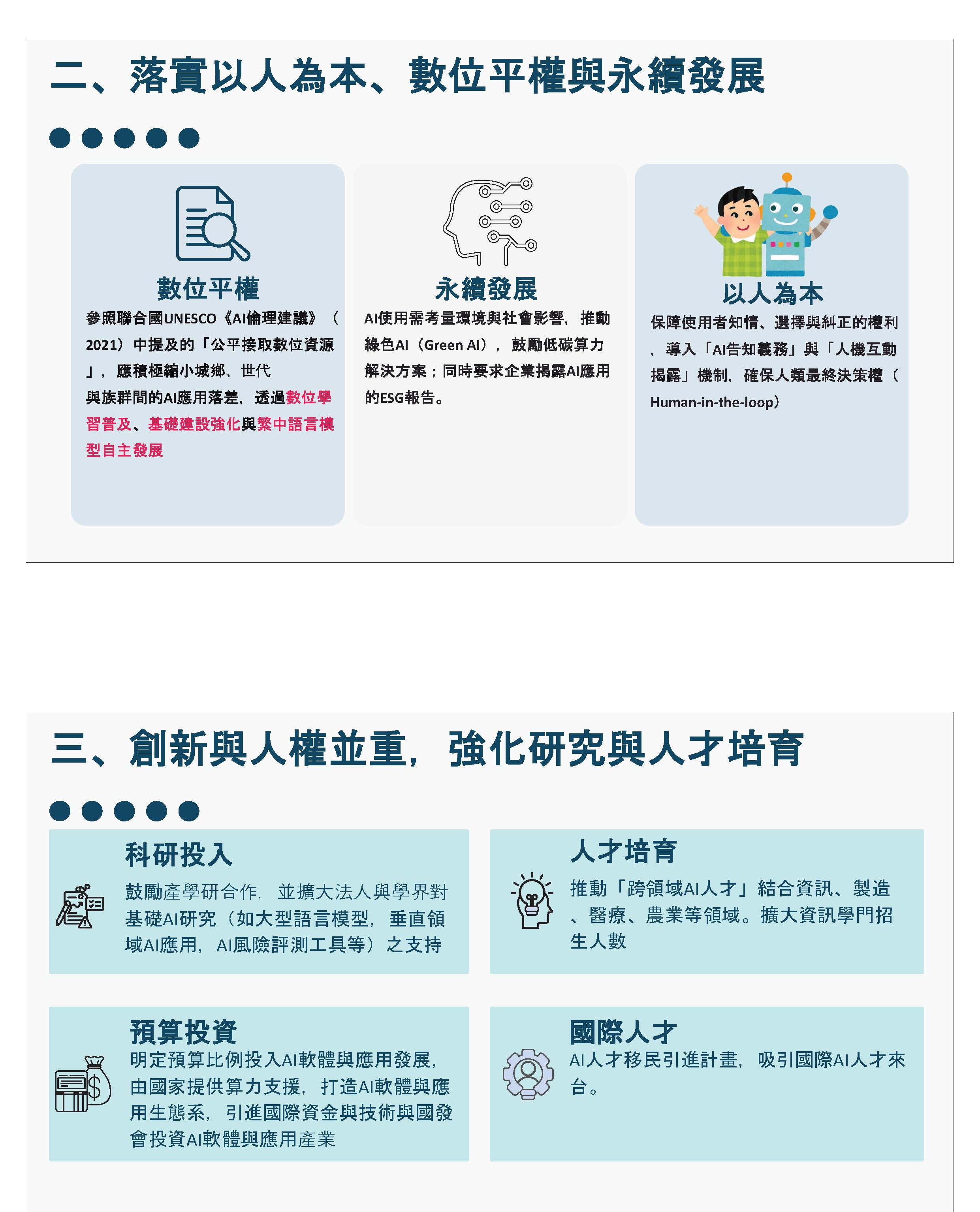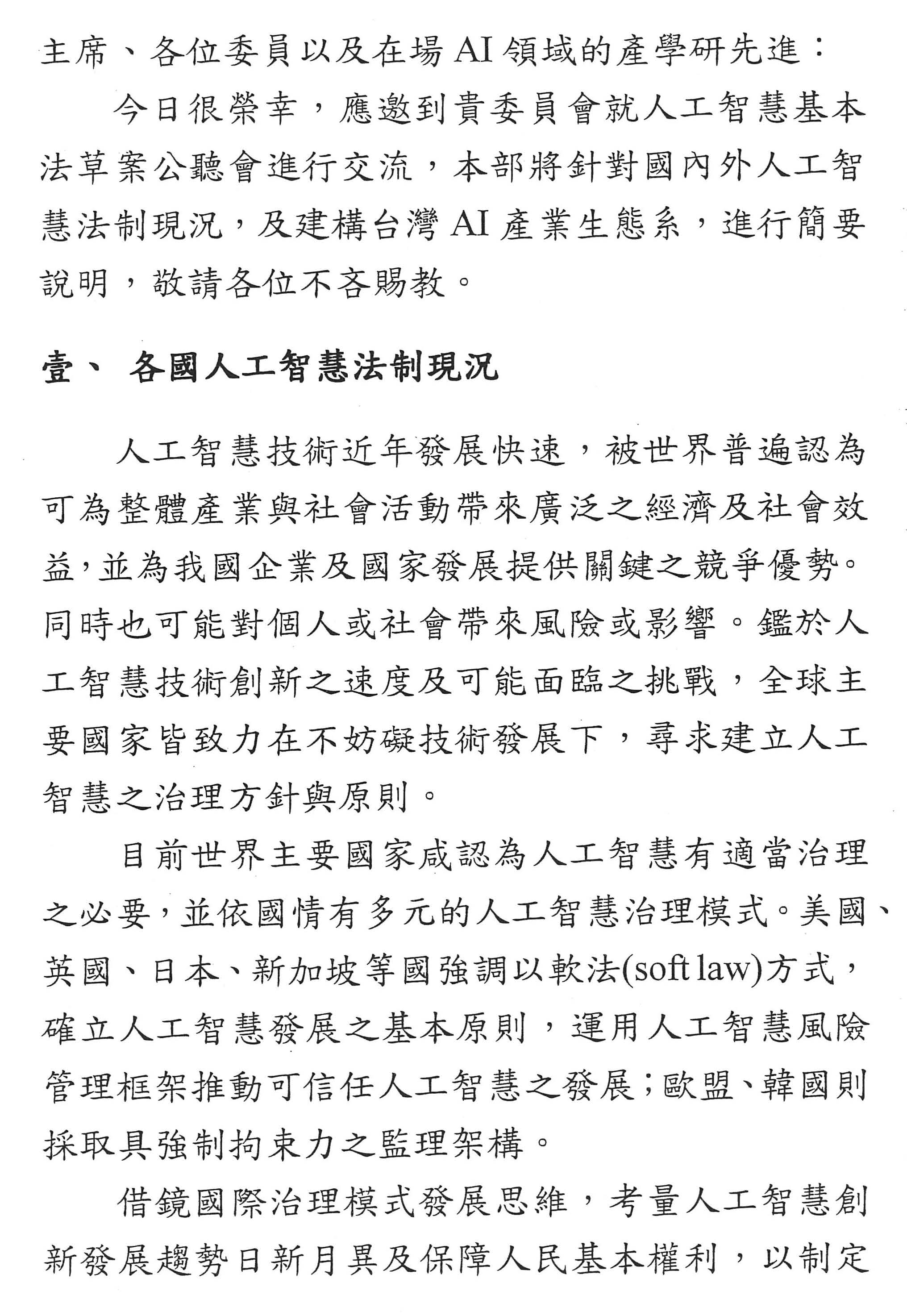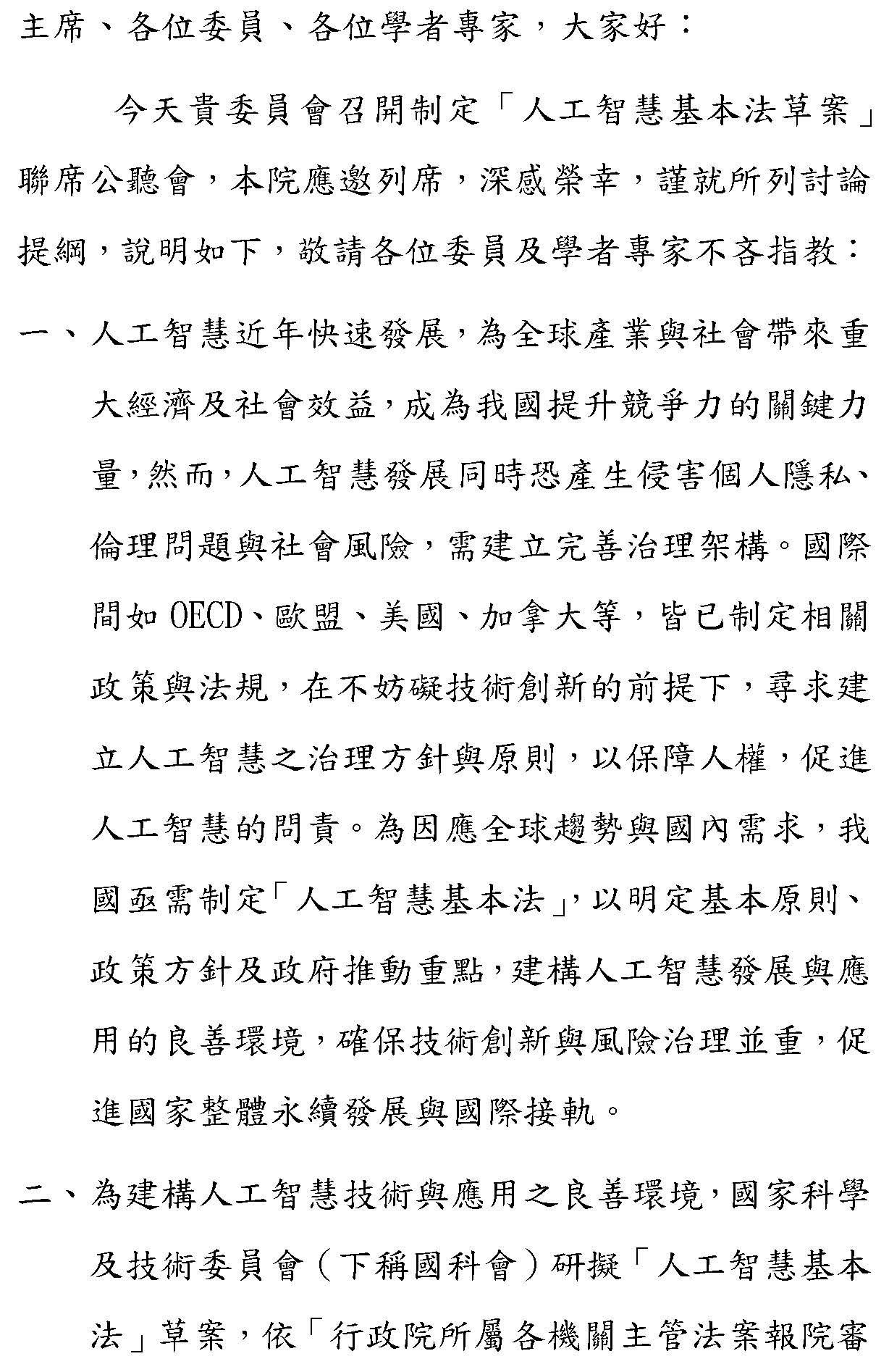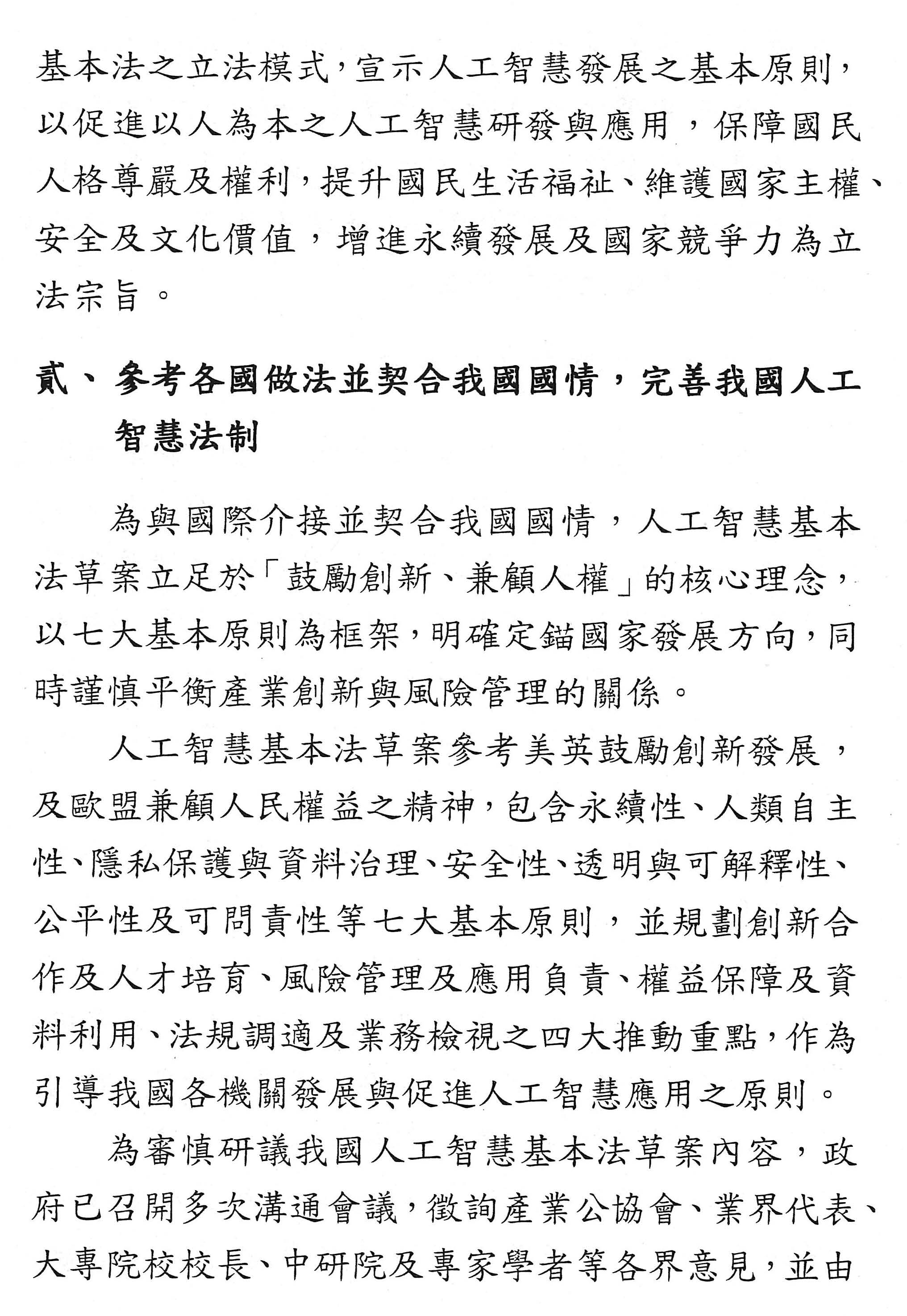 我們臺灣借鏡國際治理模式發展思維,特別考量到人工智慧趨勢日新月異及需要保障基本人權,我們也贊成以制定基本法的立法模式來宣示人工智慧的基本原則,促進剛剛主席特別強調的以人為本的人工智慧研發與應用,也保障國民人格尊嚴與權利,提升國民生活福祉、維護國家主權、安全及文化價值,增進永續發展及國家競爭力作為主要的立法宗旨。