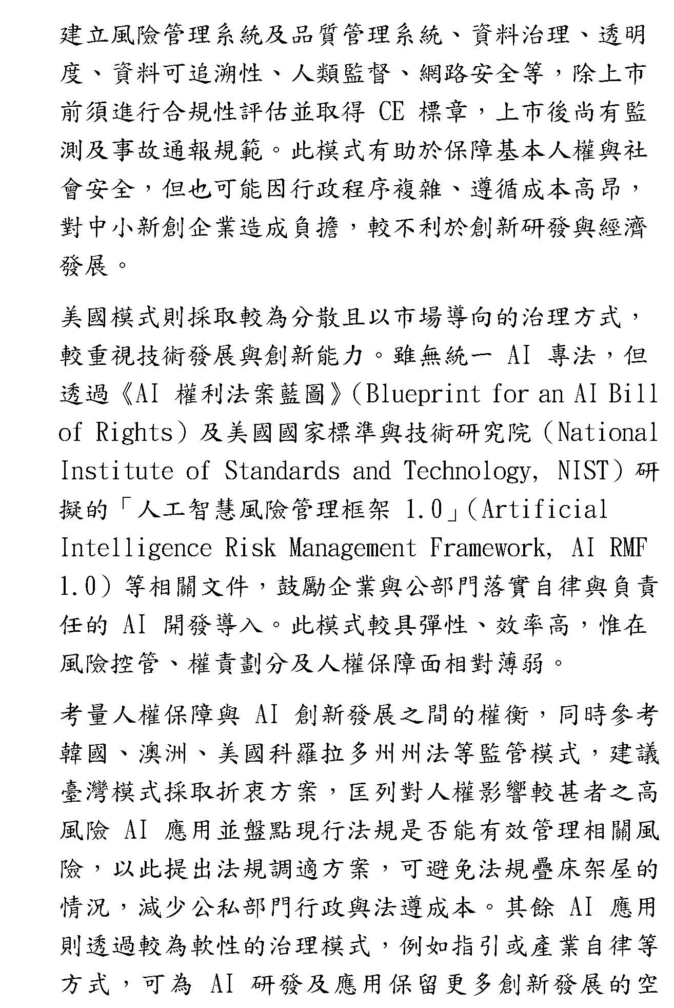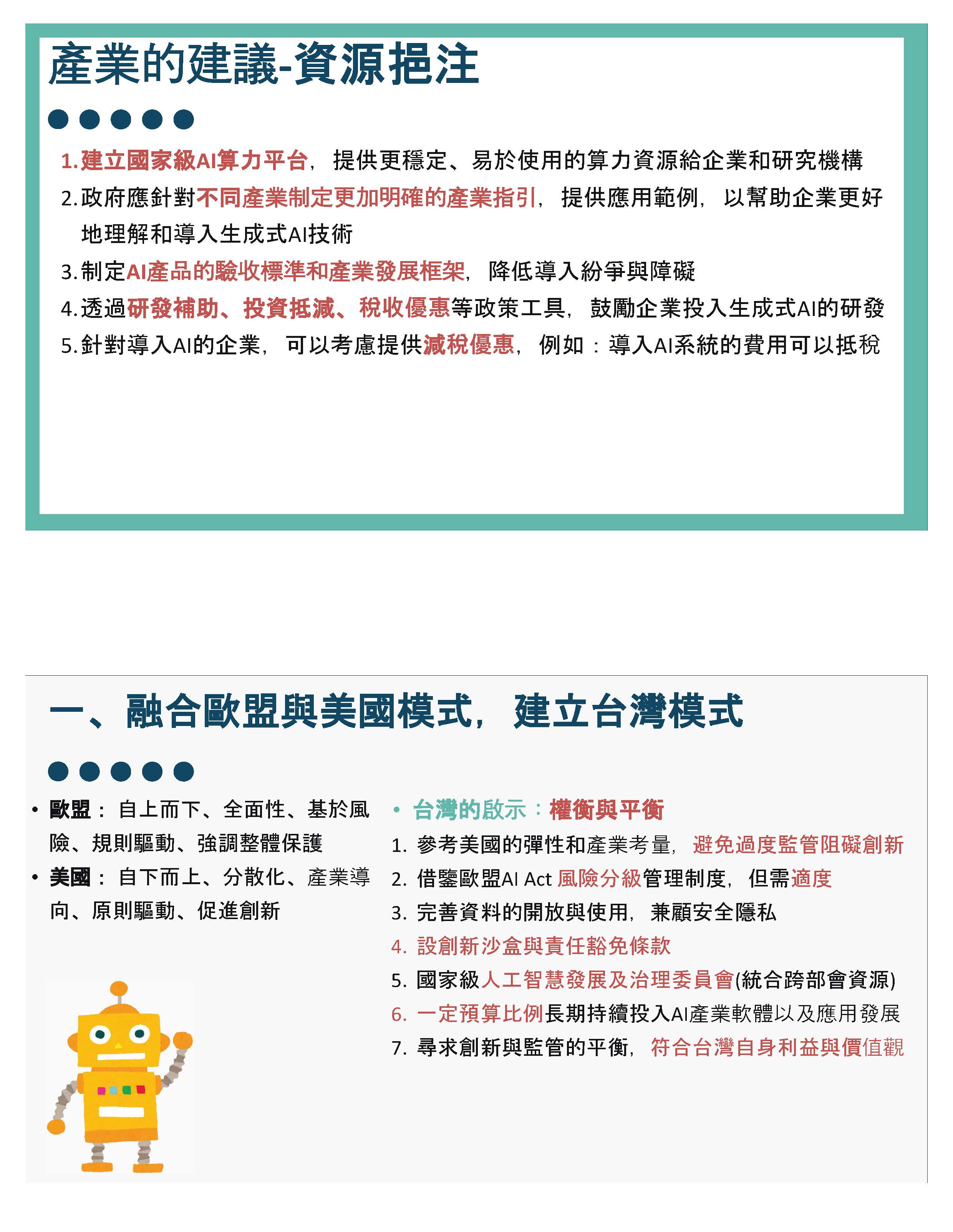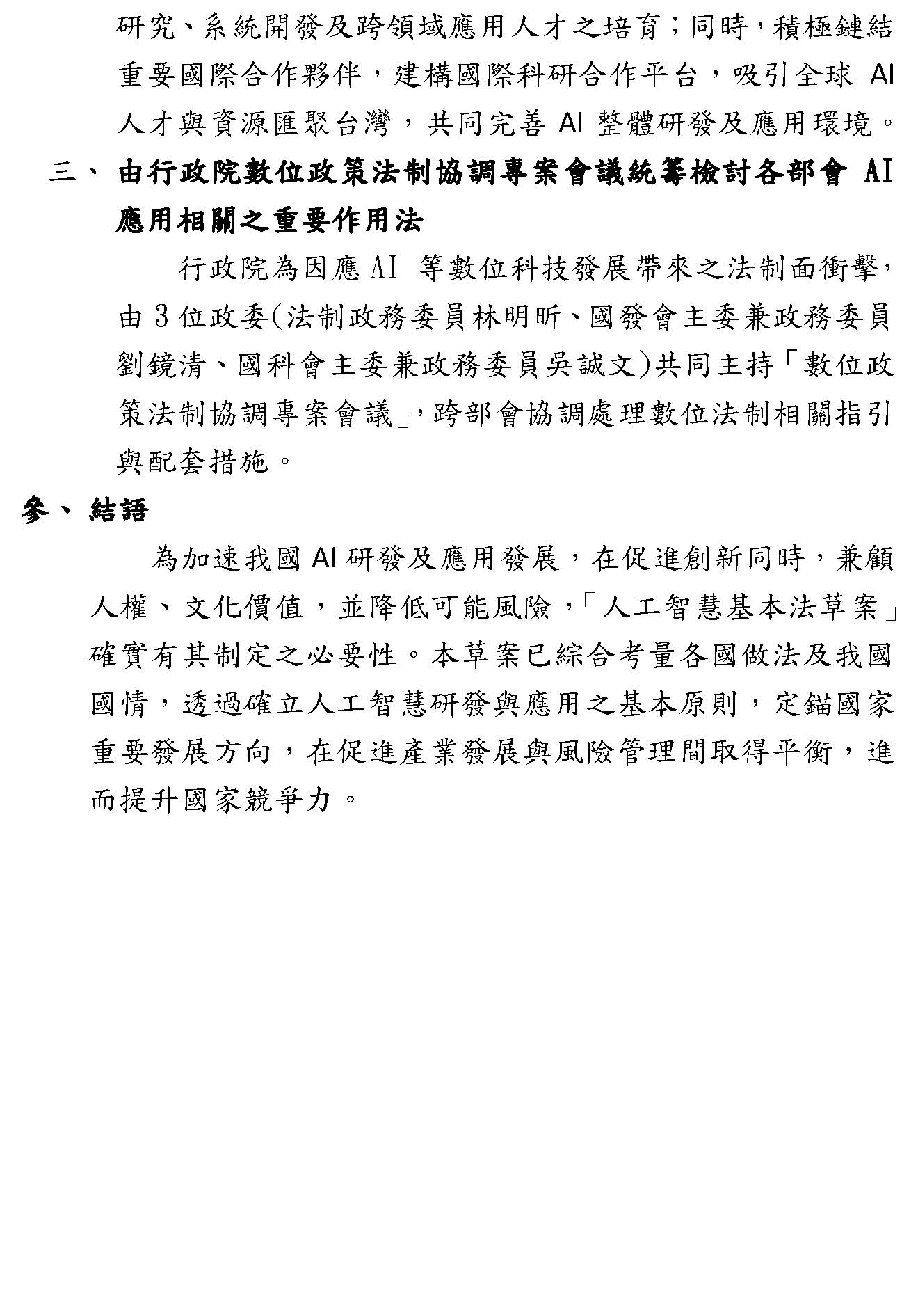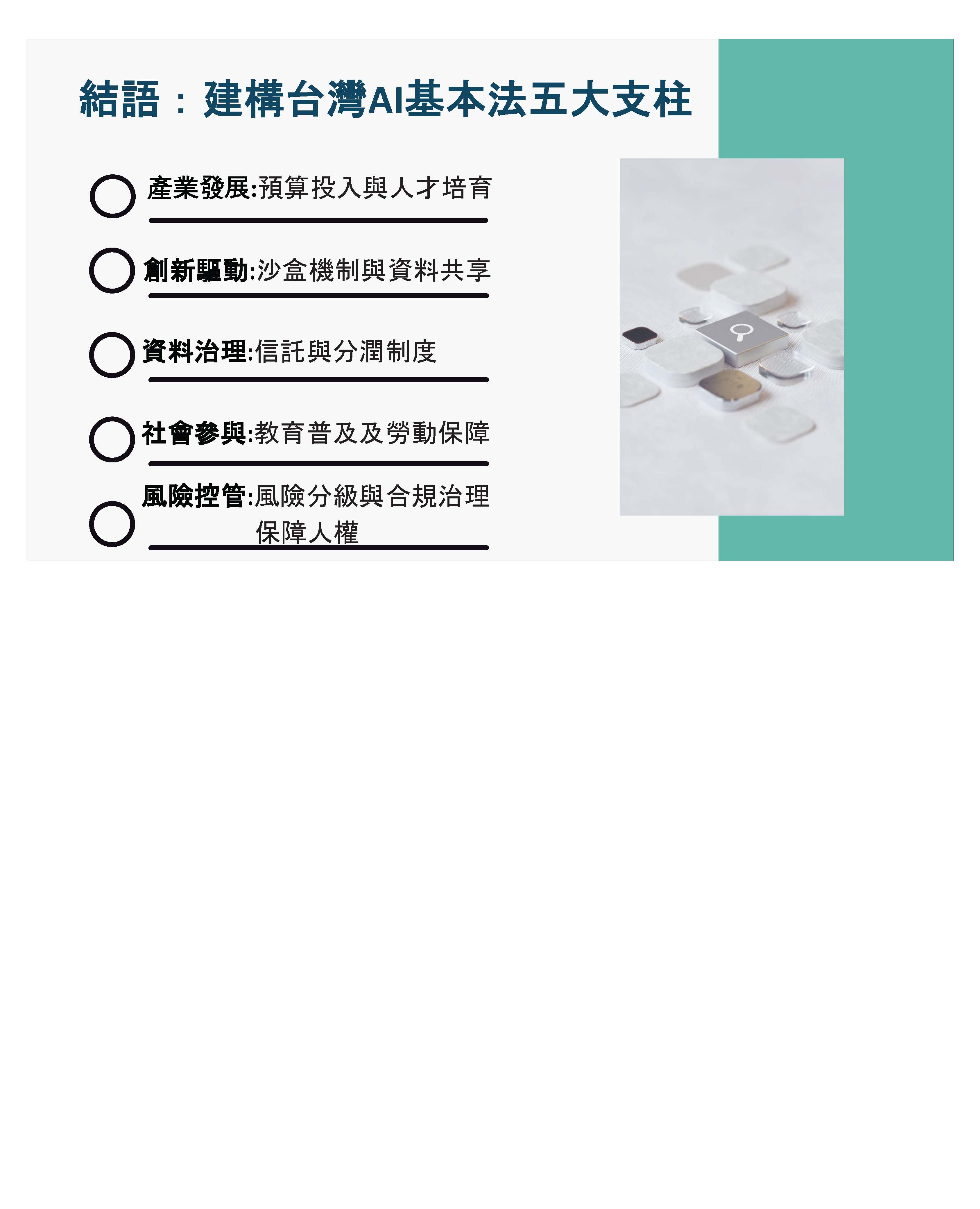我們臺灣借鏡國際治理模式發展思維,特別考量到人工智慧趨勢日新月異及需要保障基本人權,我們也贊成以制定基本法的立法模式來宣示人工智慧的基本原則,促進剛剛主席特別強調的以人為本的人工智慧研發與應用,也保障國民人格尊嚴與權利,提升國民生活福祉、維護國家主權、安全及文化價值,增進永續發展及國家競爭力作為主要的立法宗旨。