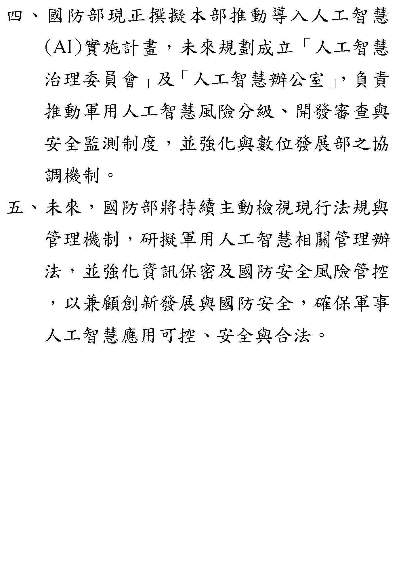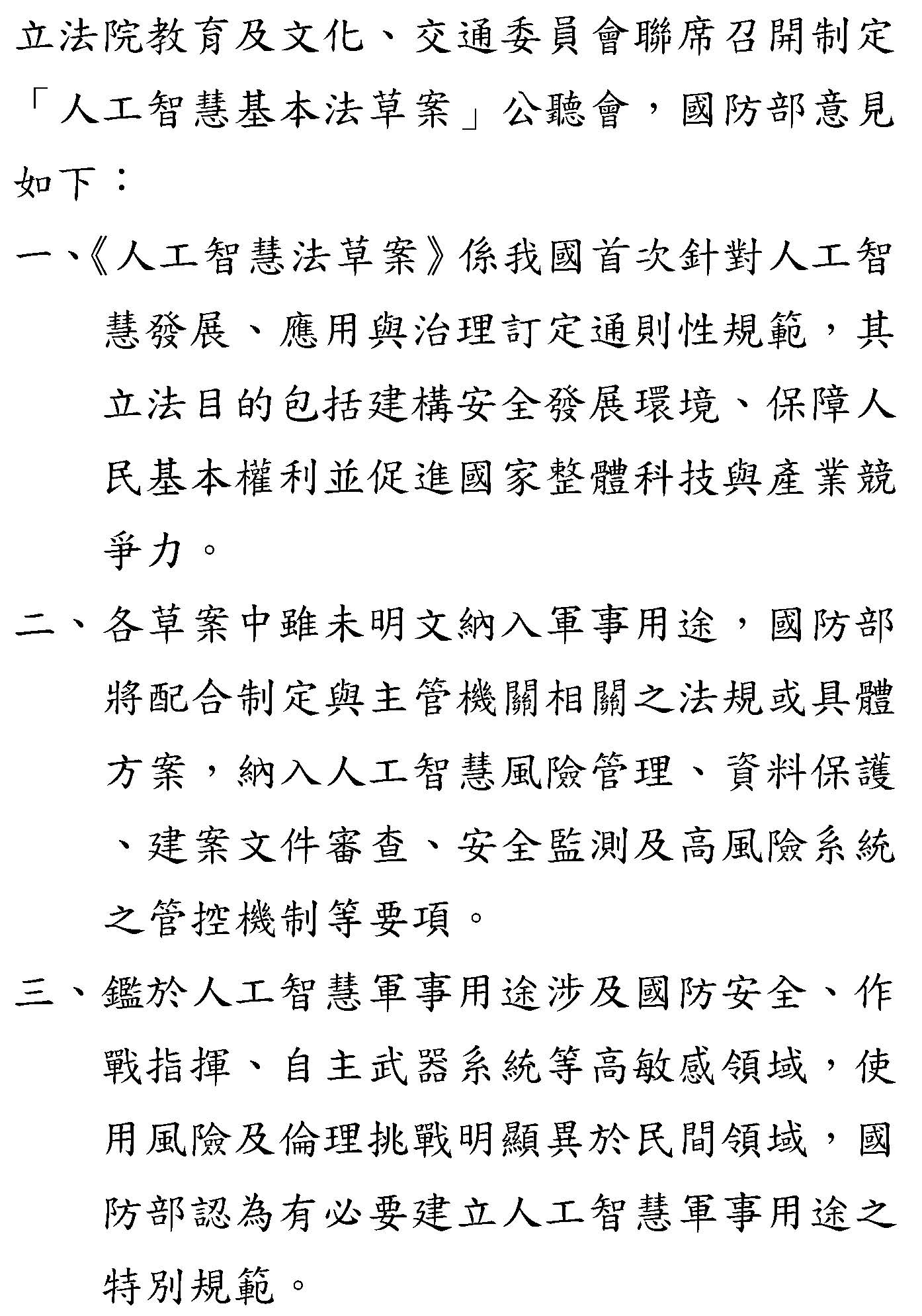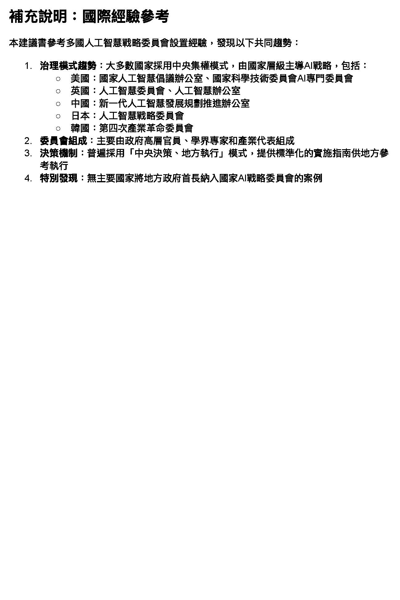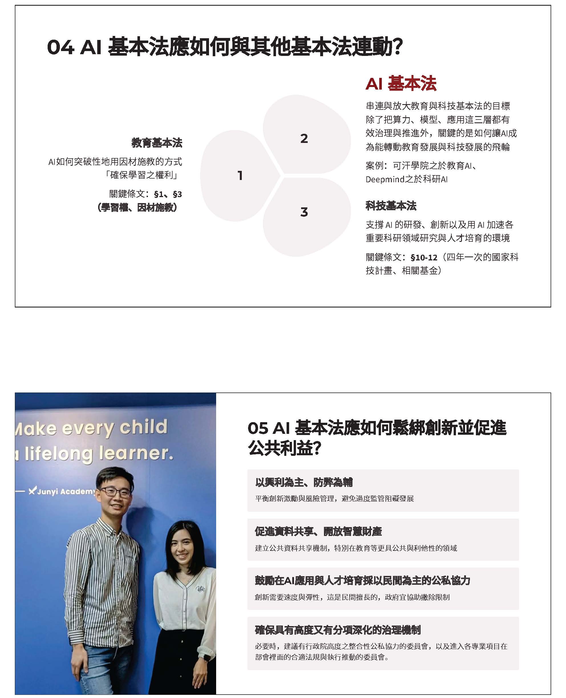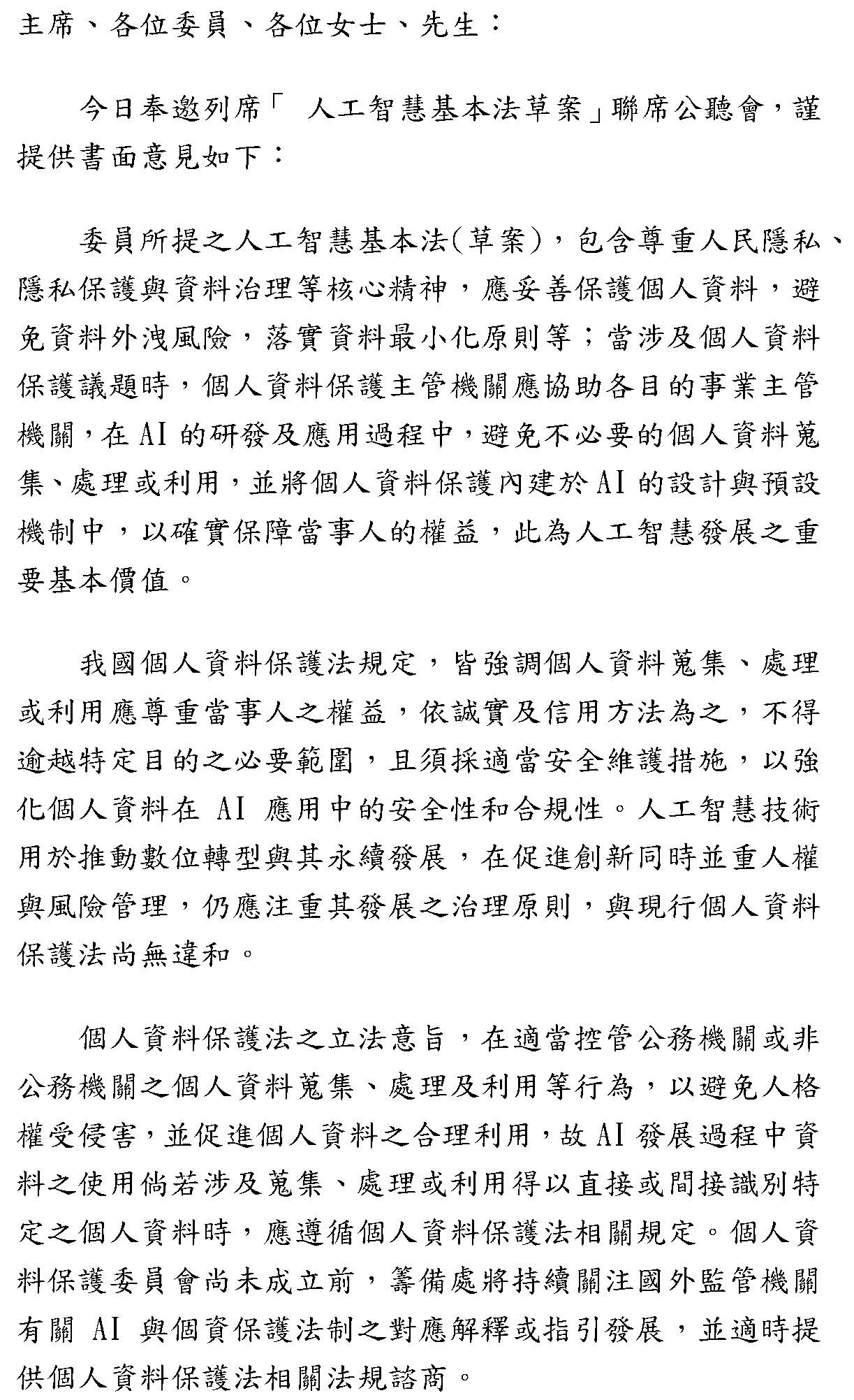 我們臺灣借鏡國際治理模式發展思維,特別考量到人工智慧趨勢日新月異及需要保障基本人權,我們也贊成以制定基本法的立法模式來宣示人工智慧的基本原則,促進剛剛主席特別強調的以人為本的人工智慧研發與應用,也保障國民人格尊嚴與權利,提升國民生活福祉、維護國家主權、安全及文化價值,增進永續發展及國家競爭力作為主要的立法宗旨。