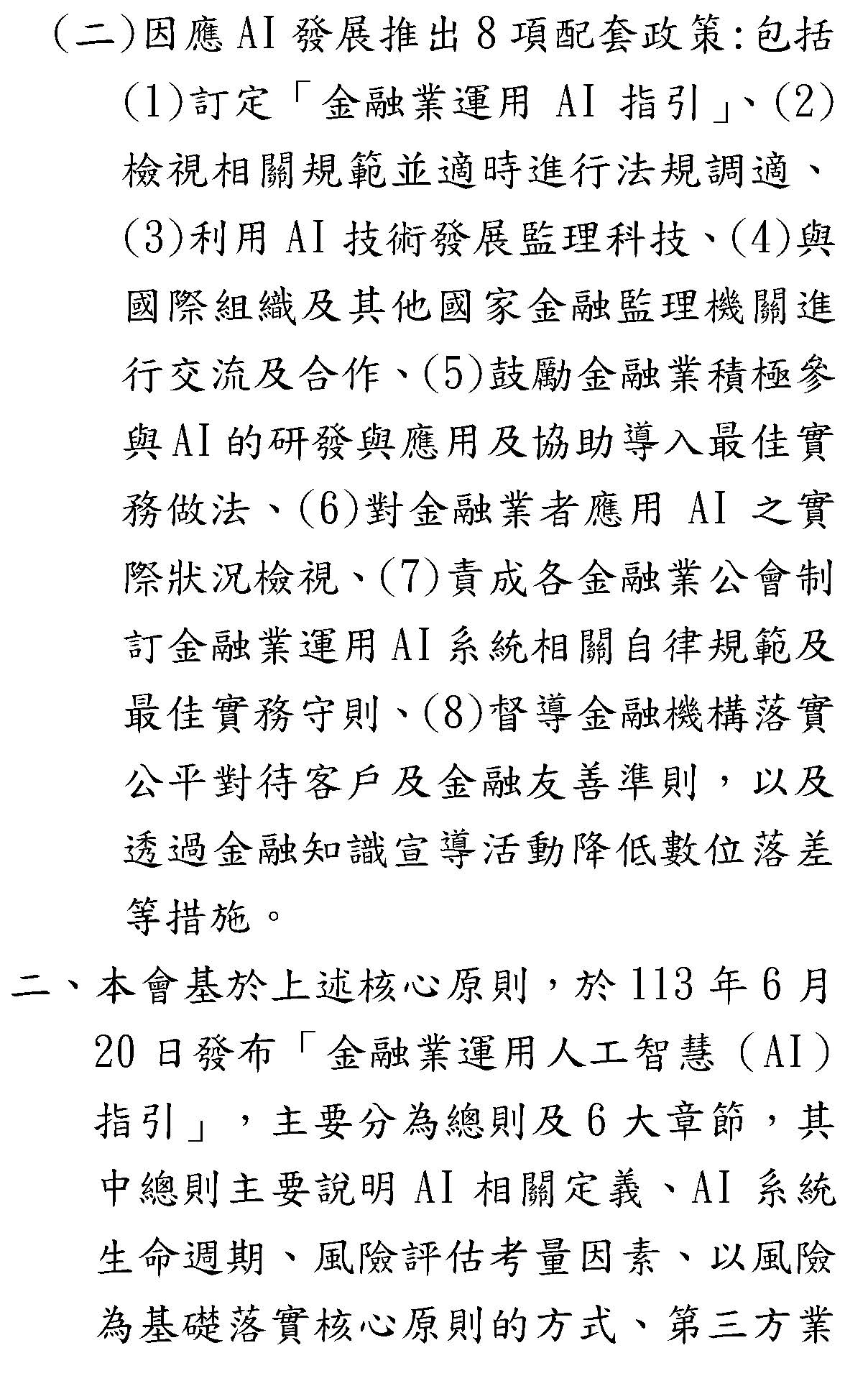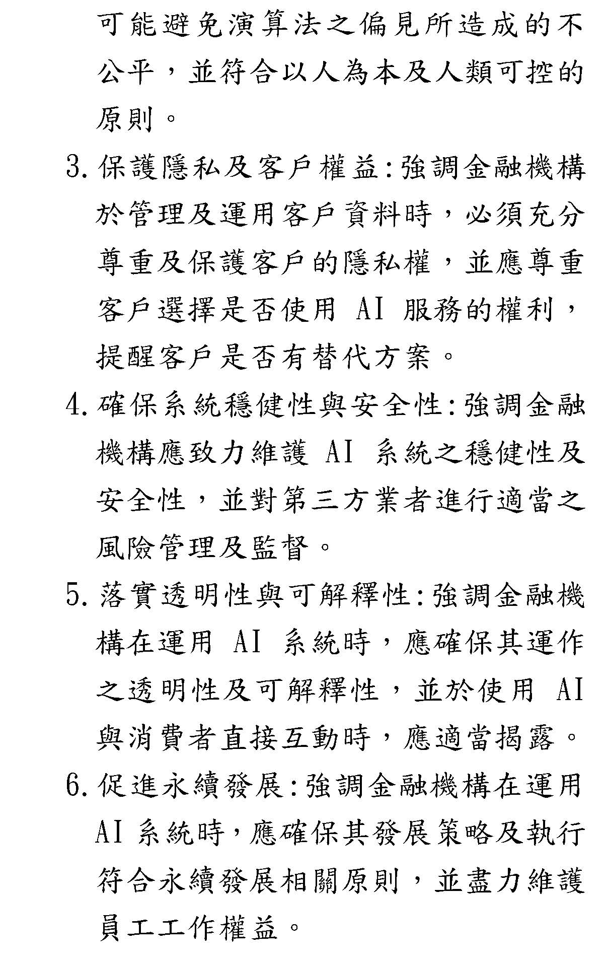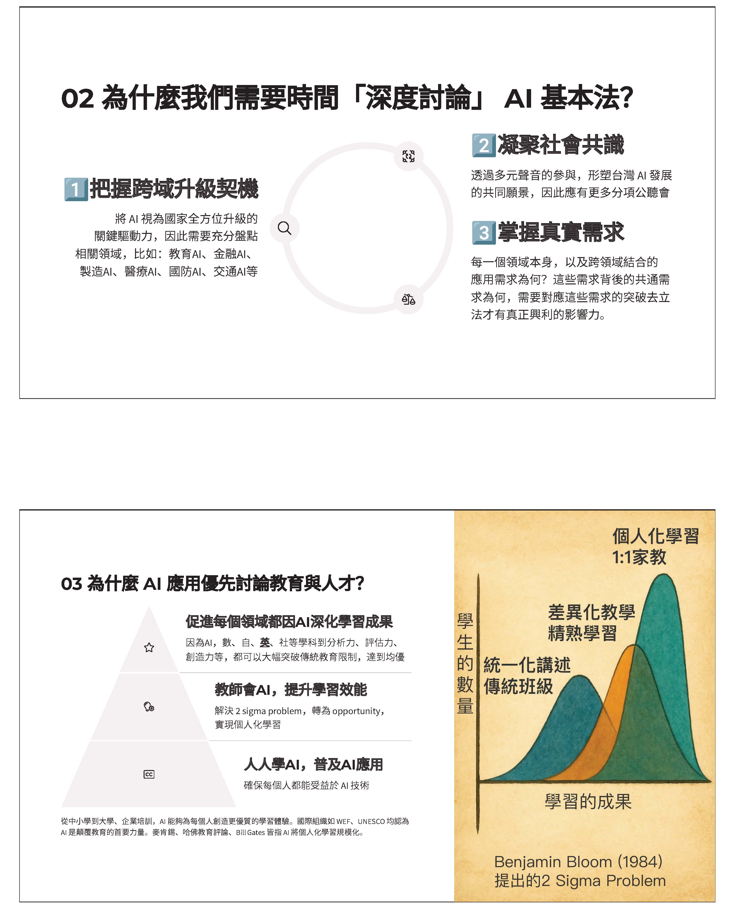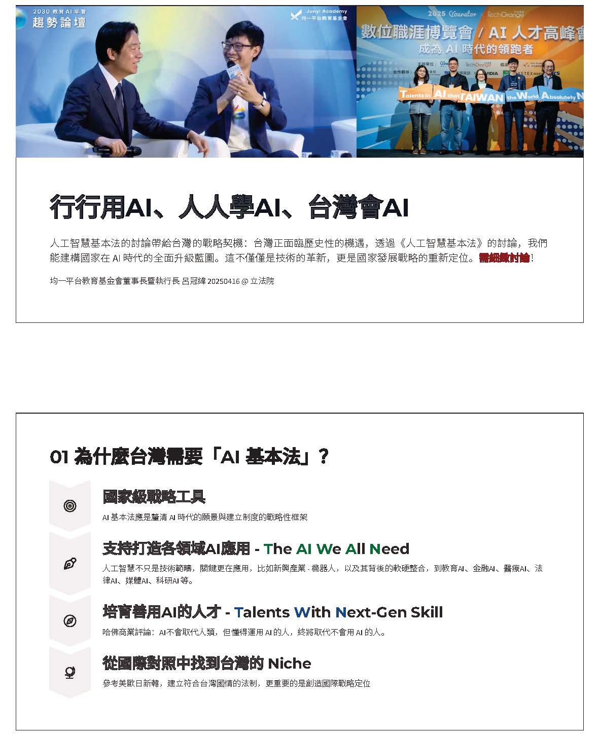 我們臺灣借鏡國際治理模式發展思維,特別考量到人工智慧趨勢日新月異及需要保障基本人權,我們也贊成以制定基本法的立法模式來宣示人工智慧的基本原則,促進剛剛主席特別強調的以人為本的人工智慧研發與應用,也保障國民人格尊嚴與權利,提升國民生活福祉、維護國家主權、安全及文化價值,增進永續發展及國家競爭力作為主要的立法宗旨。