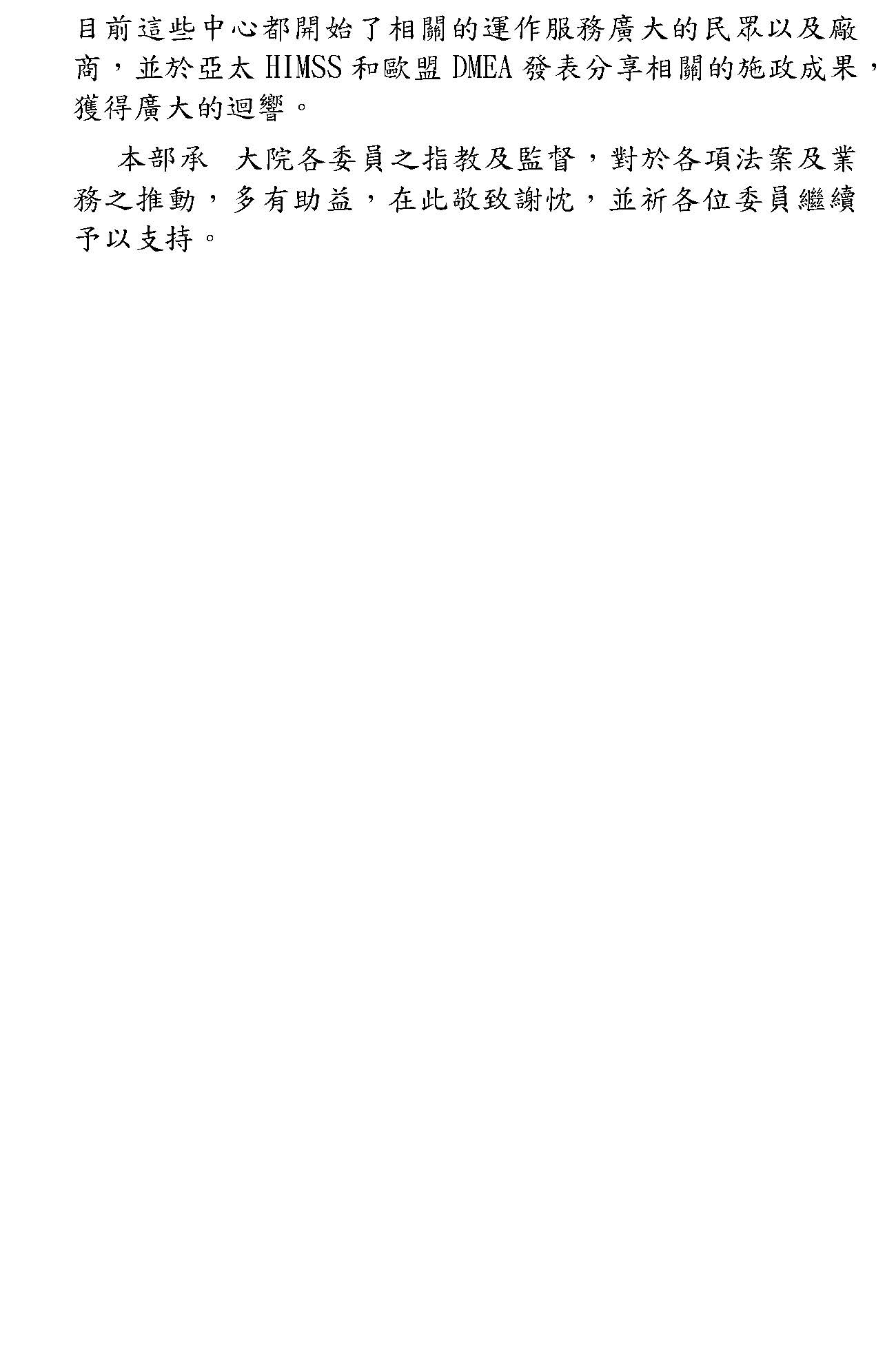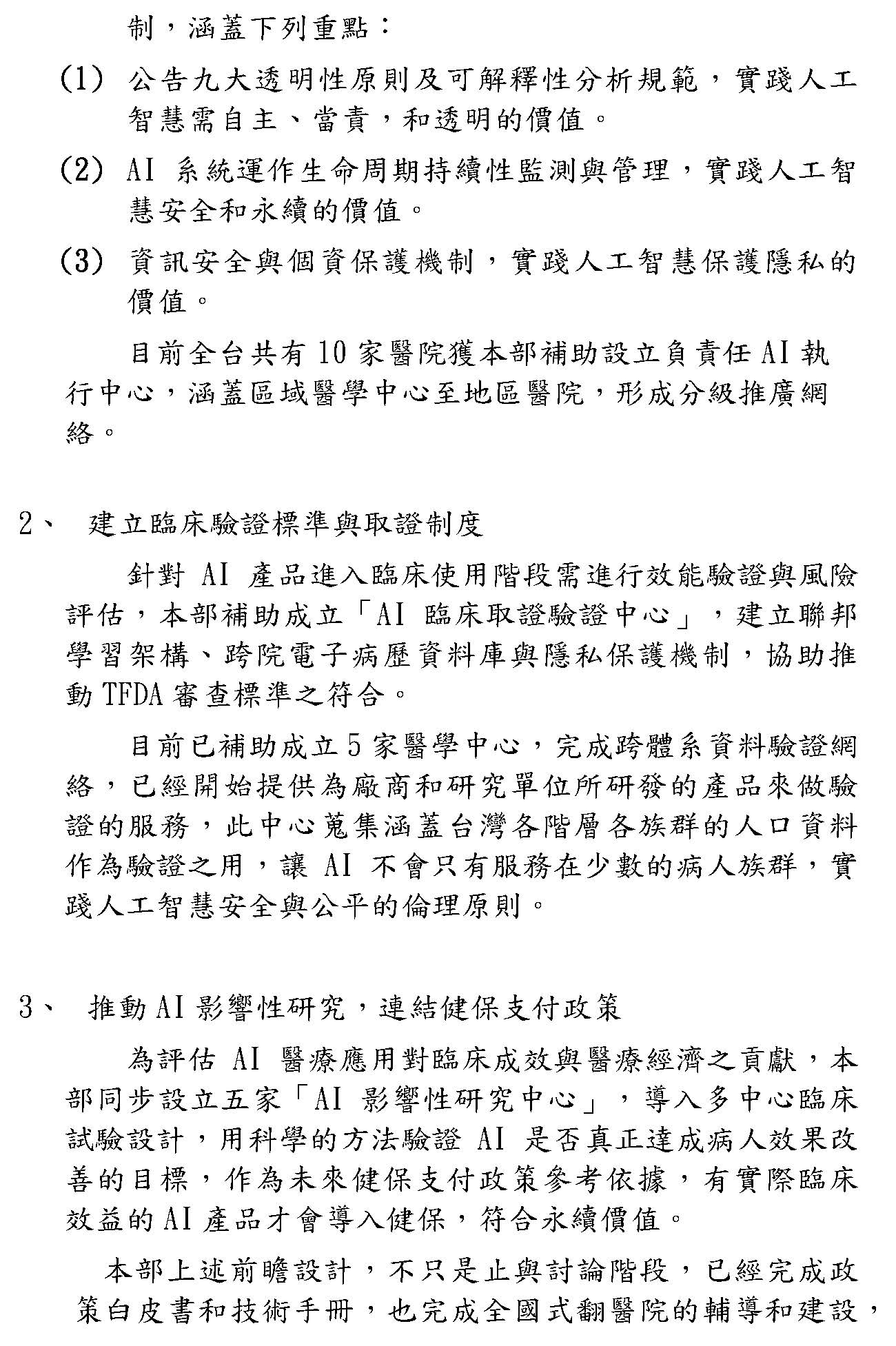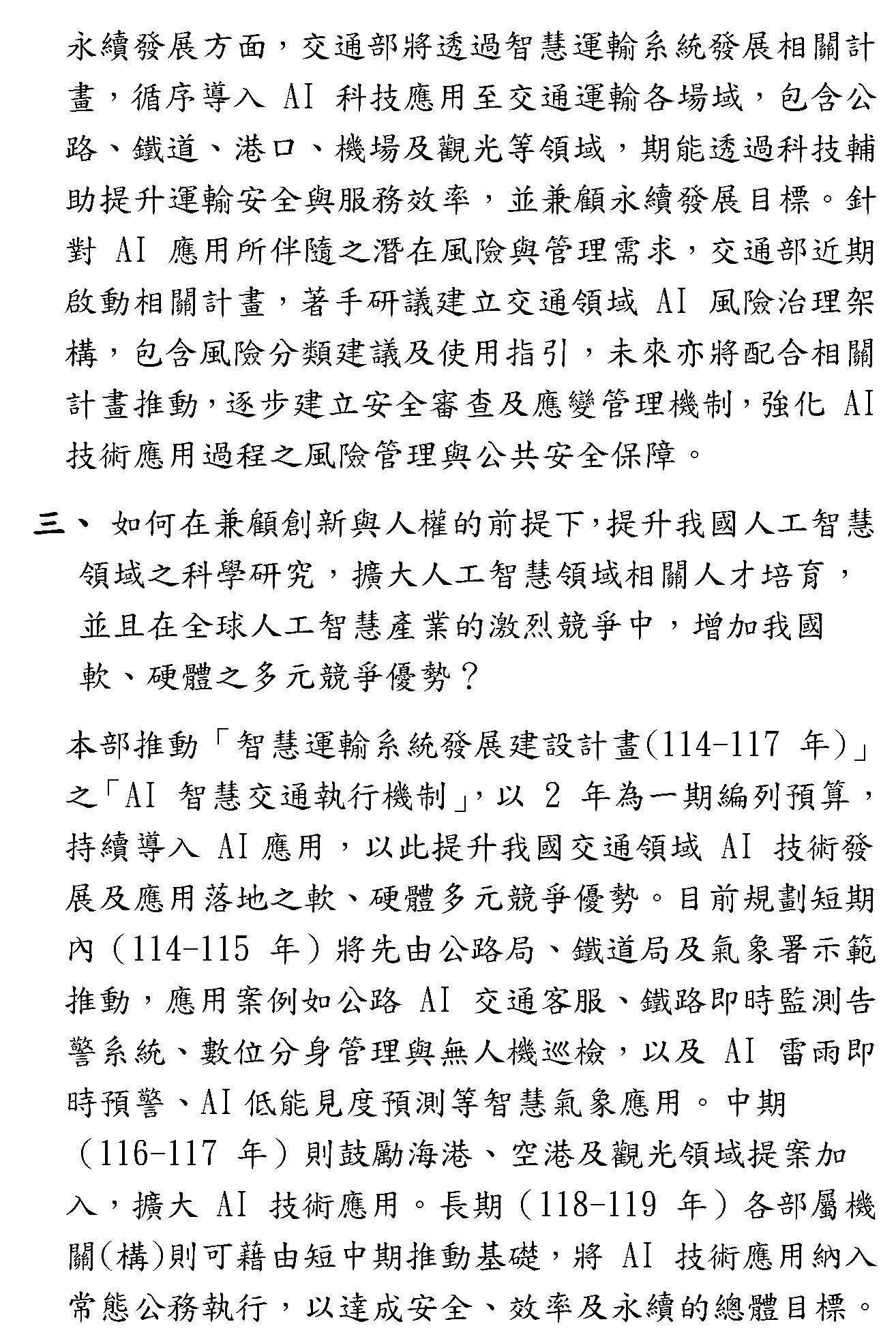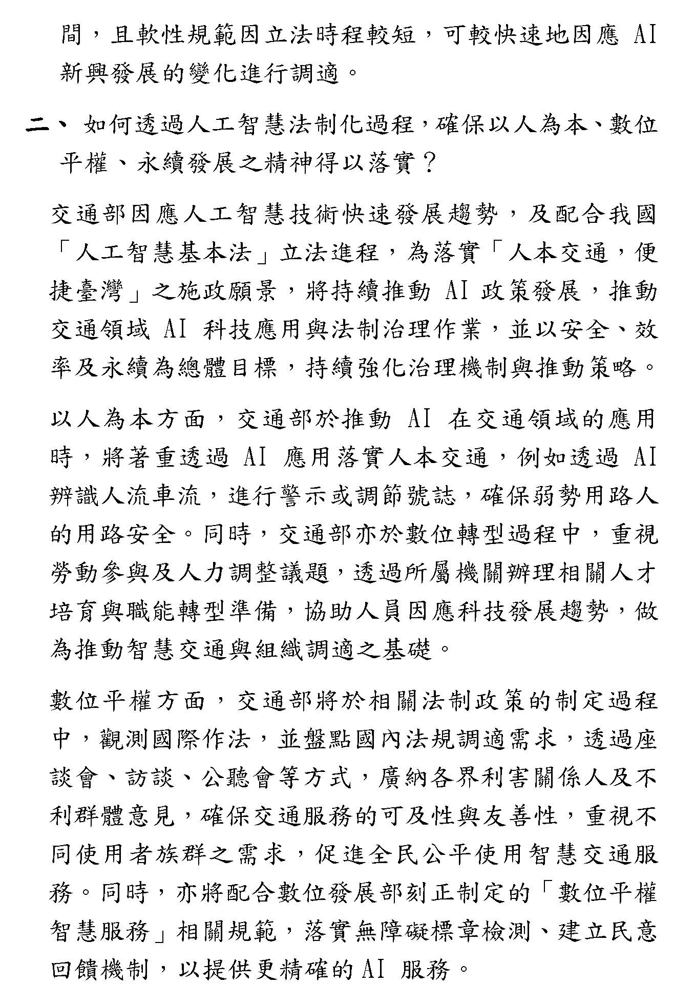 最後,各位都提到數位平權的一個非常重要的概念,我們相當同意,數位發展部成立的一個主要目的就是希望數位的基礎建設以及數位的應用能夠廣泛為我們國民所享用,所以不管是通訊建設也好,或AI的應用發展也好,我們都朝向讓全體國民能夠共享這個數位轉型的利益。