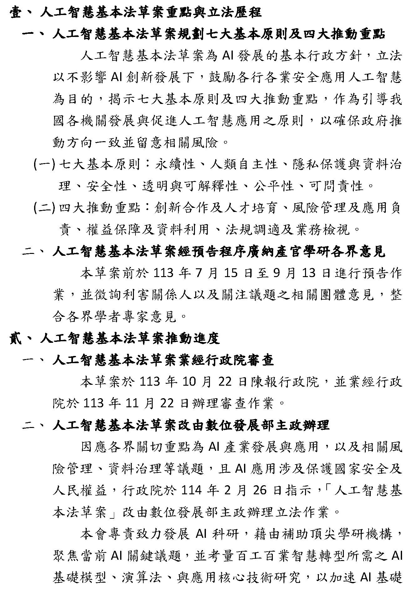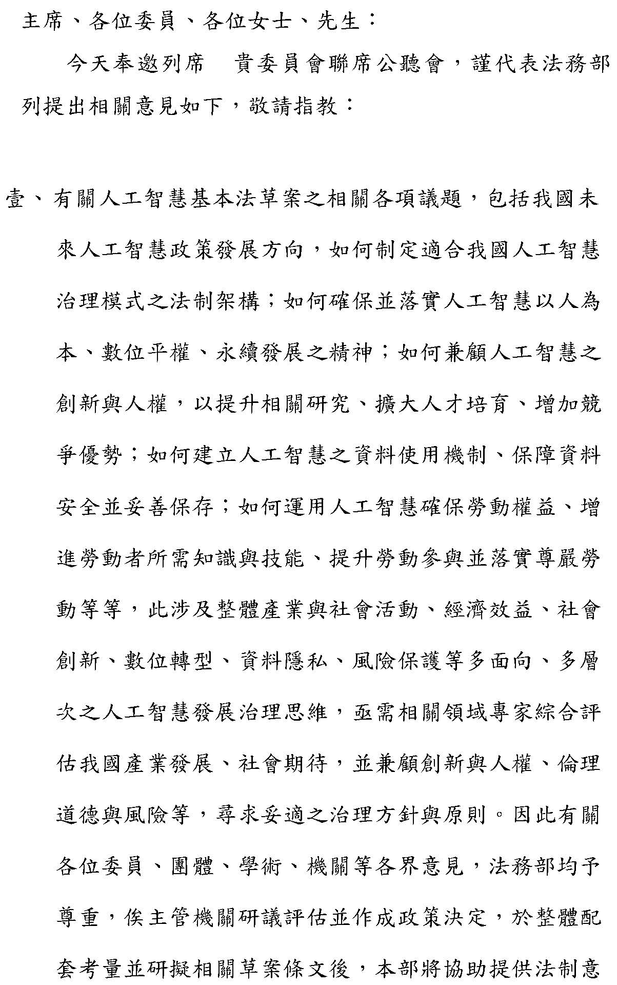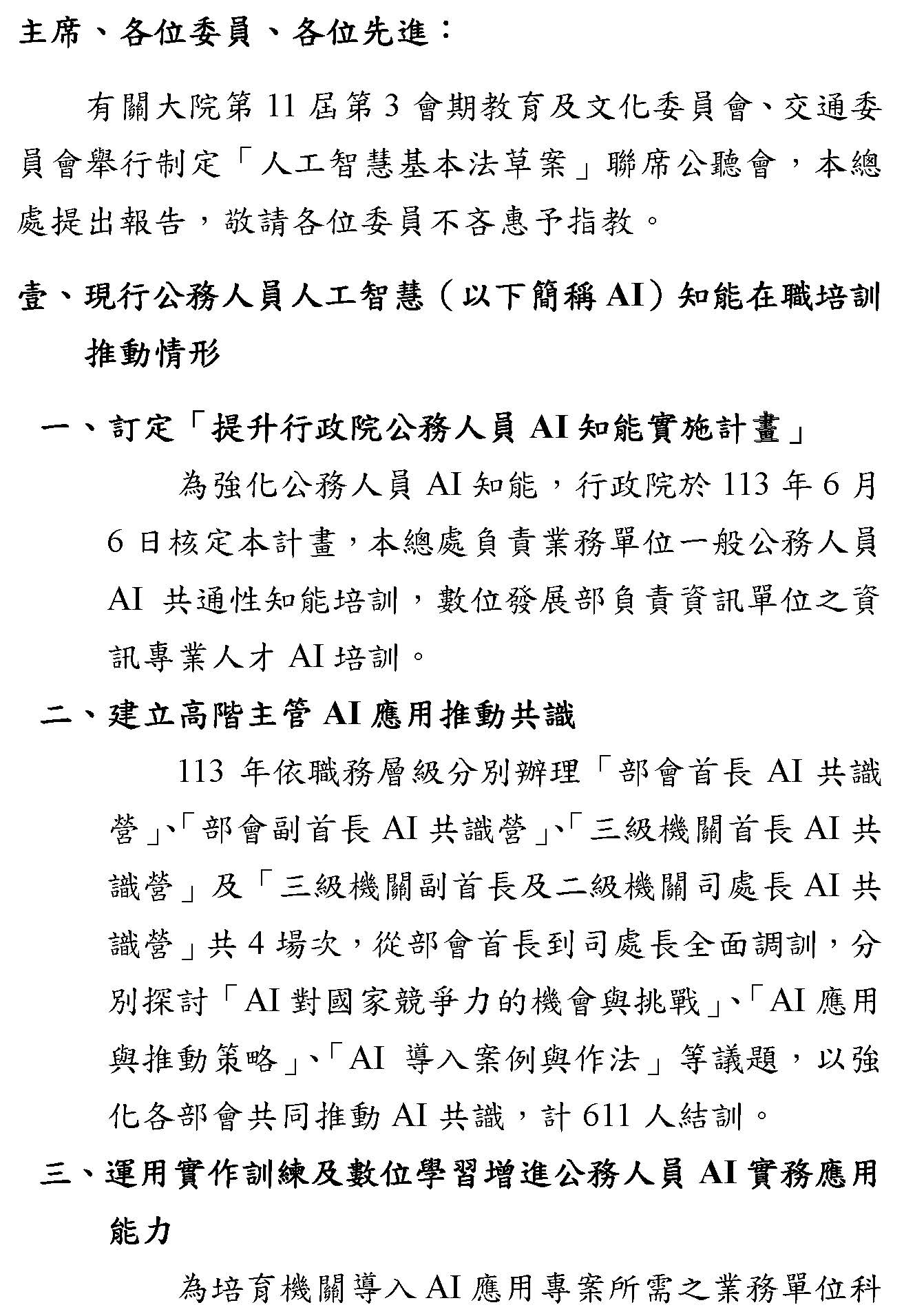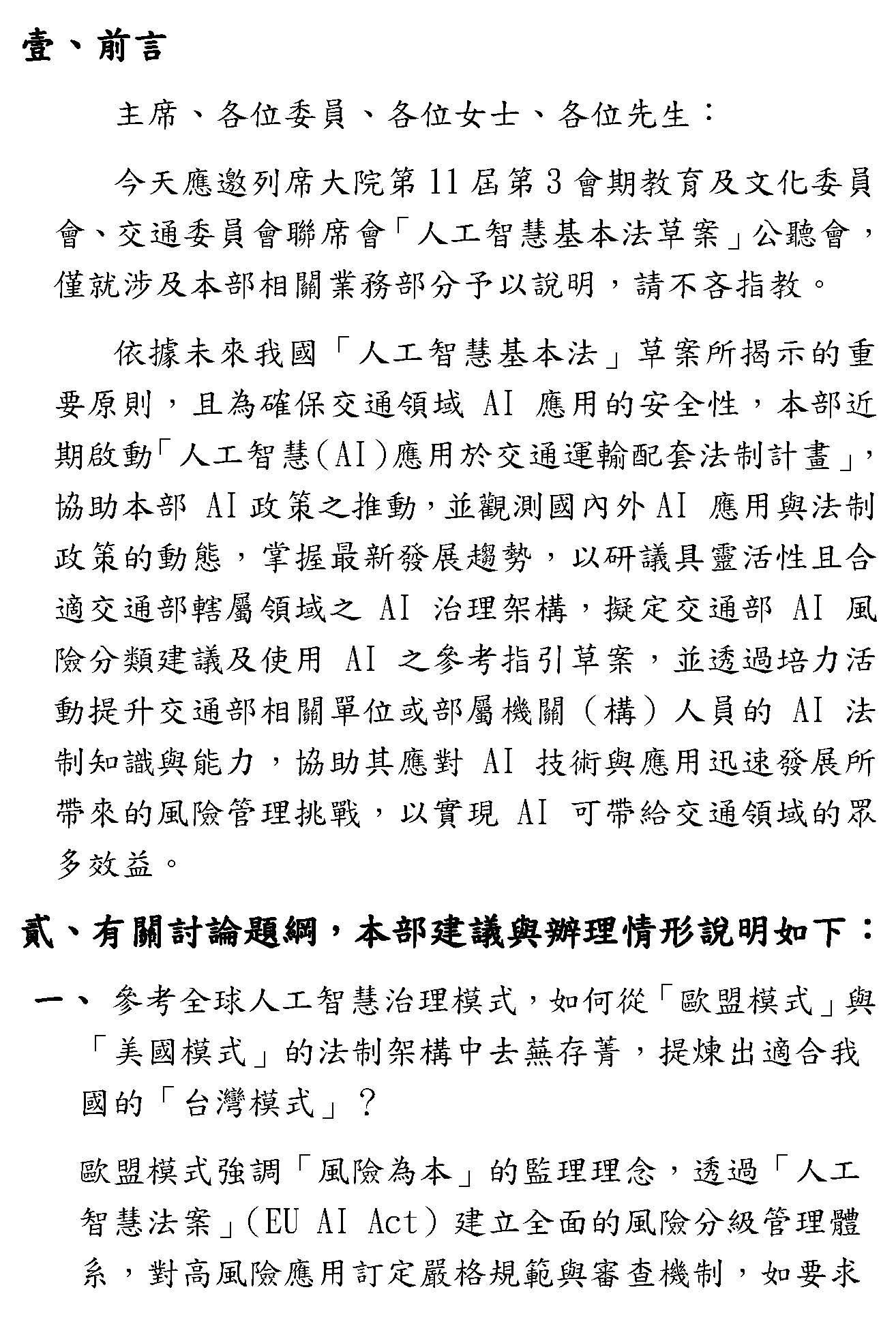 教育及文化委員會、交通委員會舉行制定「人工智慧基本法草案」聯席公聽會書面資料