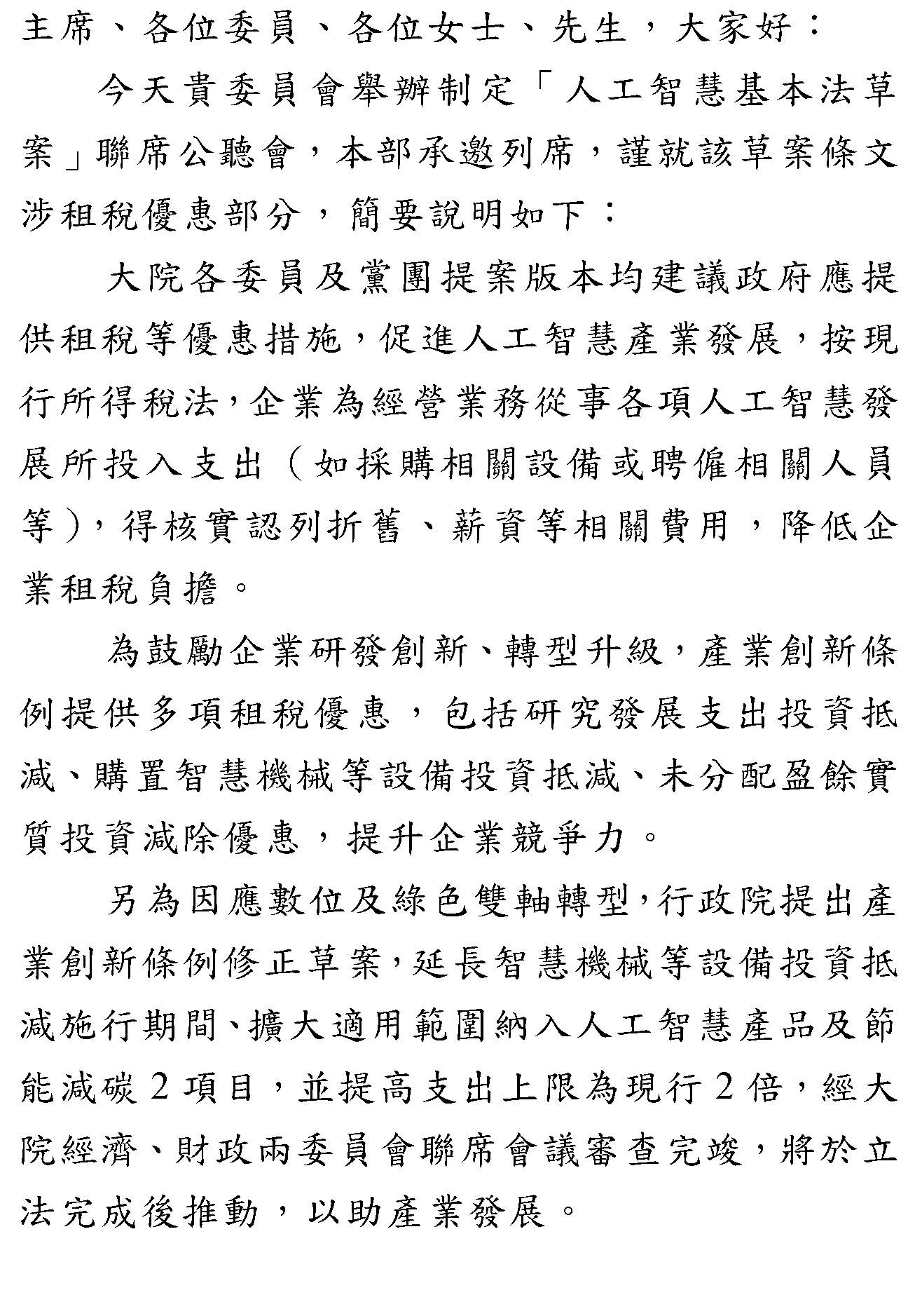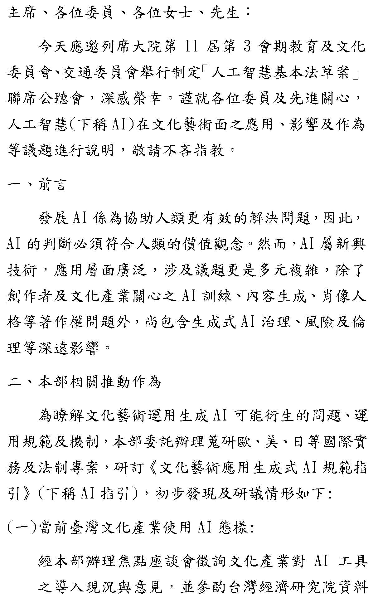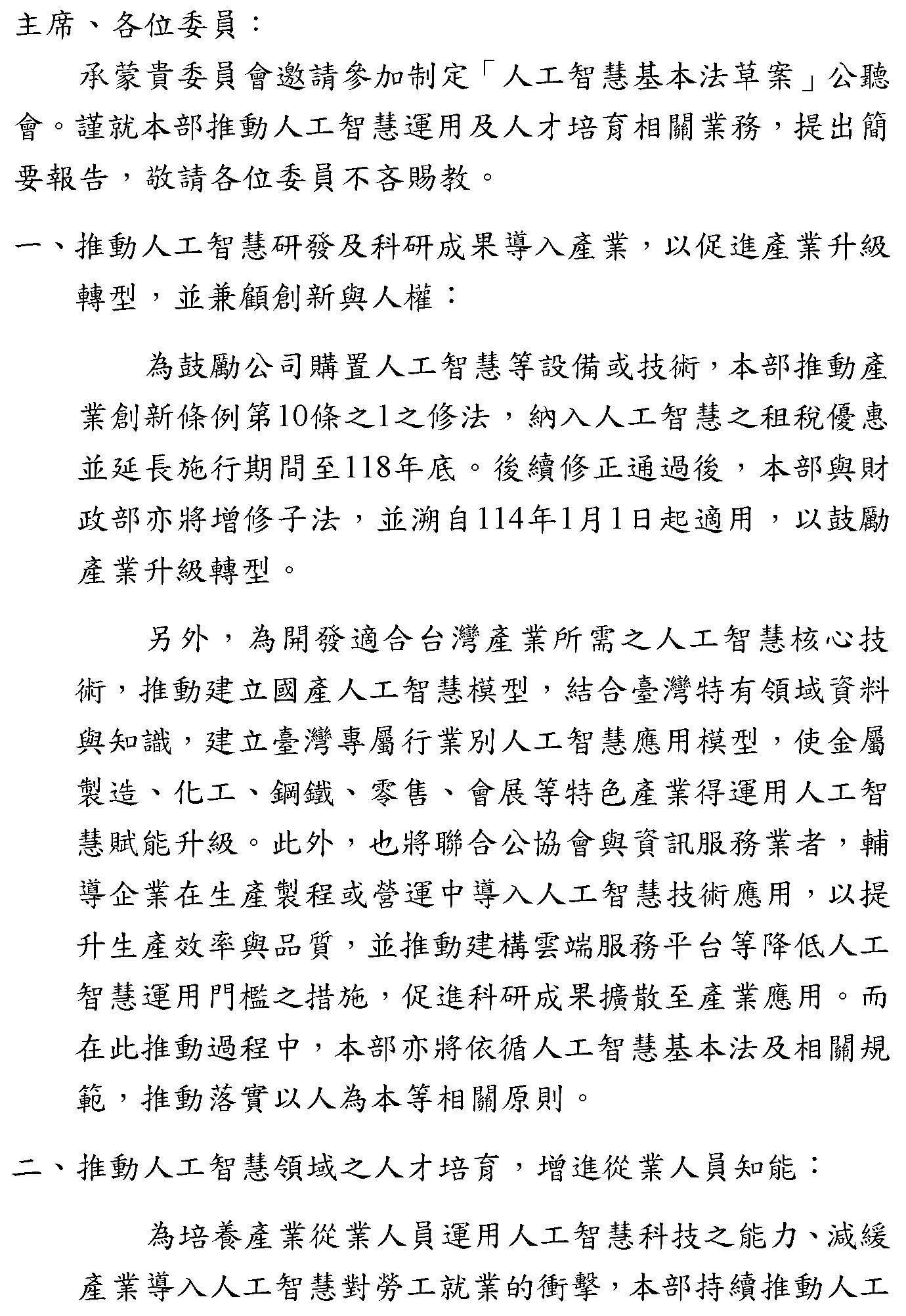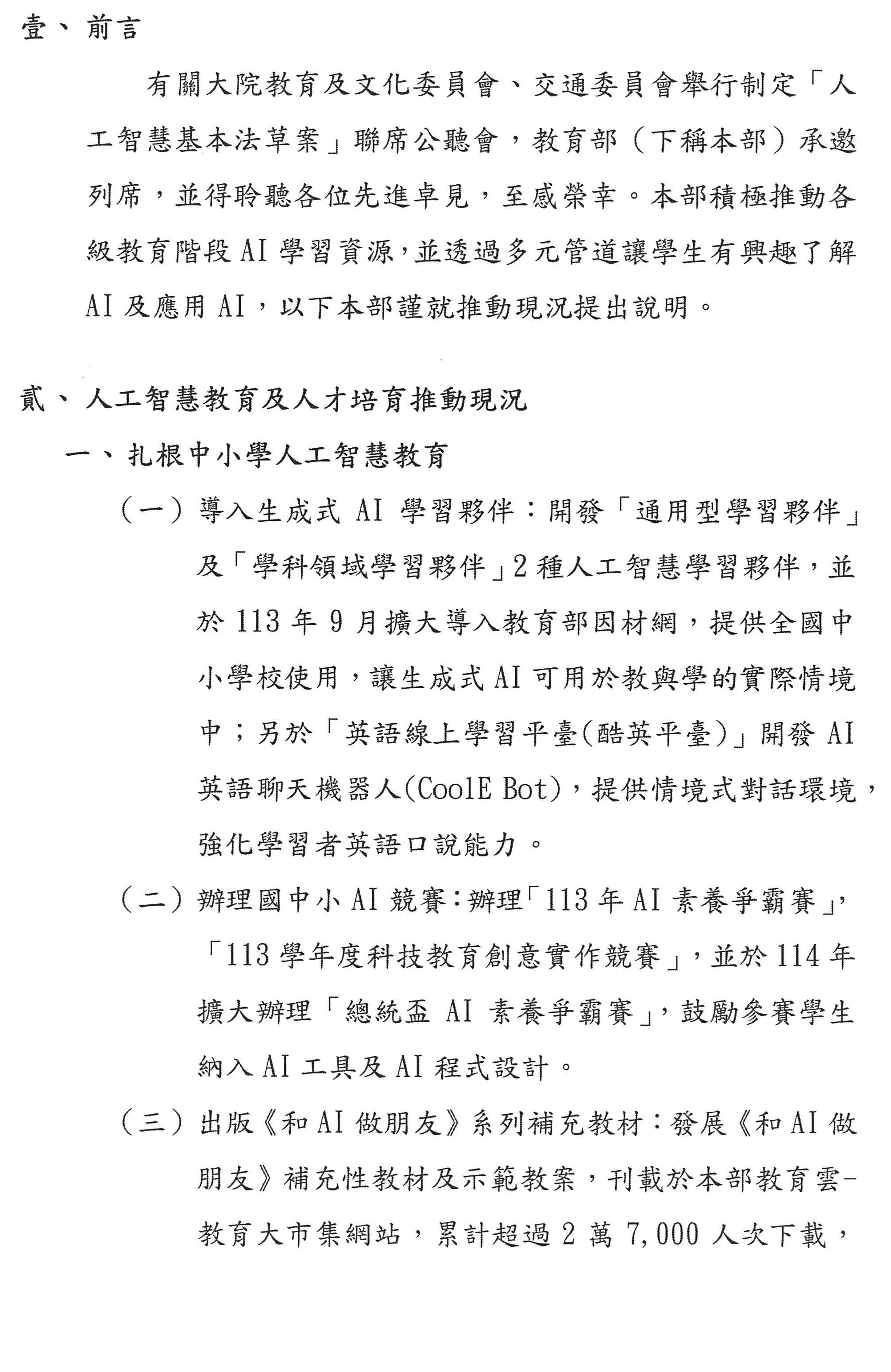 教育及文化委員會、交通委員會舉行制定「人工智慧基本法草案」聯席公聽會書面資料