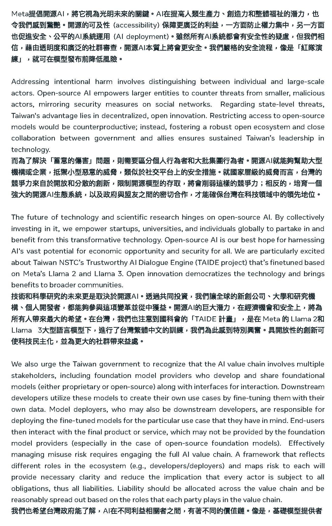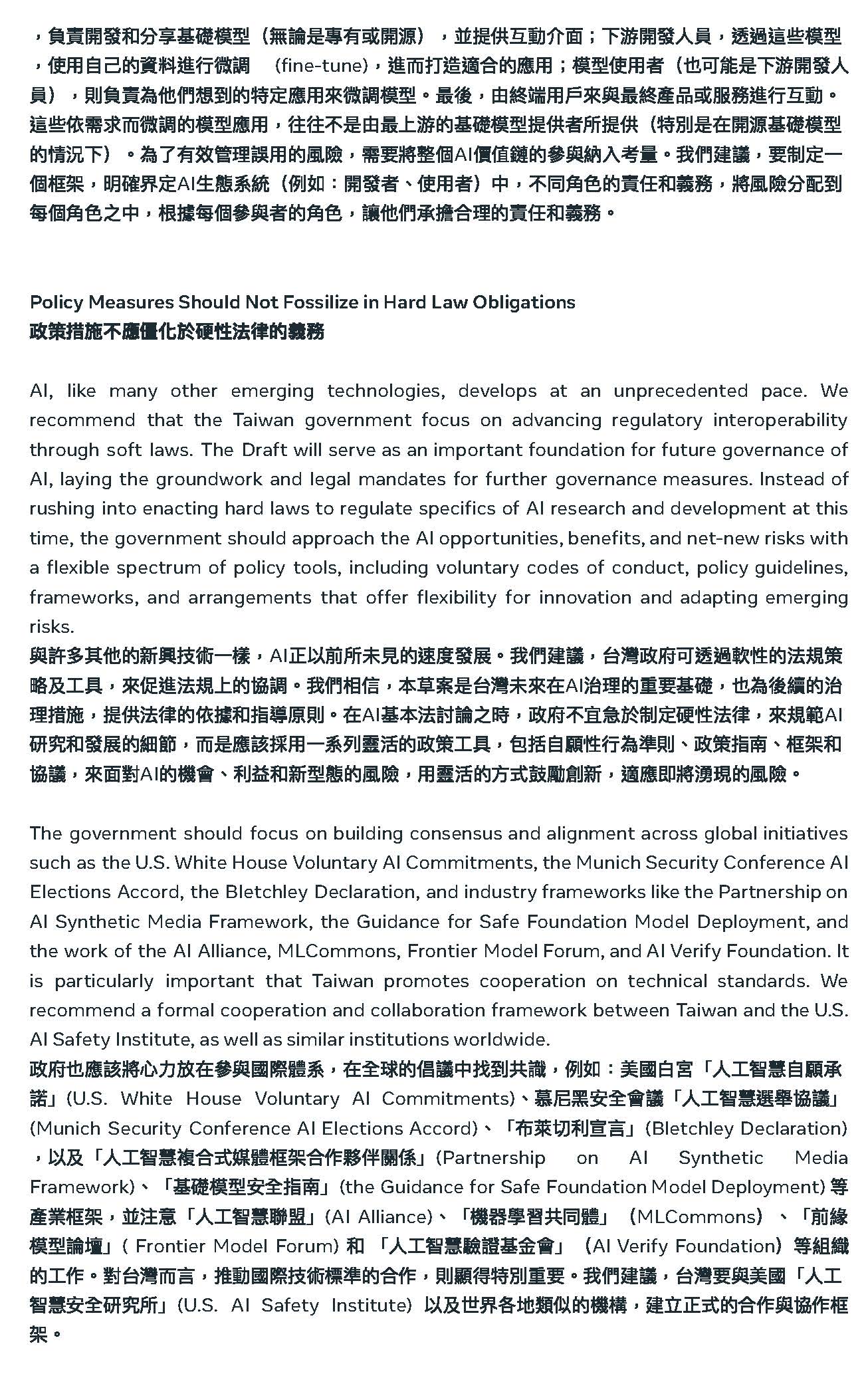 再來是有一個策略上的推動,兩位委員的版本可能都沒有提到,我是覺得open source可能是臺灣最大的出路,也就是在研發AI的時候,我覺得是不是可以在法條裡面再補上「應該要積極鼓勵推動臺灣各個產業在研發的時候投入開源」?不只是用open source,而是臺灣應該有組織、有策略的去投入在open source的社群裡面去貢獻,因為只有透過你有貢獻,你才會在全球有影響力,我們才能夠在美中這兩大科技經濟體下面,在open source的世界中取得一席之地,這部分是不是在法條裡面可以訂?
