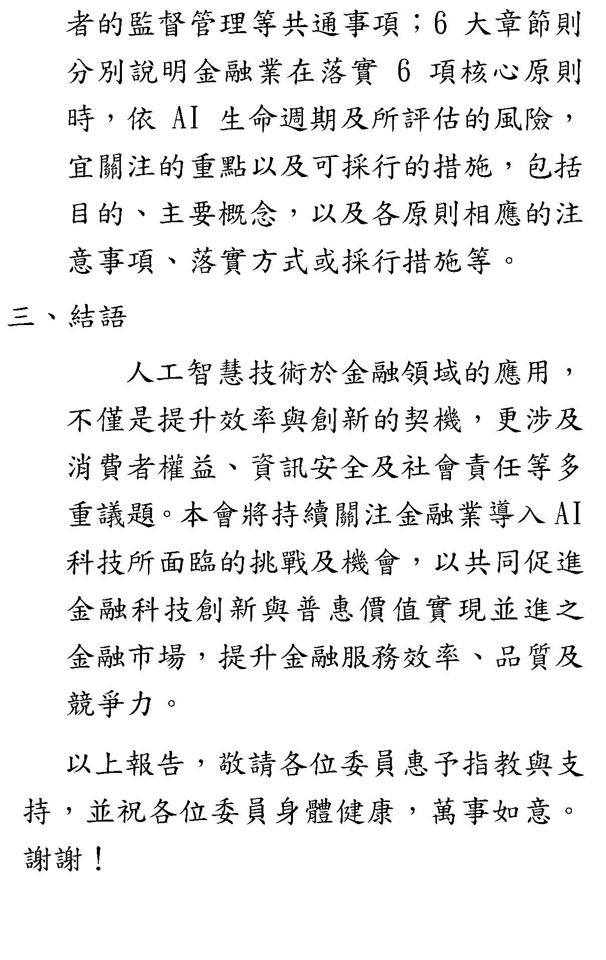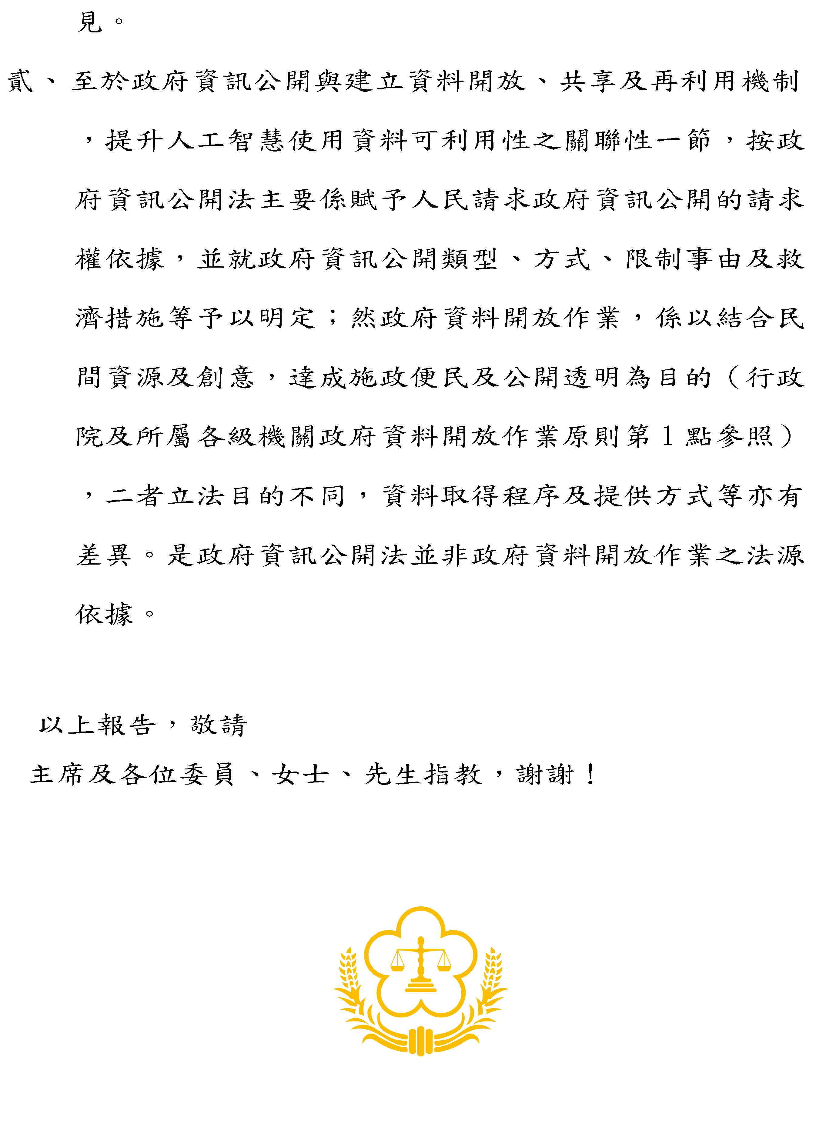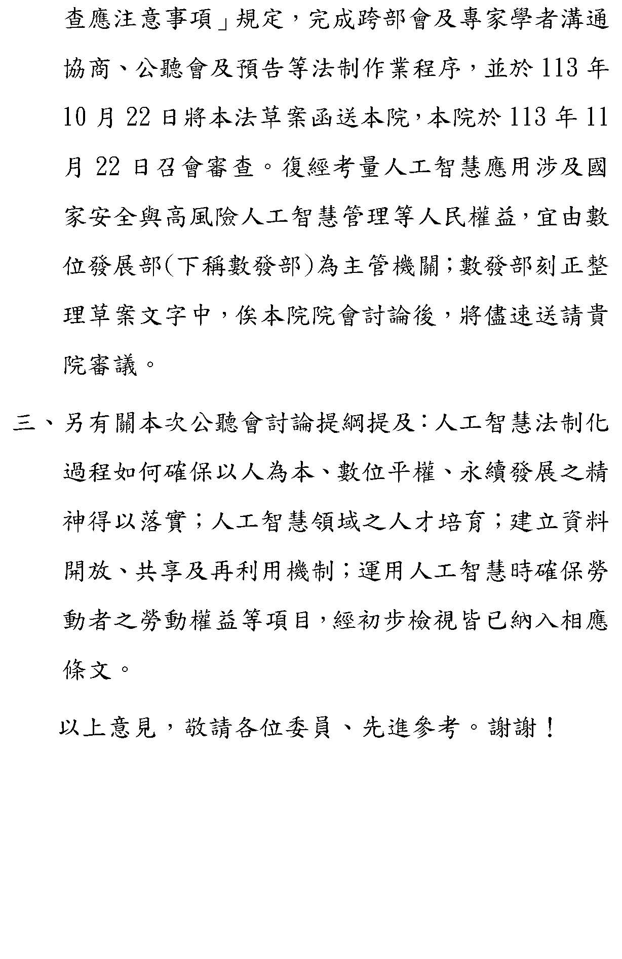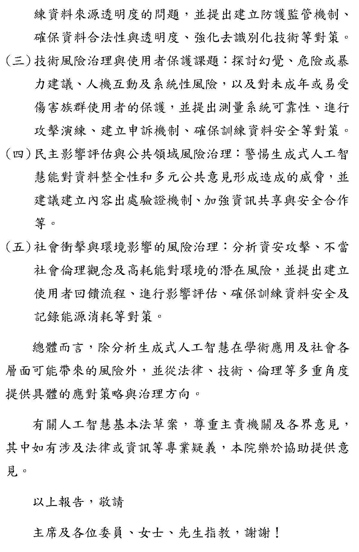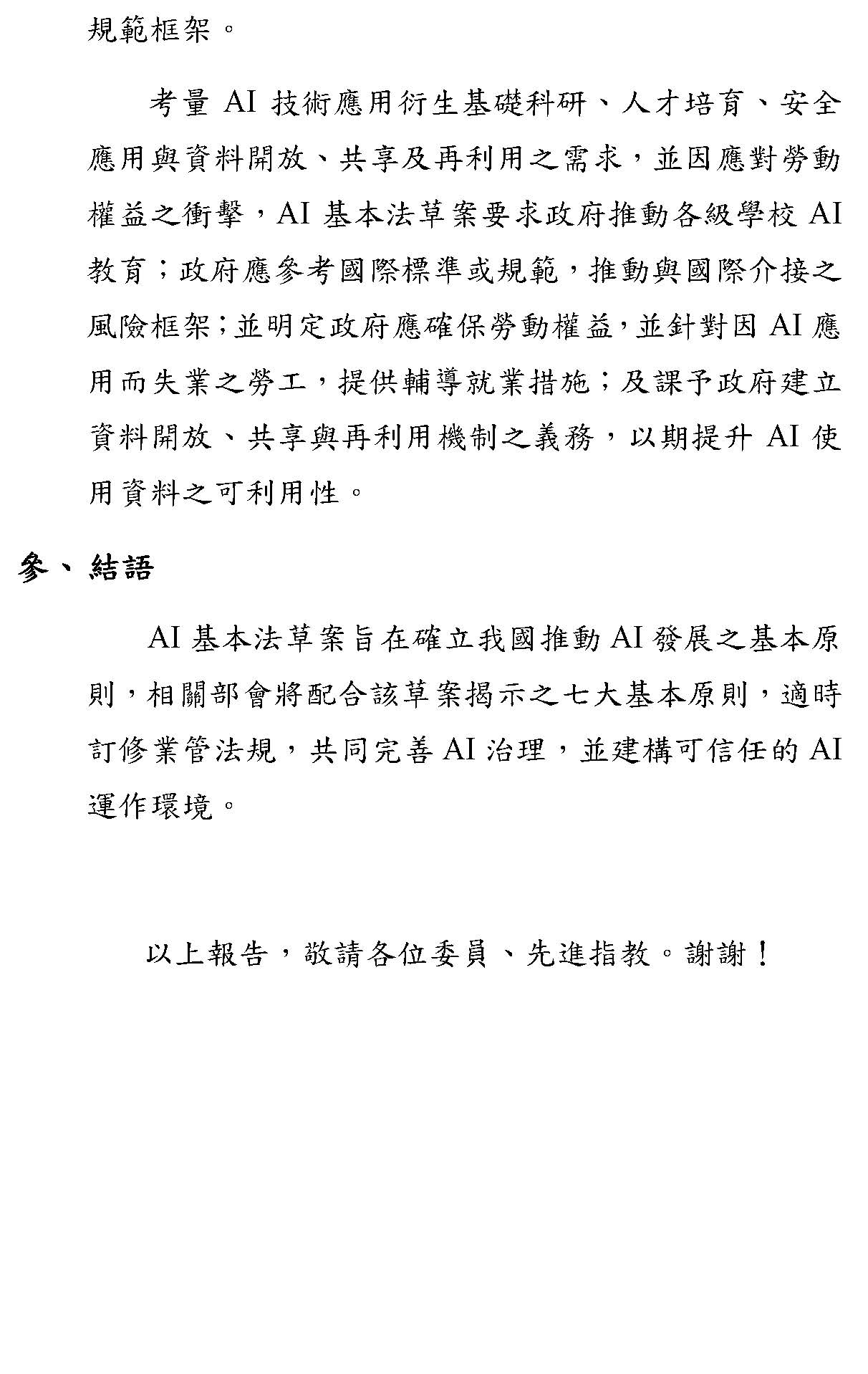 我們非常感謝各位先進、各位委員給我們的指教,本部也會參考各位的寶貴意見,繼續進行AI基本法的相關推動以及未來法律的解釋,並跟各部會共同合作。以上報告,謝謝。