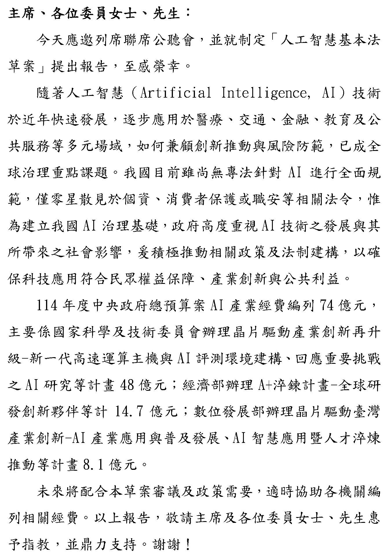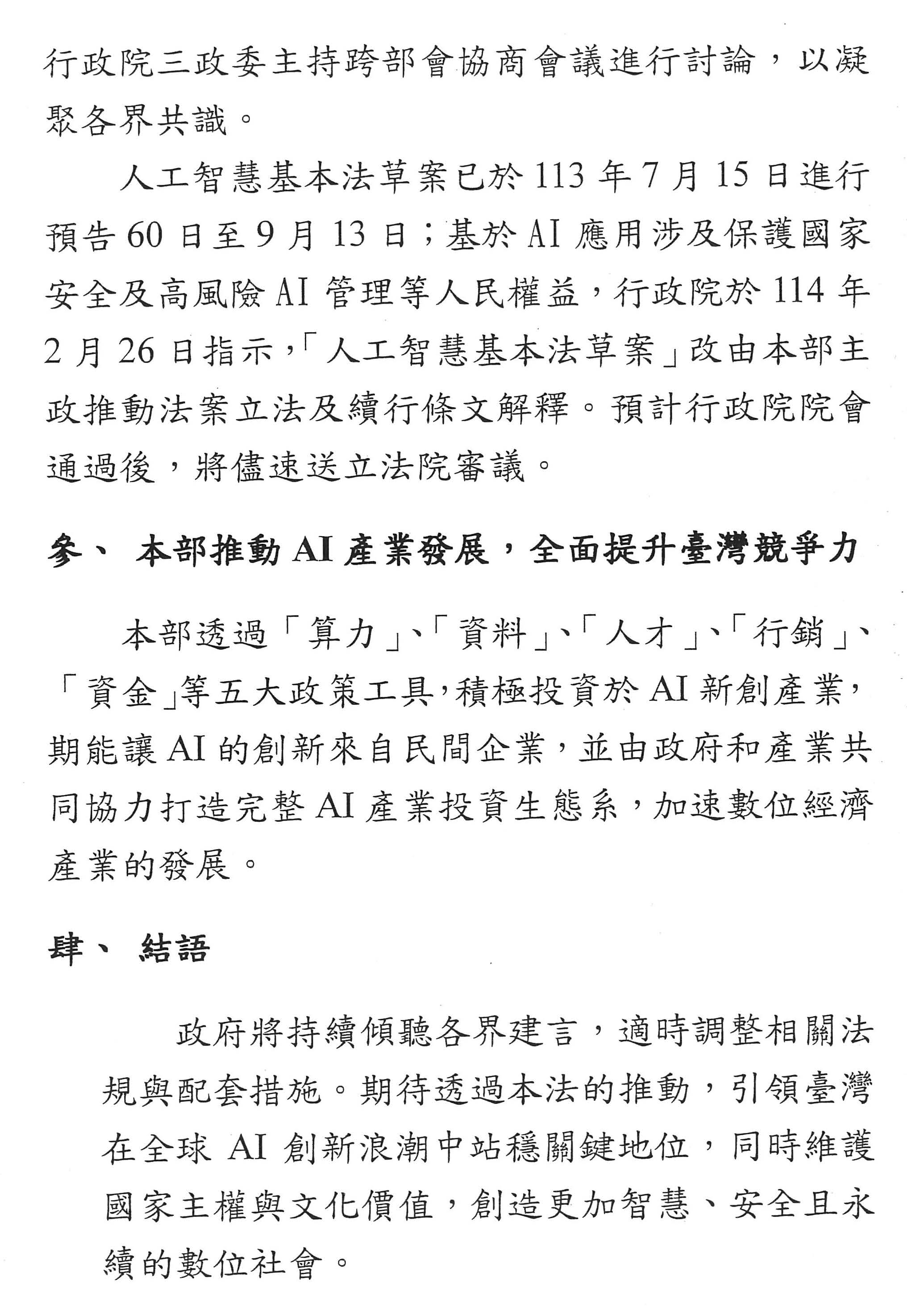 基本法草案國科會已經在去年7月預告了,有鑑於AI應用發展跟保護國家安全有密切相關,行政院的確在2月指示這個基本法草案改由本部來進行推動立法,而且續行條文的解釋,我們會全力以赴,希望能夠在最短時間由行政院通過,送請大院審議。本部除了法案的推動之外,我們也持續推動AI的產業發展,我們透過算力、資料、人才、行銷、資金等五大政策工具,積極投資臺灣的AI新創事業,希望能夠讓AI的創新來自於我們民間企業的活力,並由政府及產業共同協力來打造完整AI產業投資生態系,加速數位經濟產業的發展。