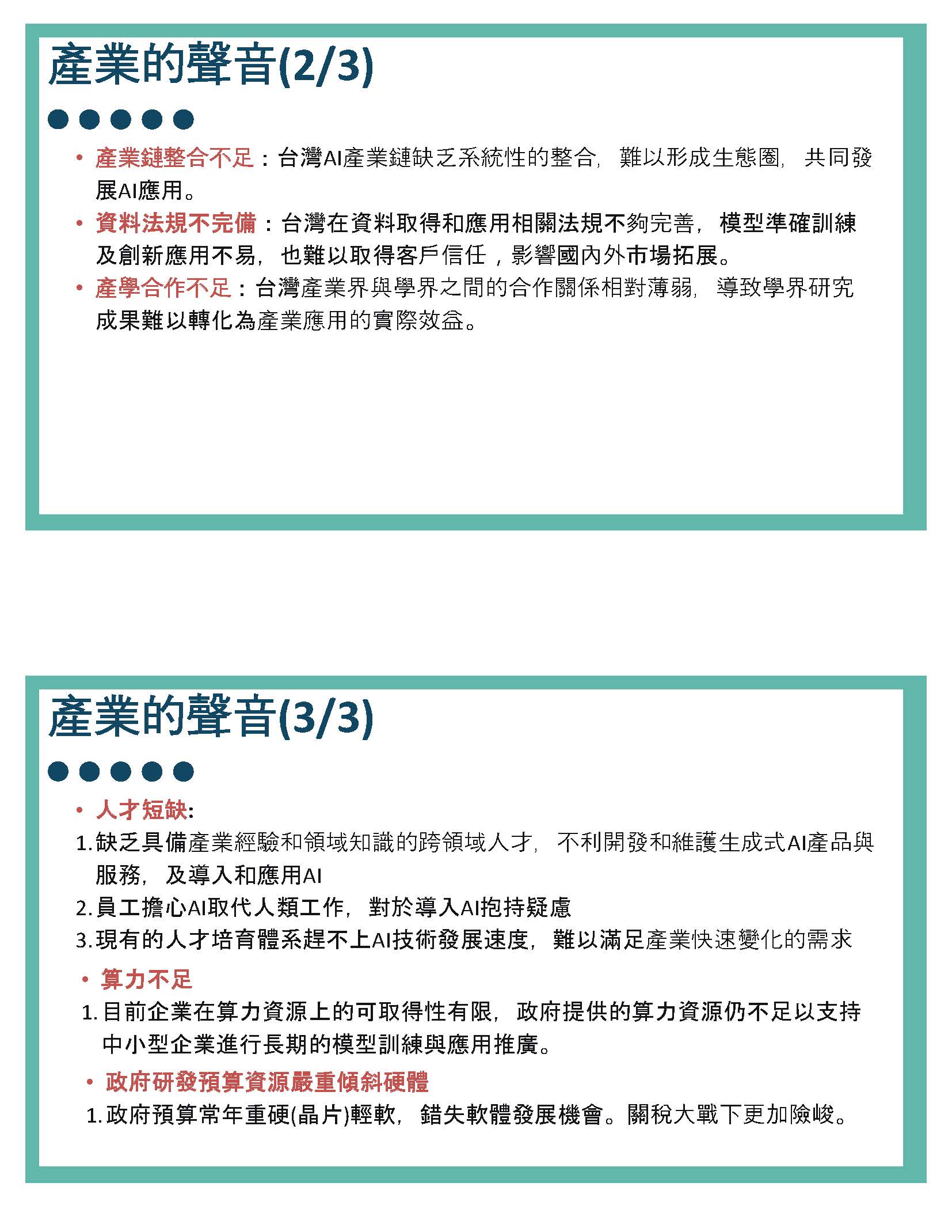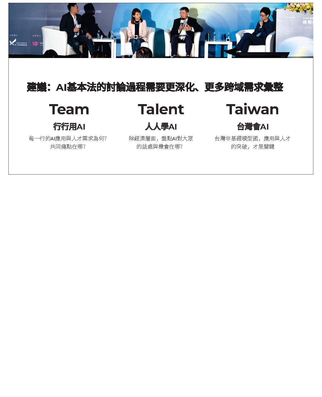 往後來講的話,目前我們在導入產業界時,我自己有發現一個比較大的狀況,我自己稱之為「三明治的現況」,這個三明治現況就是,AI在導入大型集團時,其實他們都已經在使用AI的工具跟導入了,另外一個在推進的是年輕人們,其實他們使用AI的技術掌握度非常高,反倒是中間這個部門,我說它是「三明治」,中間的中小企業可能會考量這個東西是不是會有一些衝擊?安不安全?穩定性高不高?甚至有一些比較有良心的企業會想,我會不會影響到某些人的工作權益?這些事情都會影響到中小企業的導入,我想會比原本預期的還要再緩慢一些,相對國際來講,基本法下來之後,政府要怎麼樣有產業的政策從中間把這個東西擴散,以及有一些公私部門的合作可以加速落地?我們很期望基本法可以趕快落地,然後我們就可以往下面的事情去延伸。