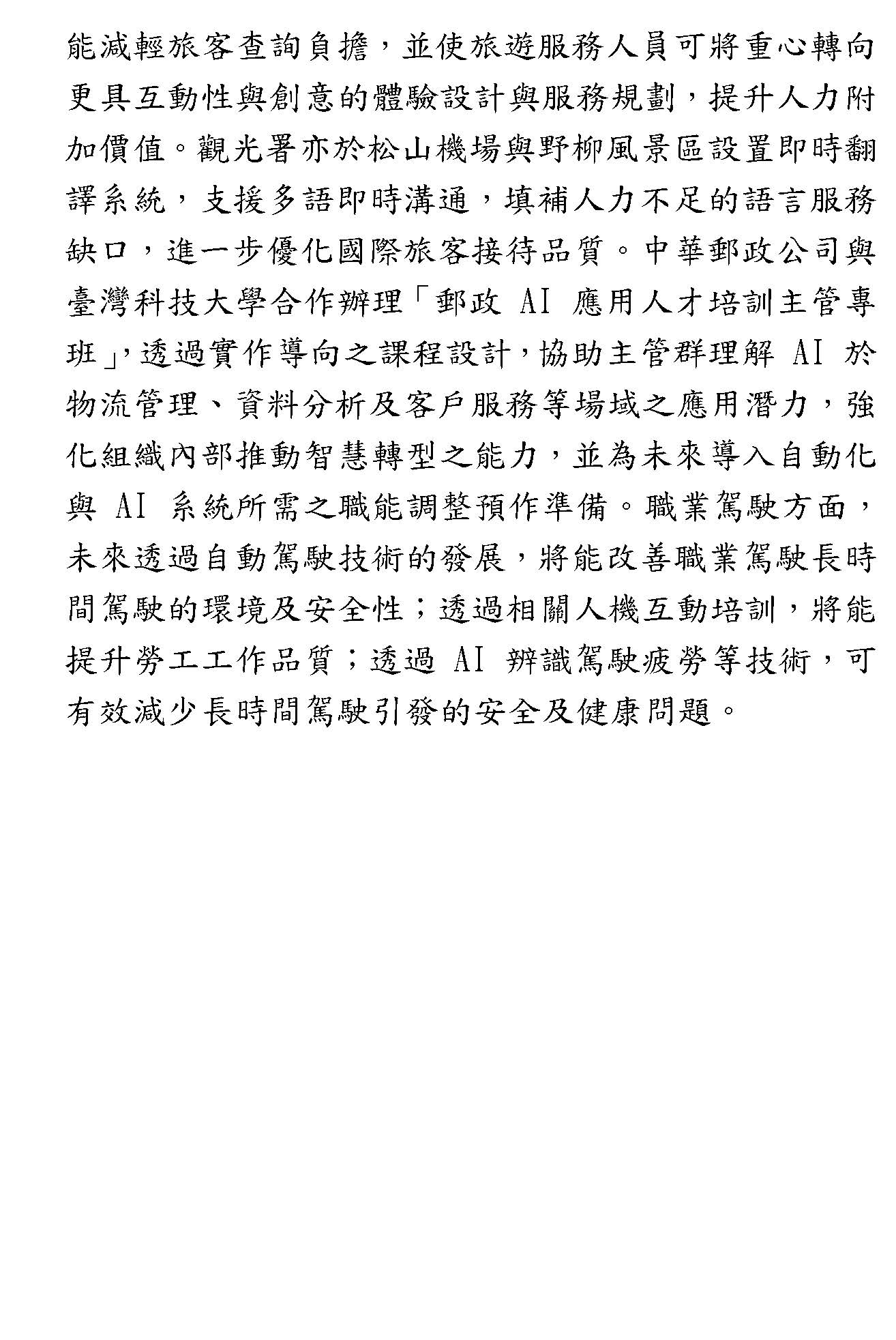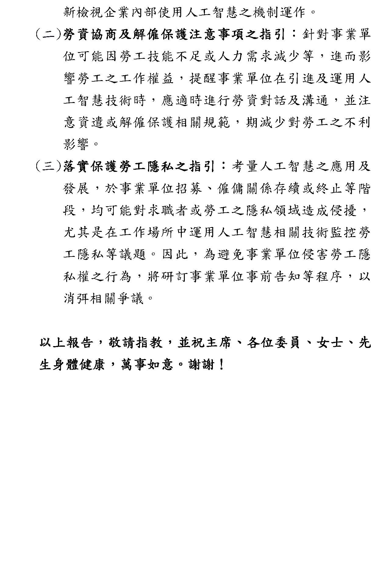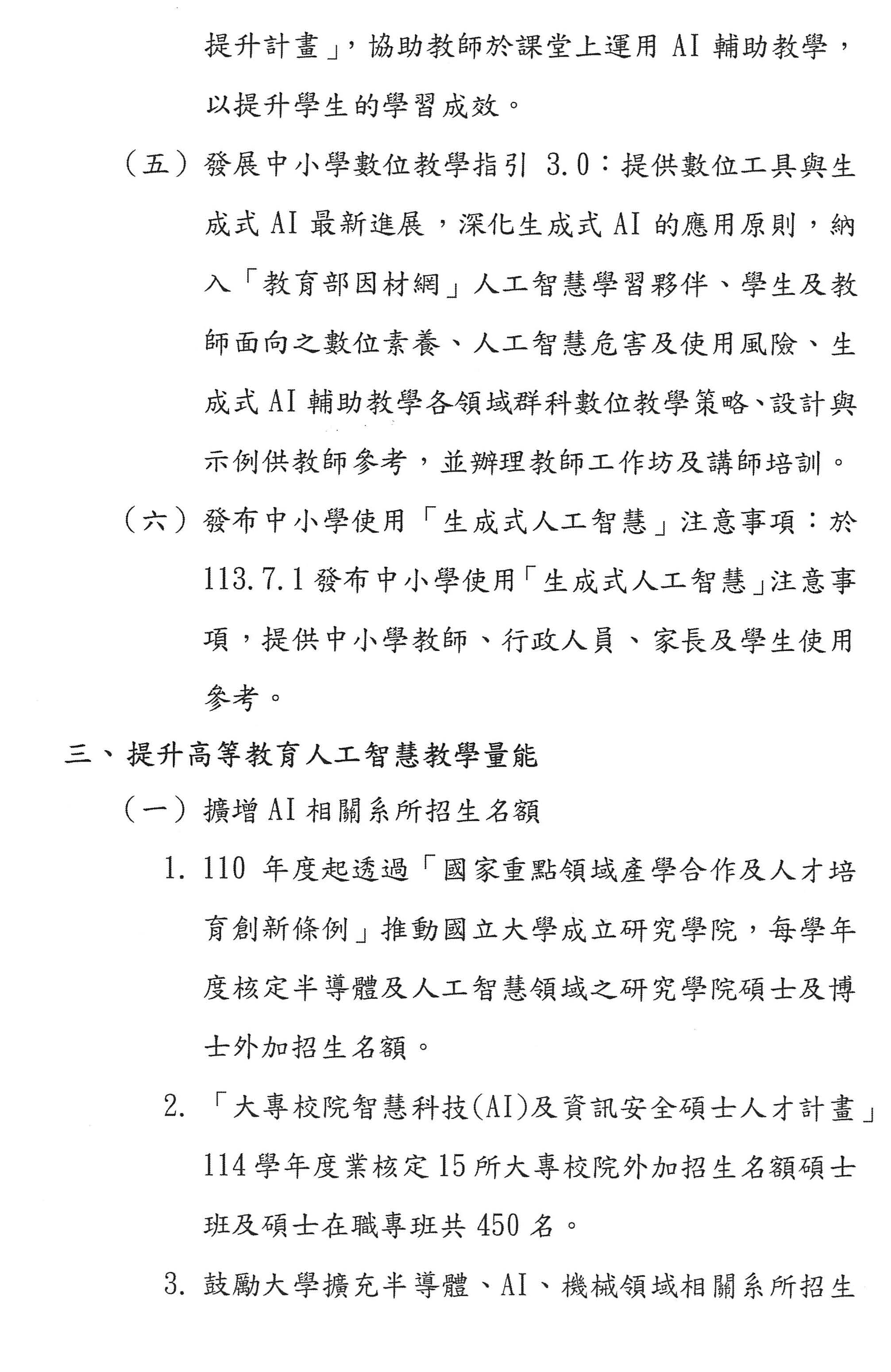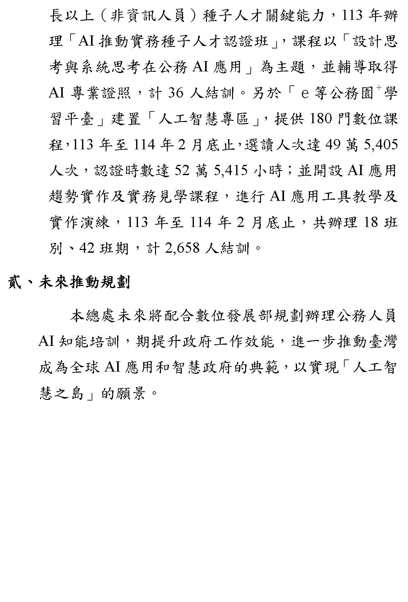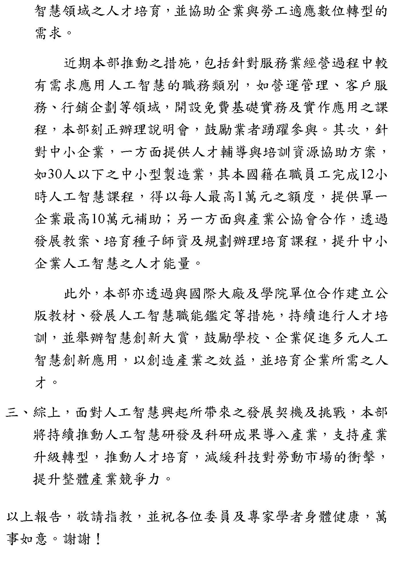 另外,在人才方面,誠如各位先進提到的,大概有兩個不同階段,我們都會跟國科會、教育部一起來推動,一個部分是用AI的,就是必須具有AI素養的,這是各行各業,從產業到學校都需要來做的;另外一方面是比較高階的,具有AI專長的。這是兩個不同層次。本部會從政府機關及產業界積極來推動,並且會跟教育部在其他部分來合作。