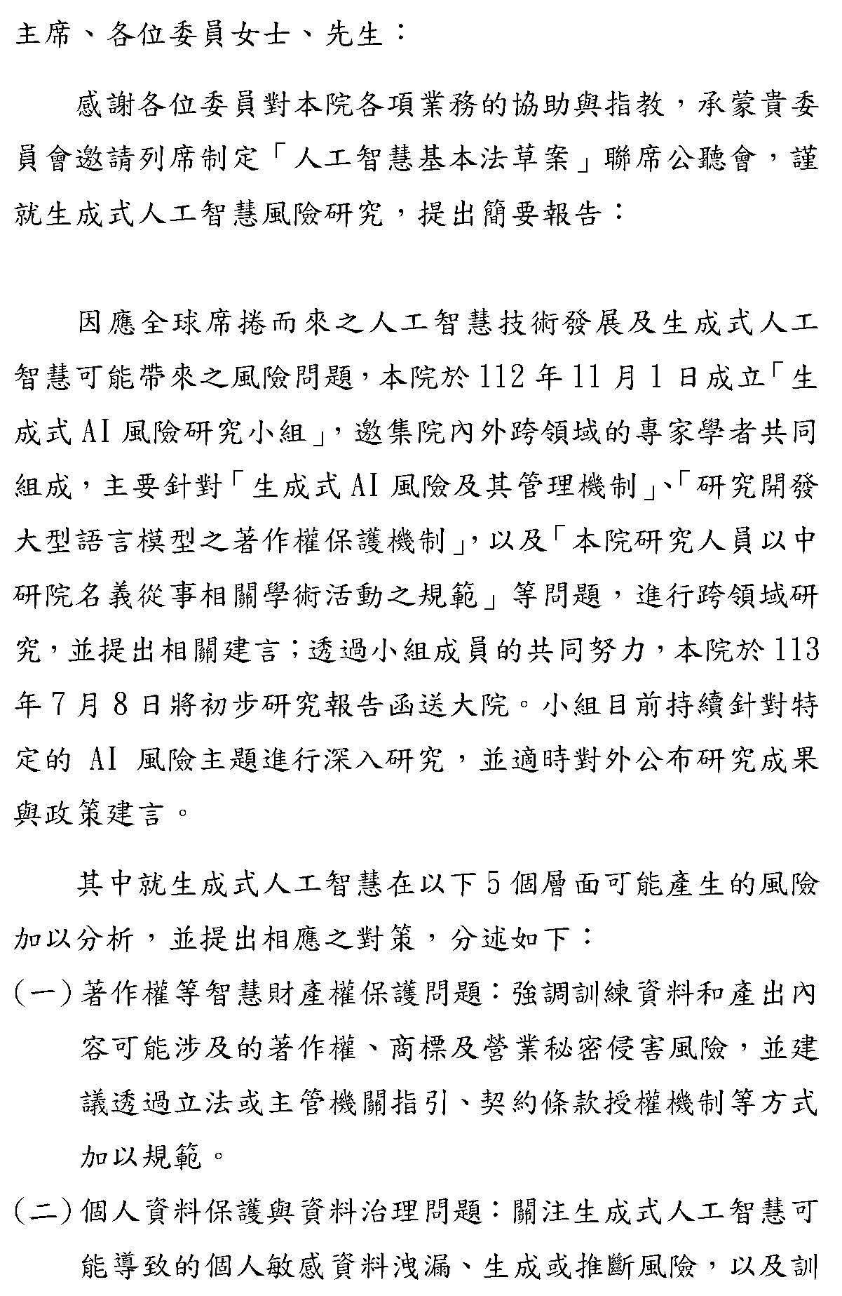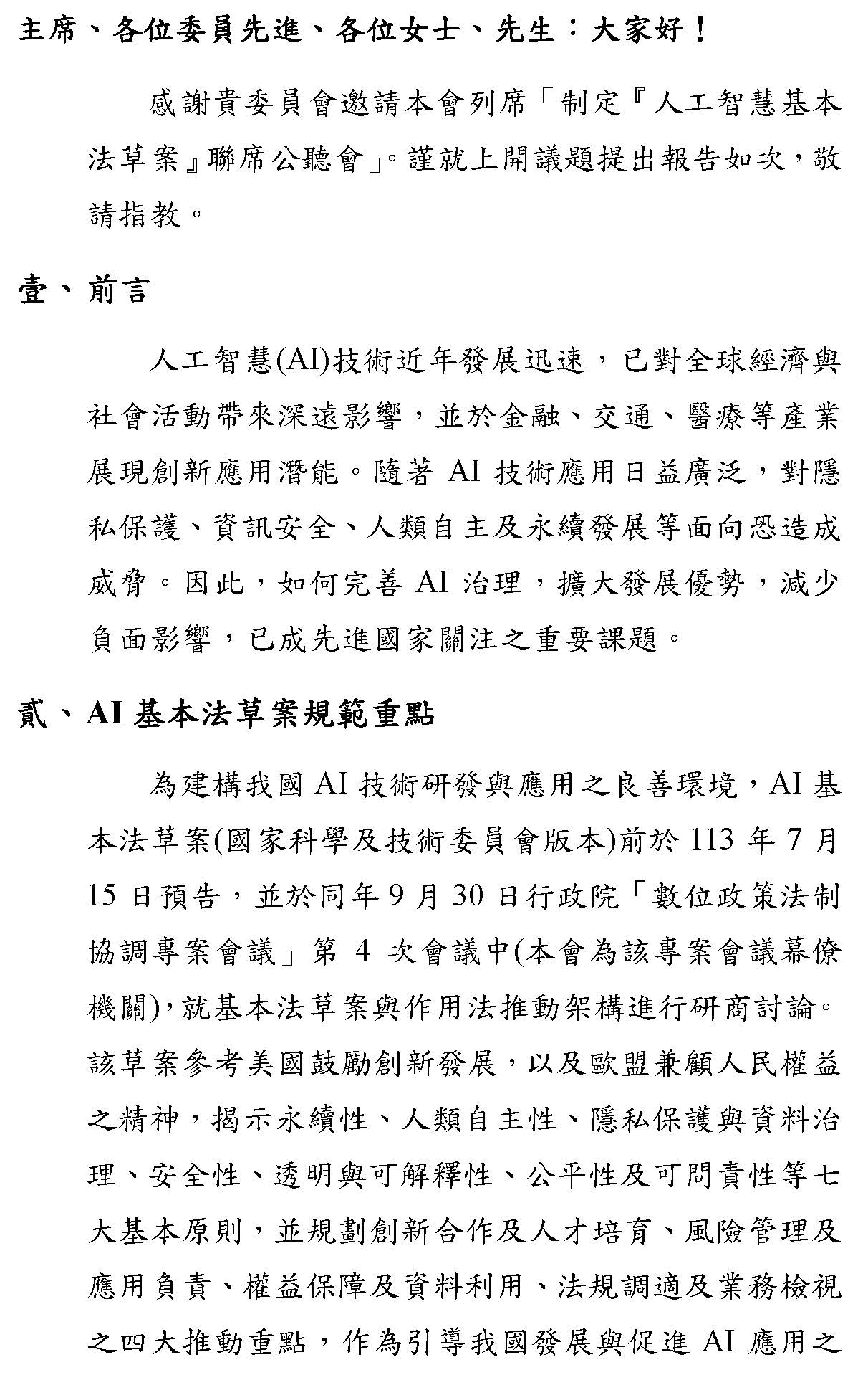 制定「人工智慧基本法草案」聯席公聽會(書面報告)