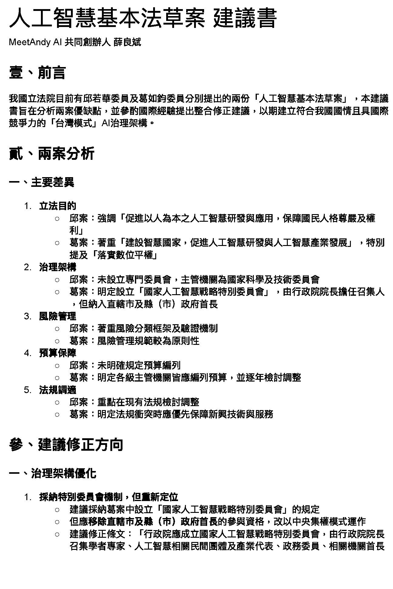 薛共同創辦人良斌:主席、各位先進,大家好。我是MeetAndy這家公司的共同創辦人薛良斌,目前我也在訓練一個臺灣的模型叫做FreeSEED,今天很榮幸來跟大家分享並針對人工智慧基本法草案提供一些建議。我看過之前的版本以及目前的版本,我覺得目前的版本真的非常棒,也提供了非常多資訊,我有一些建議修正方向,已經先提供書面給各位,以下有五點建議修正方向跟大家說明。