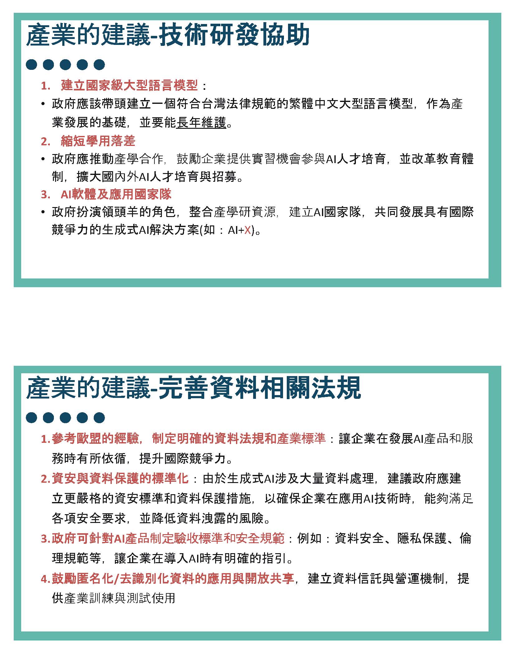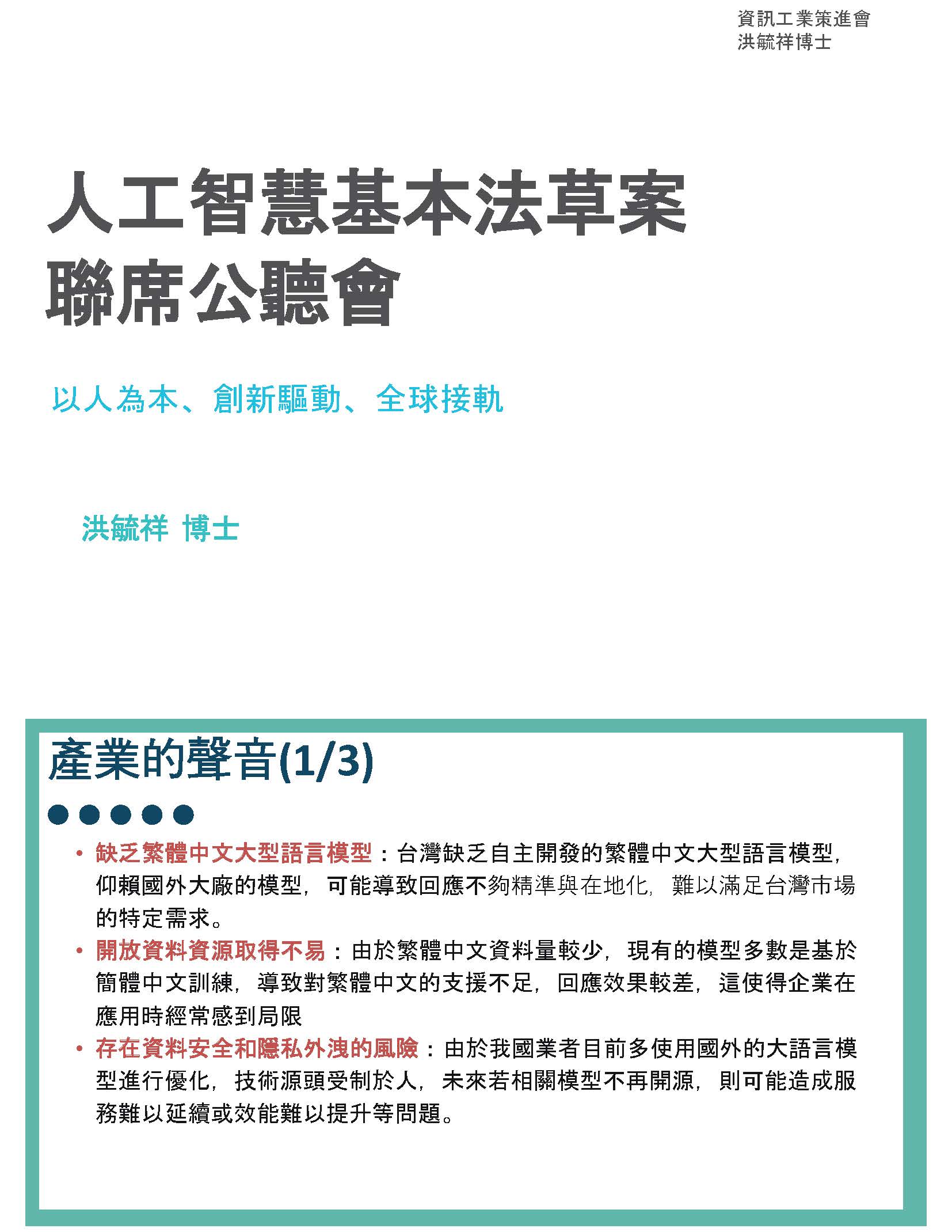 最後因為時間的關係,我們認為在歐盟跟美國的模式,我們還是希望可以在權衡跟平衡之間,讓我們的產業可以創新,不要受到阻礙,但是風險的控管分級可以適度,但是不要過度。我們也支持葛委員所提的要有一個治理的基本法,基本上,這個治理的委員會跟預算有一定比例的監督,然後還要持續的讓臺灣不管是在人民或是勞動這樣的權利上獲得比較好的保障,這些大概就是我們業界的看法。以上,謝謝。
