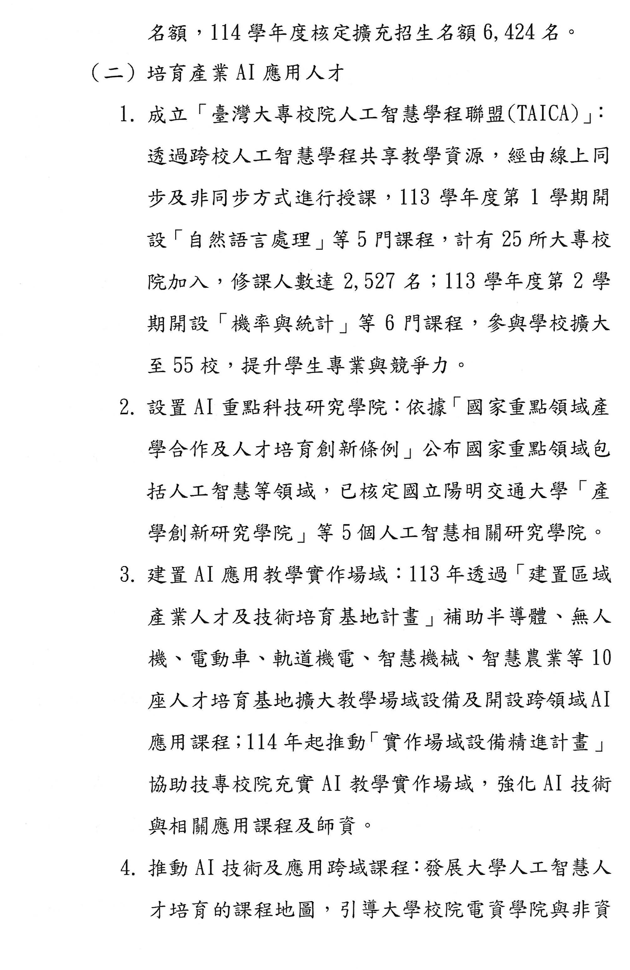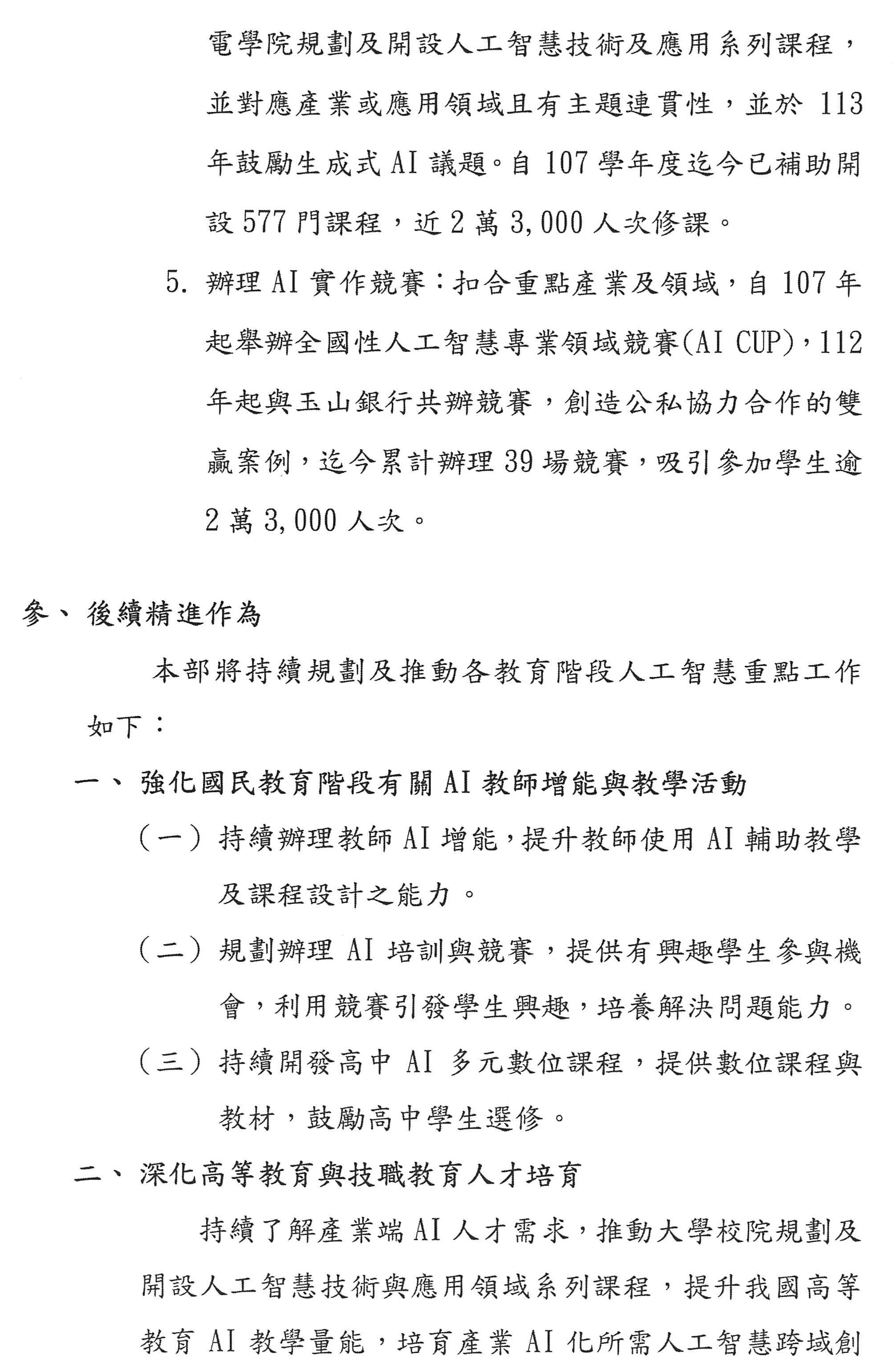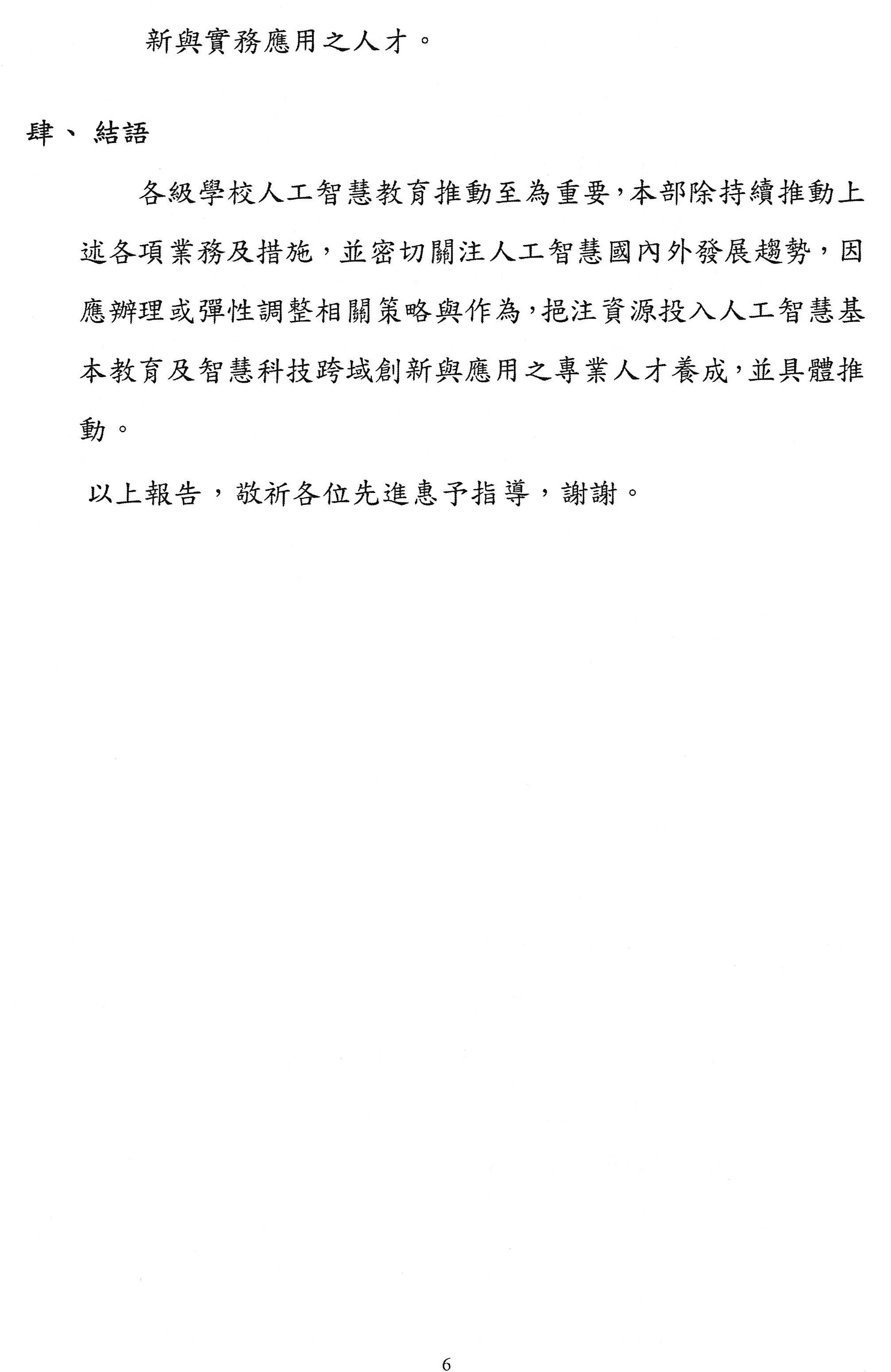除此之外,教育部也辦理全國性的人工智慧專業領域競賽,就是所謂的AI CUP,希望能夠透過競賽的主題扣合重點產業及領域,讓學生能夠與時俱進獲得實務的訓練。此外,教育部已核定「產學創新研究學院」等5個人工智慧領域的研究學院,希望能夠透過這樣的方式在大學中建置AI應用教學實作場域,並推動實作場域的精進計畫。我們也希望能夠協助技專院校充實AI教學實作場域,強化AI技術與相關的應用課程及師資,未來教育部將持續推動及深化各個學習階段的AI教育與人才培育。以上報告,敬祈各位先進惠予指導,謝謝各位。