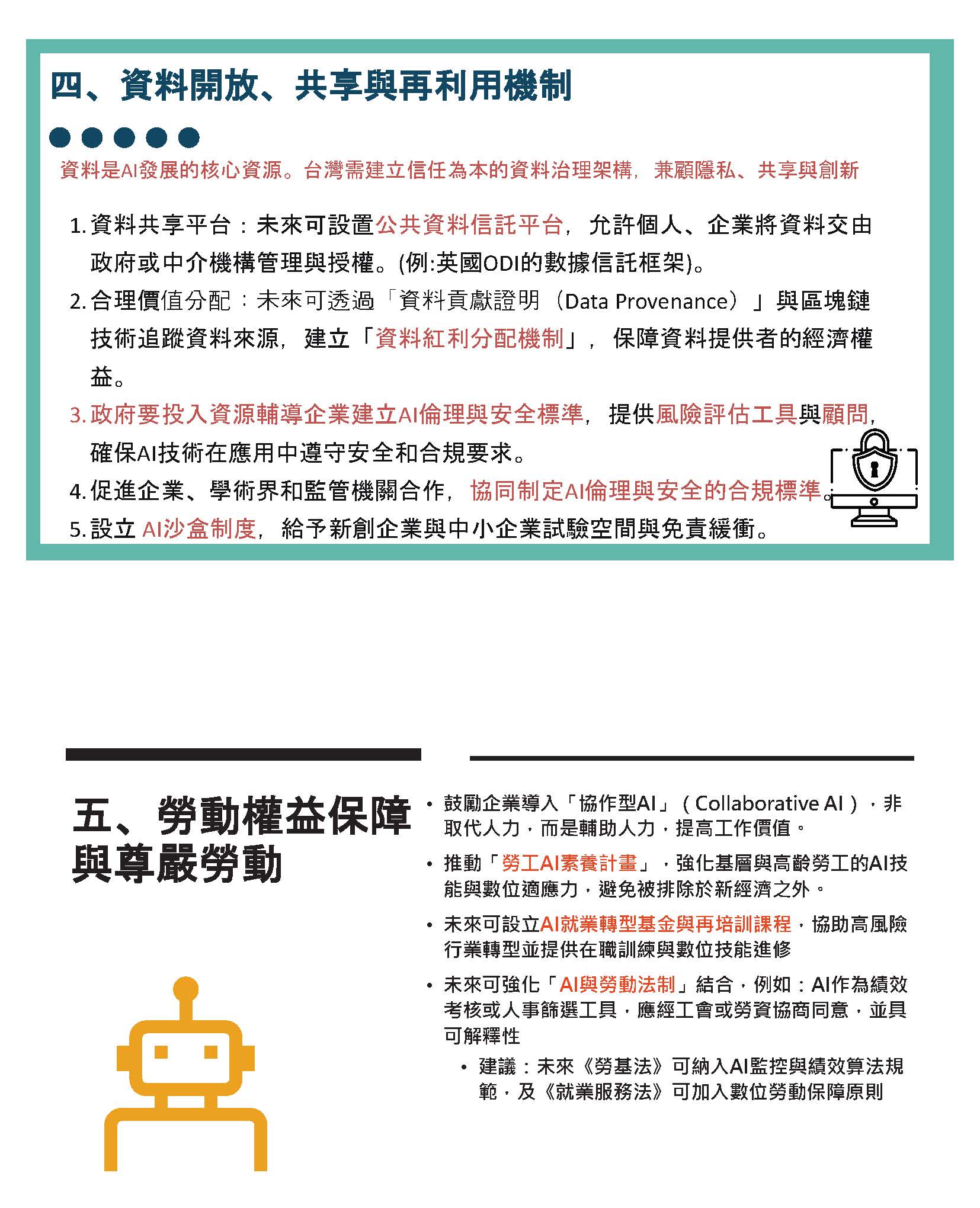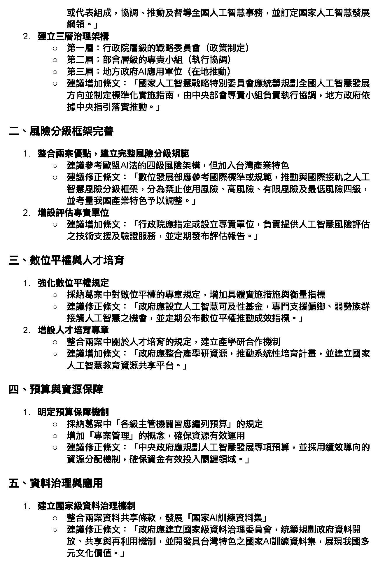 第三點是兩案裡面都有提到數位平權跟人才培育,但是條文中只有寫政府應該做,卻沒有寫說錢在哪裡,顯然屆時我們就要再開一次會決定哪個單位要付錢。所以此處我建議政府應設立一個人工智慧可及性基金,讓偏鄉、弱勢族群有接觸人工智慧之機會,並且必須要有成效指標。其次,我個人認為政府在人才培育上其實做得越少越好,今天應該也有其他的單位代表,我建議增列條文:「政府應整合產學研資源,推動系統性培育計畫,並建立國家人工智慧教育資源共享平台。」我想今天也有很多教育領域產官學界的代表,可以提供更多建議。