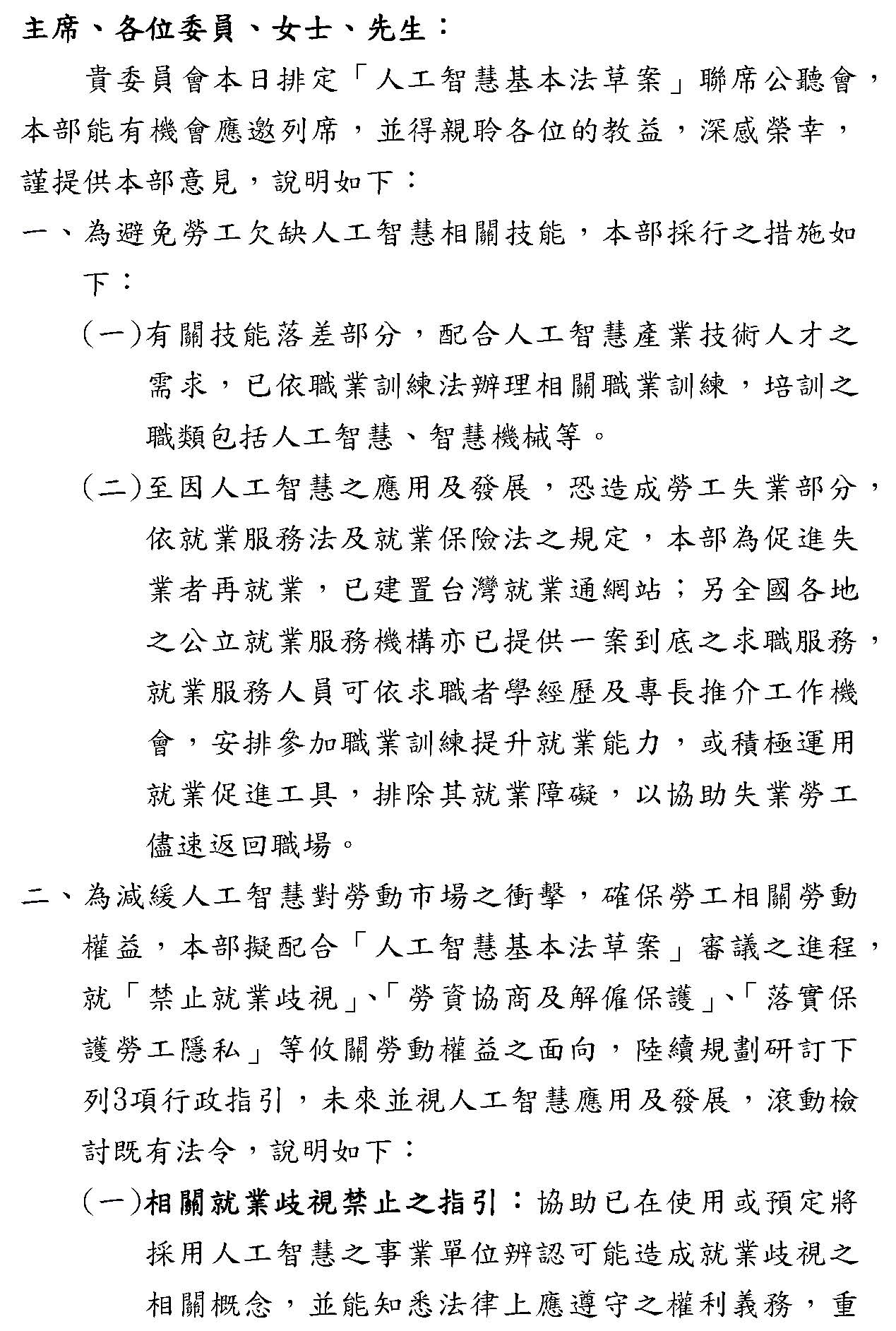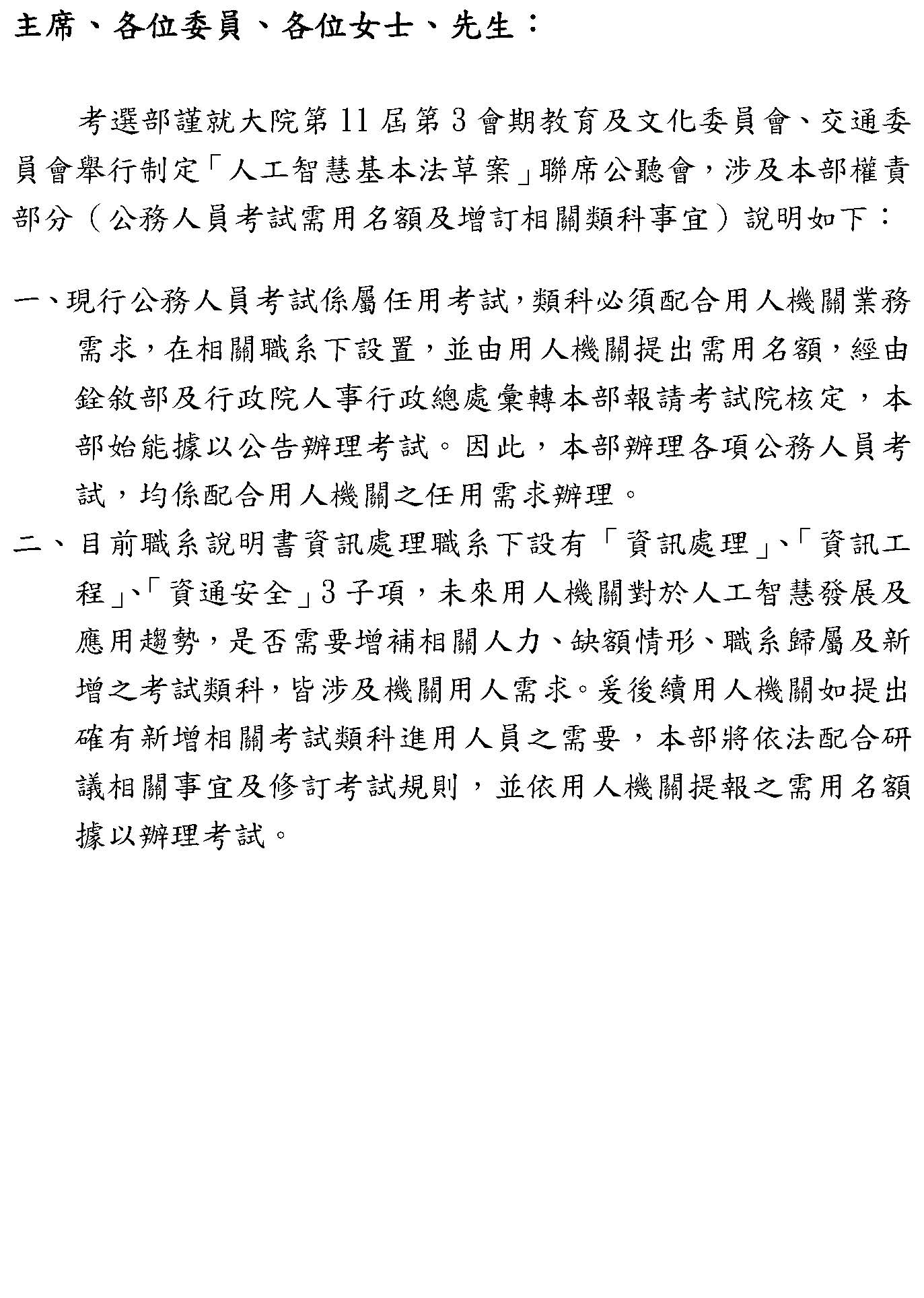 行政院人事行政總處就制定「人工智慧基本法草案」書面報告
