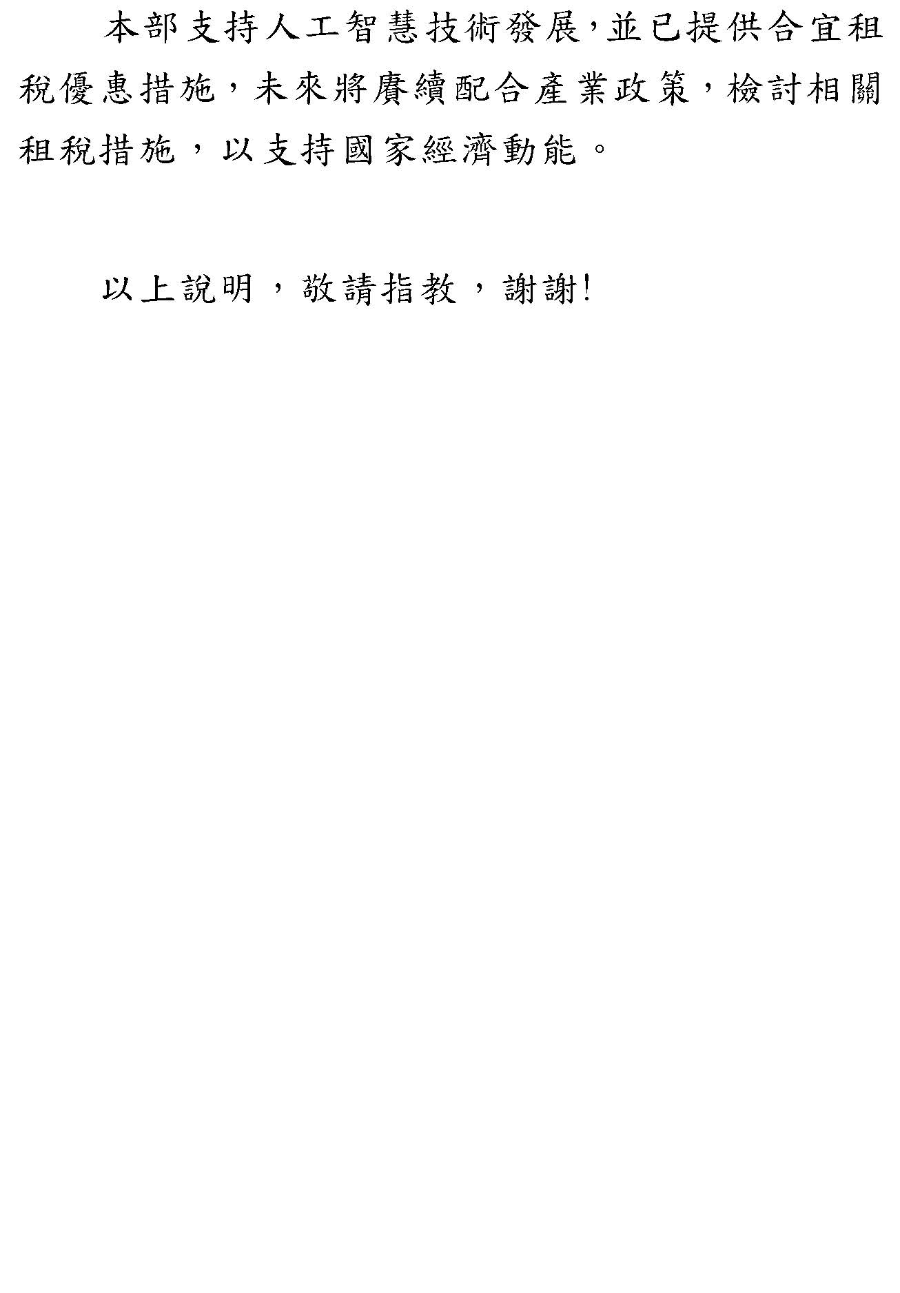 第二個,關於葛委員版本的第十二條和邱委員版本的第四條,都有談到政府應該要提供租稅獎勵等等優惠,我覺得方向是很好,但是我希望實務上在做的時候,各部會可以盤點現在所有租稅優惠跟獎勵優惠的表格。我講直白一點,就是產業方面,我們的會員跟我們反映過,曾經在某一次智慧機械的補助審查中,各位聽到「智慧機械」這個名字,其實它是包含軟體,因為現在所謂的智慧機械,包括AI這些軟體都是智慧機械,可是因為這個名字本身叫「機械」,以至於我們某一個廠商在產業審查智慧機械的租稅獎勵的時候,直接被審查委員丟一句話說:智慧機械只補助工廠自動化機械。然後就直接把所有軟體都剔除掉了,這就是沒有把名字寫清楚,或者在補助條文上,過去用了所謂硬體製造那個年代訂下來的那些表格,沿用到現在都沒有改,以至於在各個地方落實的時候,會出現很大的問題。確實AI接下去發展,政府的租稅獎勵等等都很重要,但是往下一步就是要請各部會把那些表單都整理一下。