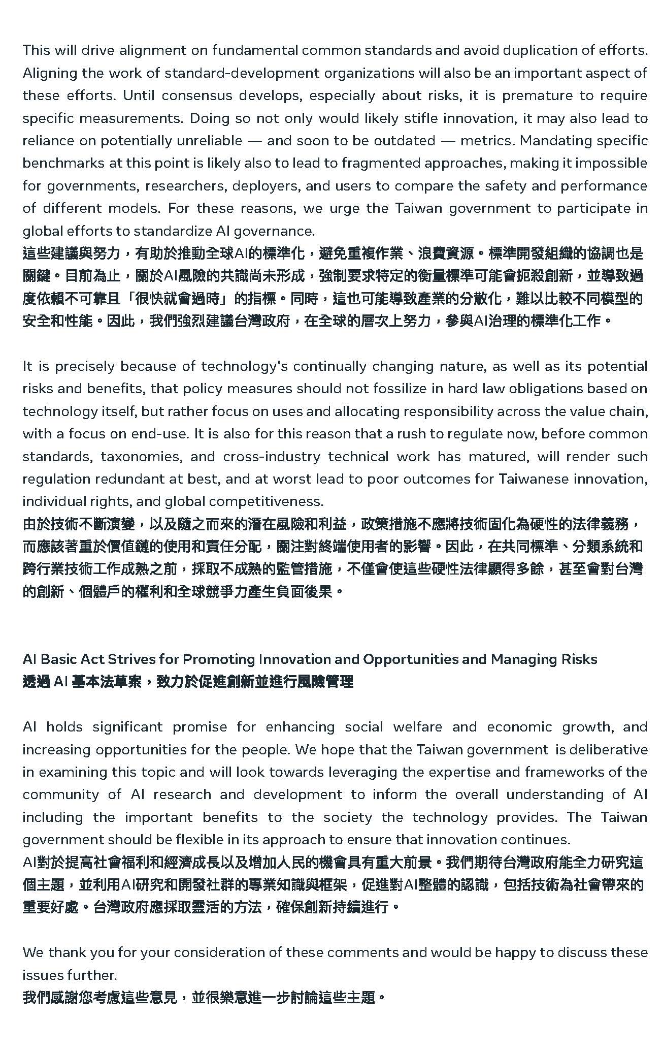 呼應這次的公聽會,我個人滿支持國家應該要有一個視角足夠高的中央單位,比如國家AI戰略委員會來進行政策的方向及跨部會的協調。除此之外,也應該要有一個主責的單位,這個主責的單位要負責的應該是具體的指引跟治理的制度,比如資料的應用、風險分級、模型使用的透明度跟資料的標記。我想呼應我剛剛說的產業面的第一個問題,這樣的架構應該可以讓整個速度再加速推進。有了基本法以後,主責單位就可以思考臺灣的AI發展策略,剛剛很多先進都有提到,我們是要發展有特色的大語言模型,還是臺灣應該在某些特定的領域去發展AI agent 的生態圈,去跟這些大語言模型做一個互導?我想整個世界的AI趨勢,各自有各自的重心,臺灣也有適合發展的地方,我們要怎麼樣去配達?以及往後面來講的話,政府除了政策和資源,是不是在國家的數位資產,剛剛有提到,比如像健保或是文化的數位資產,我們要怎麼樣去做公私部門的合作?這些都應該要在基本法上給予制度性的鼓勵和支持。