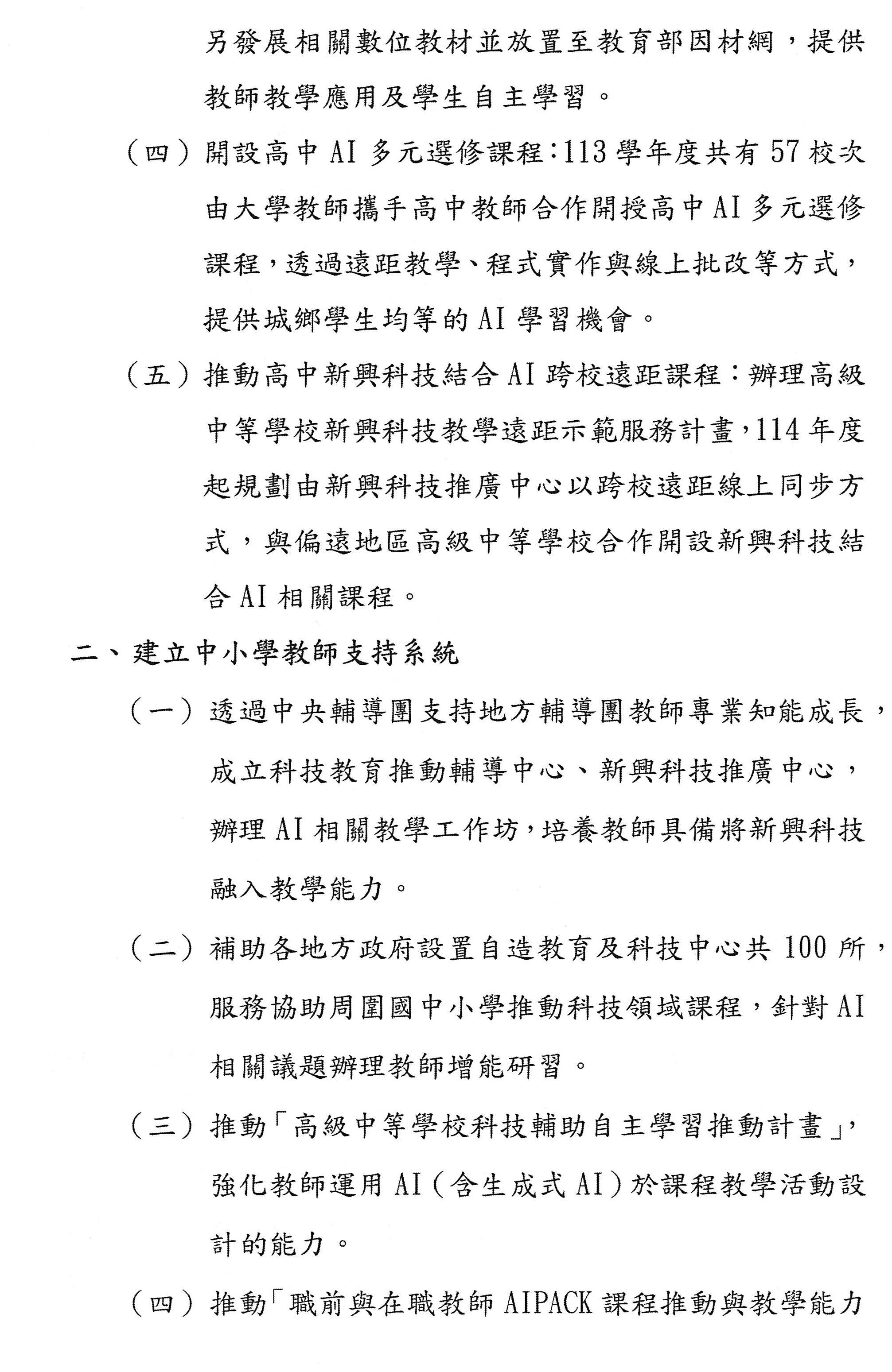 第一部分是扎根中小學人工智慧教育,教育部開發許多通用型人工智慧夥伴,以及英語聊天的機器人,我們將它融入許多的學習平臺,希望透過這樣的融入方式,讓我們的學生都有機會使用AI來進行學習。再來,教育部也積極發展AI相關的補充性教材教案以及數位內容。我們也積極推動大學教師攜手高中教師進行遠距教學,我們開設高中AI多元選修課程,希望提供城鄉學生均等的學習機會。接著,教育部也持續辦理AI素養爭霸賽以及科技教育創新實作競賽,希望鼓勵參賽的學生能夠學習AI程式設計以及AI程式發展。