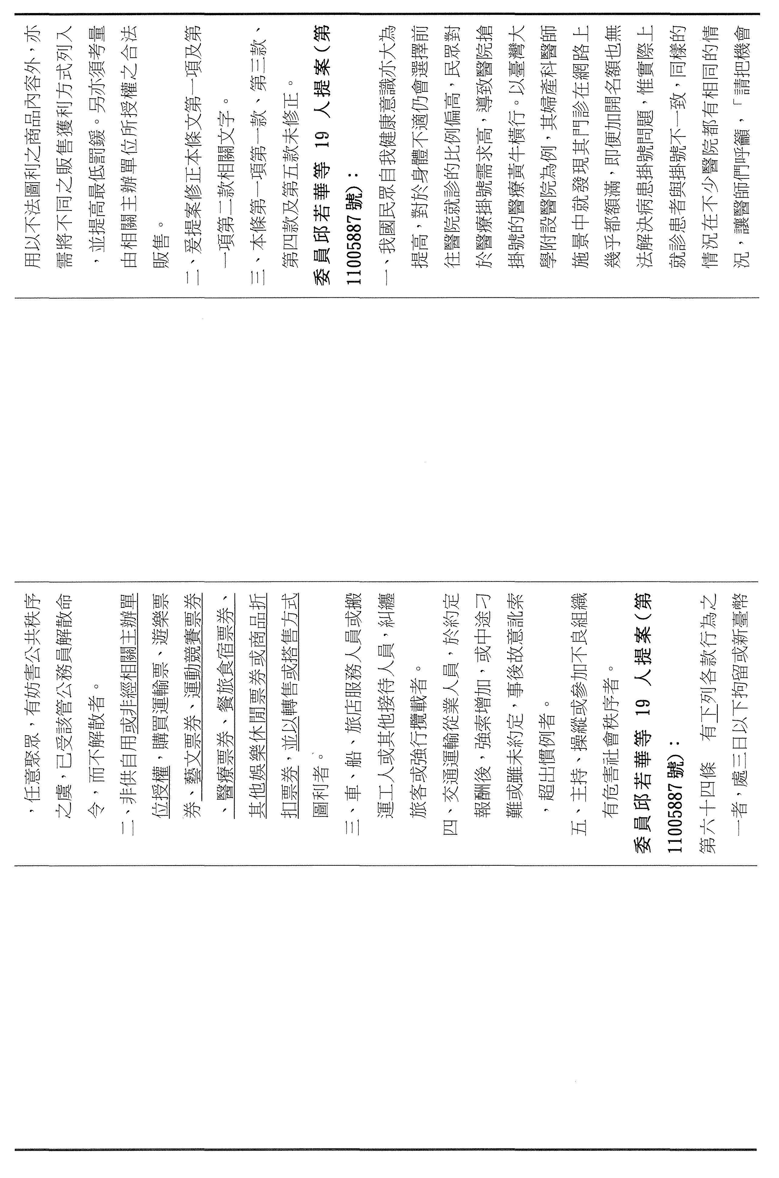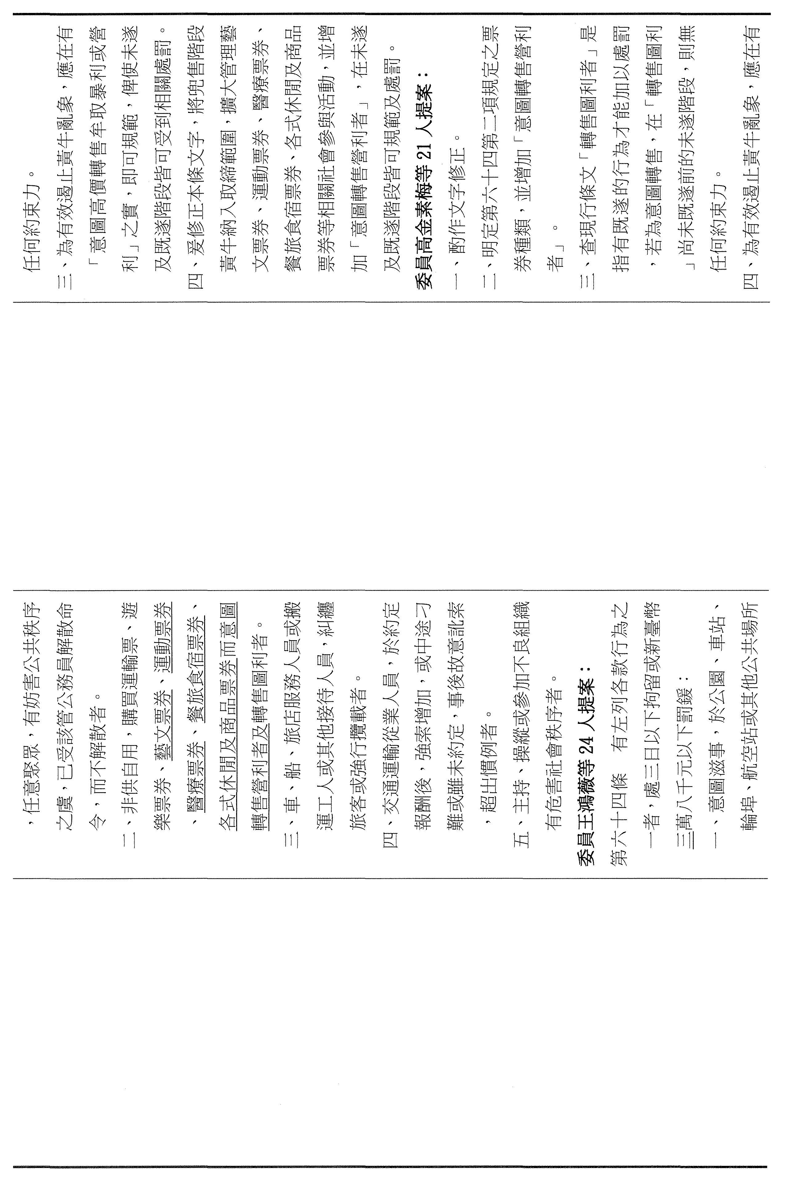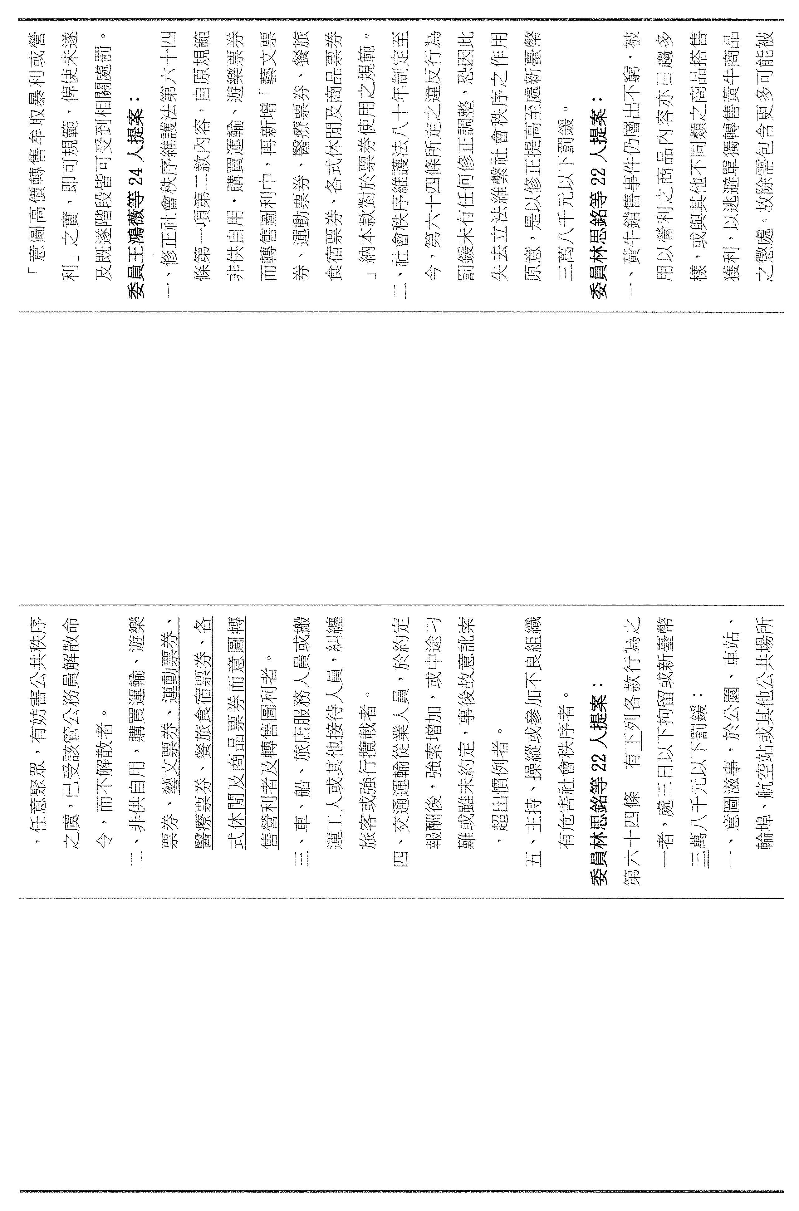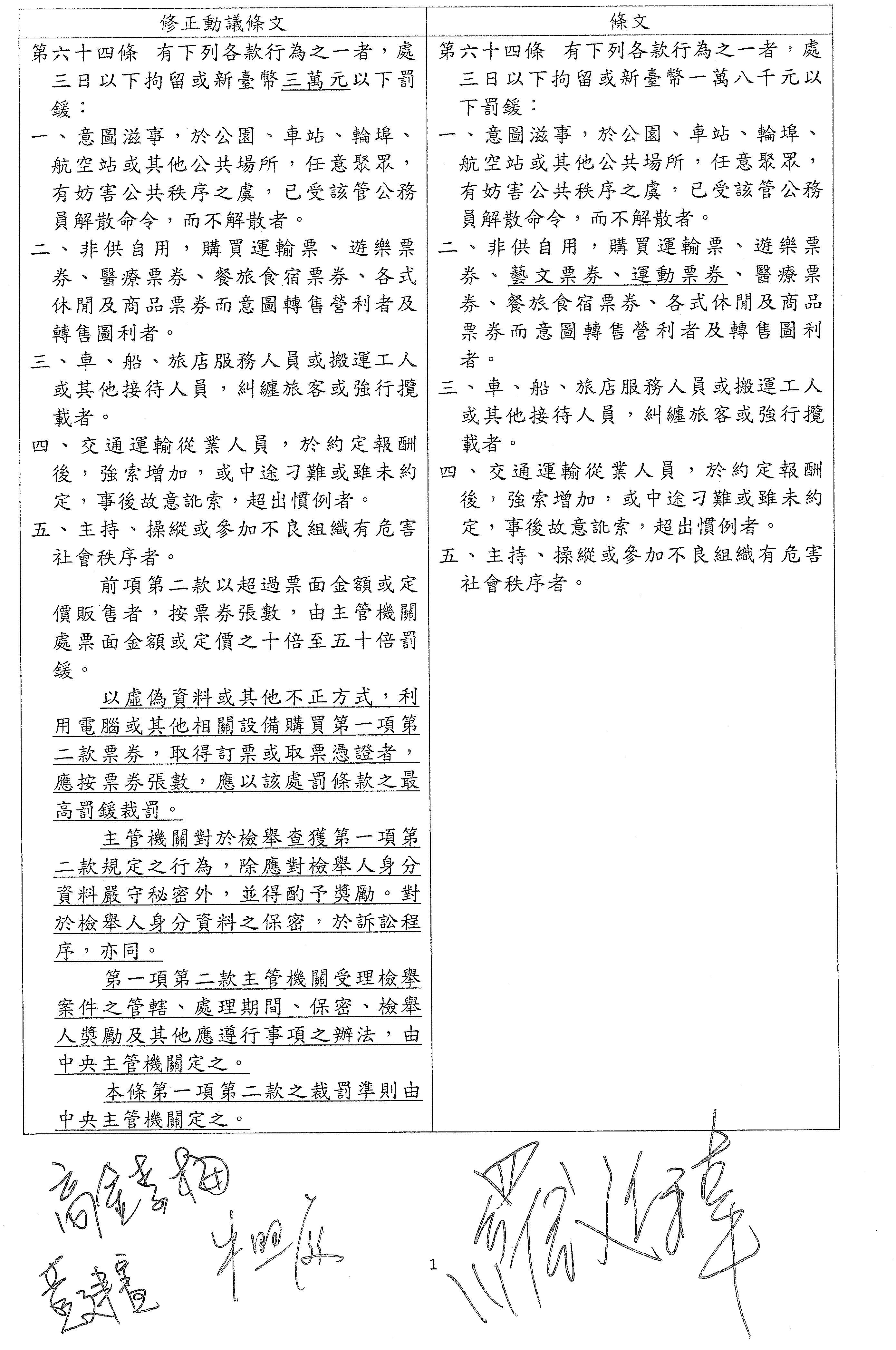 王委員鴻薇:謝謝主席,社會秩序維護法第六十四條提案說明。黃牛票一直都是消費者、活動舉辦方跟政府單位積極關注的狀況,這個違法的行為伴隨著科技的應用跟社會發展是日益猖獗,包含運輸、遊樂票券、藝文票券、運動票券,還有各式只要是涉及休閒的商品票券,都成為黃牛集團的牟利目標。現在在臺灣這些黃牛甚至已經出現了集團性的、組織性的犯罪,今年2月份才有揭露,就是有一對劉姓的夫妻檔,從民國105年開始就用全職的方式從事轉售、代購所有的熱門演唱會或運動賽事的黃牛票,從中牟取不當的利益,而這樣的經營使得他旗下的粉絲團竟然有高達5萬人追蹤,所以這已經變成是一個集體性的犯罪行為。這個部分,除了現行的文化創意產業發展法和刑法裡面的偽造文書之外,社會秩序維護法事實上欠缺處罰還有阻止這樣的犯罪行為的規定。