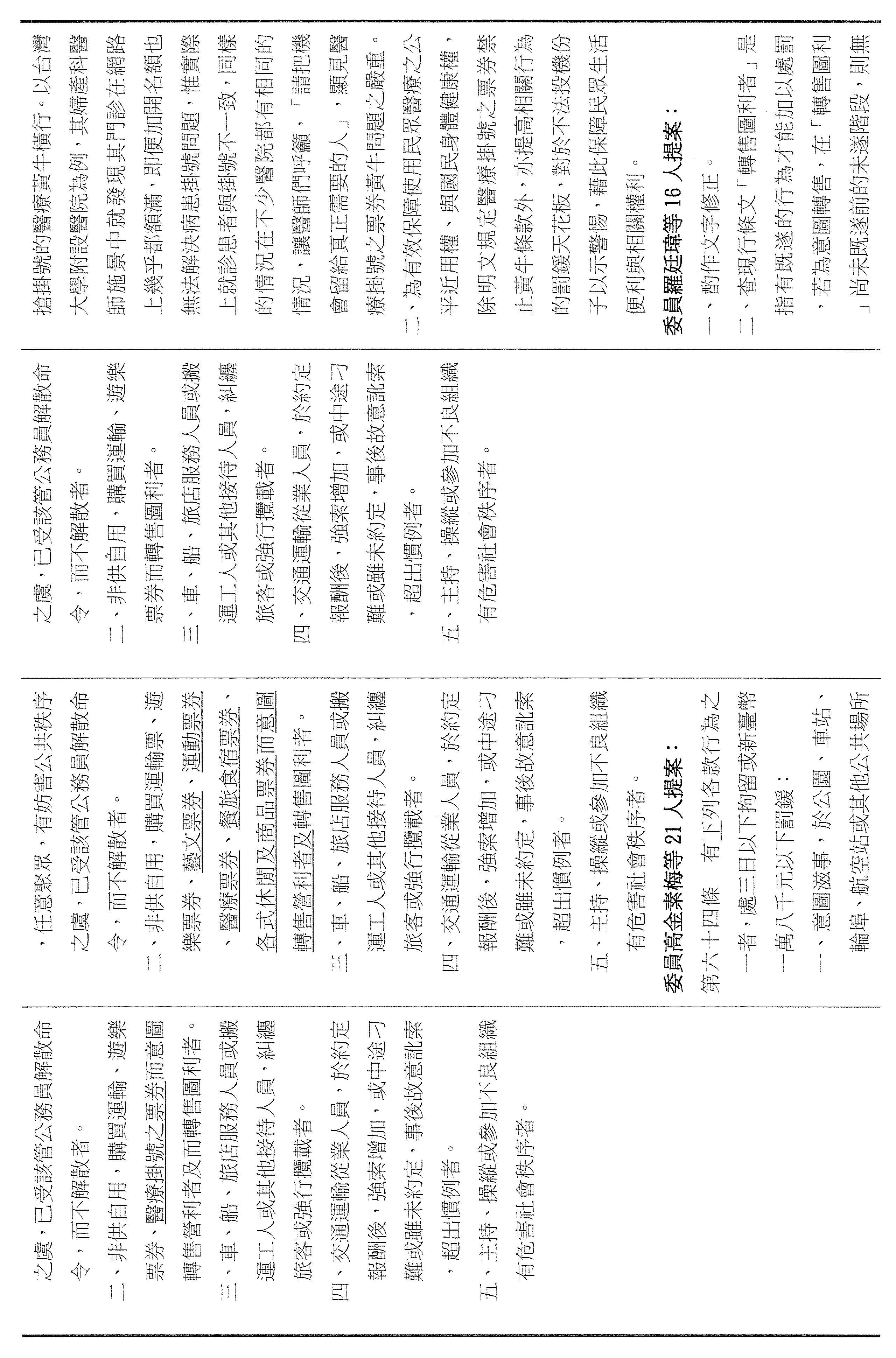 主席:是可以的,這是哪一條裡面有講?第十九條裡面有講,拘留是OK的,就是在社維法的範圍裡面;第六十三條也是嘛!就是我們剛剛講的,散布謠言也是可以拘留三天的嘛!所以其實都OK的嘛!