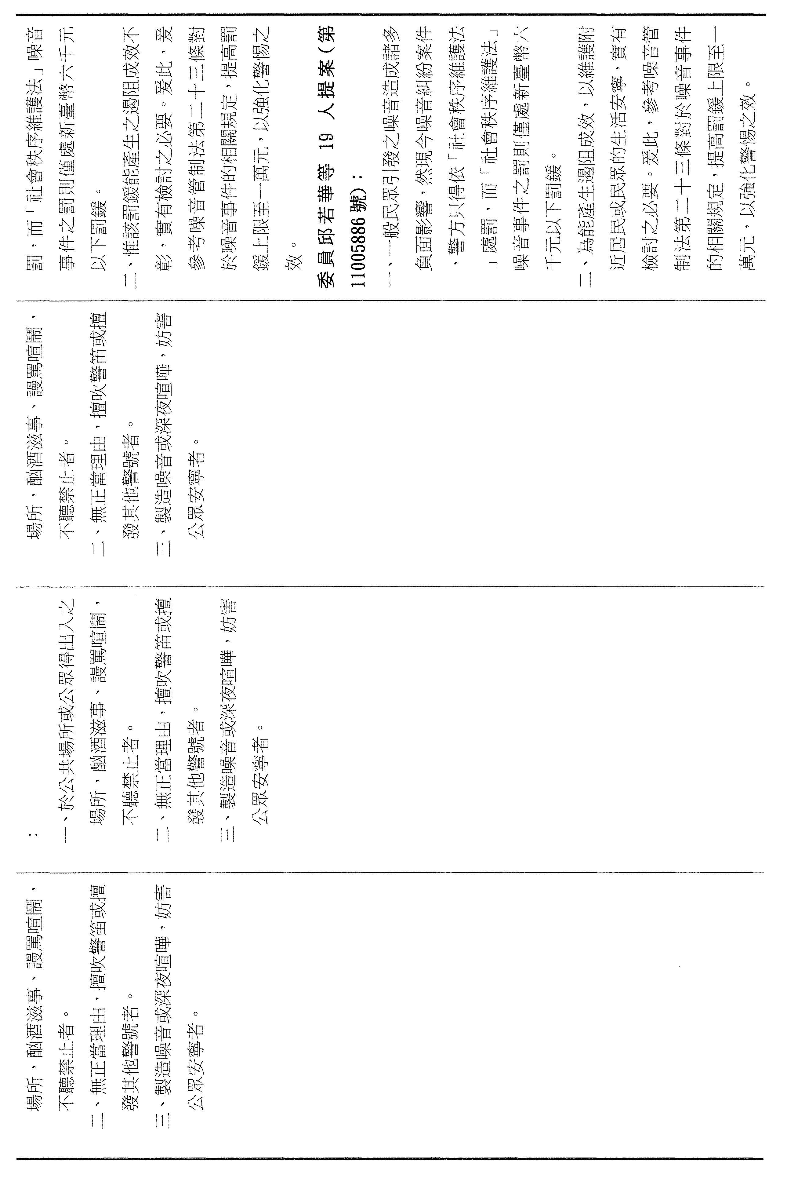 接下來是第七十二條關於噪音妨害的修正,現代都市生活中噪音干擾成為普遍的社會問題,從洗衣機運轉,從呼叫聲到鄰居夜間的喧嘩,這些雖非工業噪音,卻對居家安寧產生實質影響。目前噪音管制法對於非持續性或難以量測的噪音,明確應由警察機構依相關的法規處理,但實質上警察大多依社會秩序維護法第七十二條罰鍰。然而現行規範僅處六千元以下罰鍰,根本無法對行為人產生有效嚇阻。因此我們建議參考噪音管制法第二十三條標準,將第七十二條的罰鍰上限調至一萬八千,提高處罰效力,保障民眾基本生活安寧權。