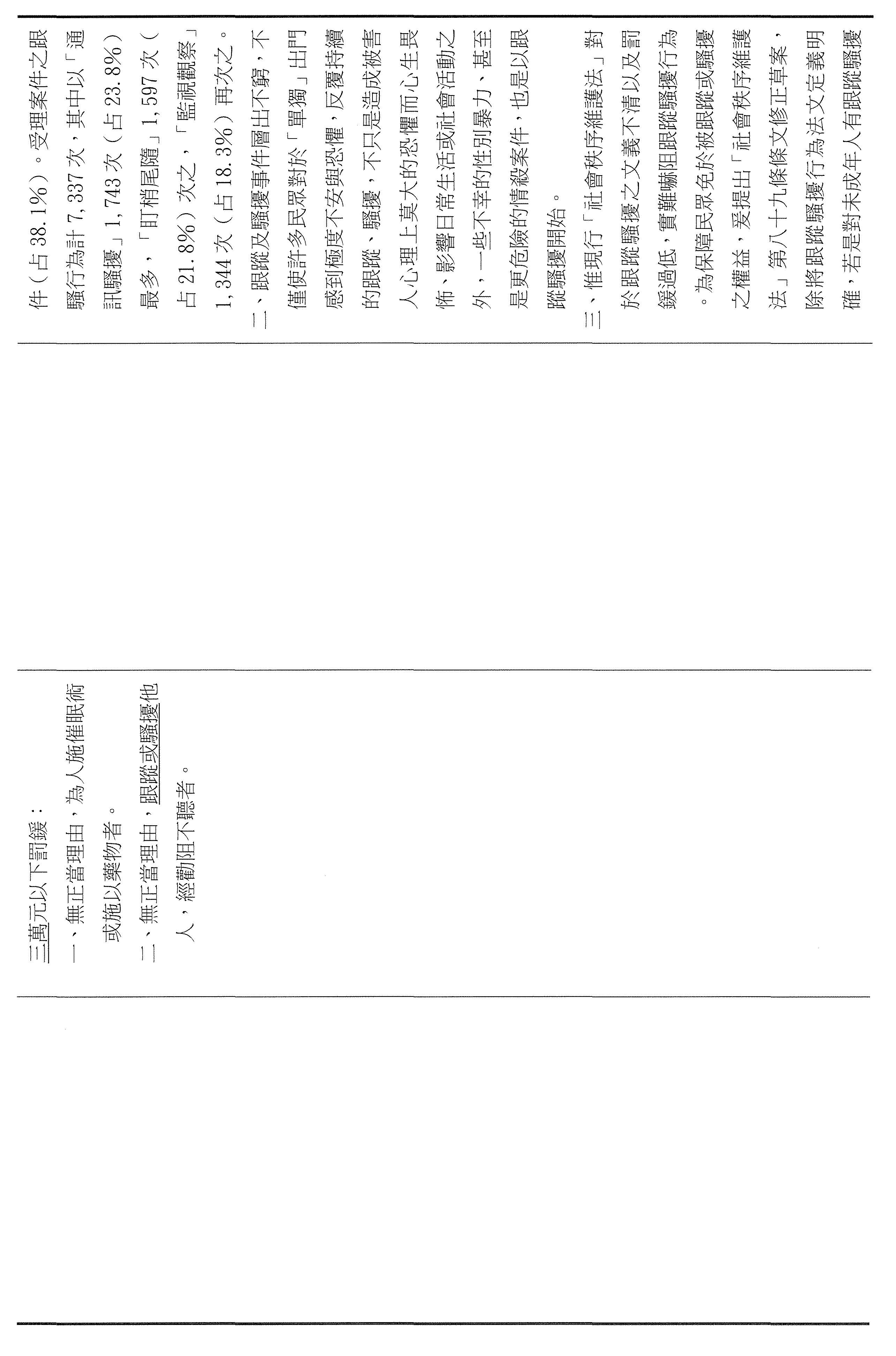 四、有關於社維法第八十九條第二款針對跟追行為修正一案。本條款僅處罰跟追行為關於糾纏、跟蹤、騷擾等侵擾行為,現在已有跟蹤騷擾防制法或其他專法(如家庭暴力防治法、性平三法)加以保護被害人、處罰或處遇加害人之機制,並且訂有事前預防、事中制止及事後保護等規定,應該由各該主管機關(譬如衛福部主管性騷擾防治法及家庭暴力防治法、勞動部主管性別平等工作法、教育部主管性別平等教育法等)本於職掌或職權來查處之。上開法令如有不足,建議修正各該法令,如此將更為妥適且更具實效。爰此,建議刪除本條款規定。