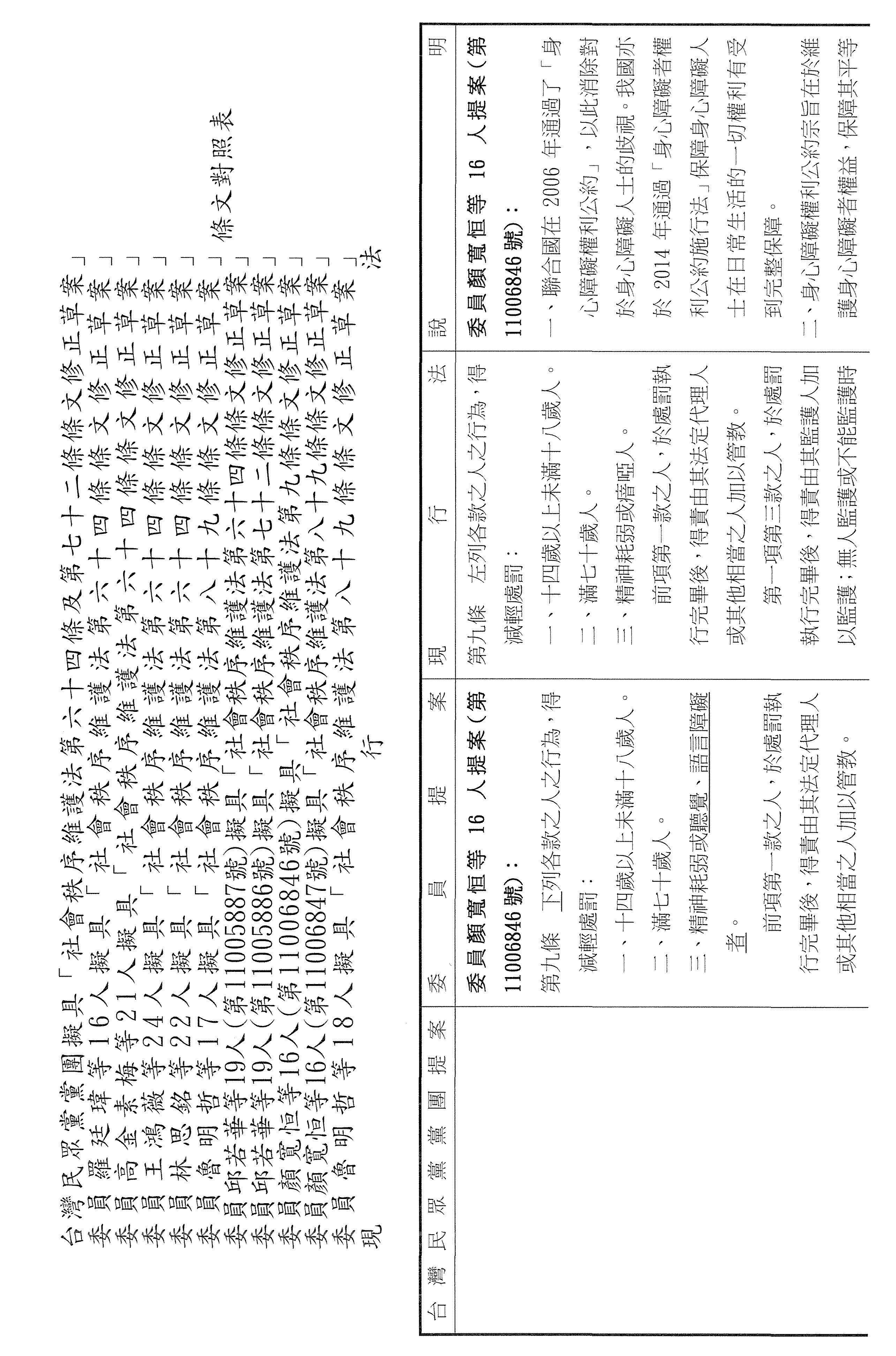九、審查委員顏寬恒等16人擬具「社會秩序維護法第九條條文修正草案」案。