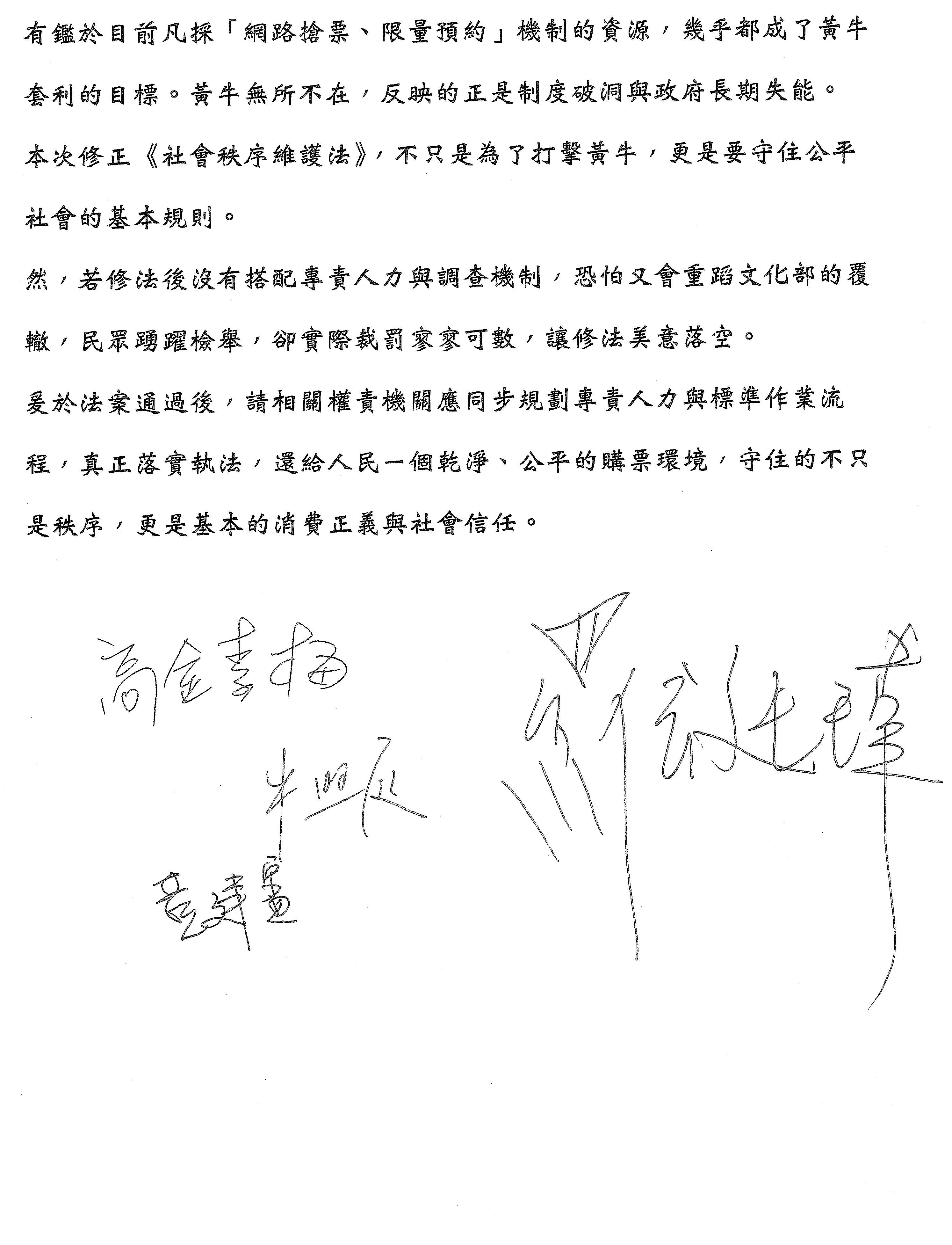 因此我主張修正社會秩序維護法第六十四條,明確的將意圖轉售圖利納入處罰範圍,不論是不是有成交,只要有黃牛的意圖,就應該要依法開罰;再者,適用範圍必須要擴大,不限於演唱會或藝文活動,所有採取網路搶票、限量預約機制的資源通通都應該要納入,這不單單只是打擊黃牛,而是在守住一個公平社會的基本規則,只要還有一張被炒高的票、一個被霸佔的名額,就是對守法國民的嘲諷。